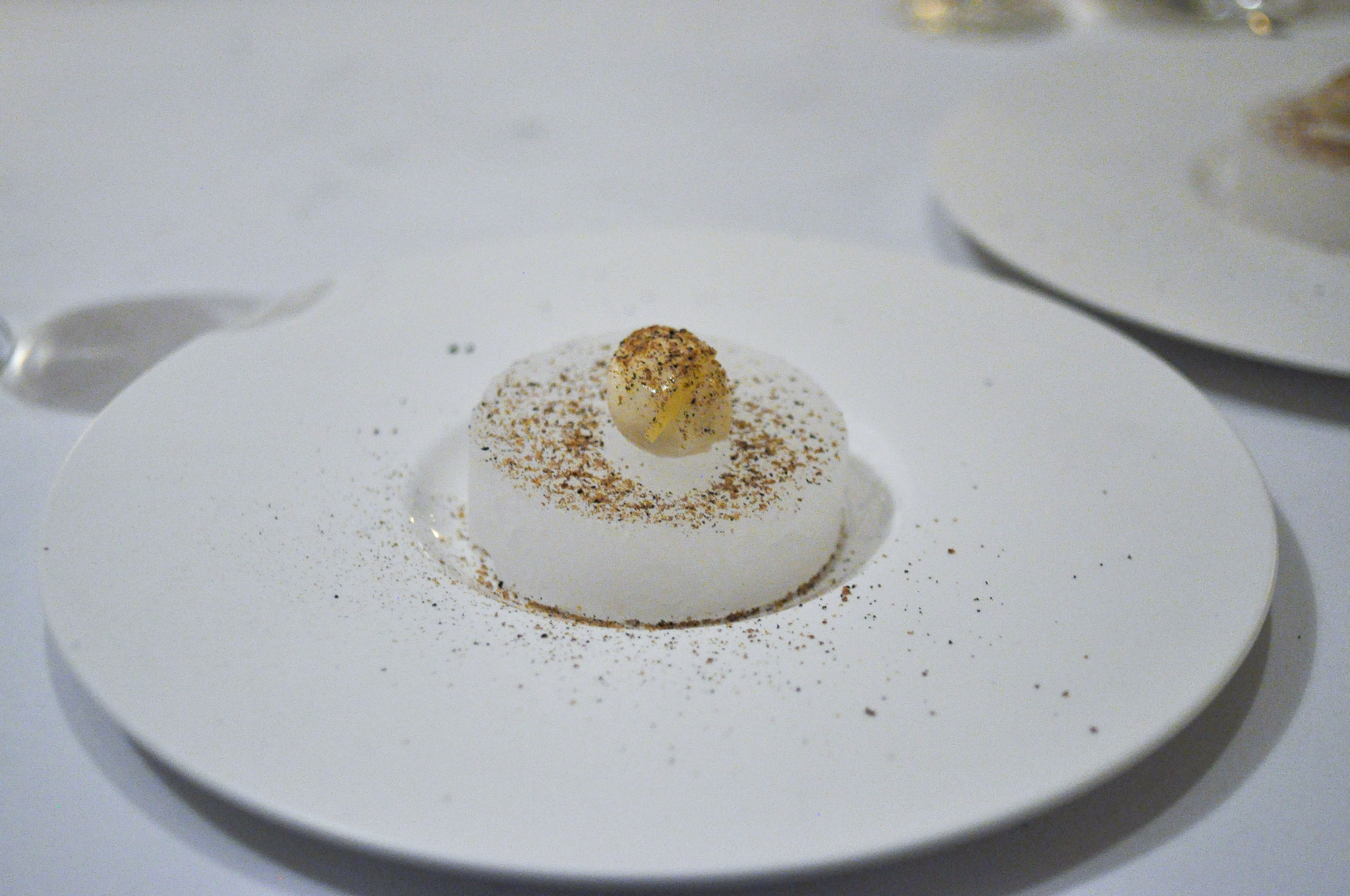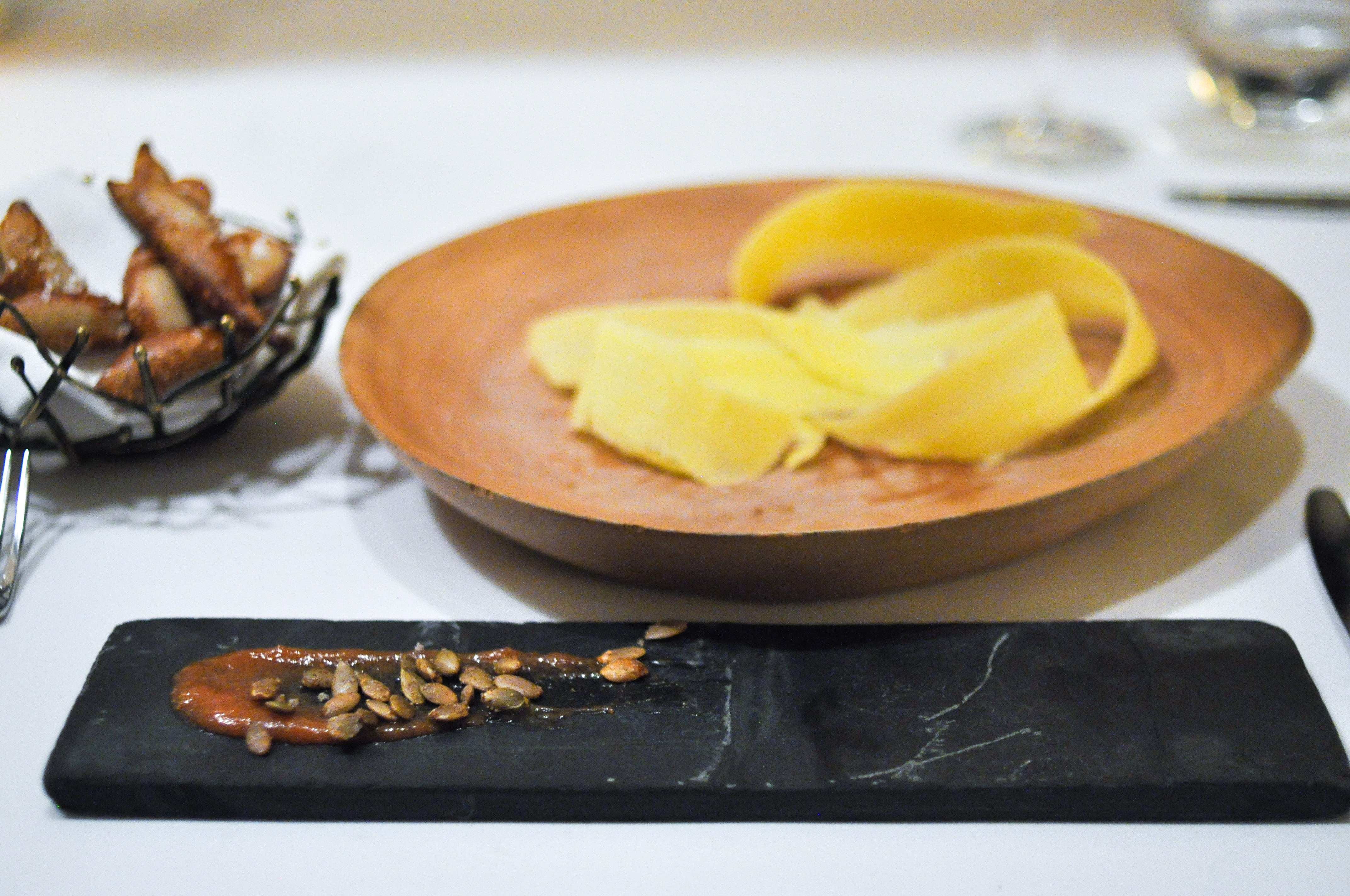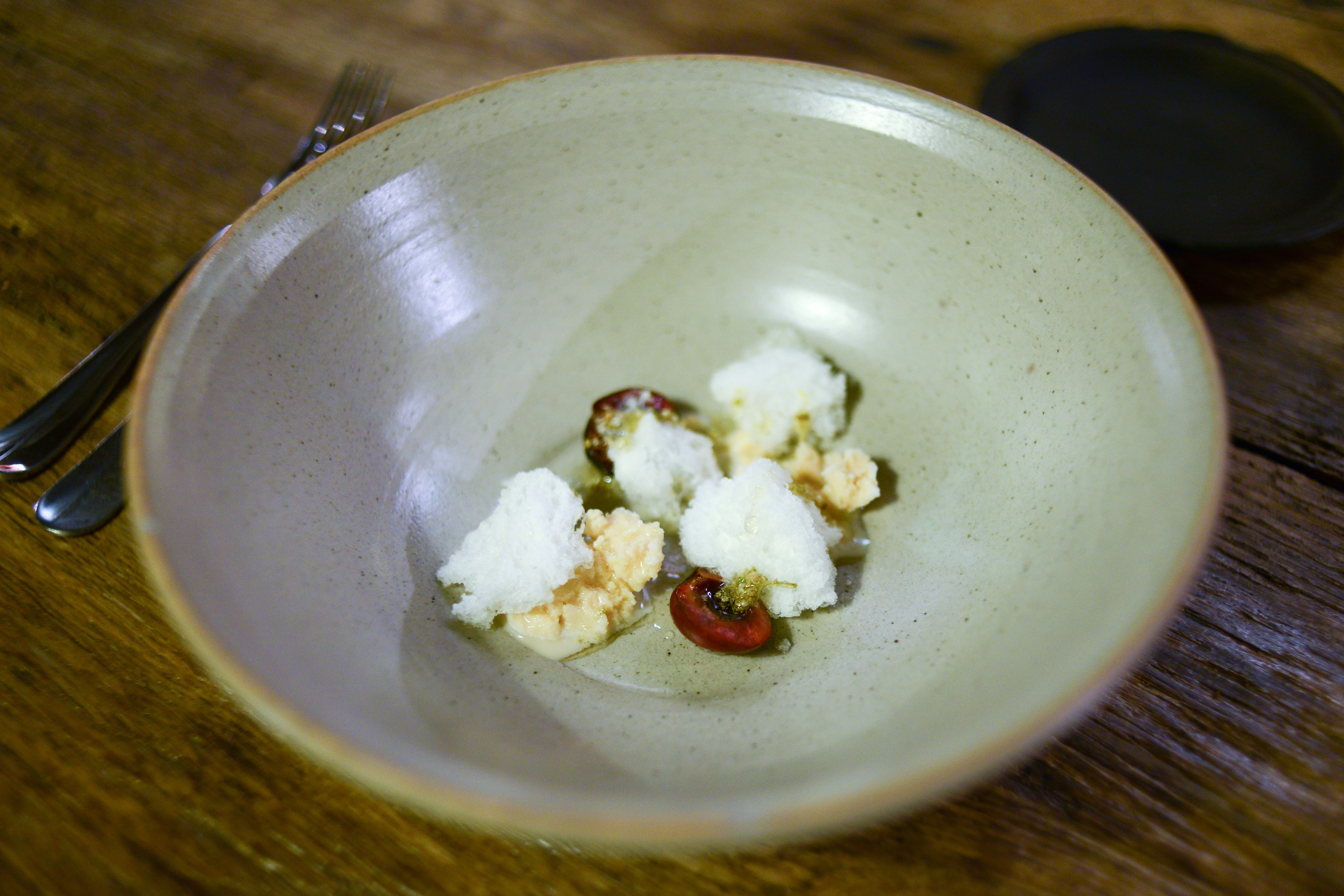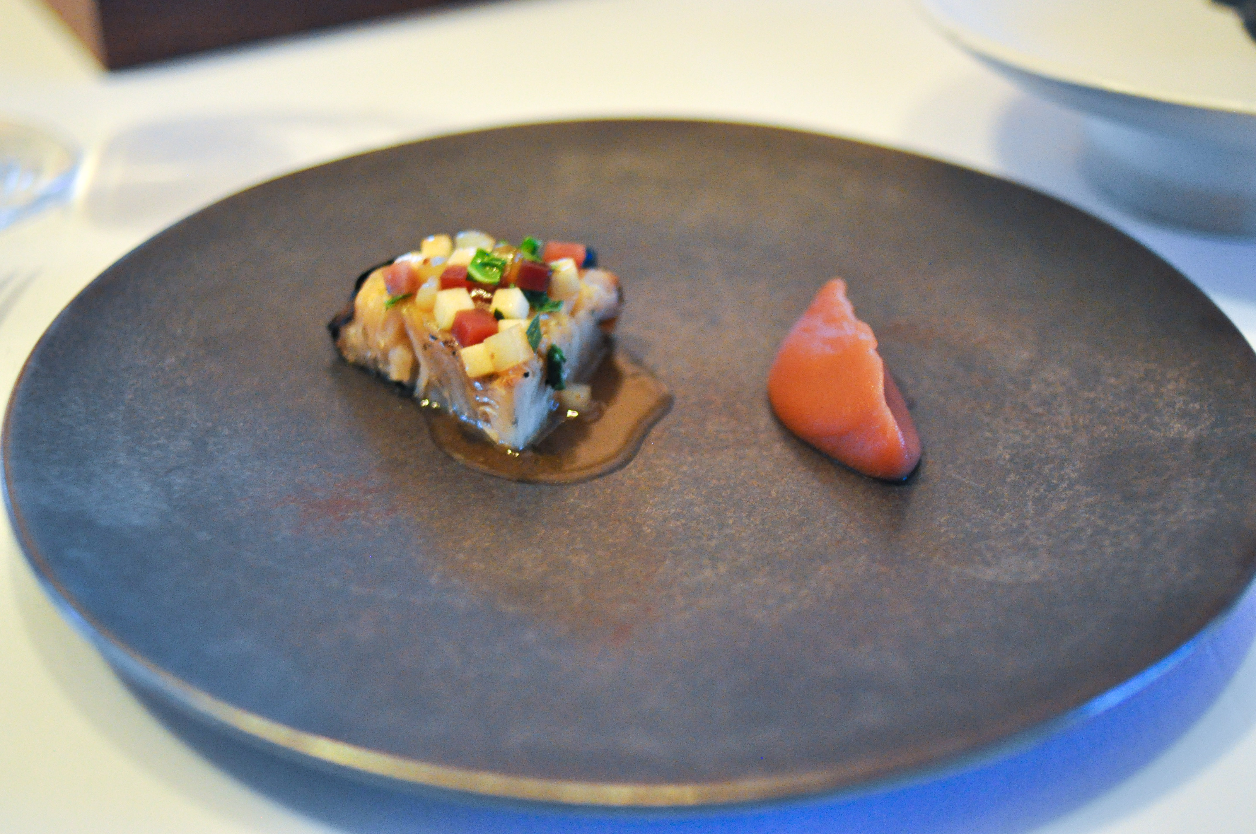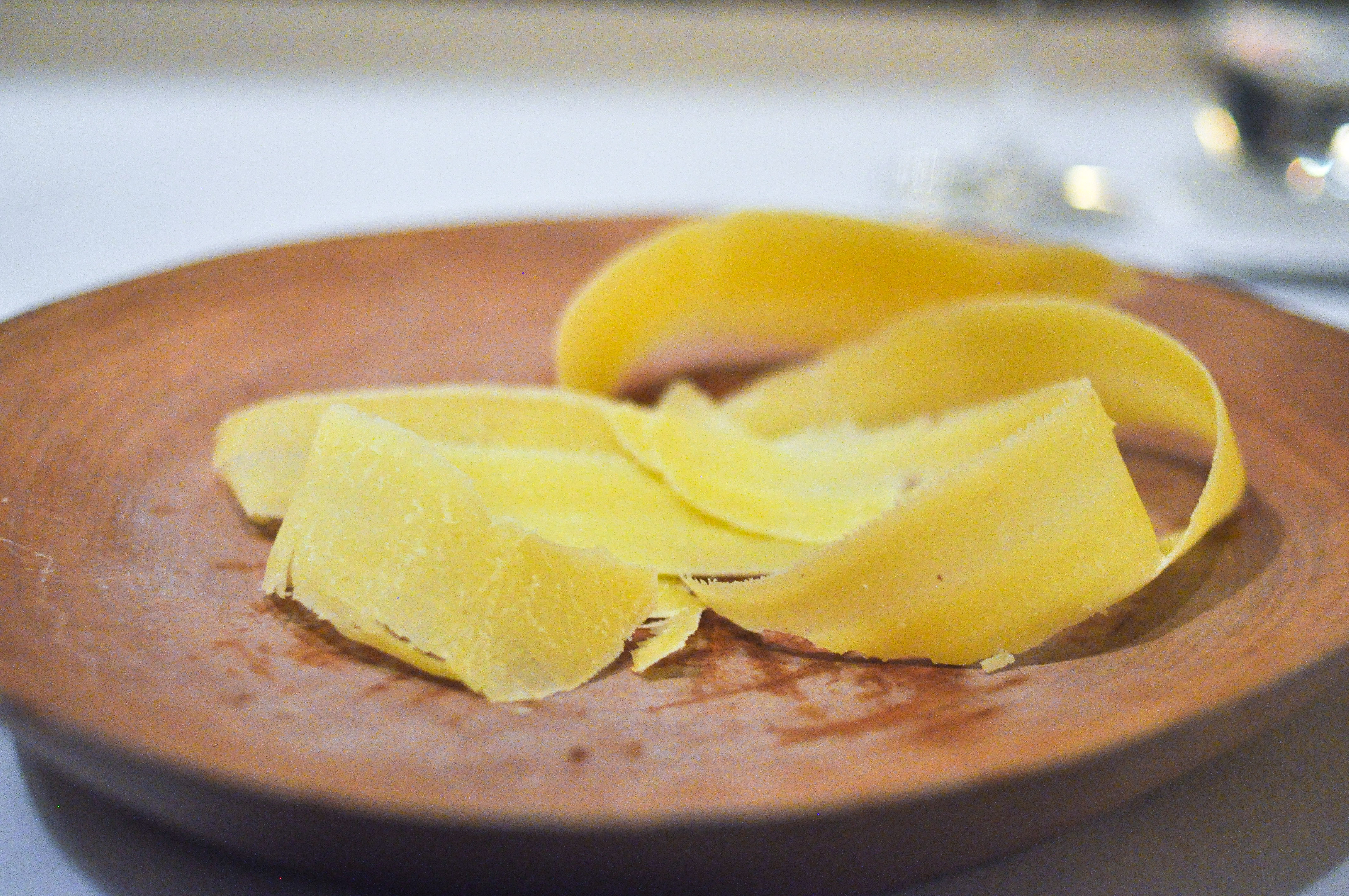 Petit fours “red pepper-black olive” Kinch’s signature opener of red pepper pate de fruits and black olive madeleines. Good vegetal balance in the PDF and lightly sweet, nicely dense madeleine.
