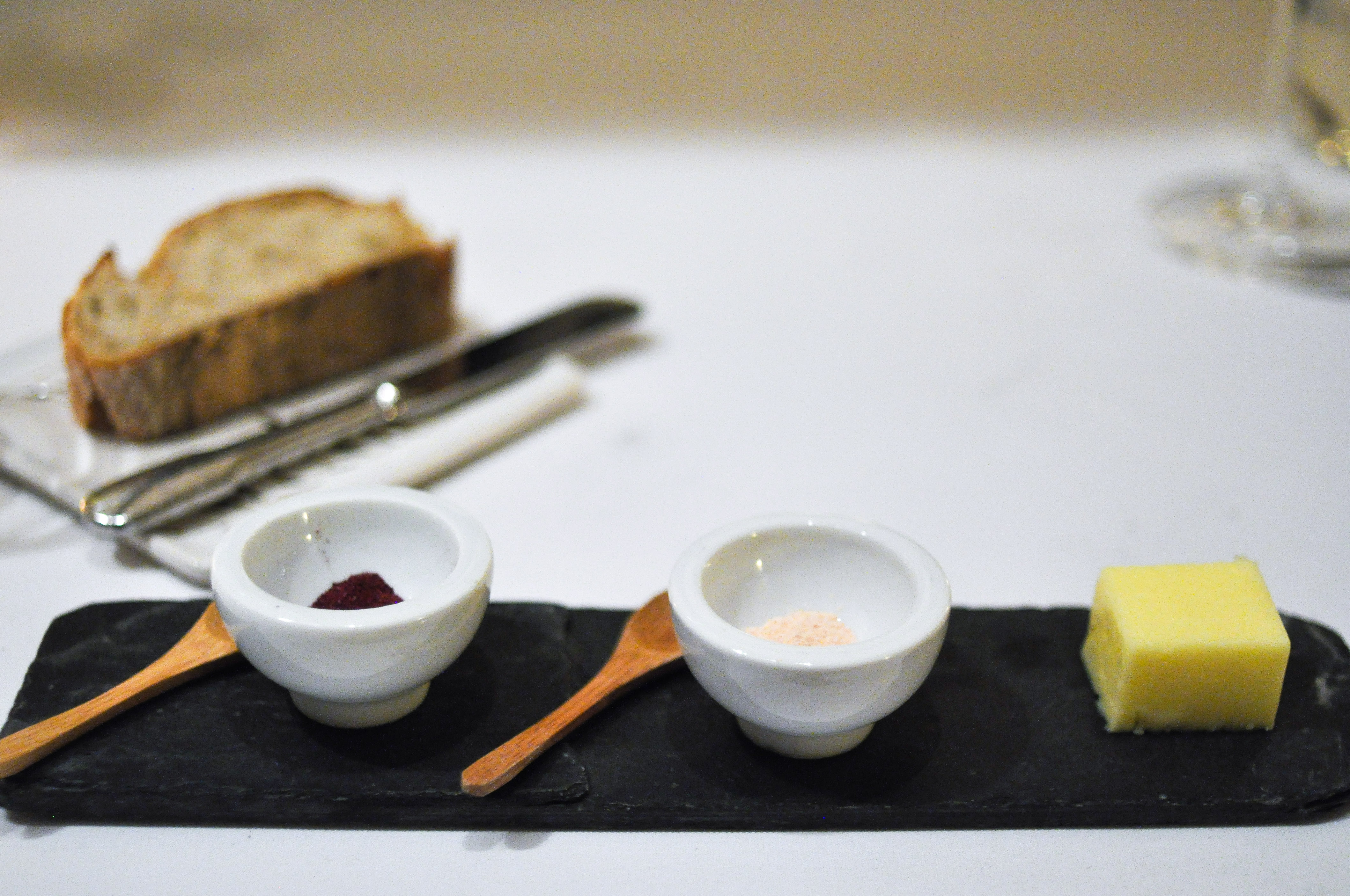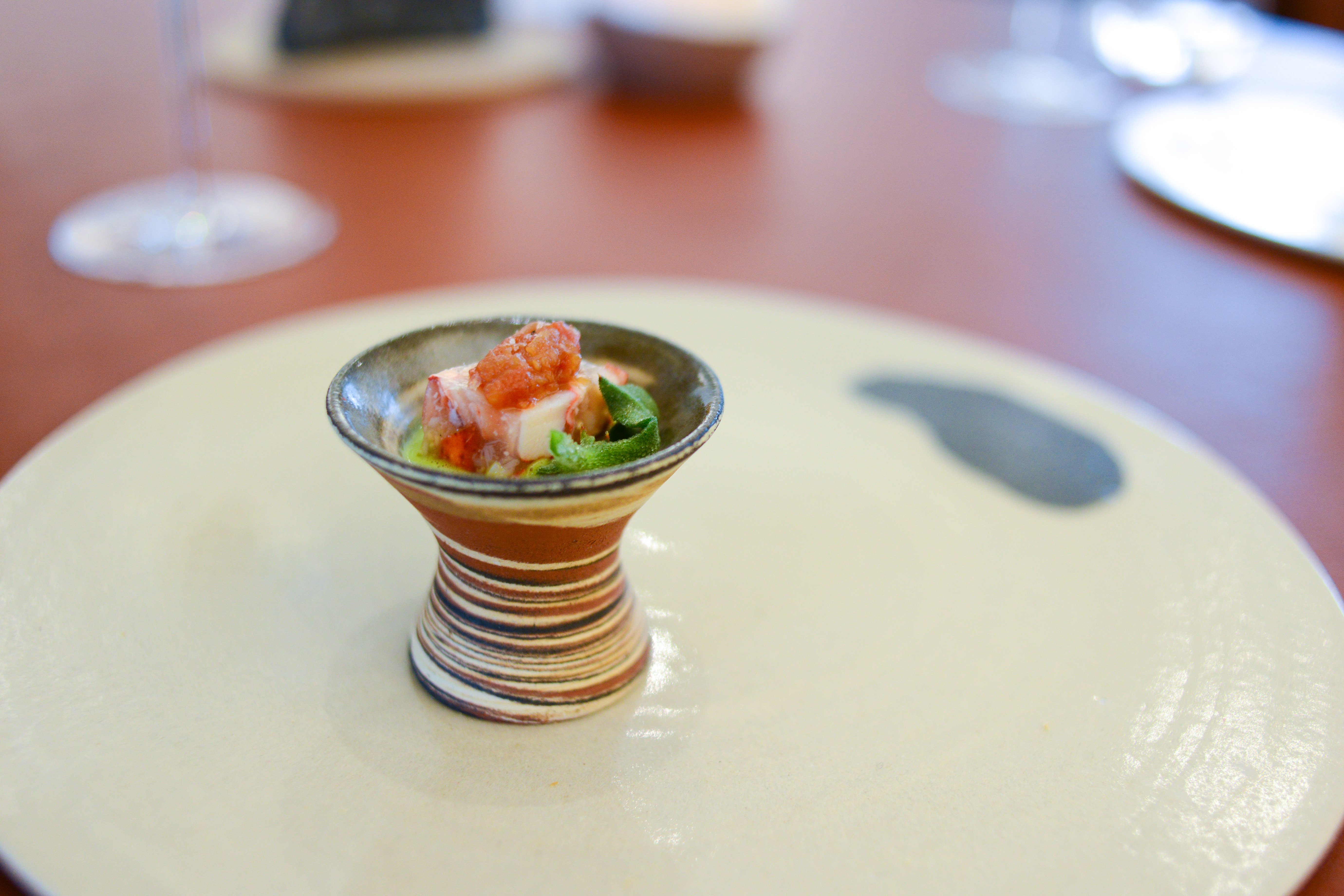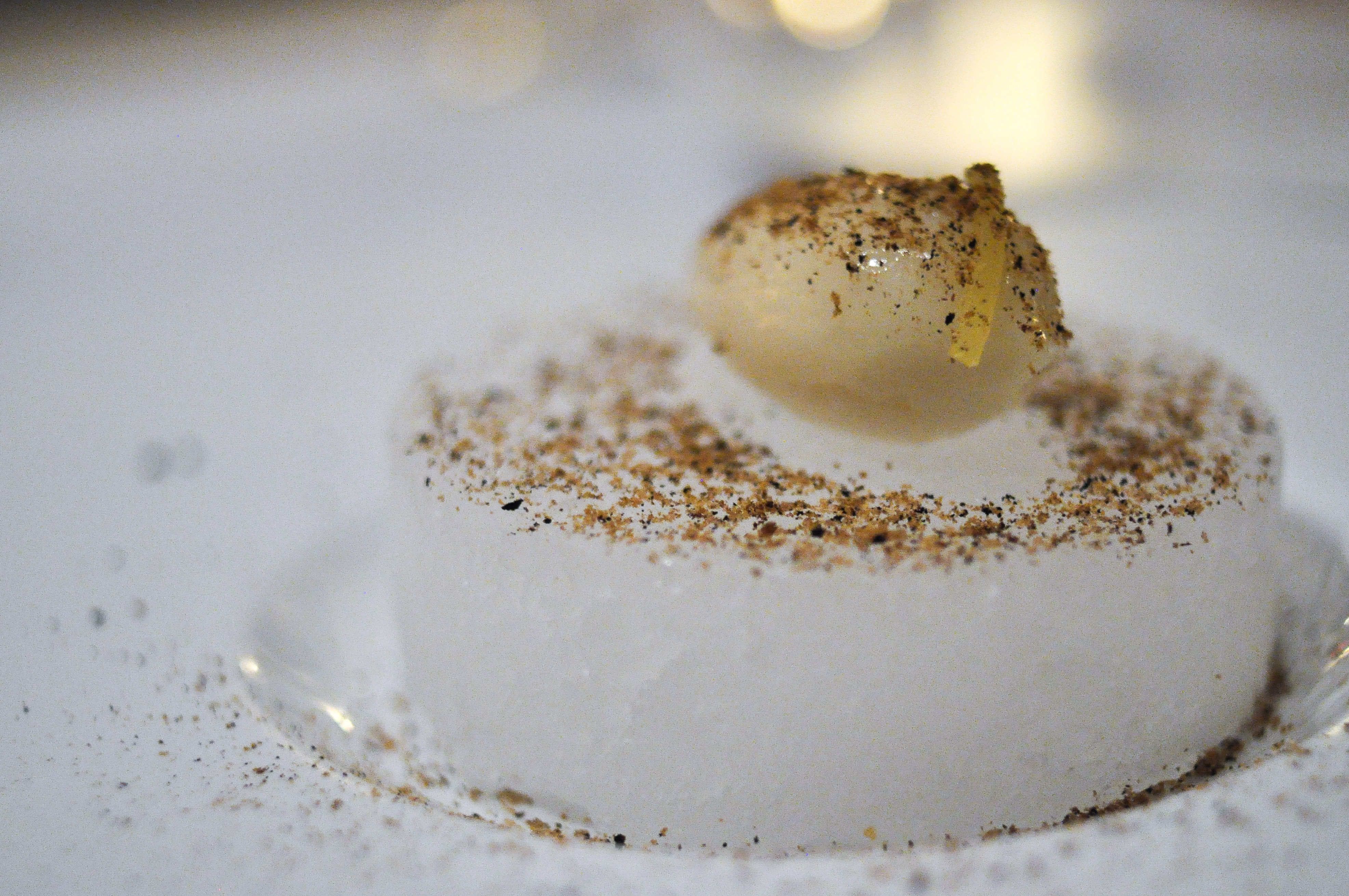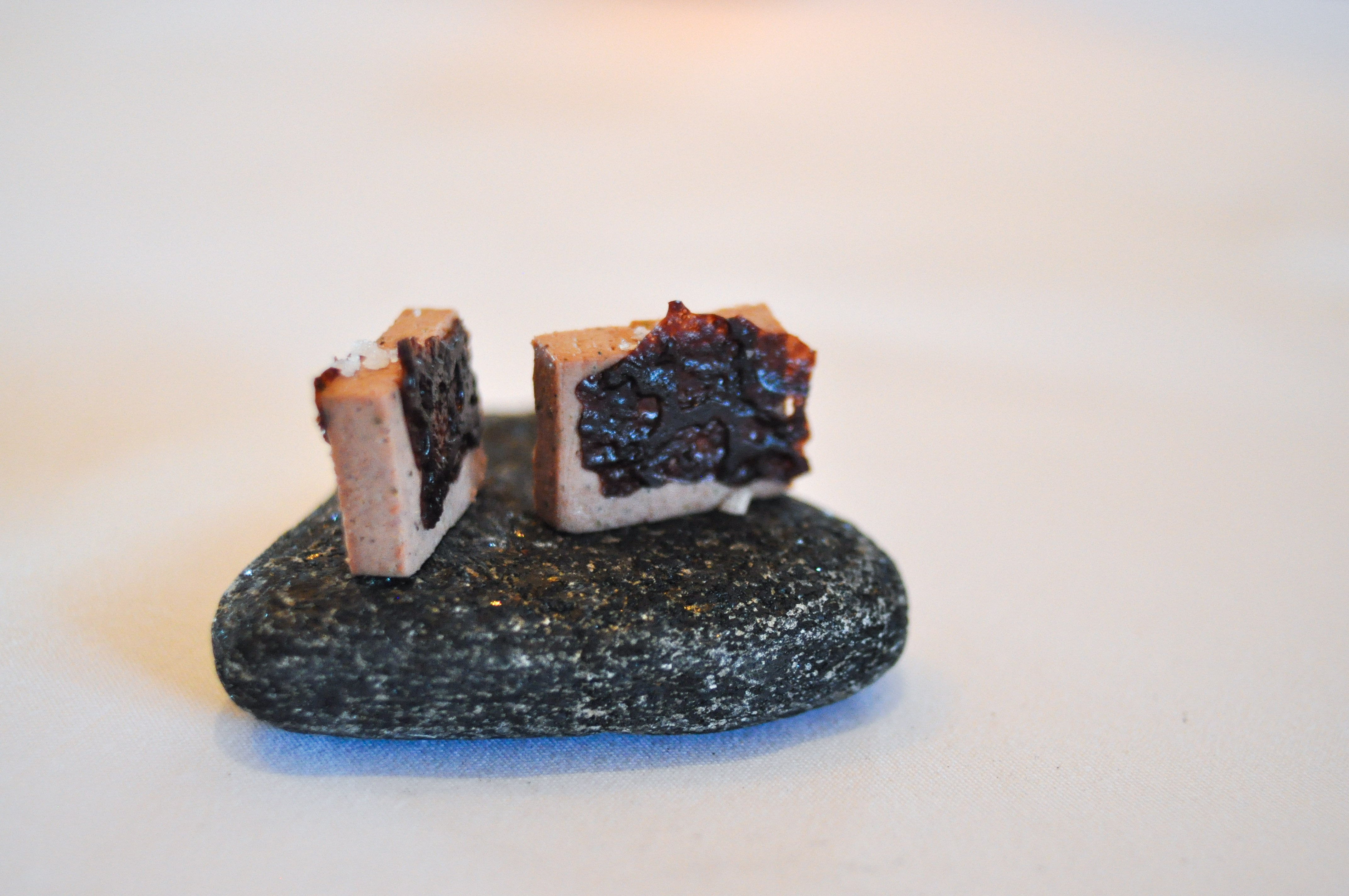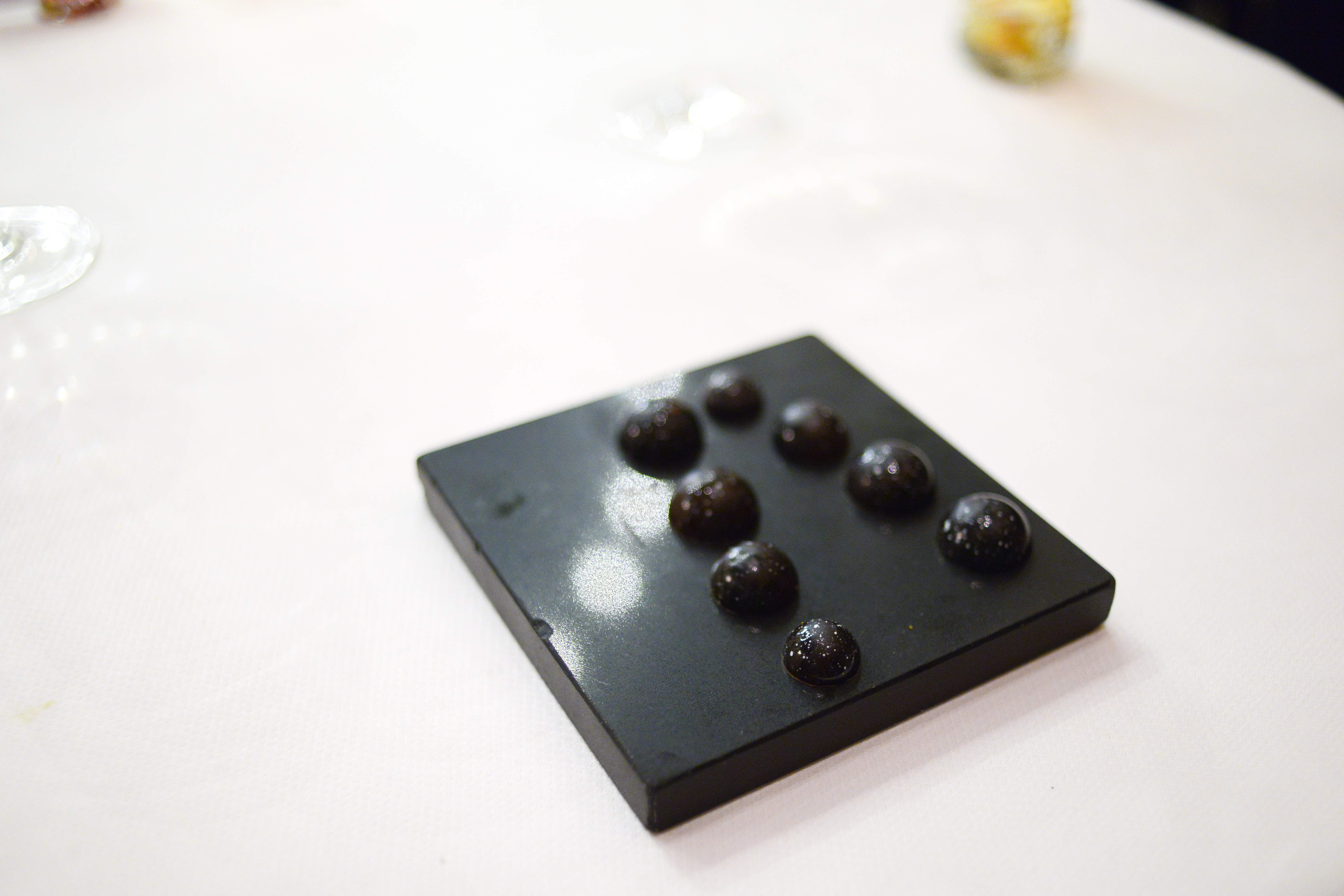 Petit fours “red pepper-black olive” Kinch’s signature opener of red pepper pate de fruits and black olive madeleines. Good vegetal balance in the PDF and lightly sweet, nicely dense madeleine.