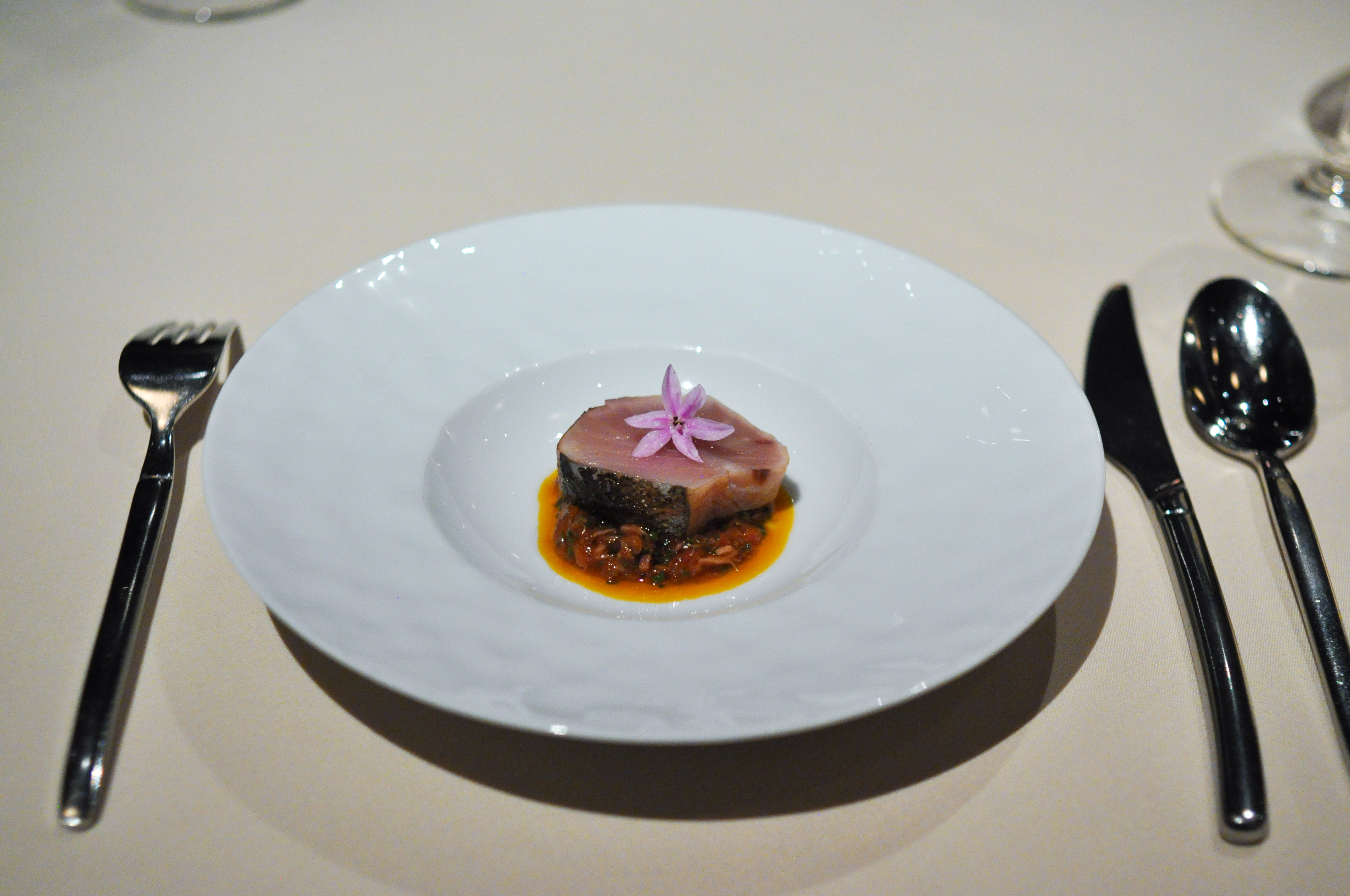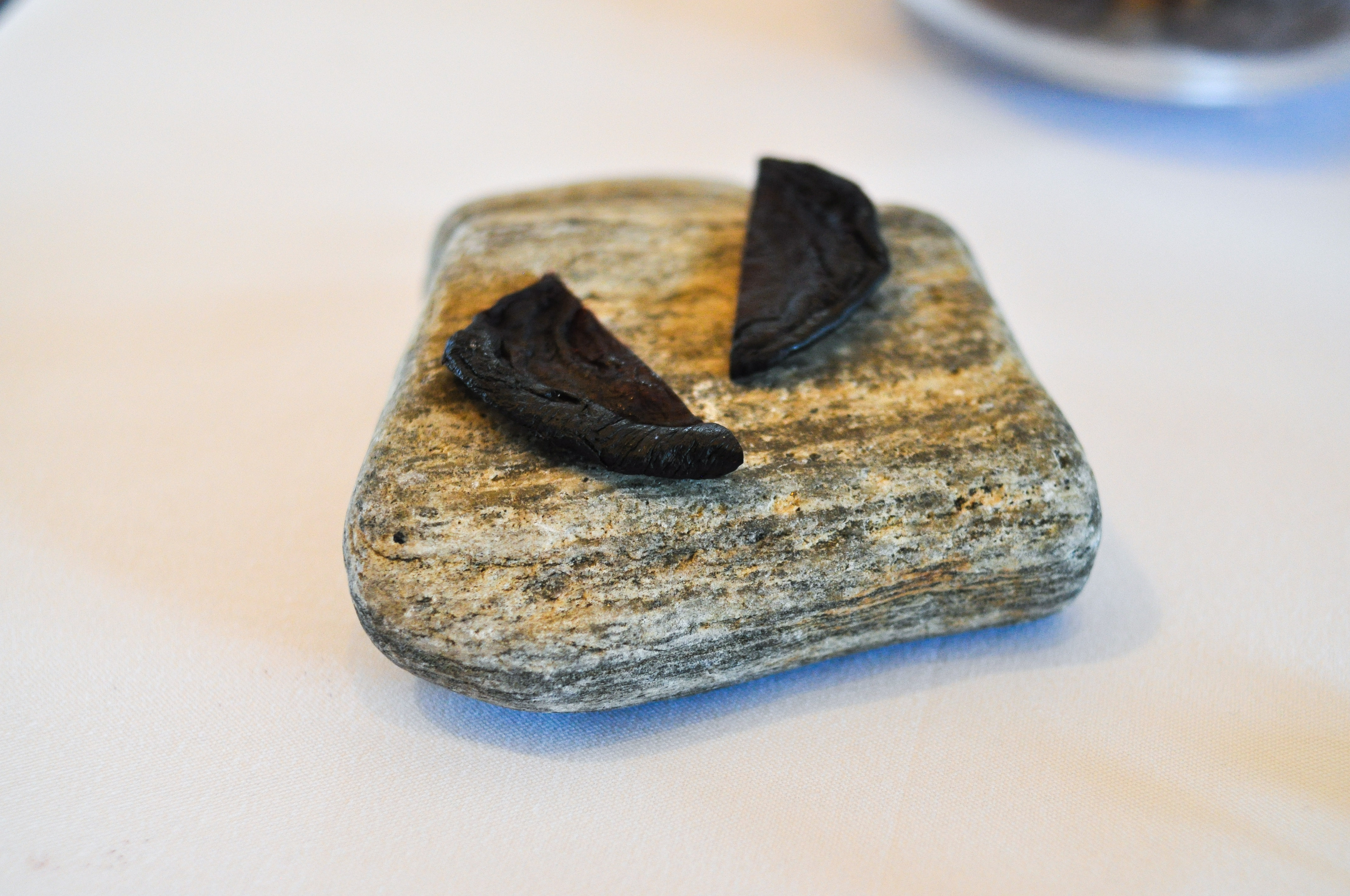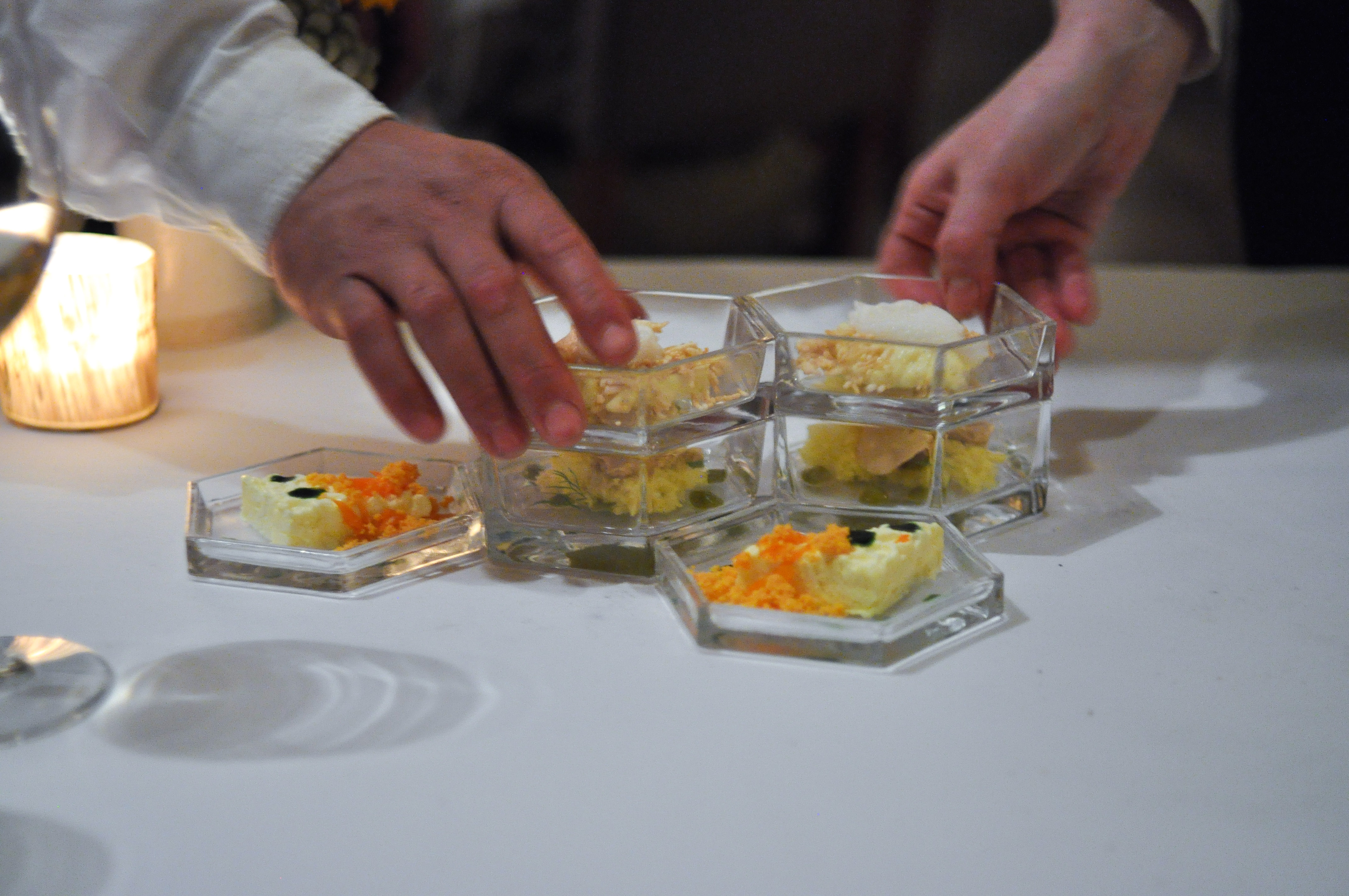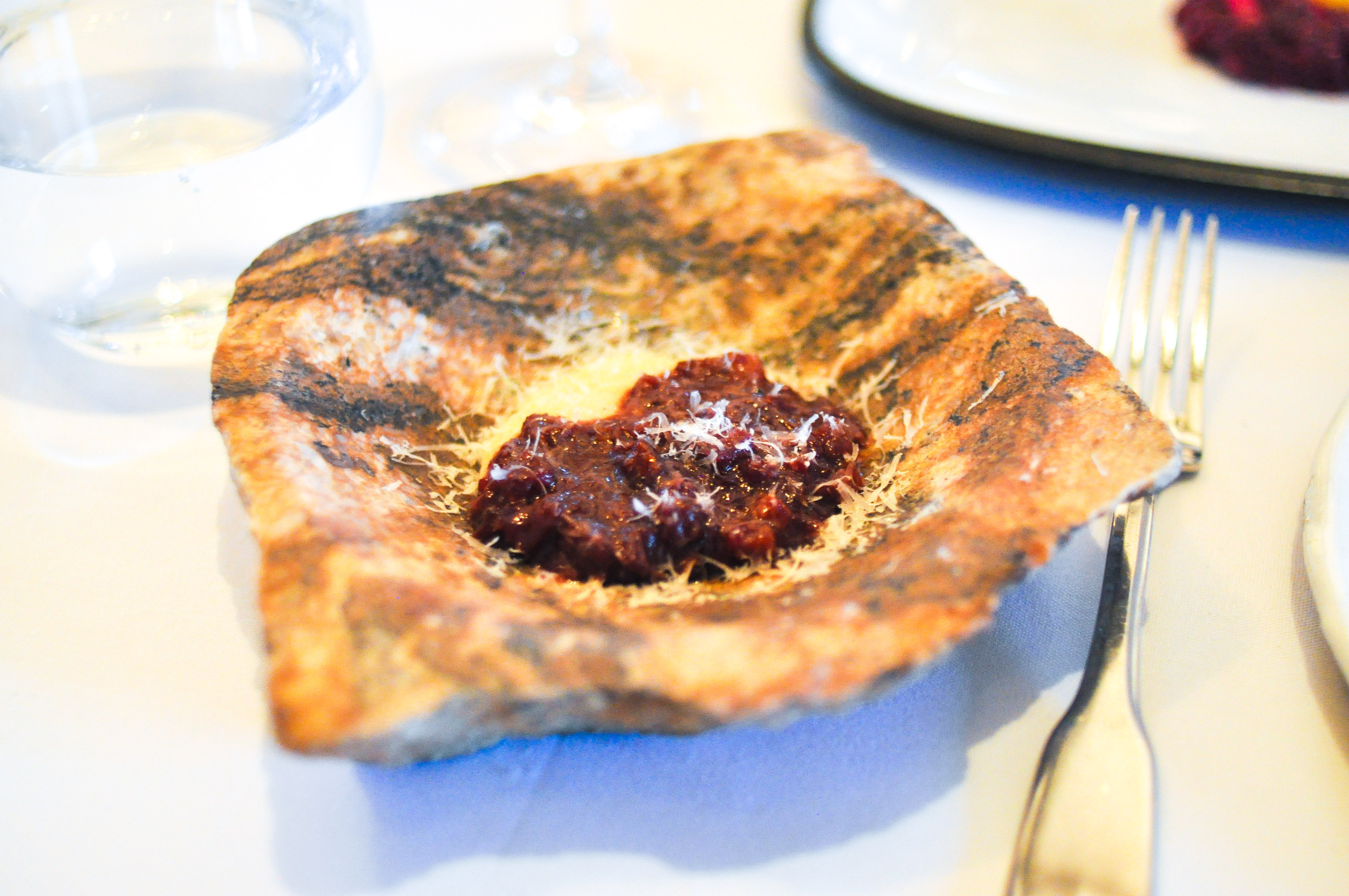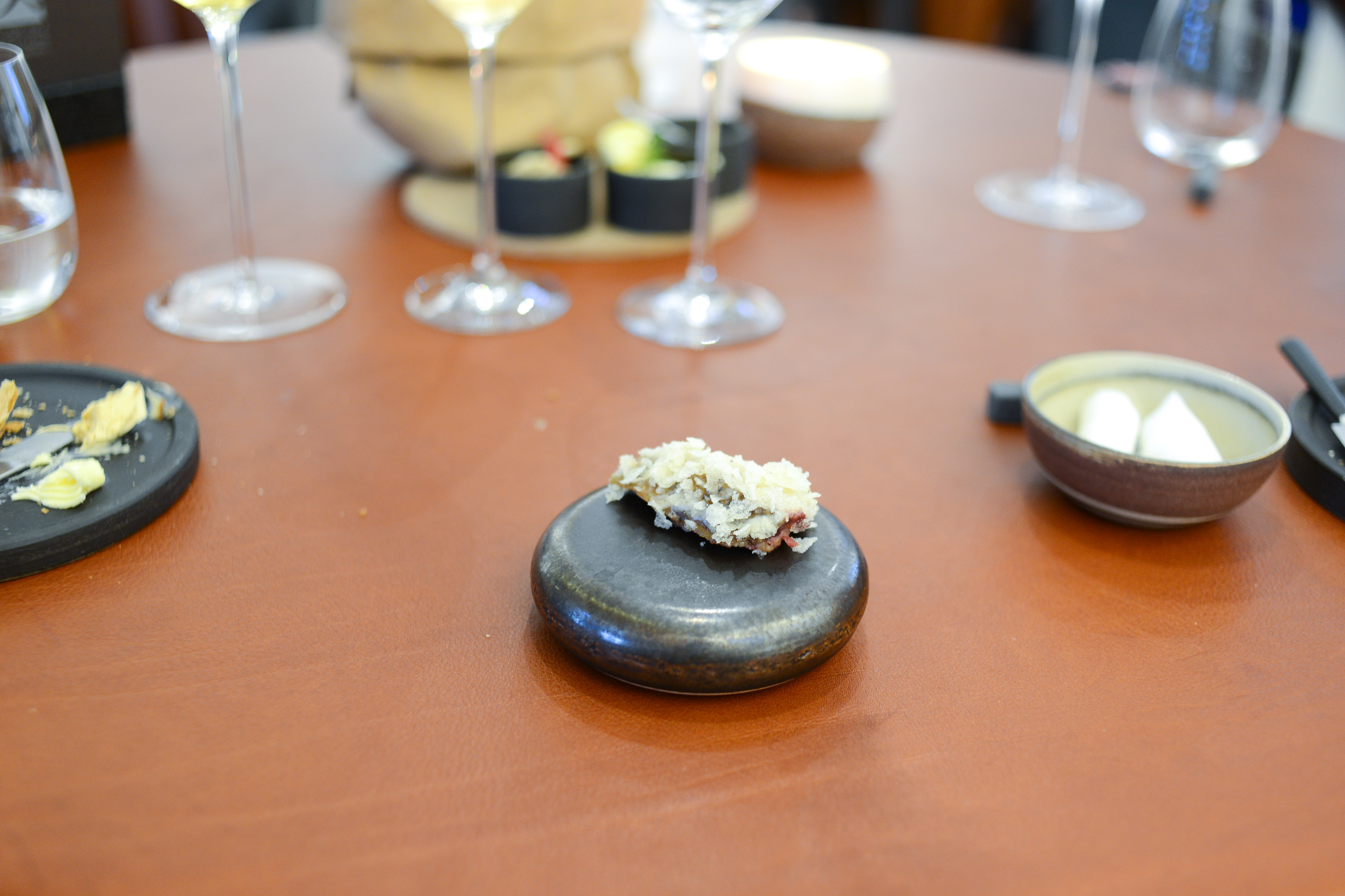 Petit fours “red pepper-black olive” Kinch’s signature opener of red pepper pate de fruits and black olive madeleines. Good vegetal balance in the PDF and lightly sweet, nicely dense madeleine.