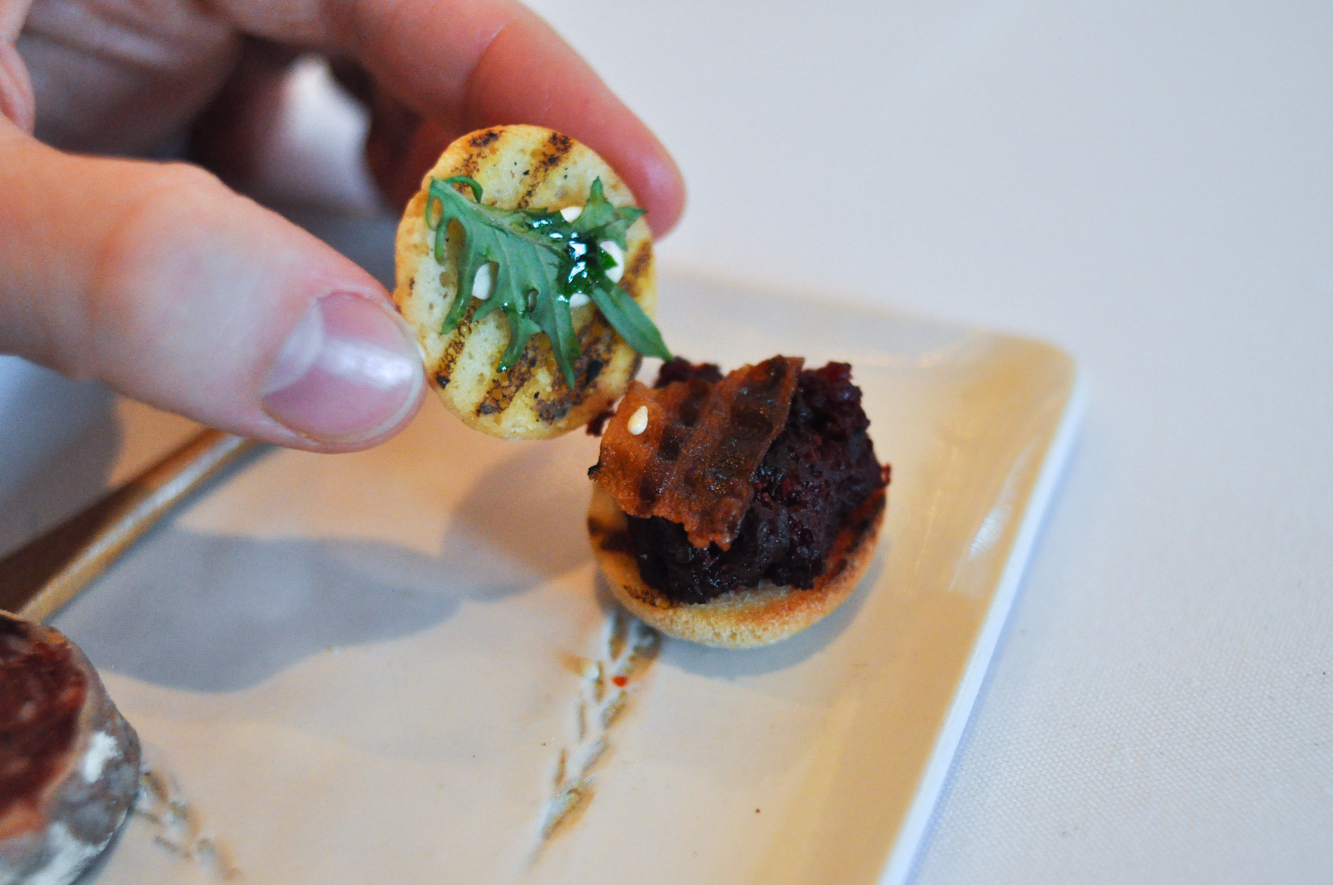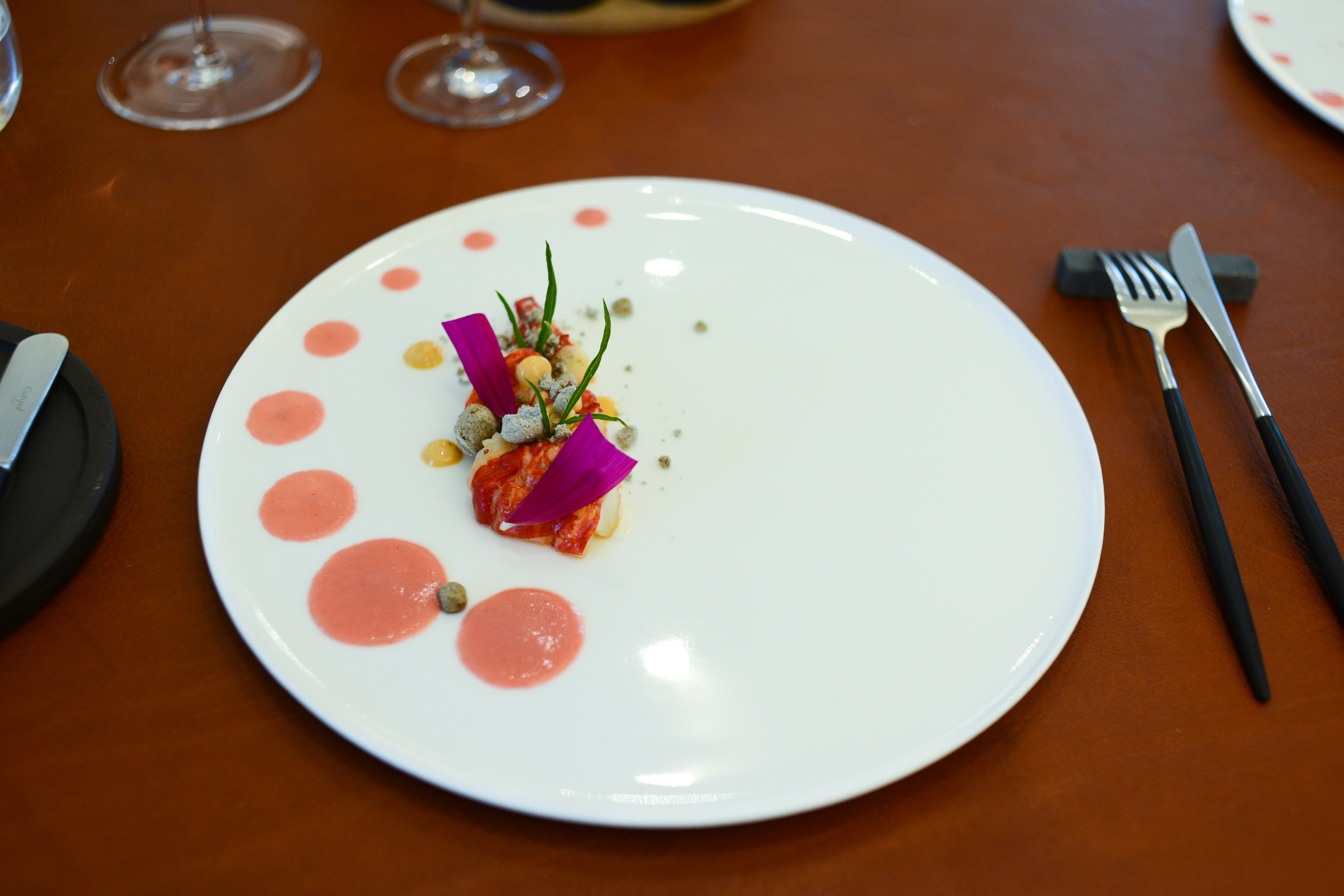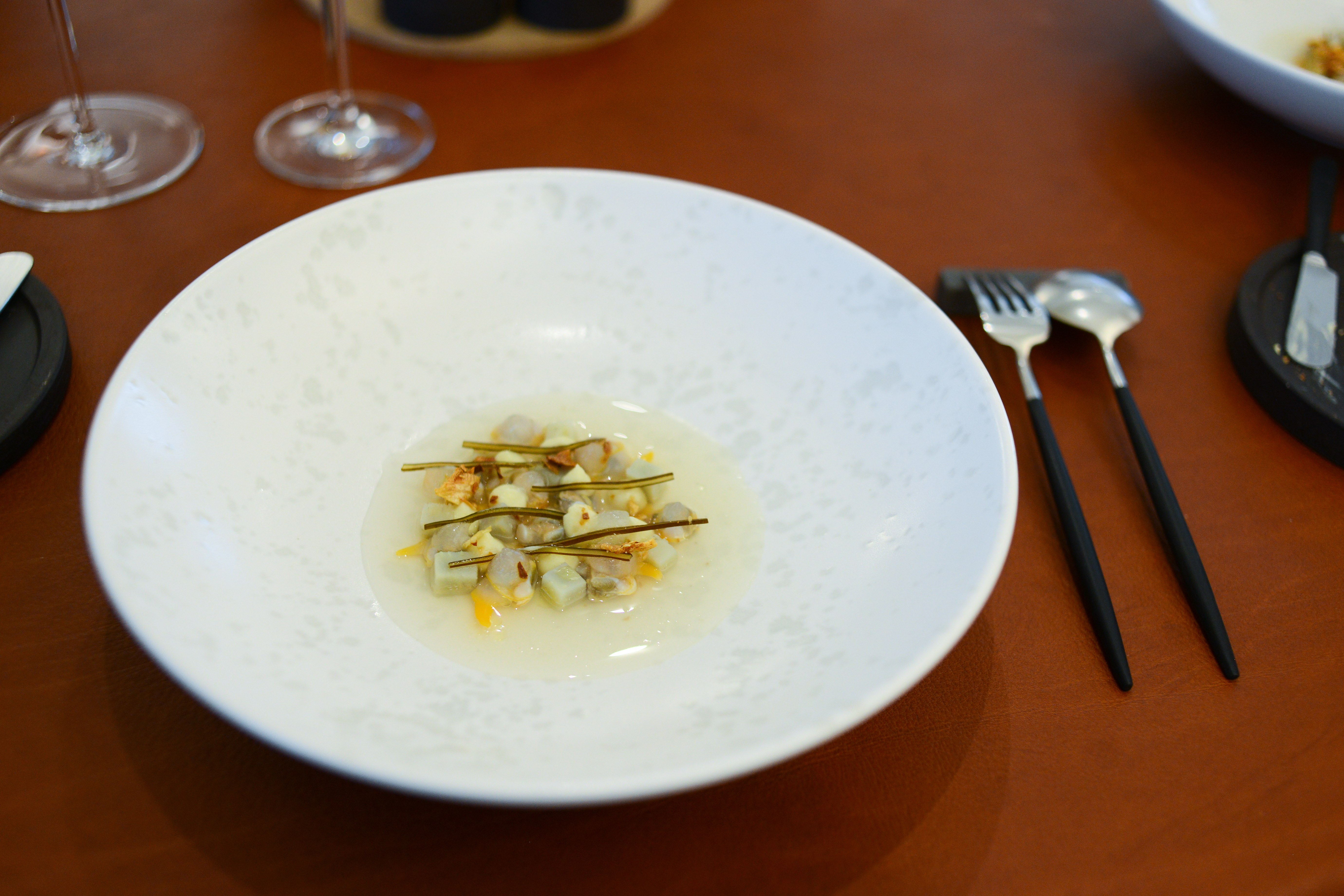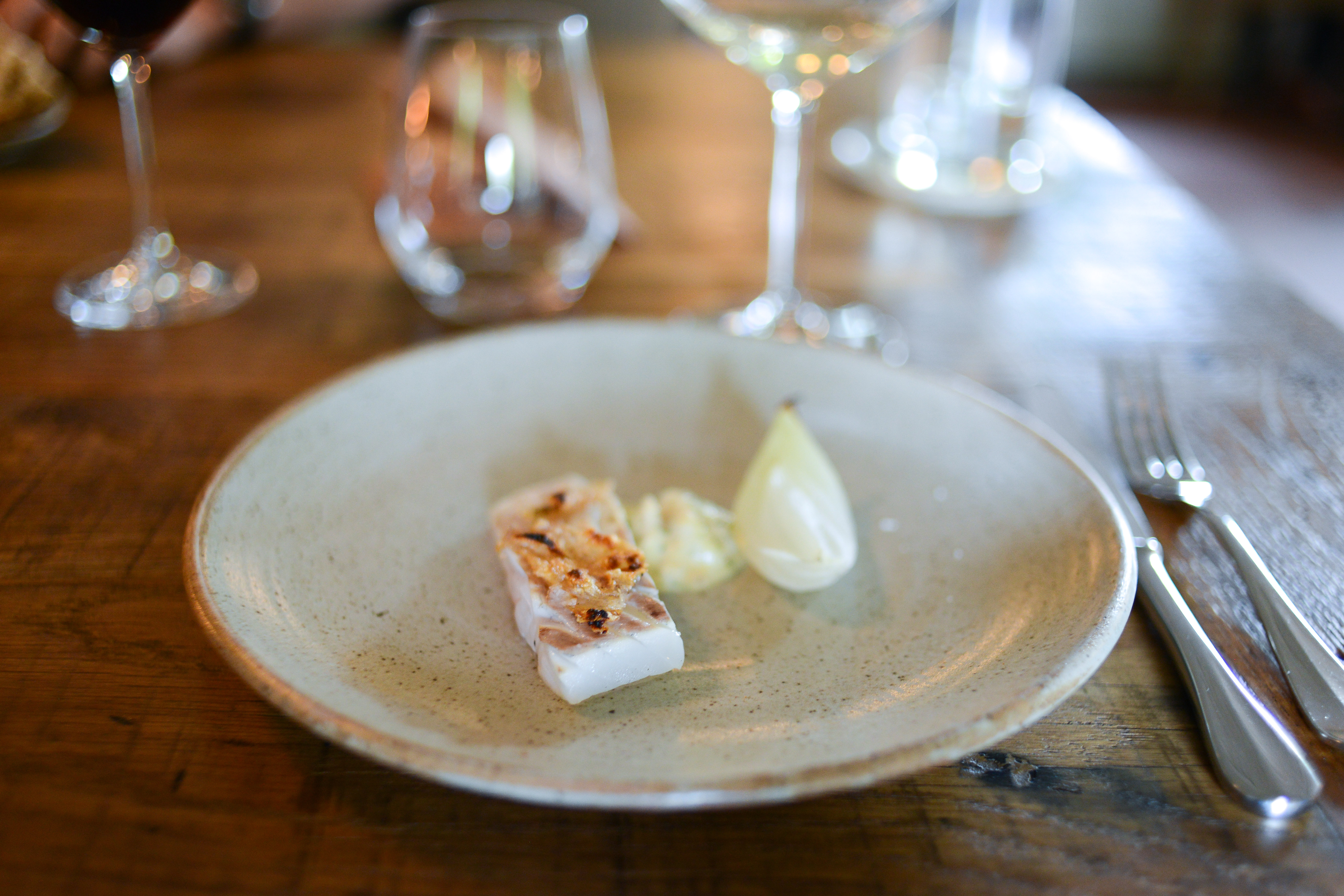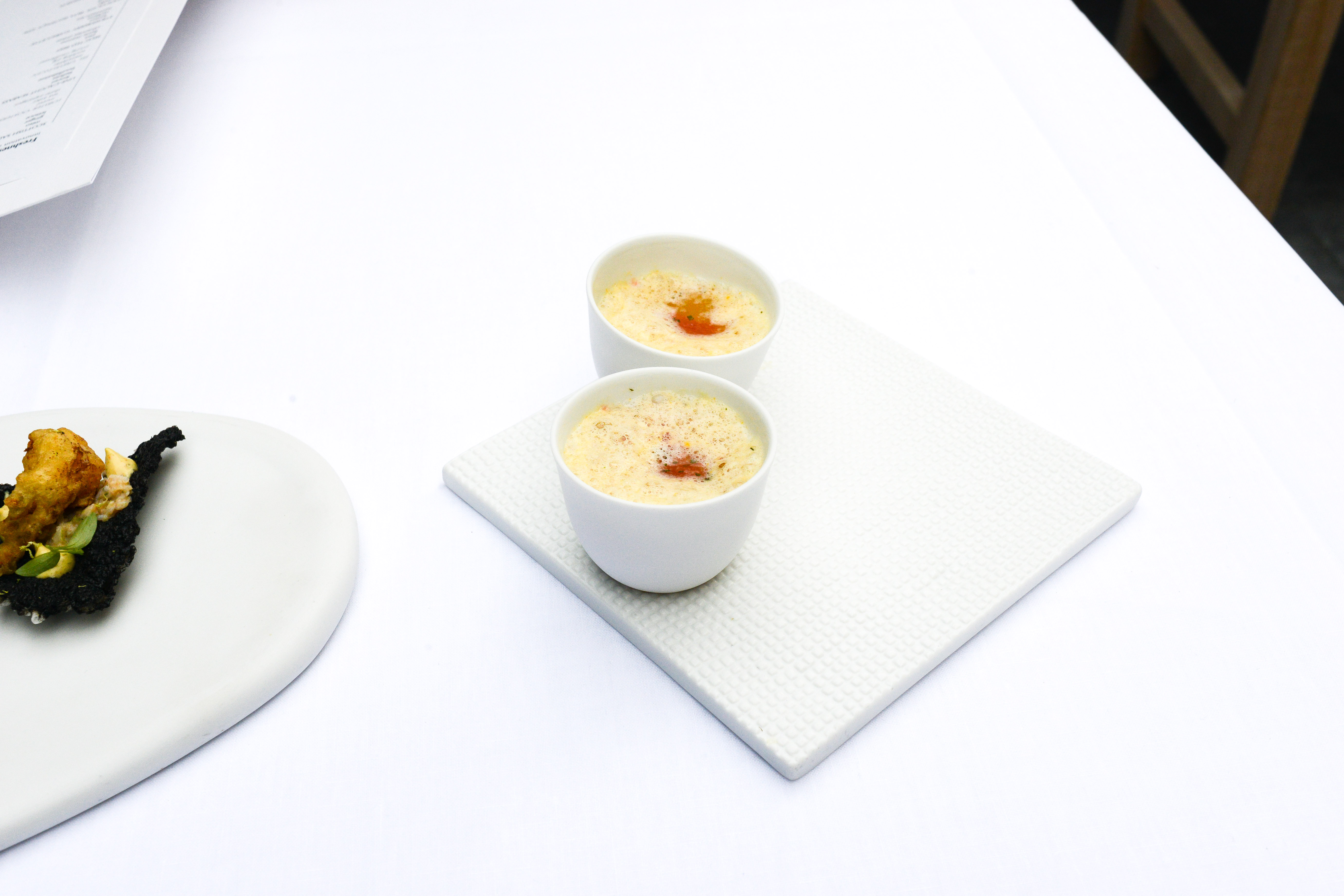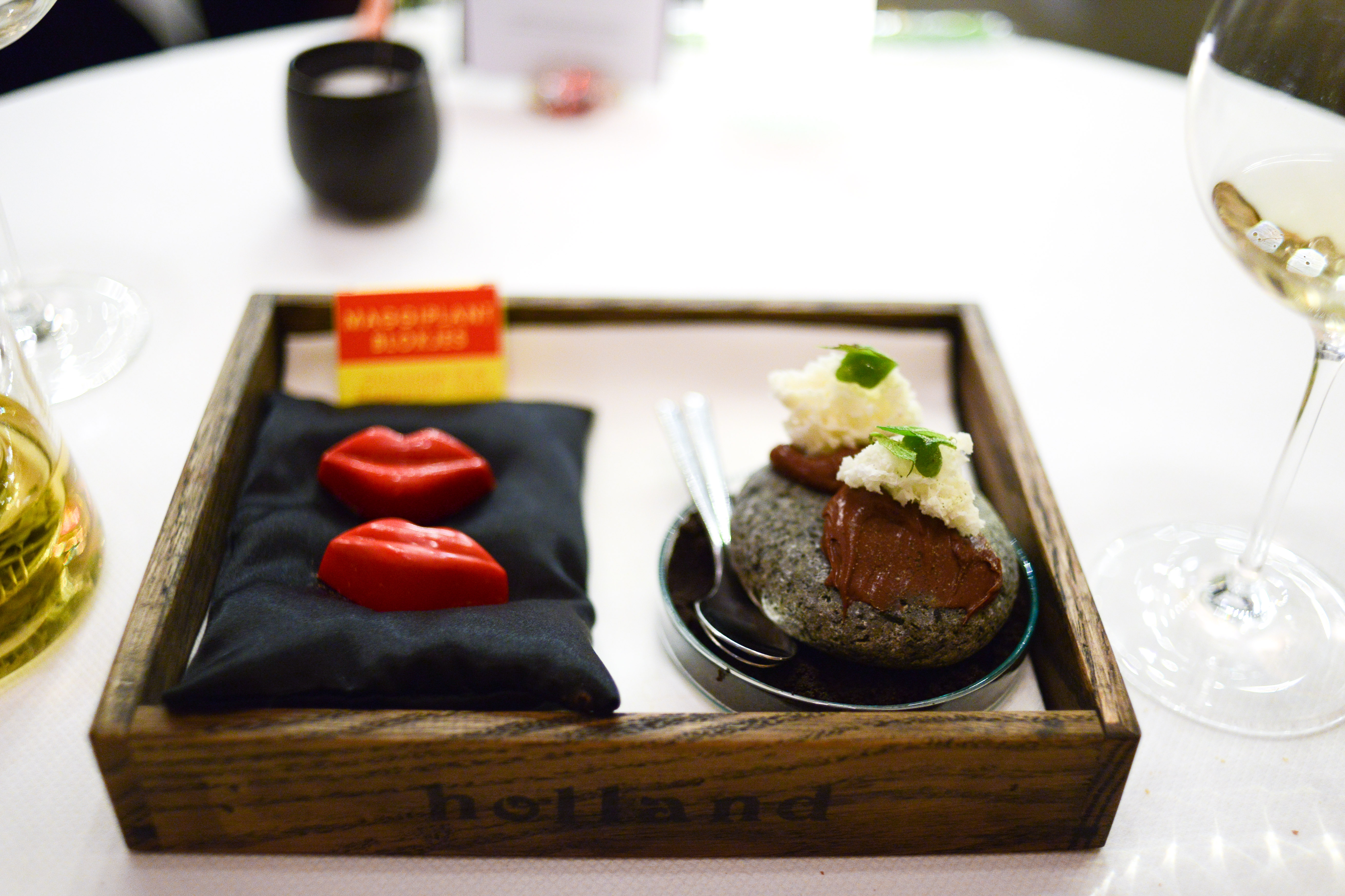 Petit fours “red pepper-black olive” Kinch’s signature opener of red pepper pate de fruits and black olive madeleines. Good vegetal balance in the PDF and lightly sweet, nicely dense madeleine.