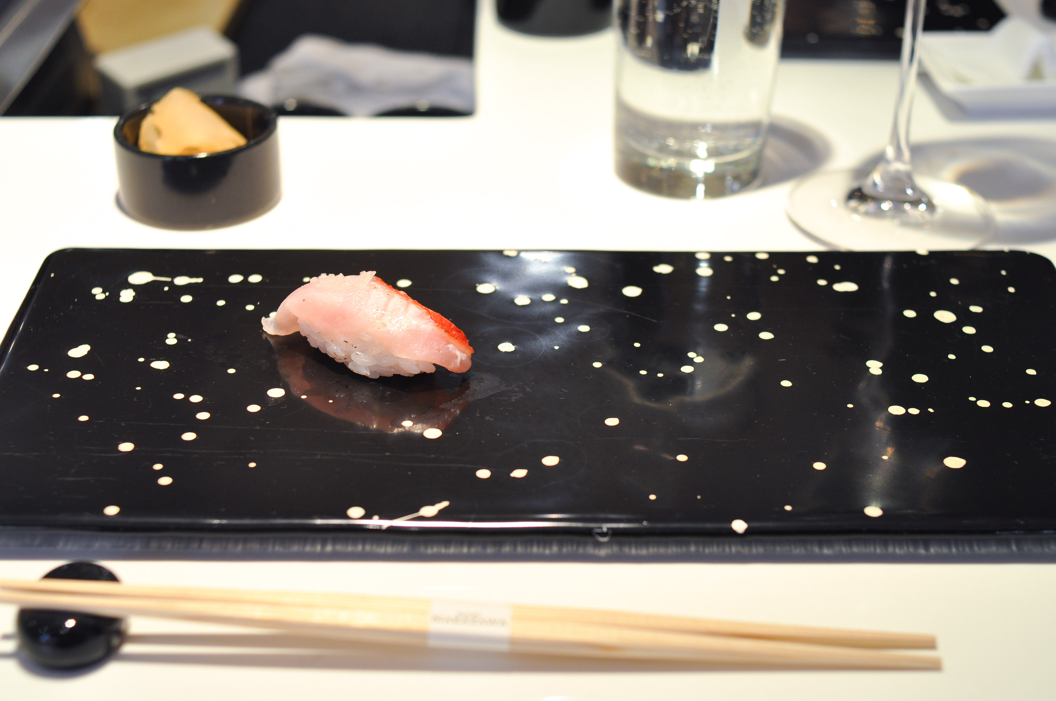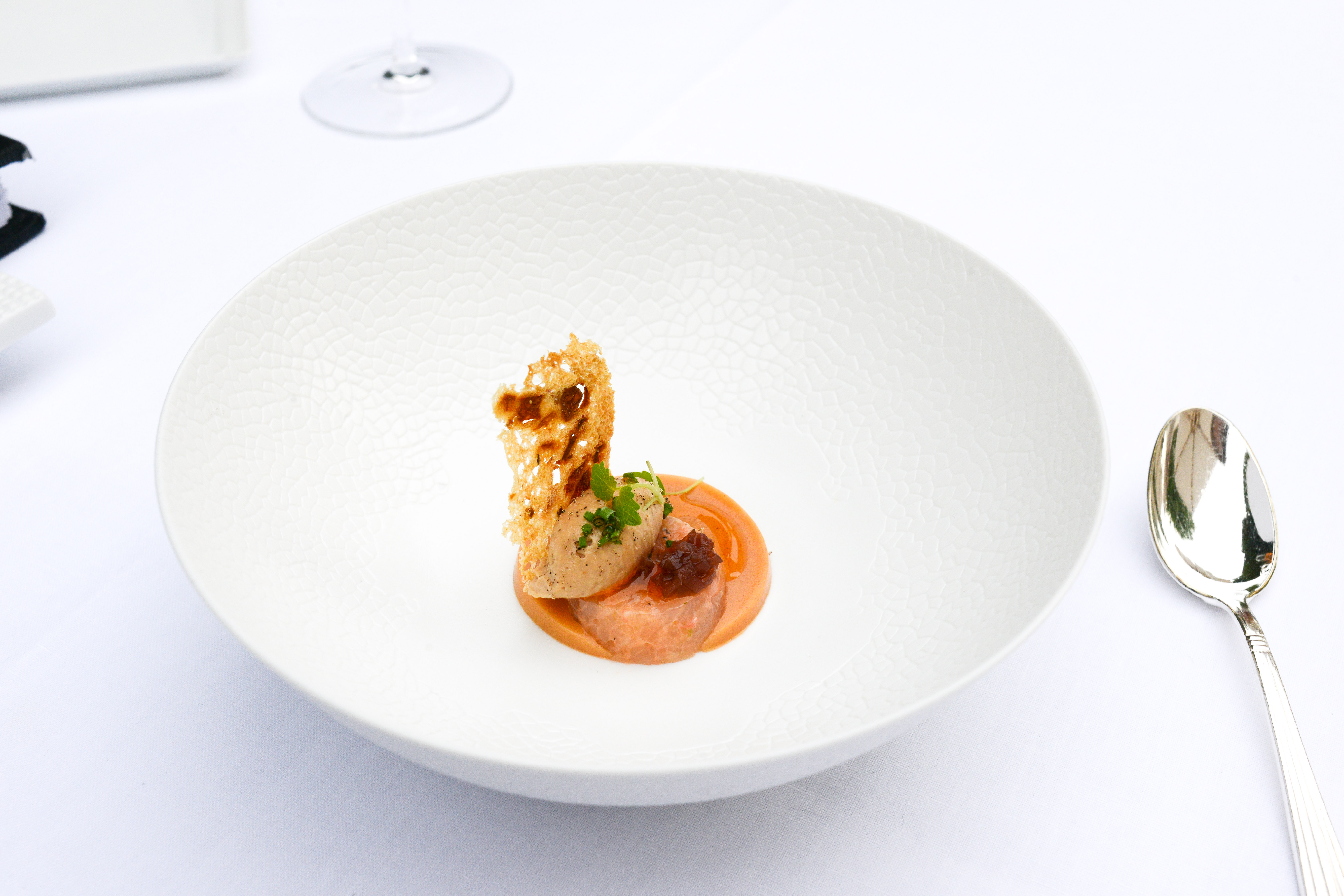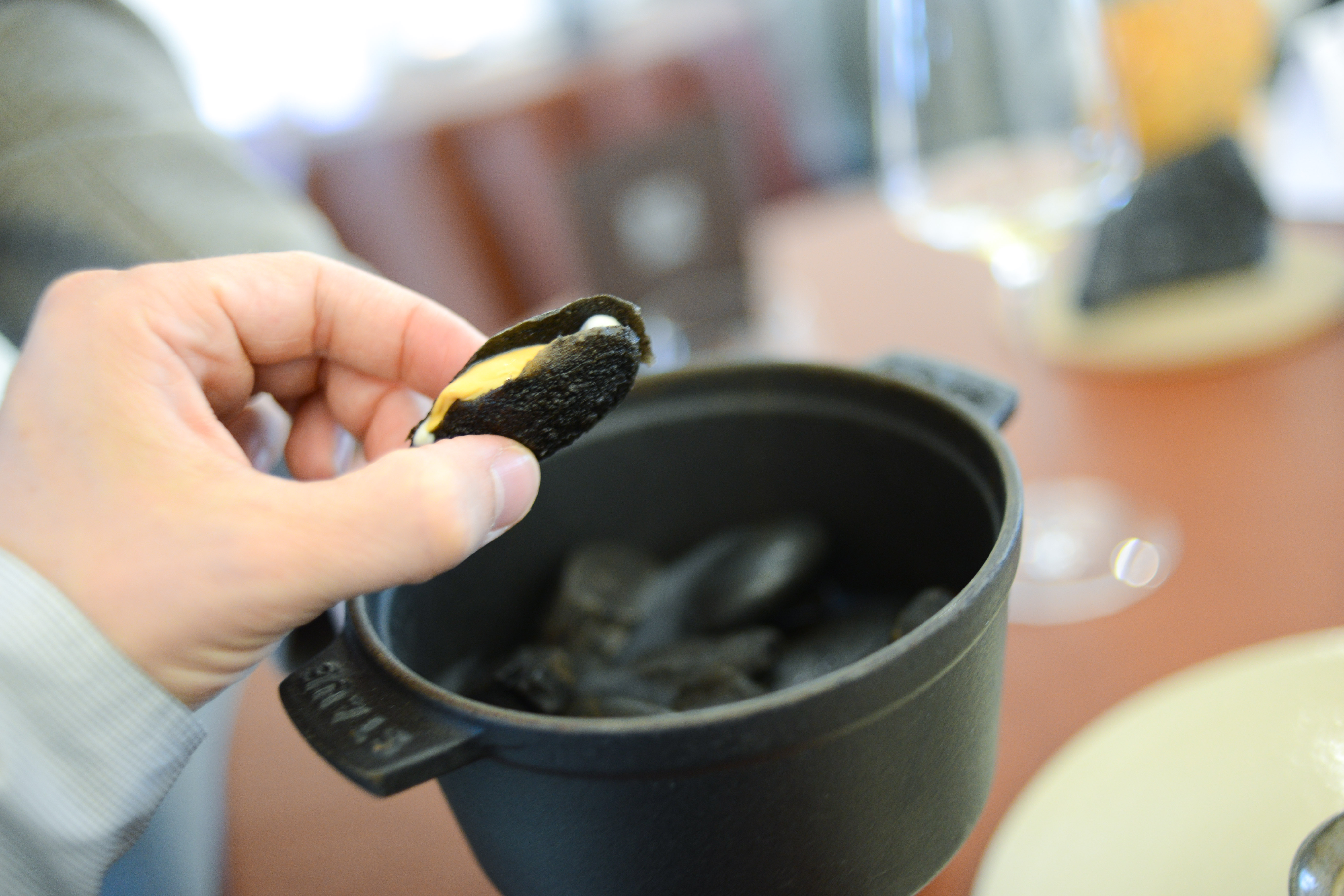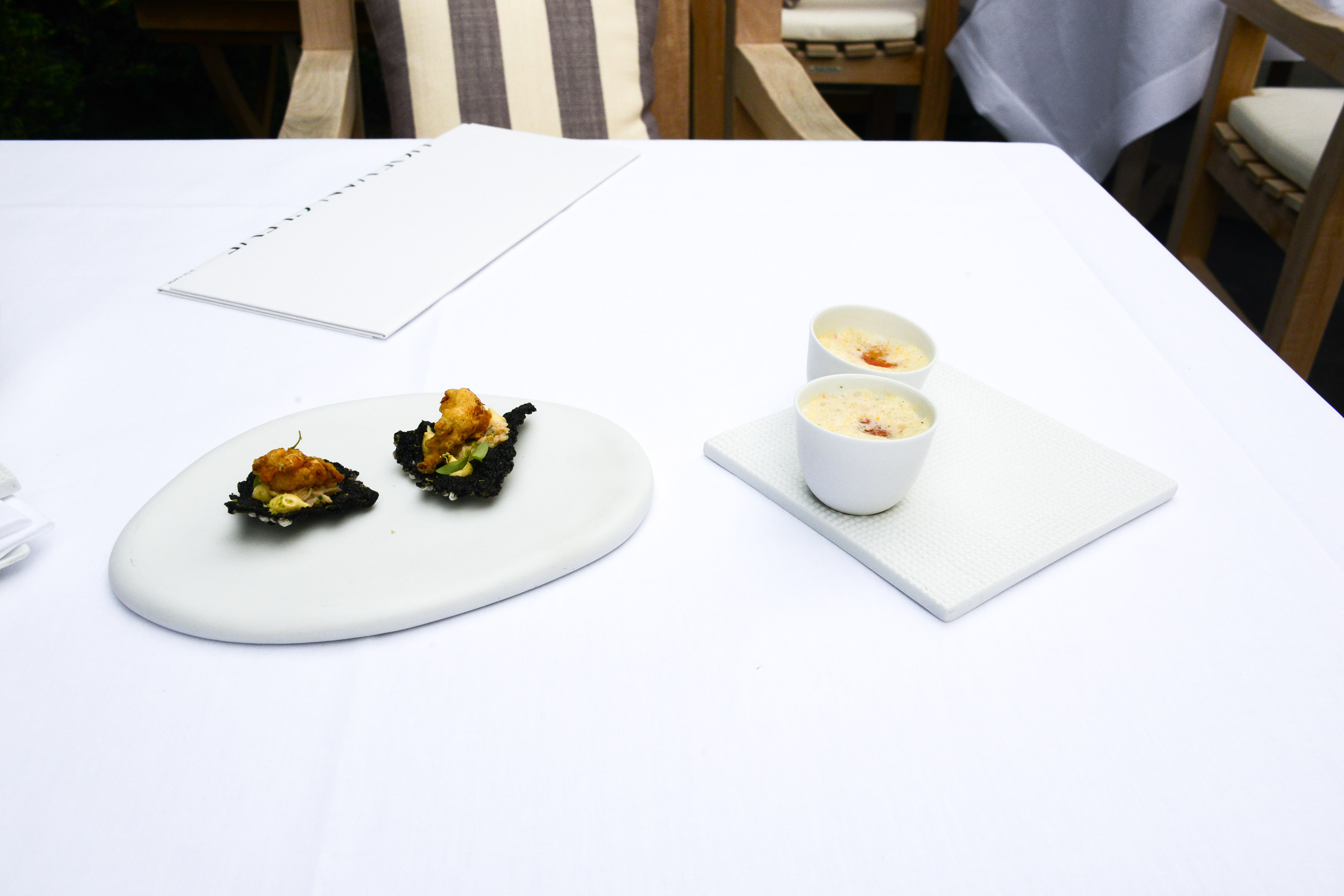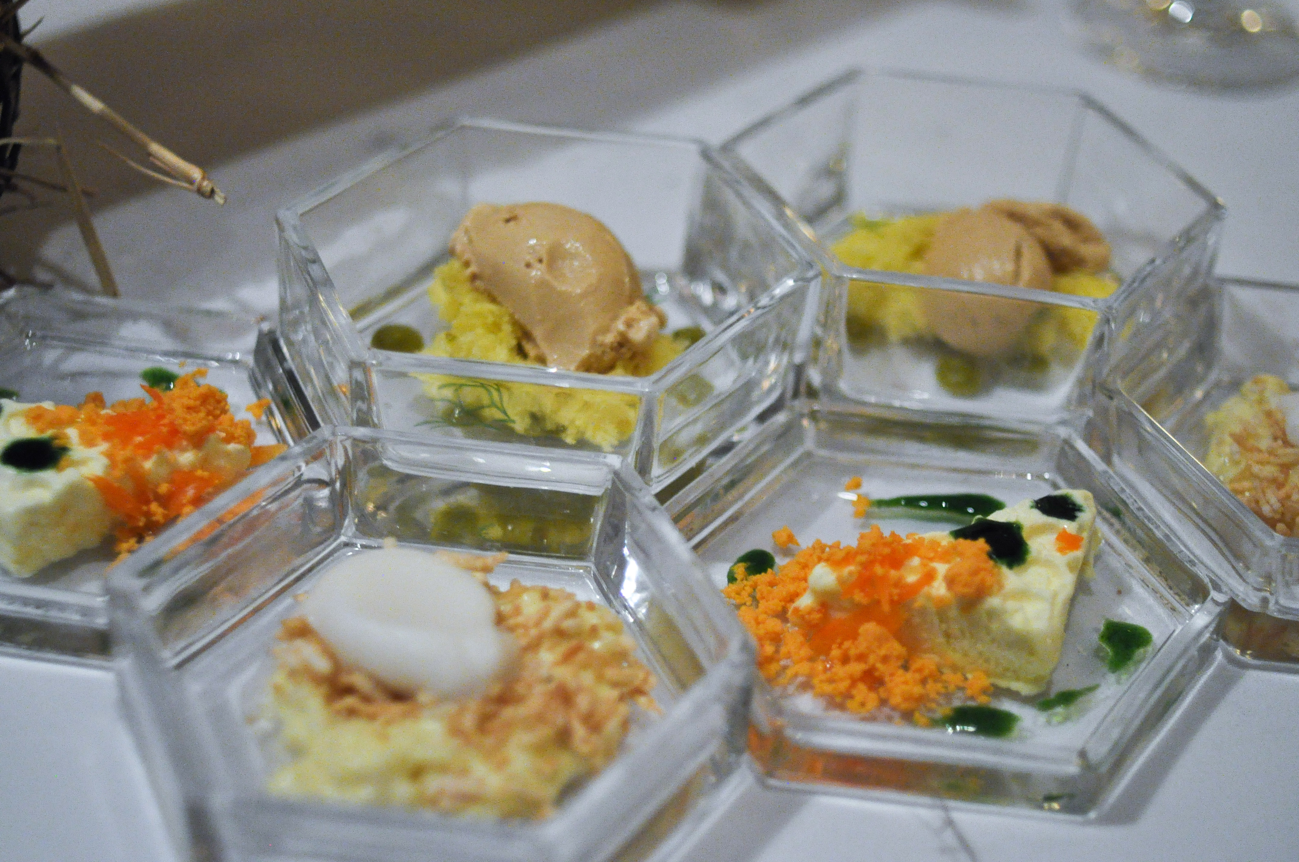 Petit fours “red pepper-black olive” Kinch’s signature opener of red pepper pate de fruits and black olive madeleines. Good vegetal balance in the PDF and lightly sweet, nicely dense madeleine.