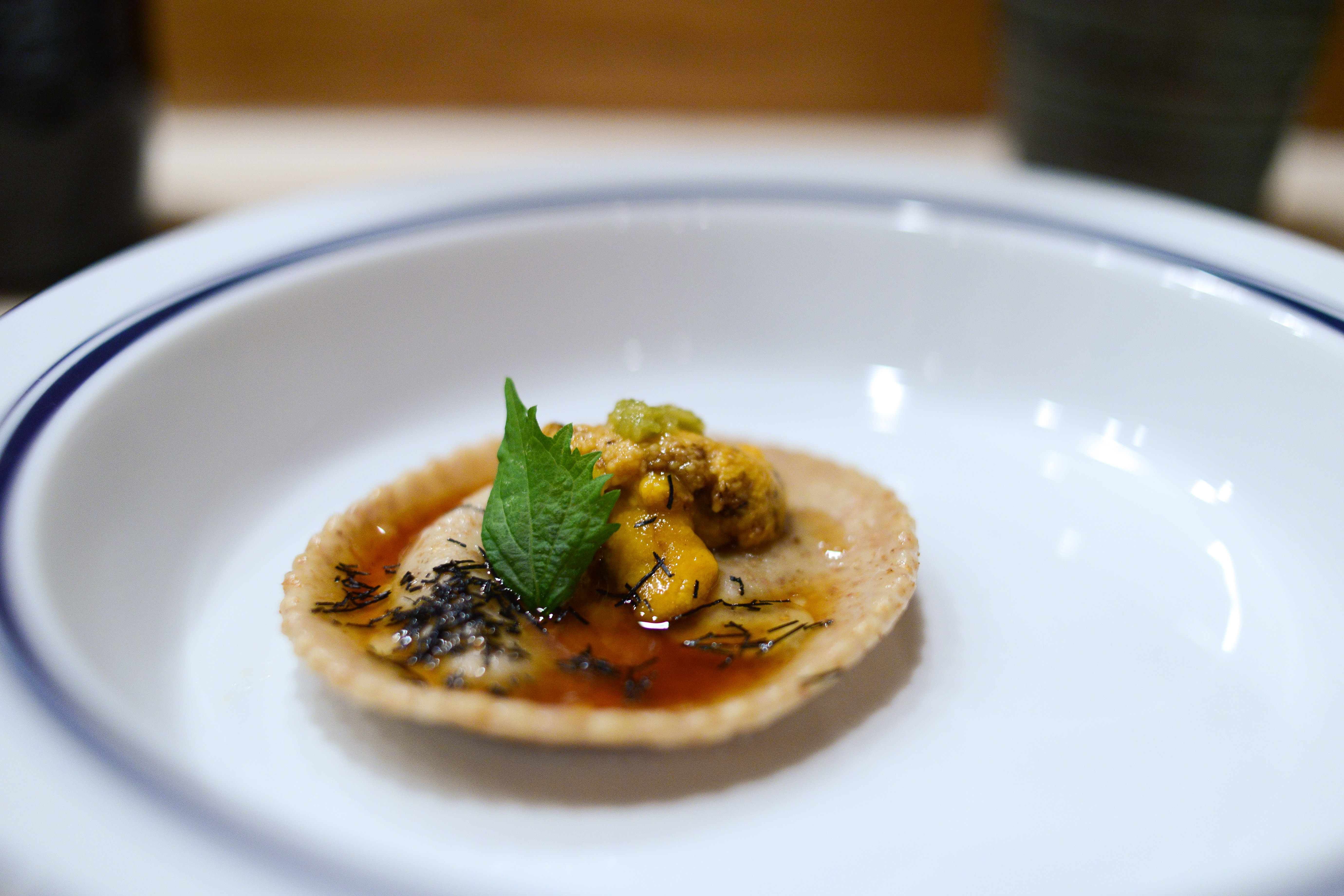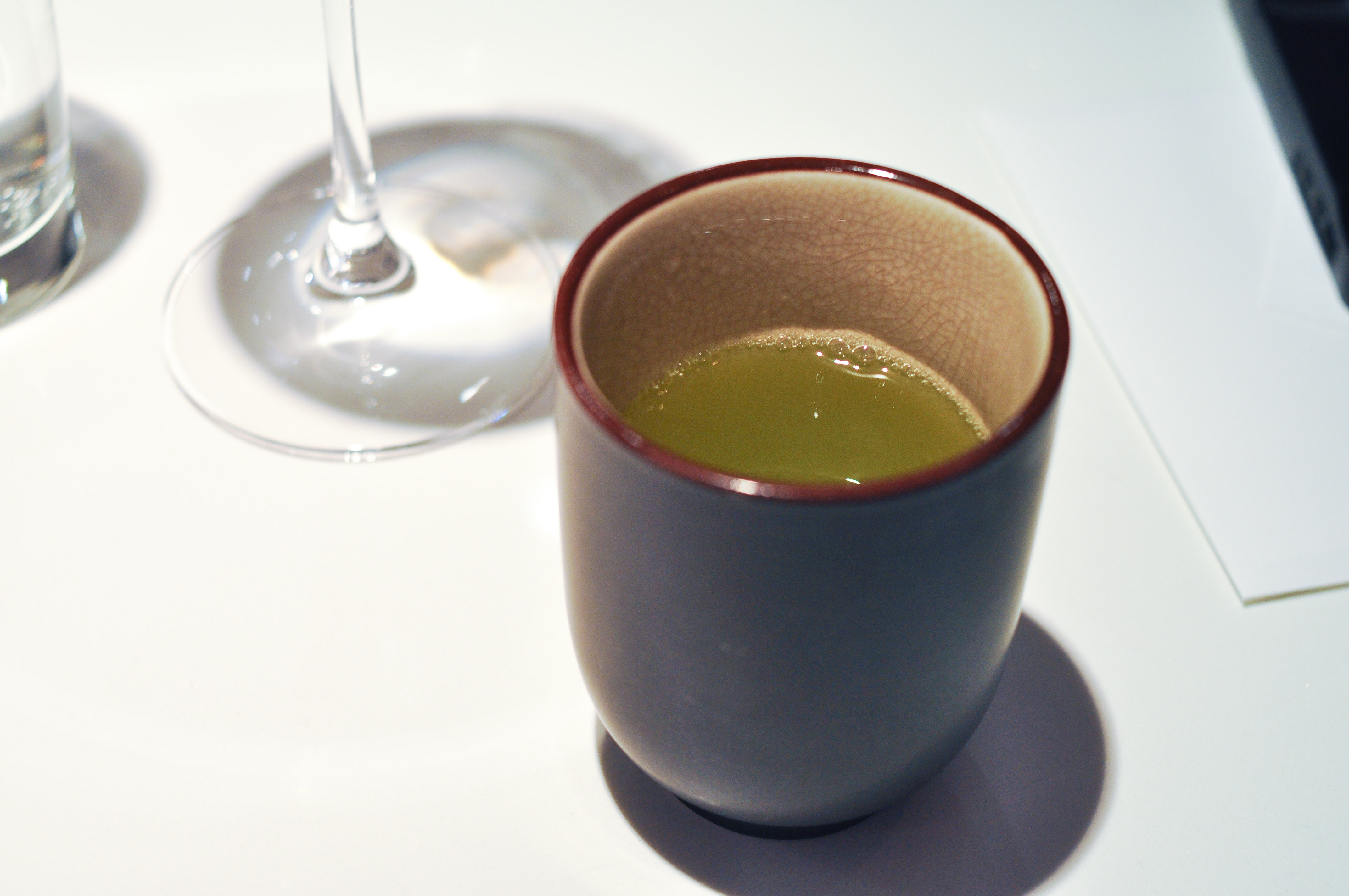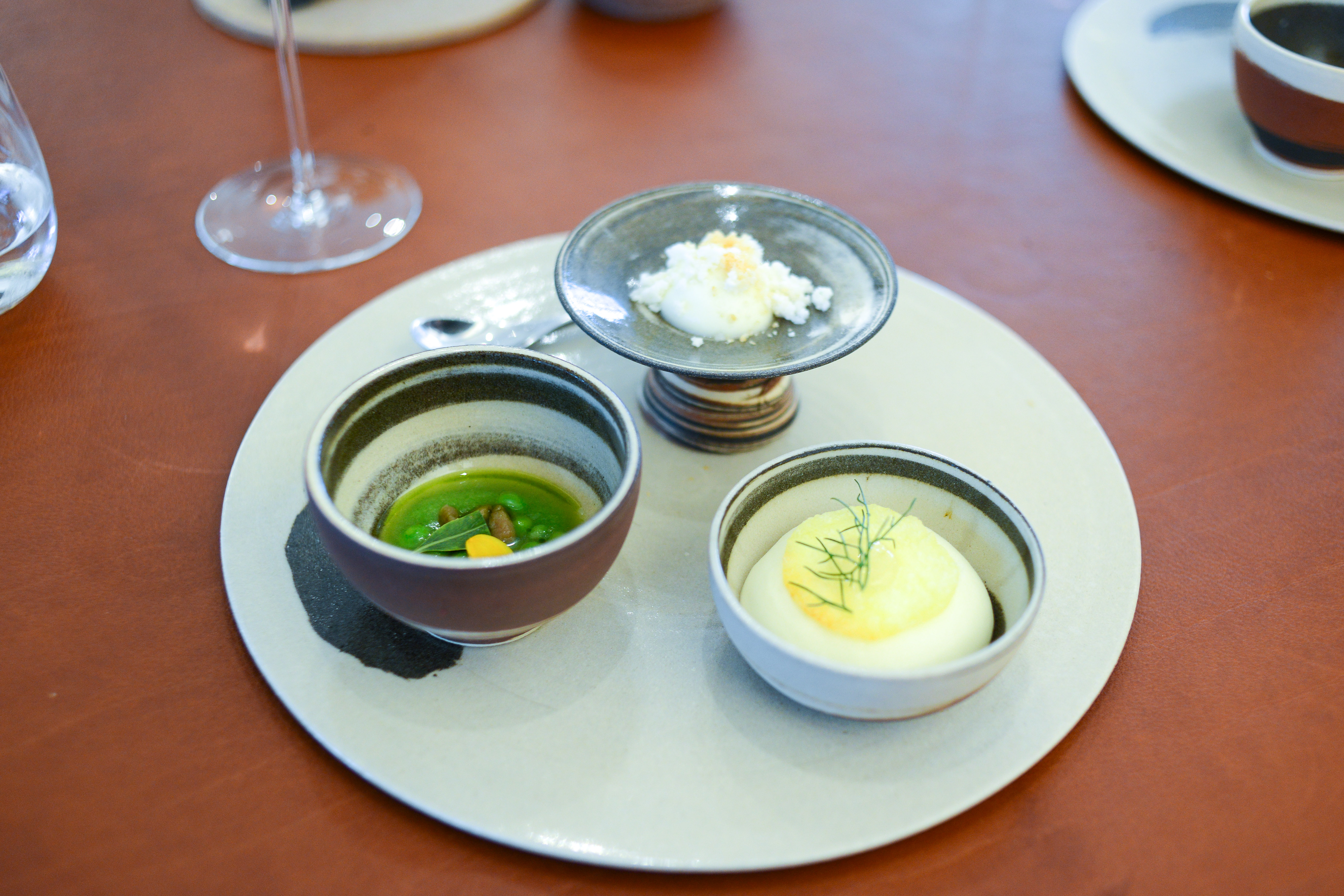 Summer clams and beans in a pine mushroom broth Various clams with seabream in a dashi broth accompanied by matsutake mushrooms, seaweed, beans, and peas. Badass savory layers.