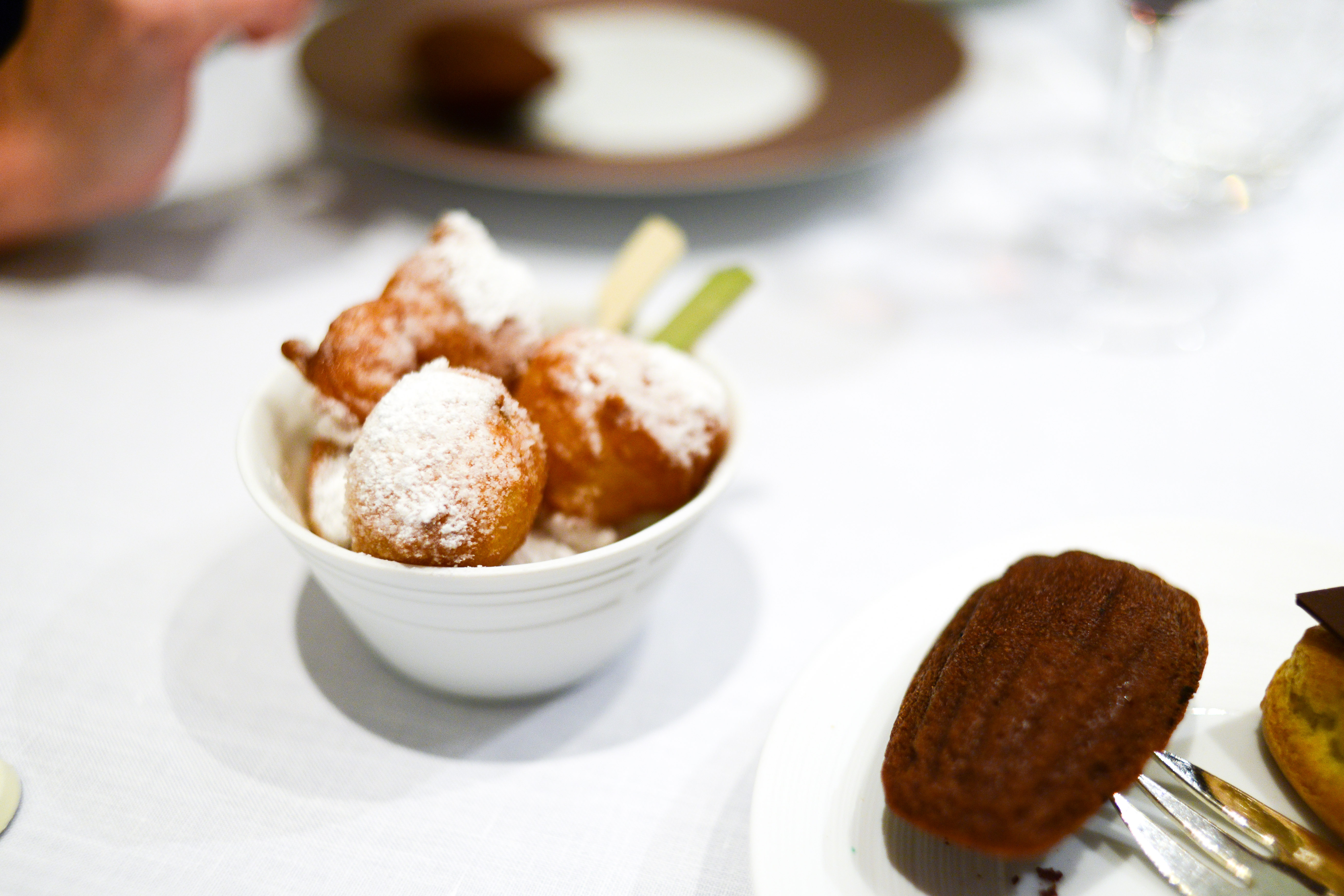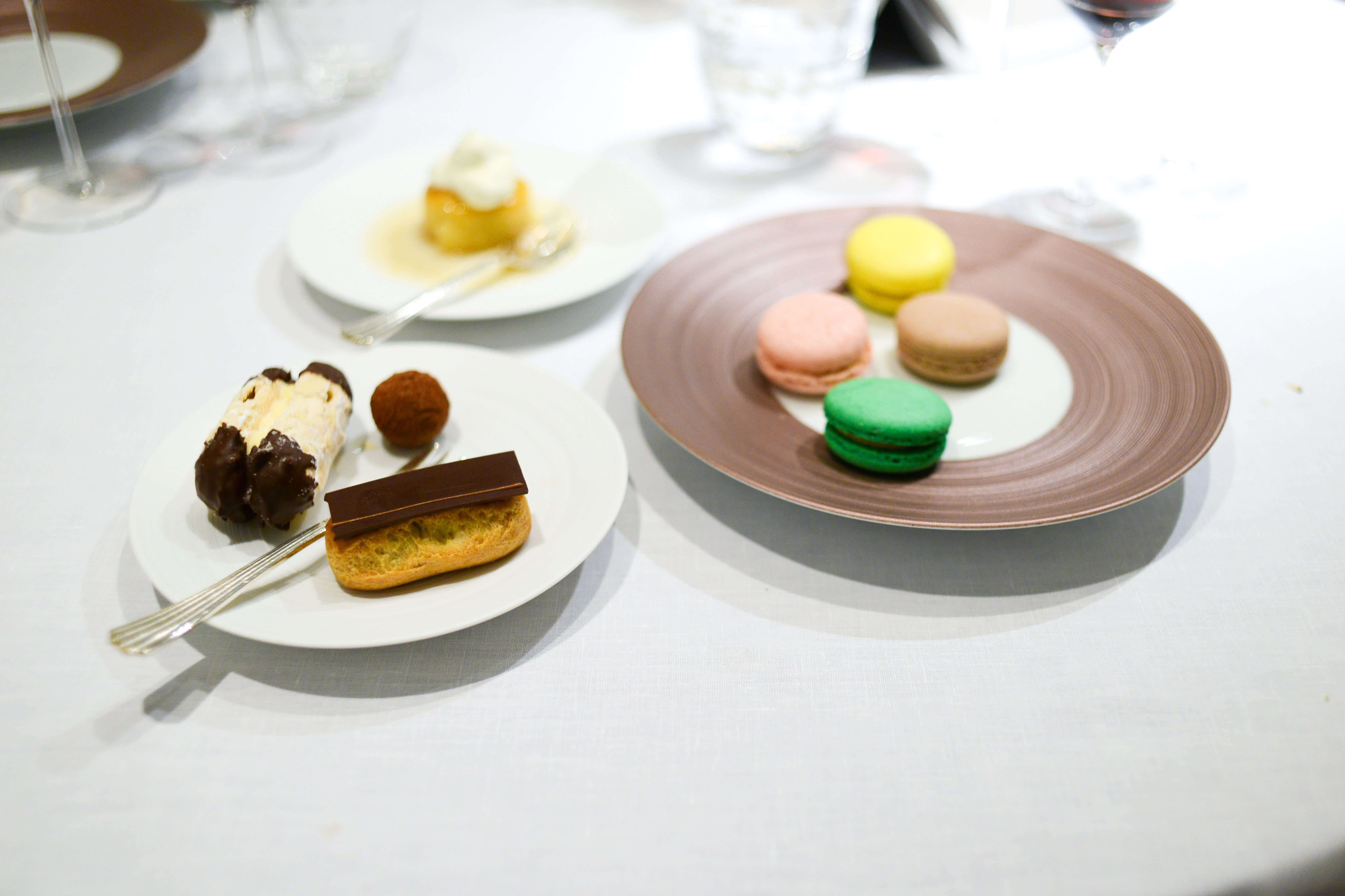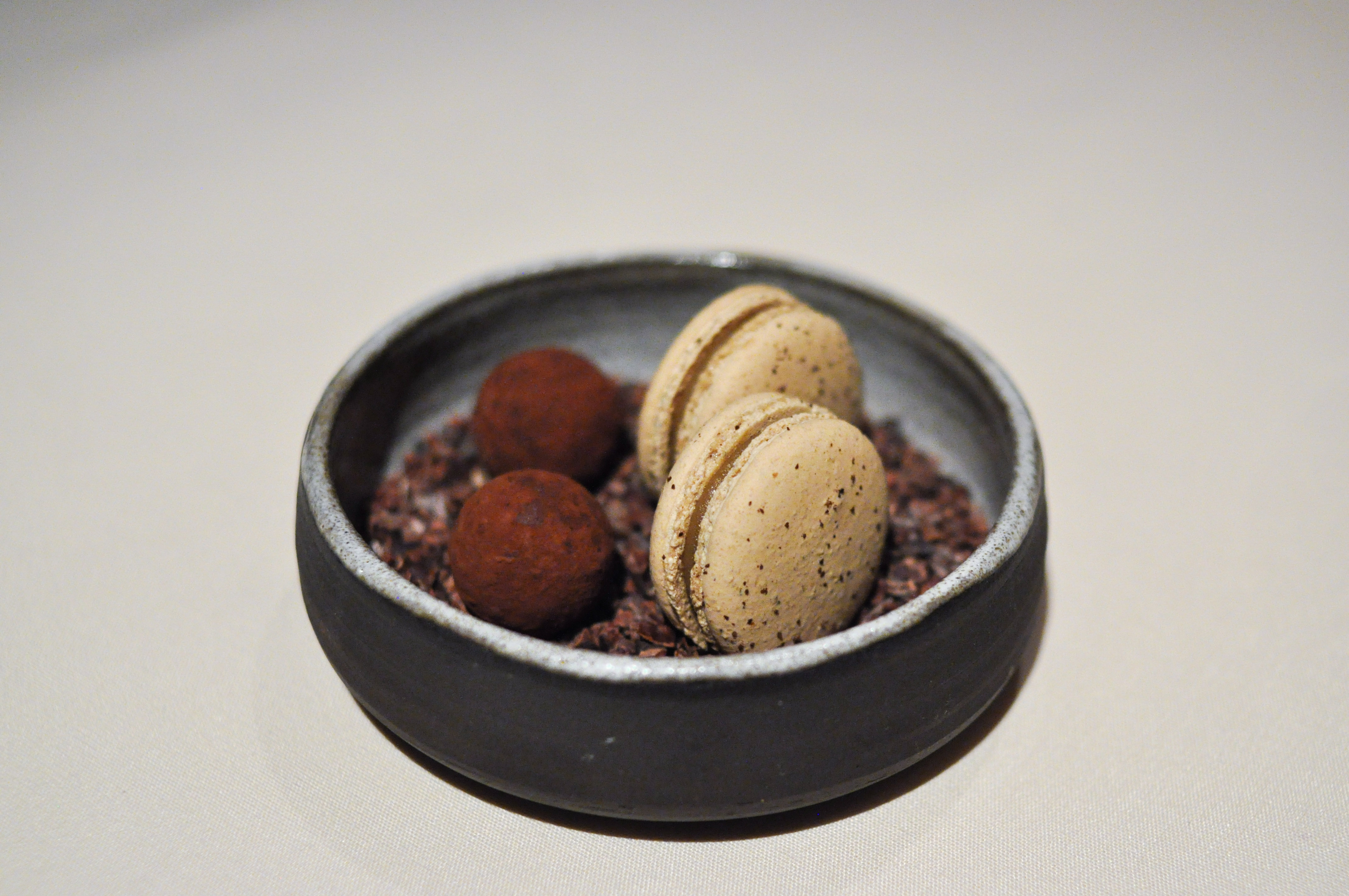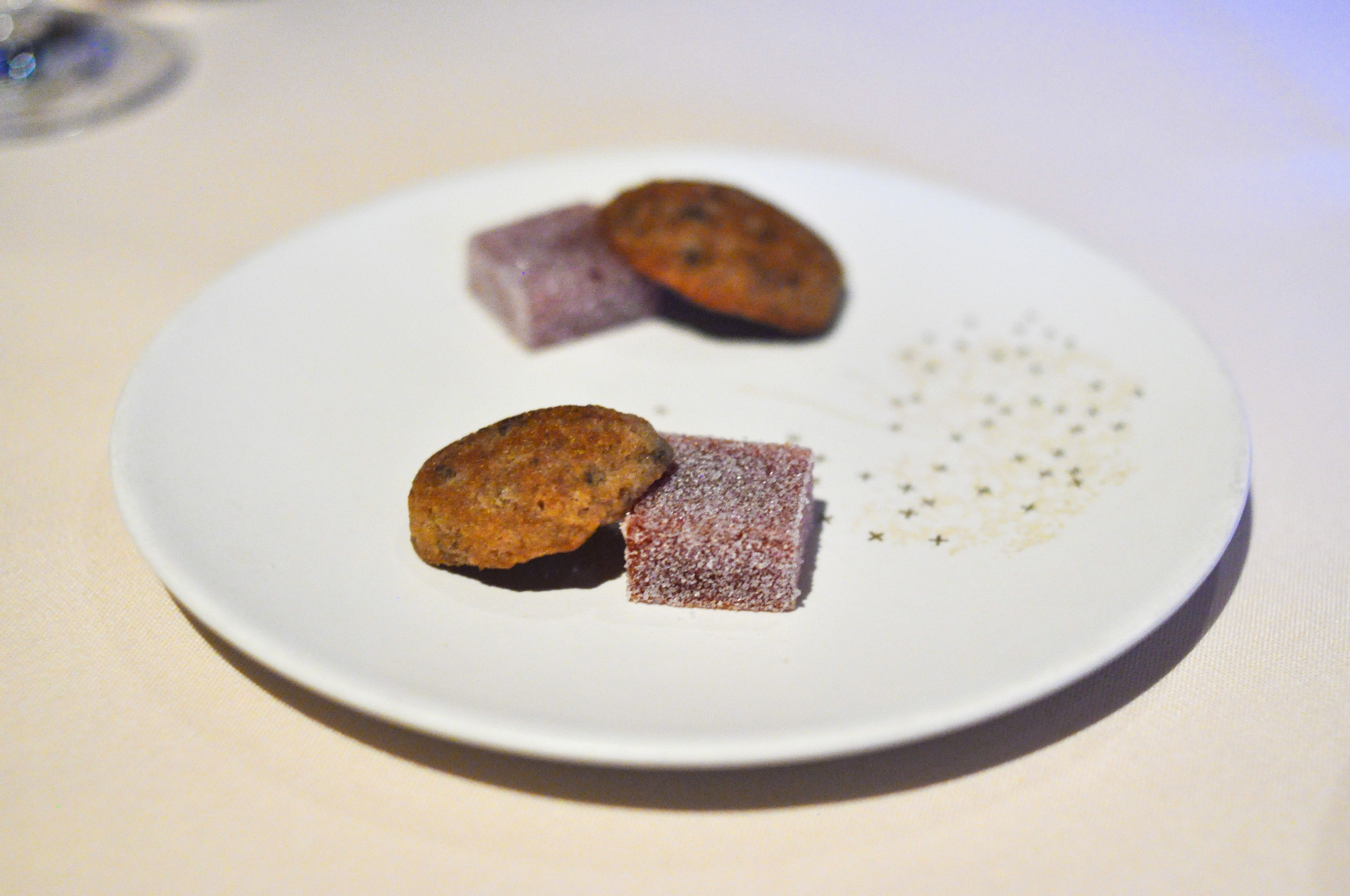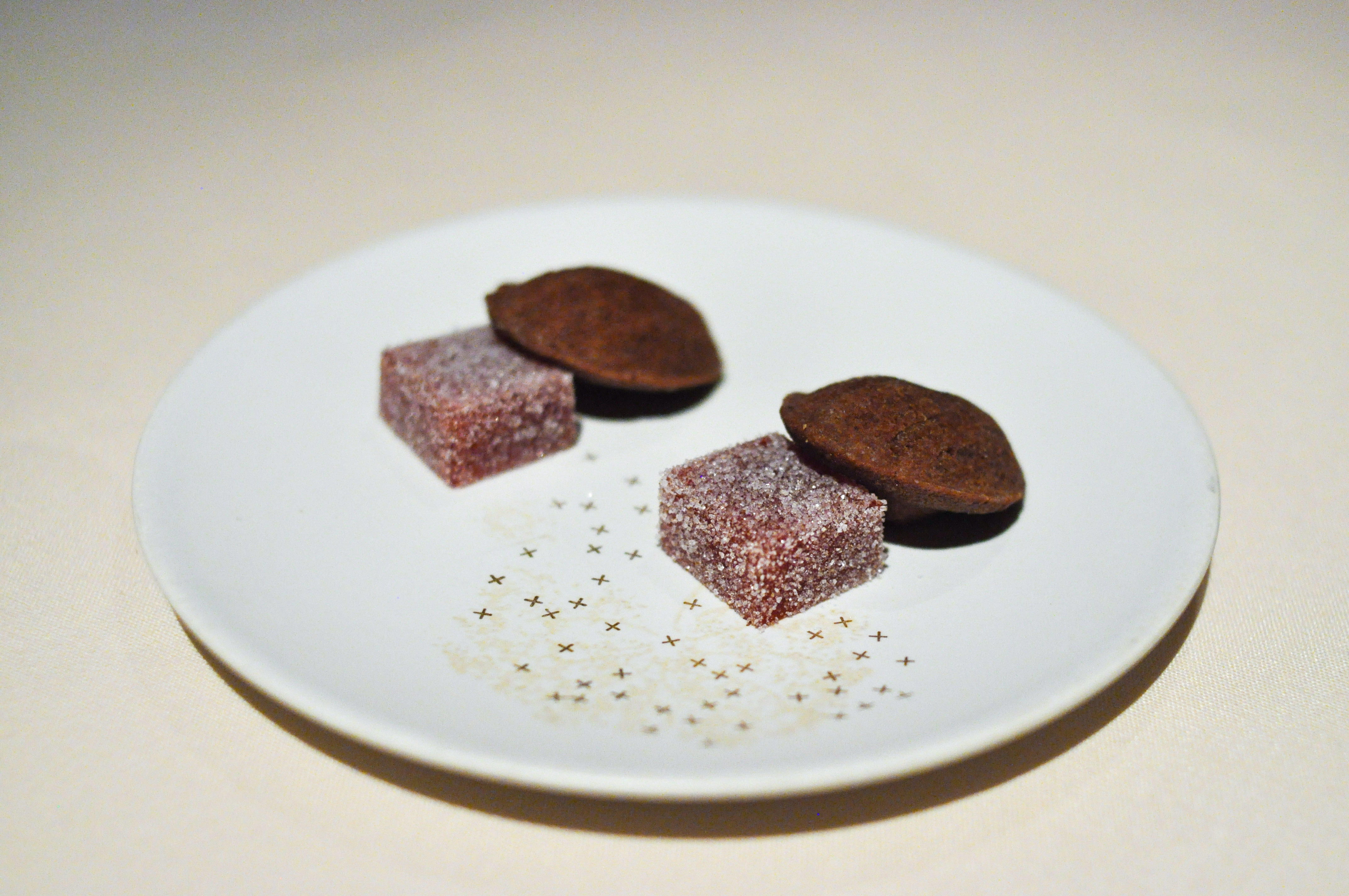 Petit fours “strawberry-chocolate” The signature closer of strawberry pate de fruits and chocolate madeleines.