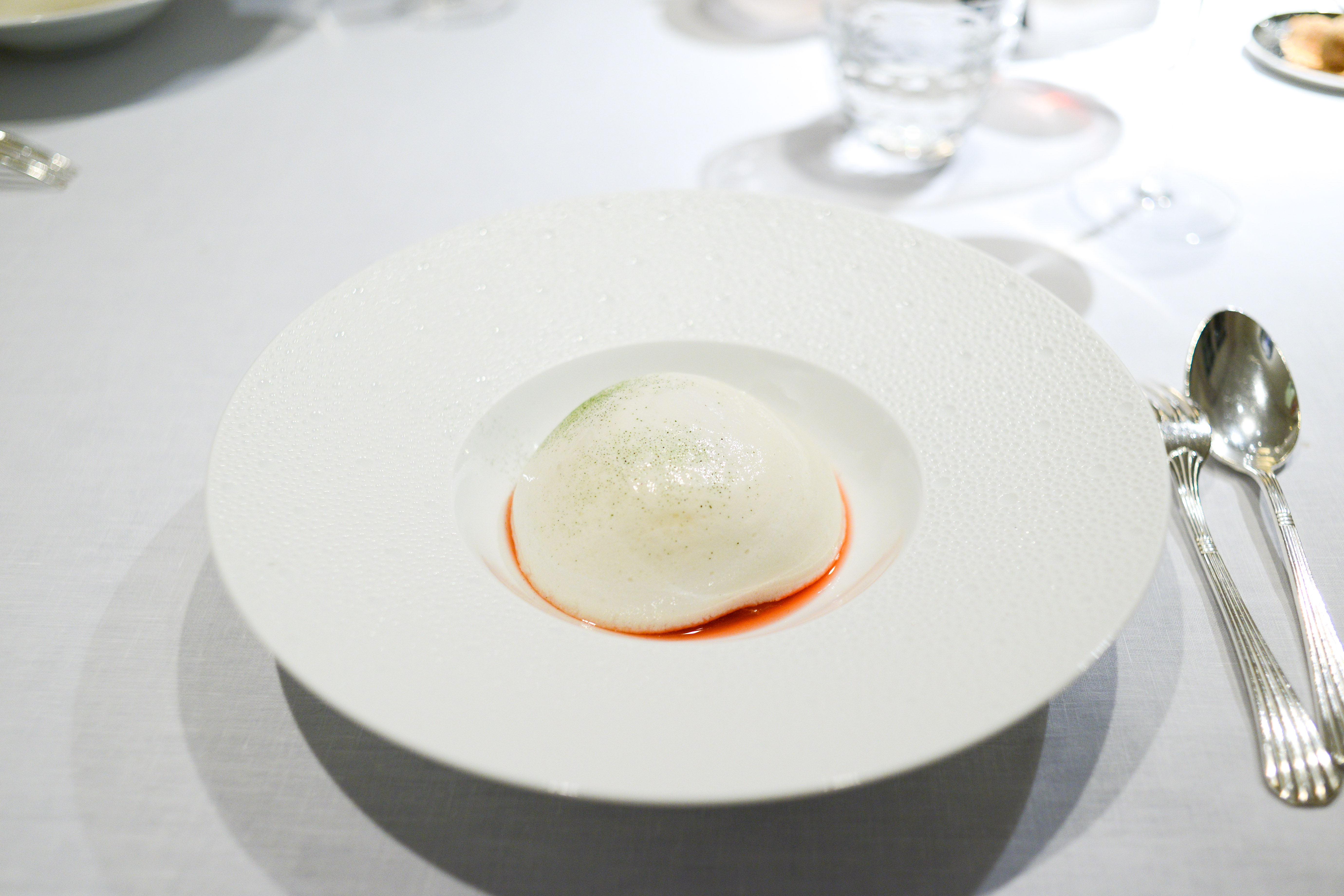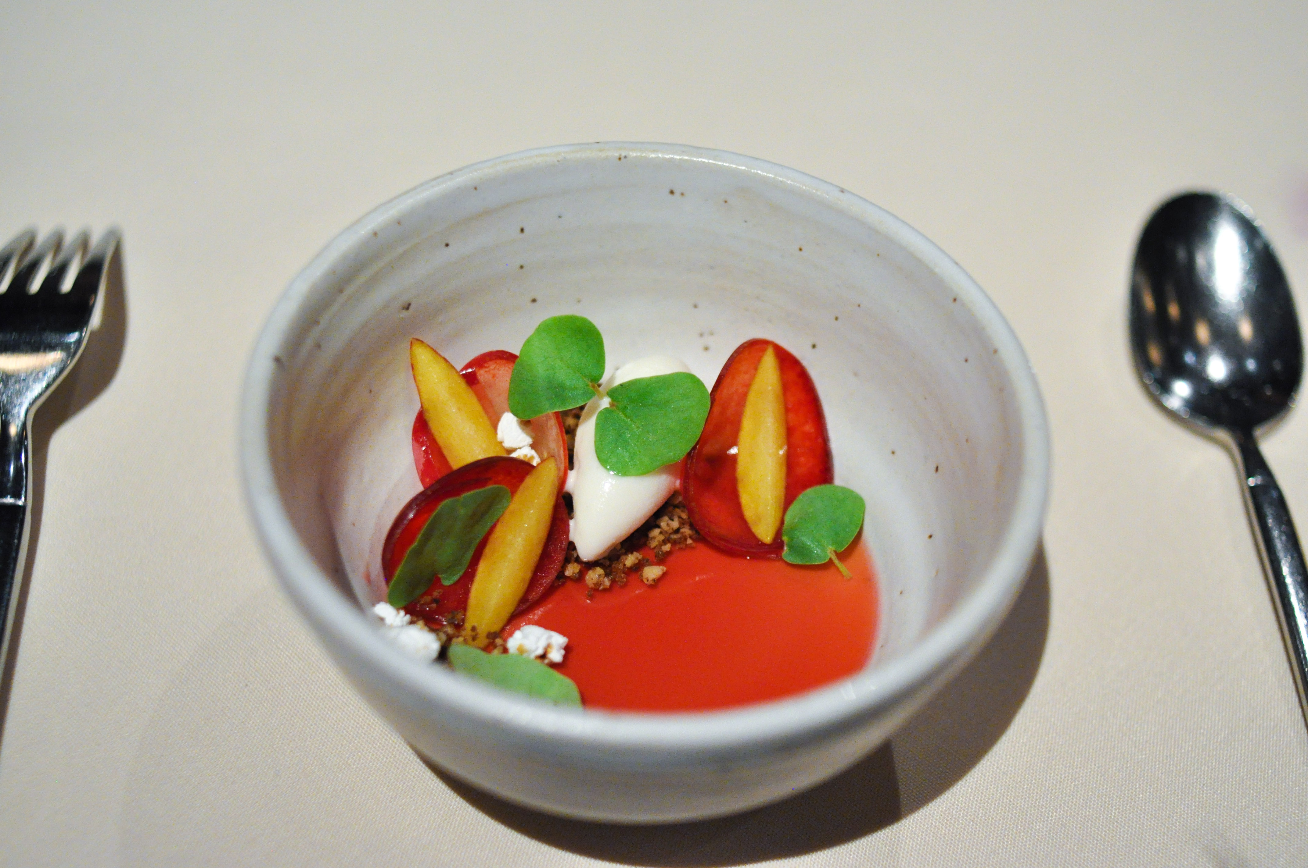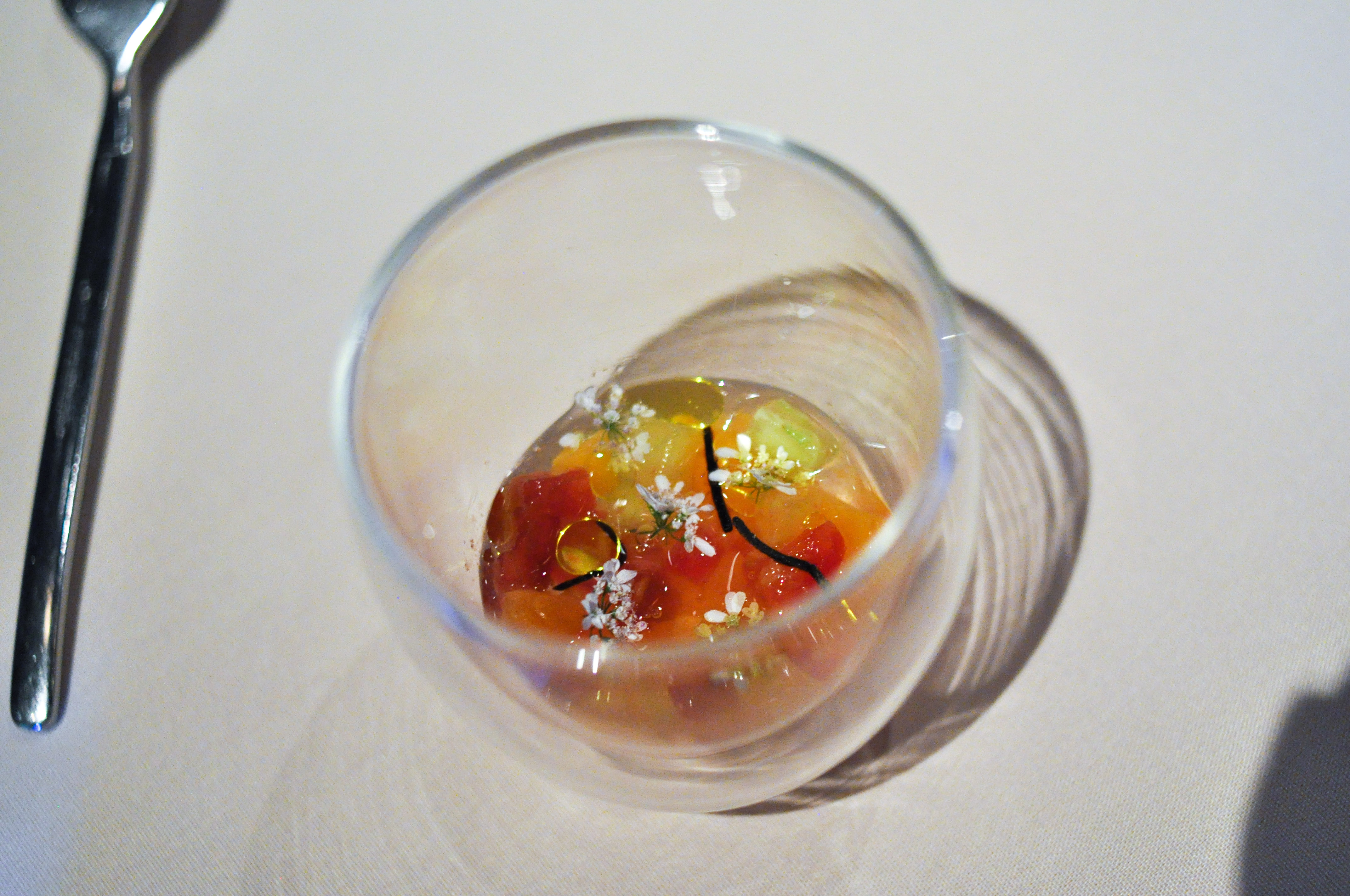 Almond tofu, berries and verbena, melon snow Not really sweet, but almost dessert-like. Tart dried fruit and expressive almond flavors.