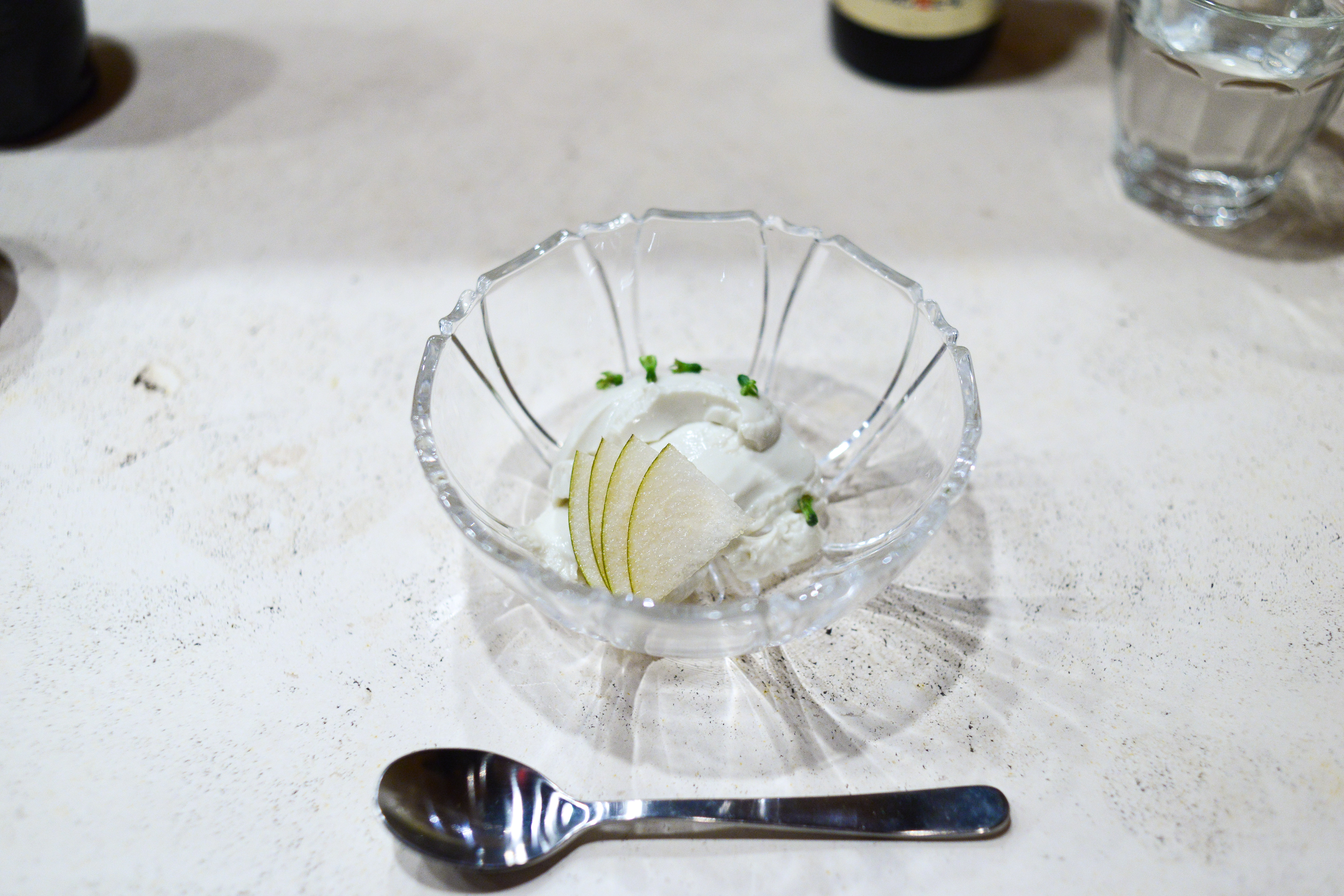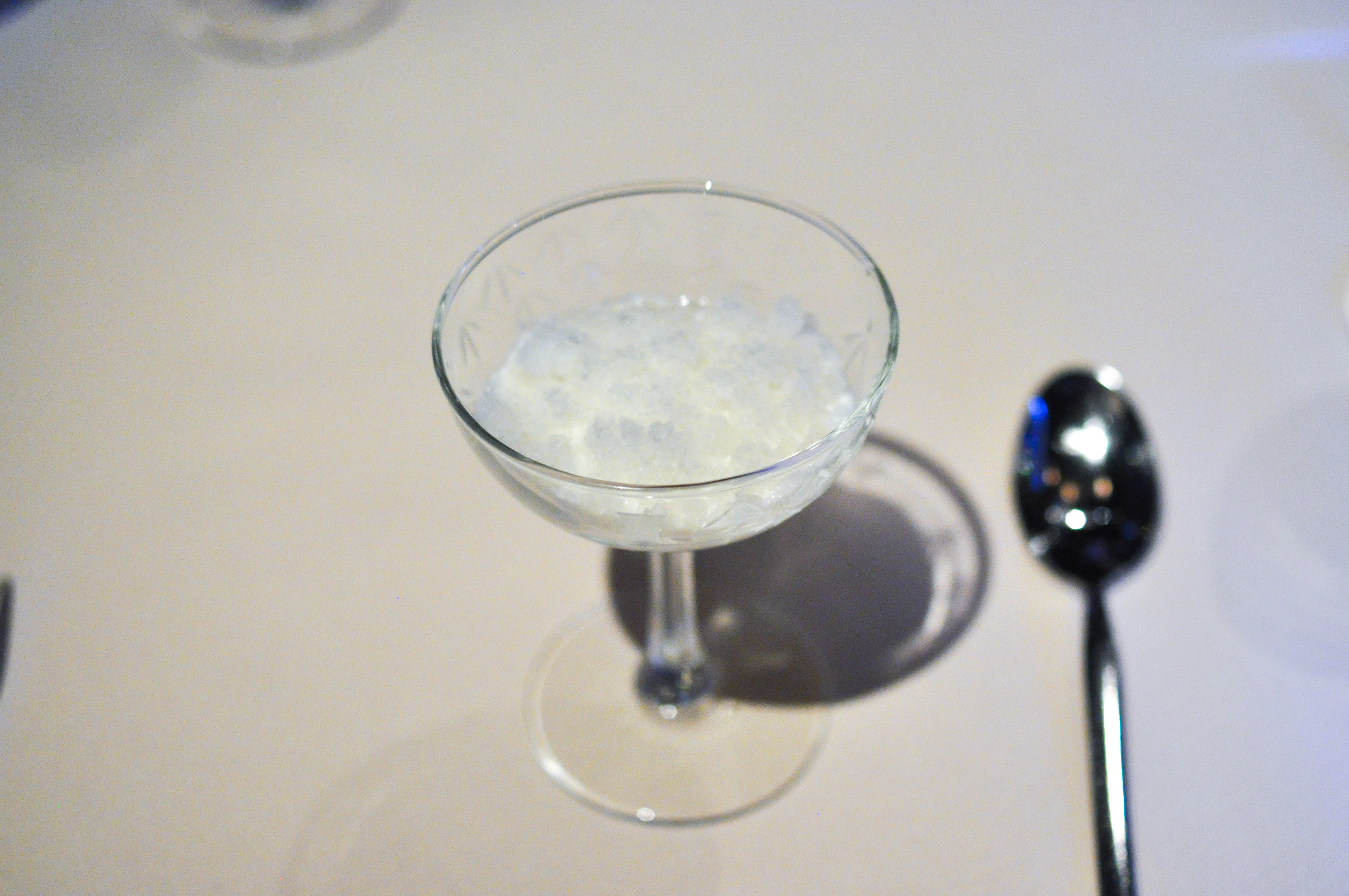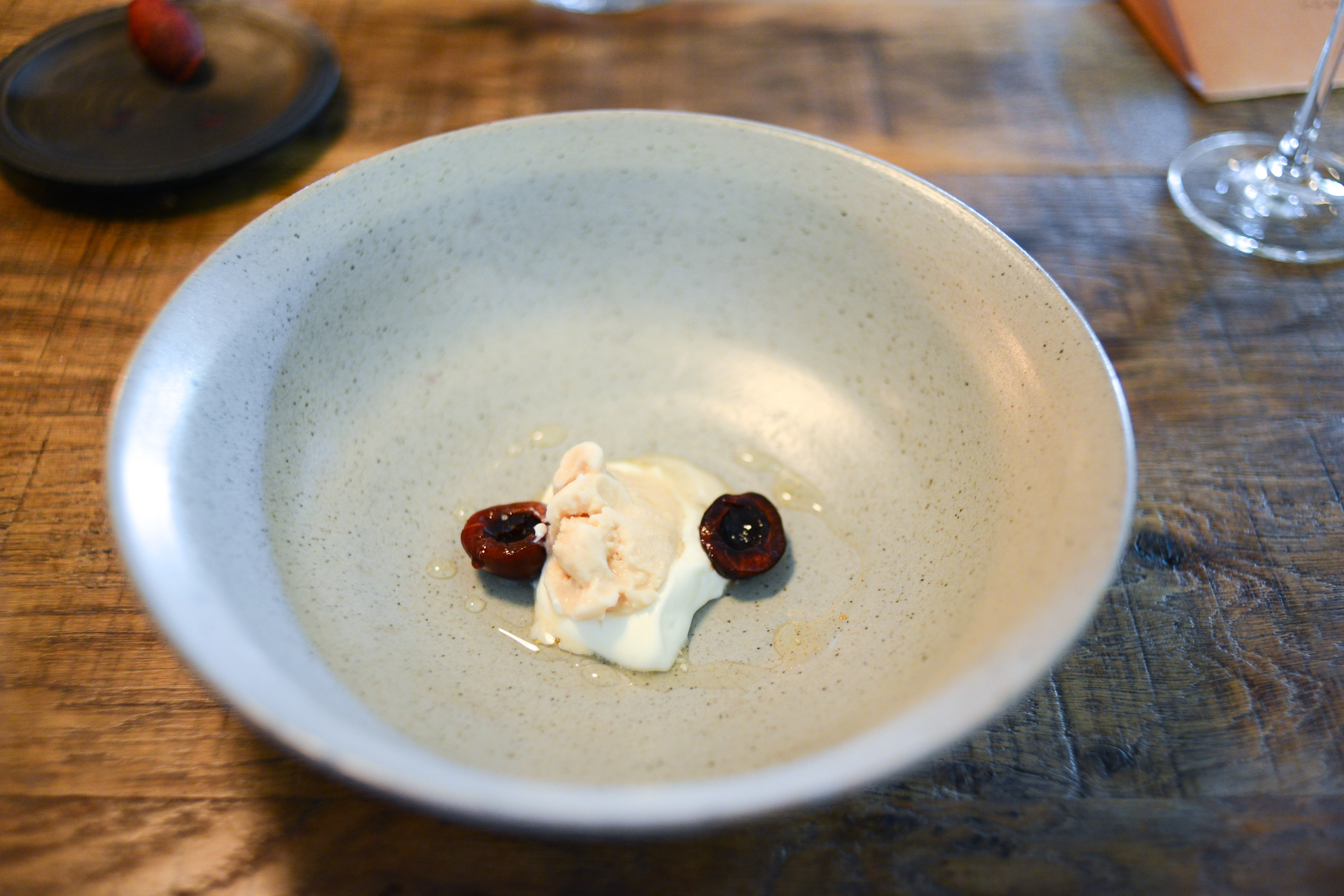 Almond tofu, berries and verbena, melon snow Not really sweet, but almost dessert-like. Tart dried fruit and expressive almond flavors.