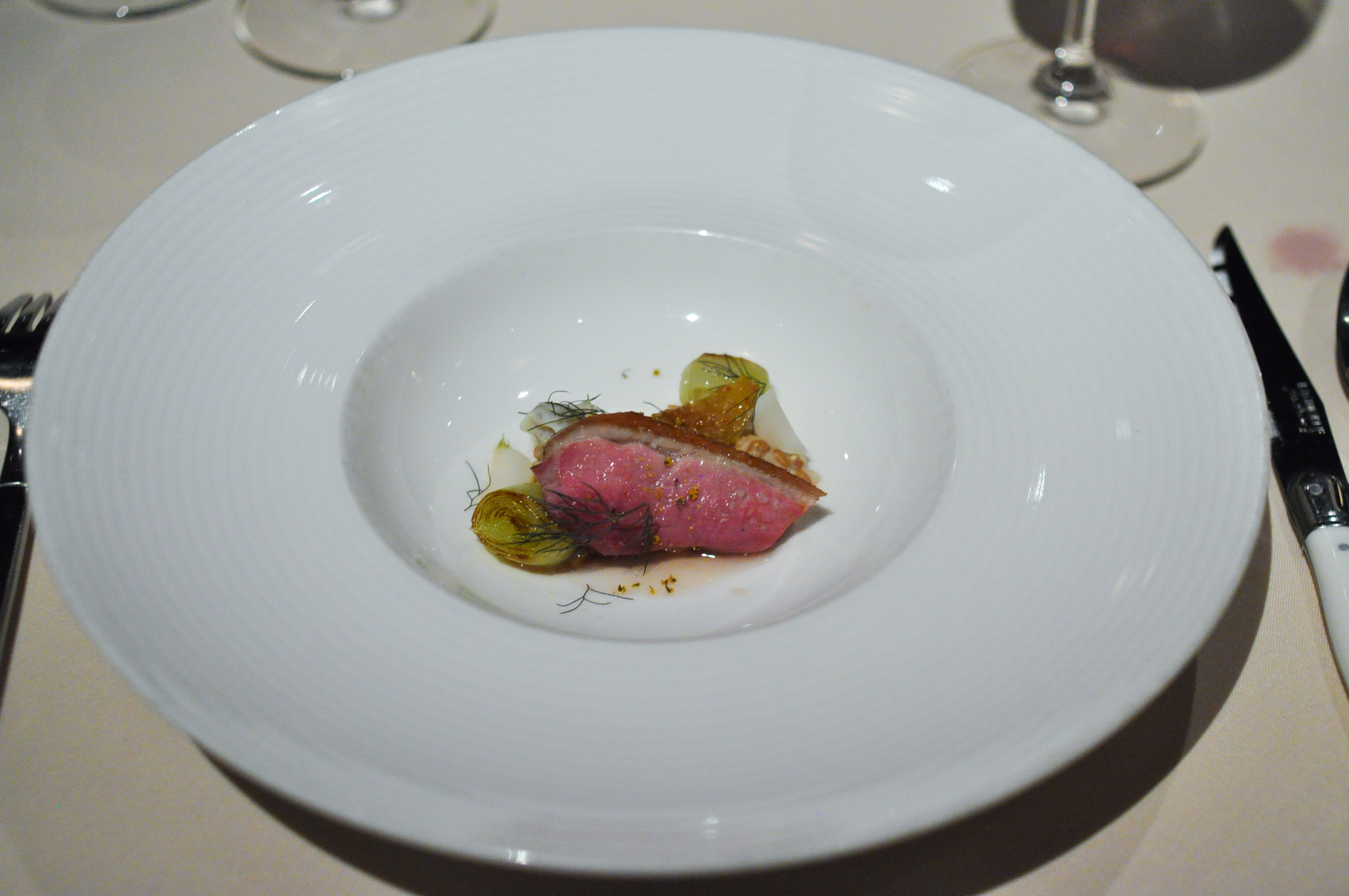 Duck, confit of figs and wild fennel, milk and honey An outstandingly great roasted aged duck breast with leek, fennel, and turnip and a touch of sweetness from figs and honey.