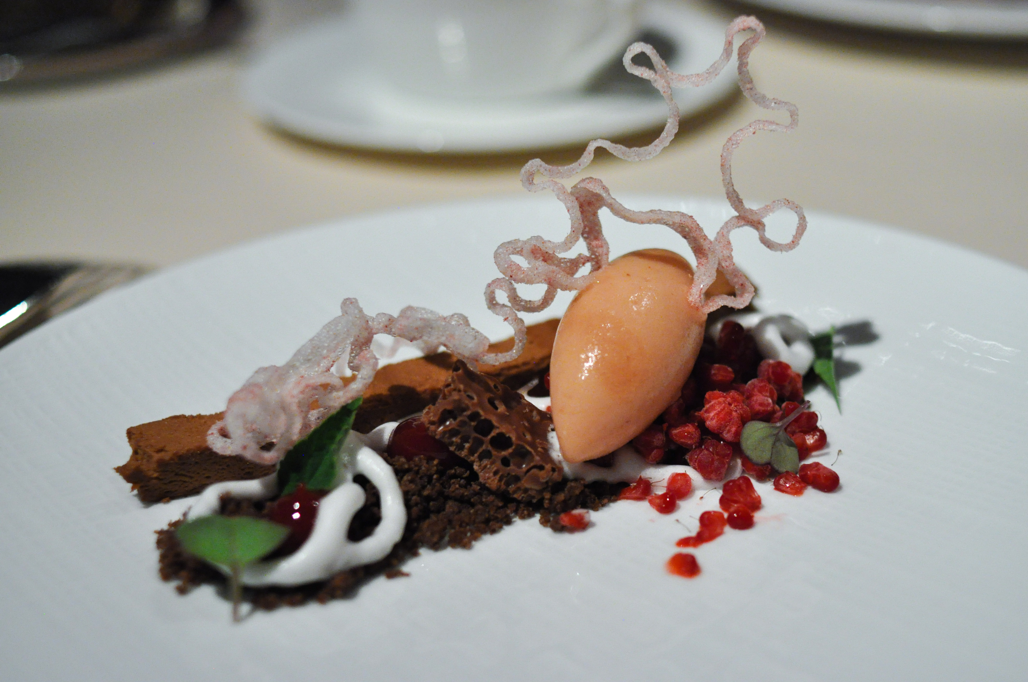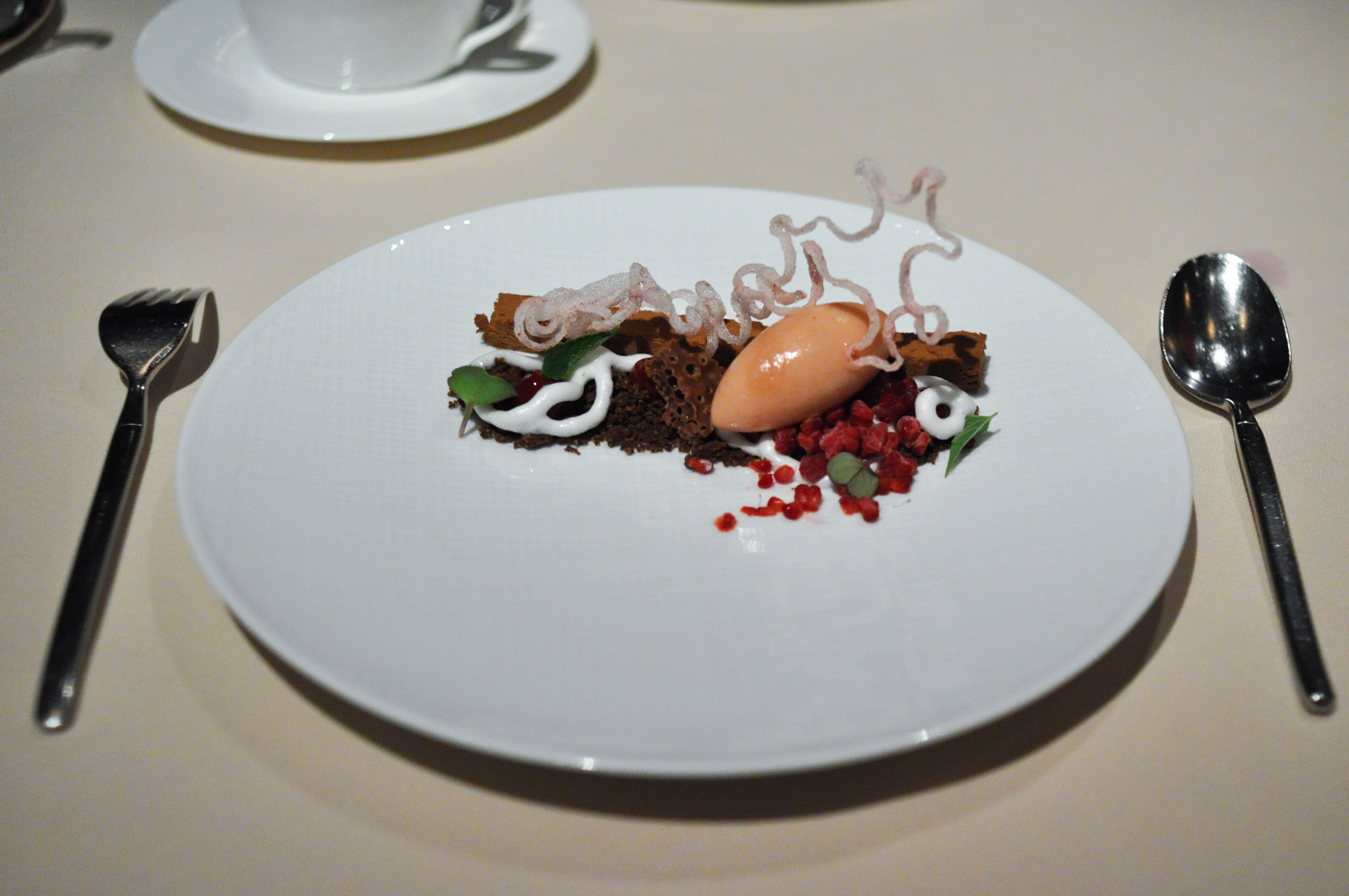 Raspberries, chocolate-coffee parfait, golden raspberry sorbet, almond