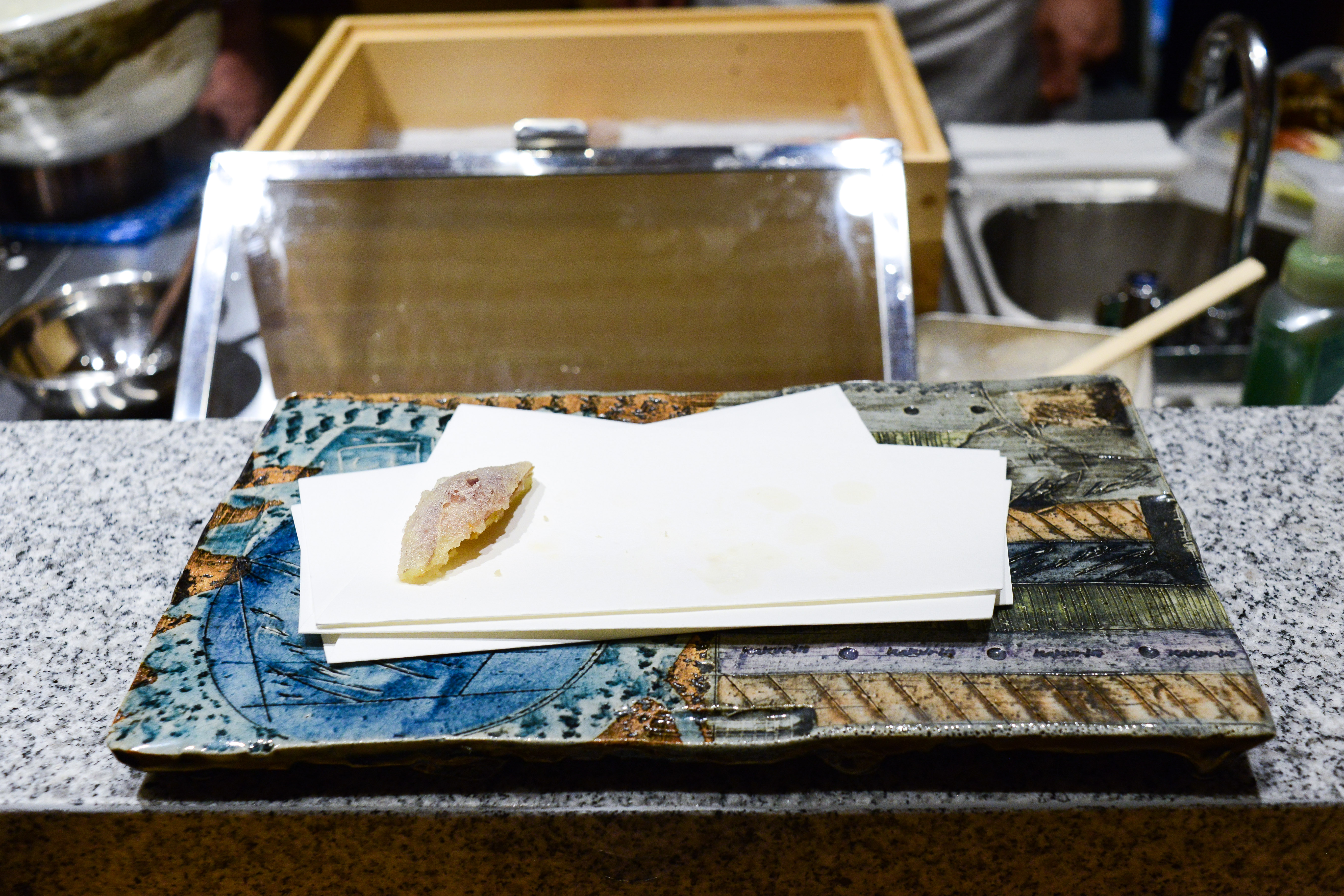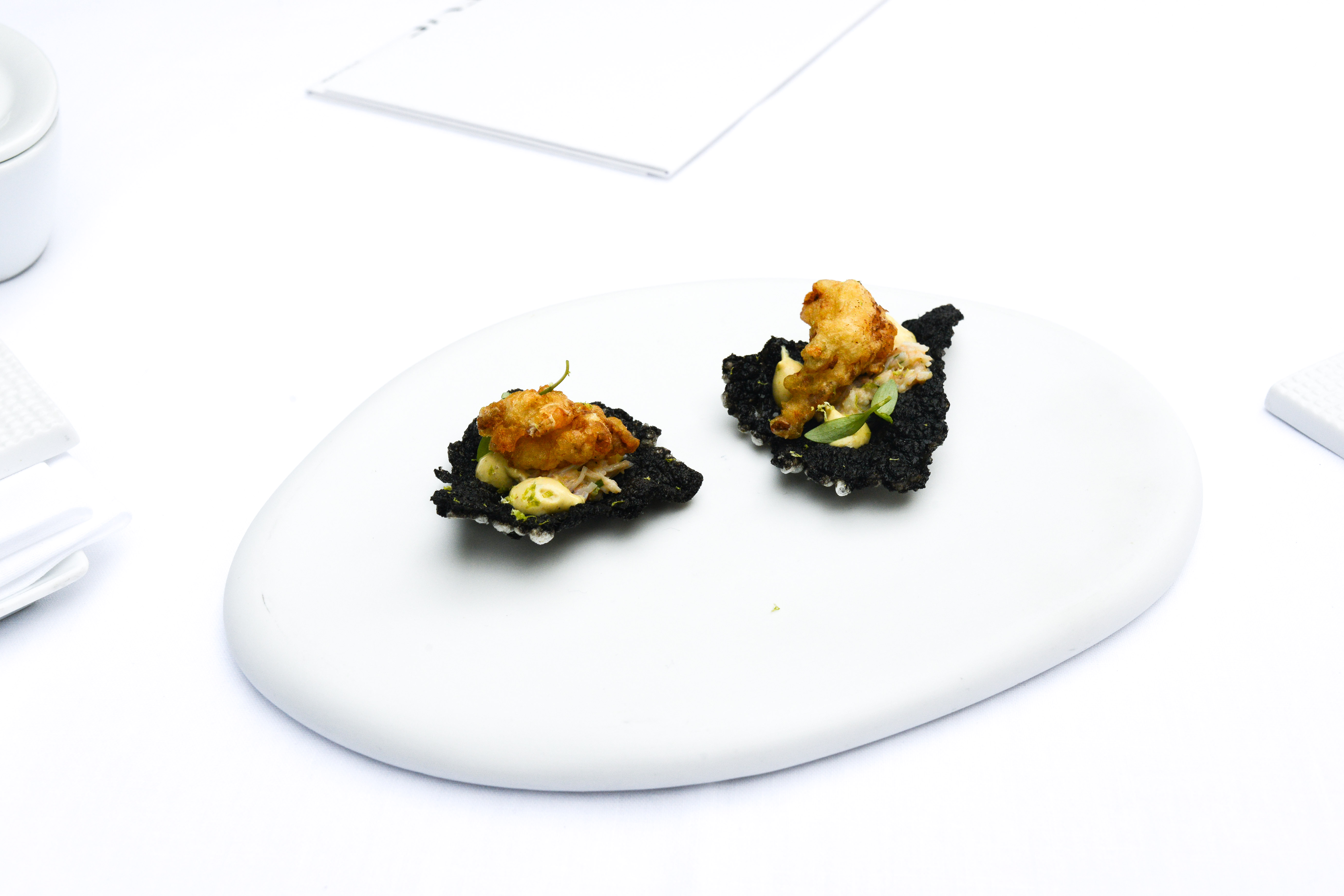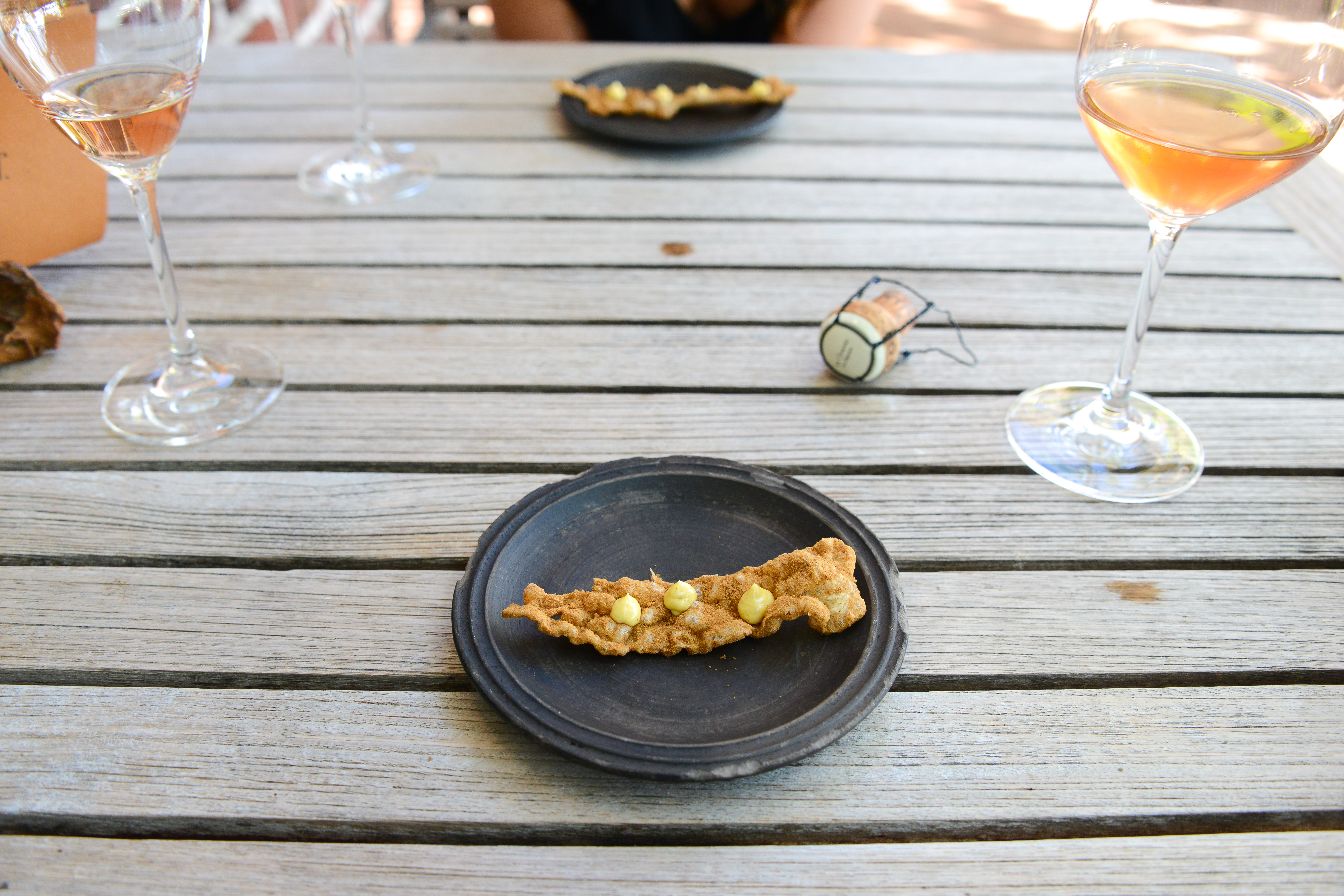 Albacore “puttanesca,” lightly smoked, crispy cassava The acid and brine in the puttanesca was great support to smoked meaty fish.