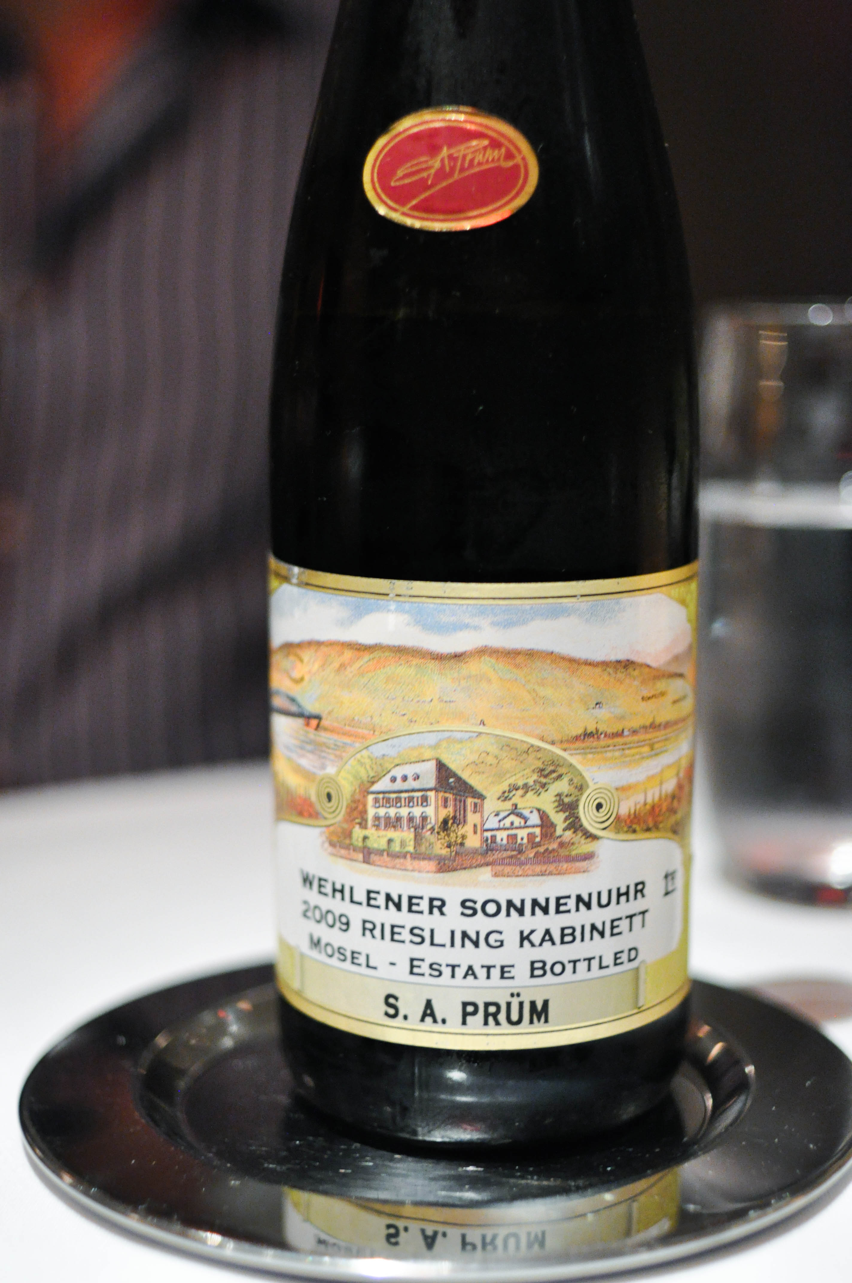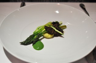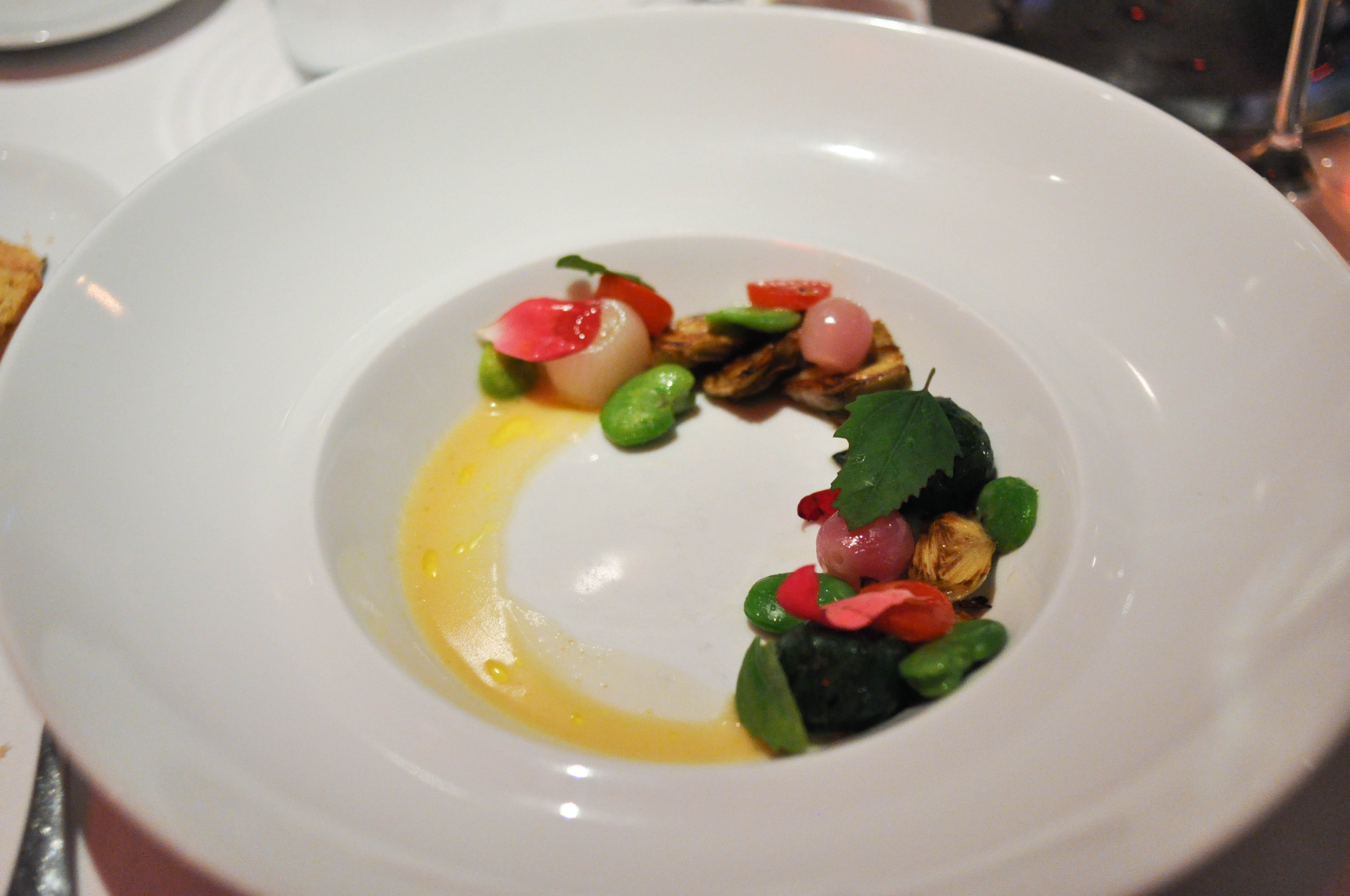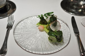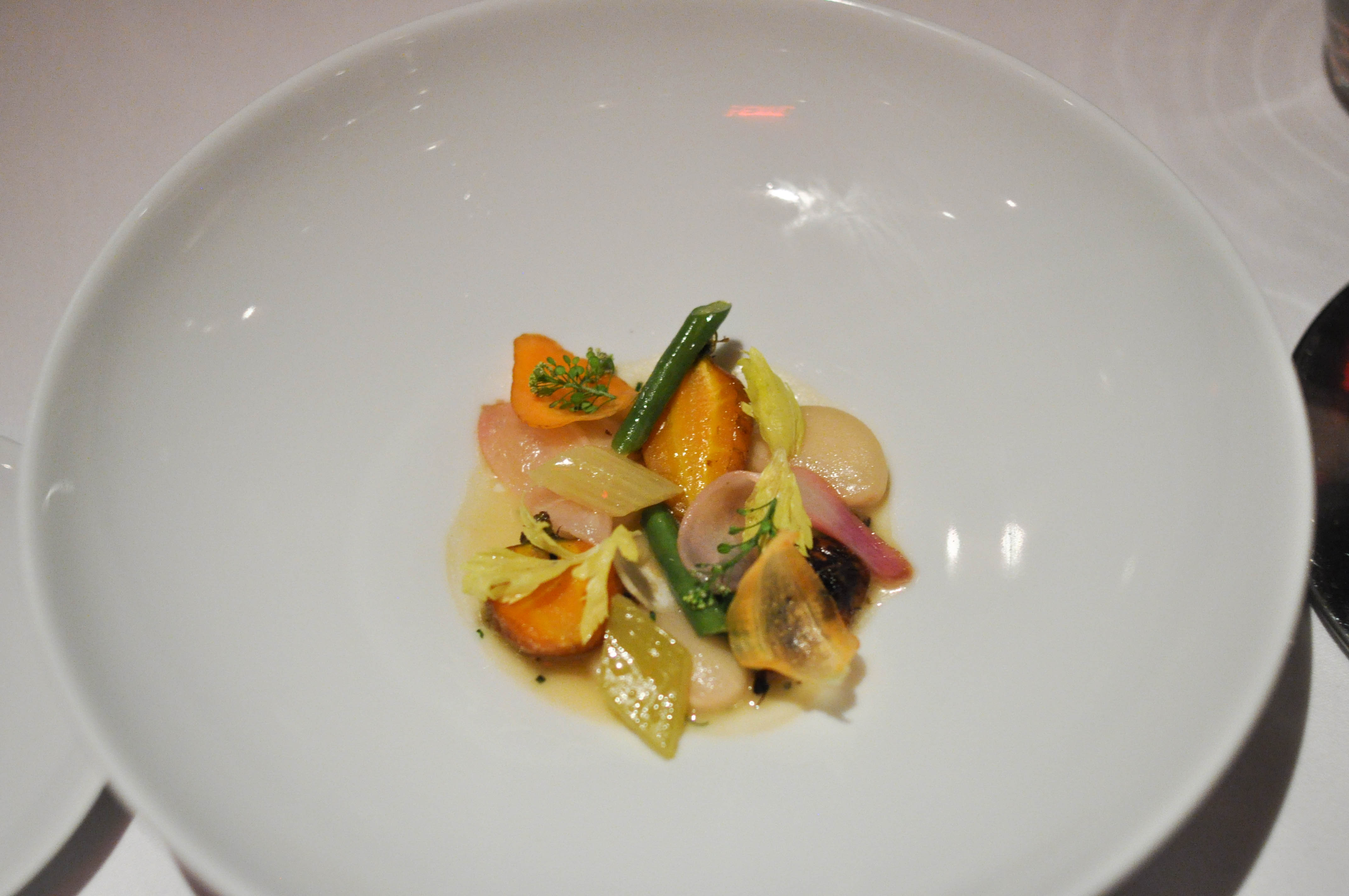 We sat and browsed the menu. The Bro shares my preference for vegetables over proteins, so we opted for the vegetable tasting. I indulged my usual habit of supplementing extra courses. To drink, we got a modest bottle of The Bro’s favorite grape: 2009 Riesling Kabinett from Wehlener Sonnenuhr in Mosel by S. A. Prum. A little bit of floral and citrus, with racy stone fruit and mineral body, and slight spice on the finish. A fresh, high-acid compliment to our dinner.