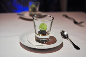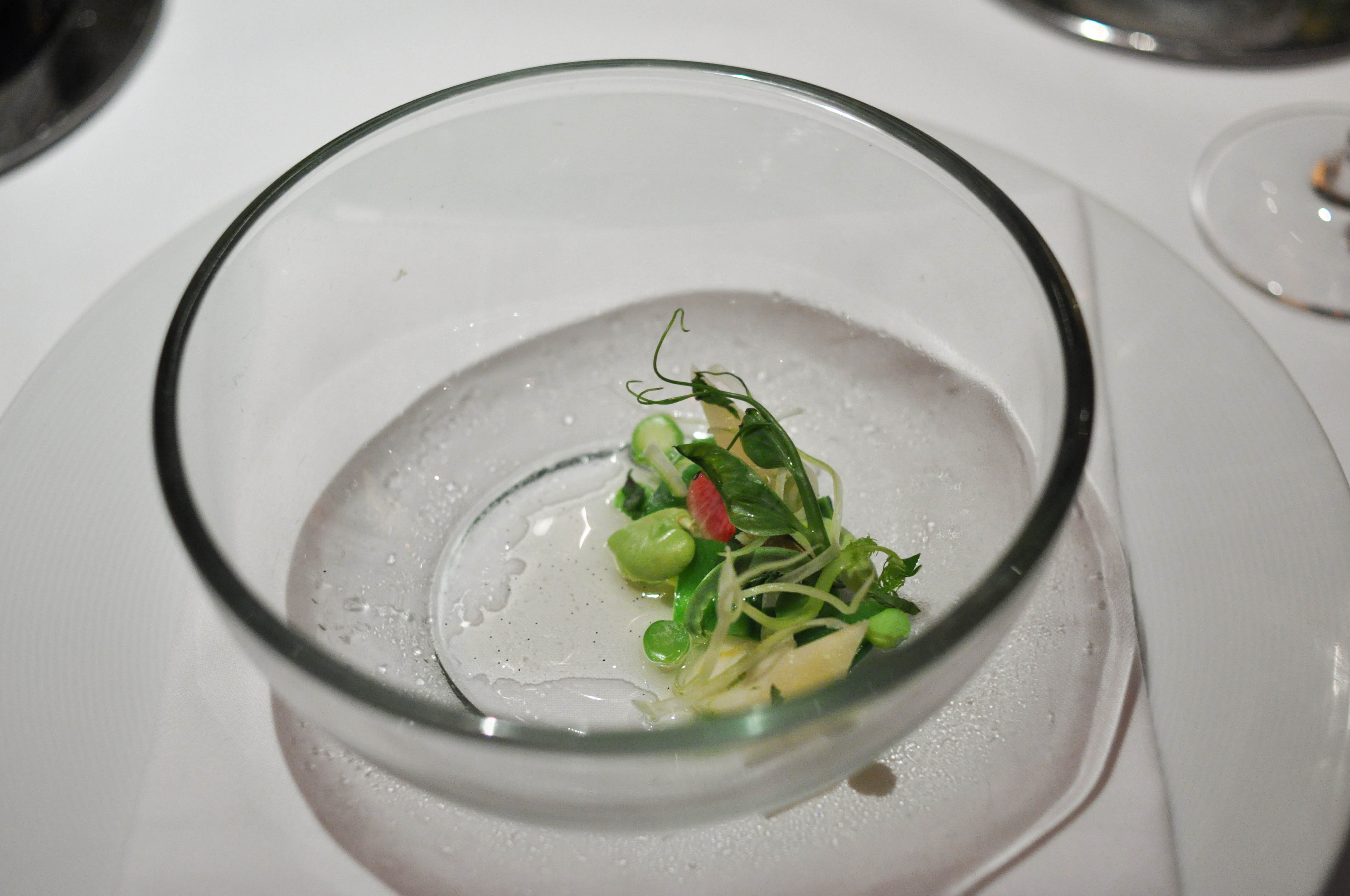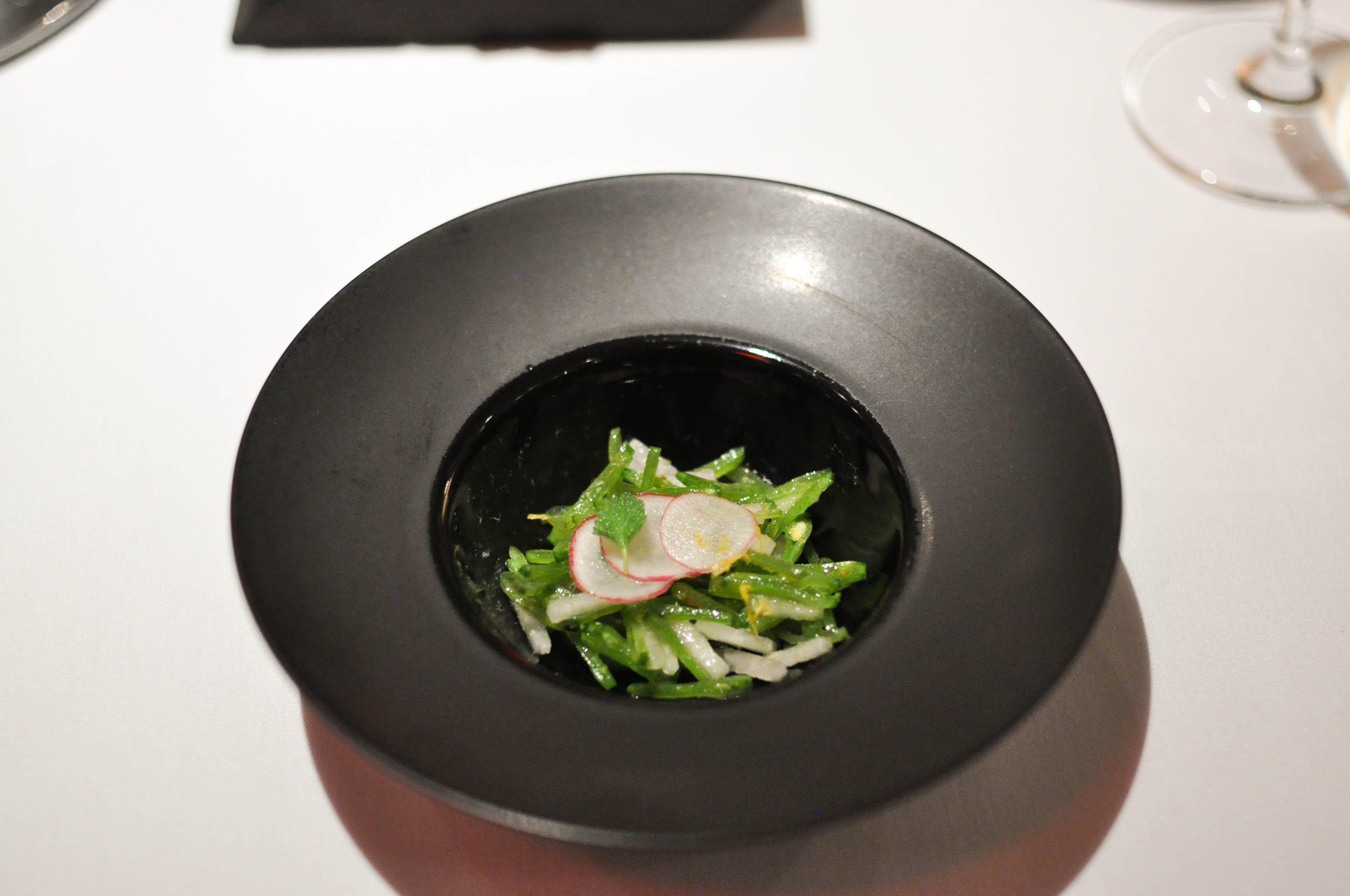 Amuse 1: Sugar Snap Peas, Breakfast Radish, Grapefruit Gelee. I like the strong bitter and tart flavor, but a few bites were too sweet.