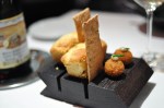Bread service included truffled arancini, white cheddar cheese cornbread, and whole grain crackers. The arancini had a good crispness outside and a generous truffle essence. I typically don’t like cornbread unless it’s accompanied by chili due to the usual dryness. This though, was great. Moderate sweetness, not dry, mild cheese flavor, and good snap of cornmeal. The crackers, whole wheat and flax-seed, had light herbaceousness from rosemary.