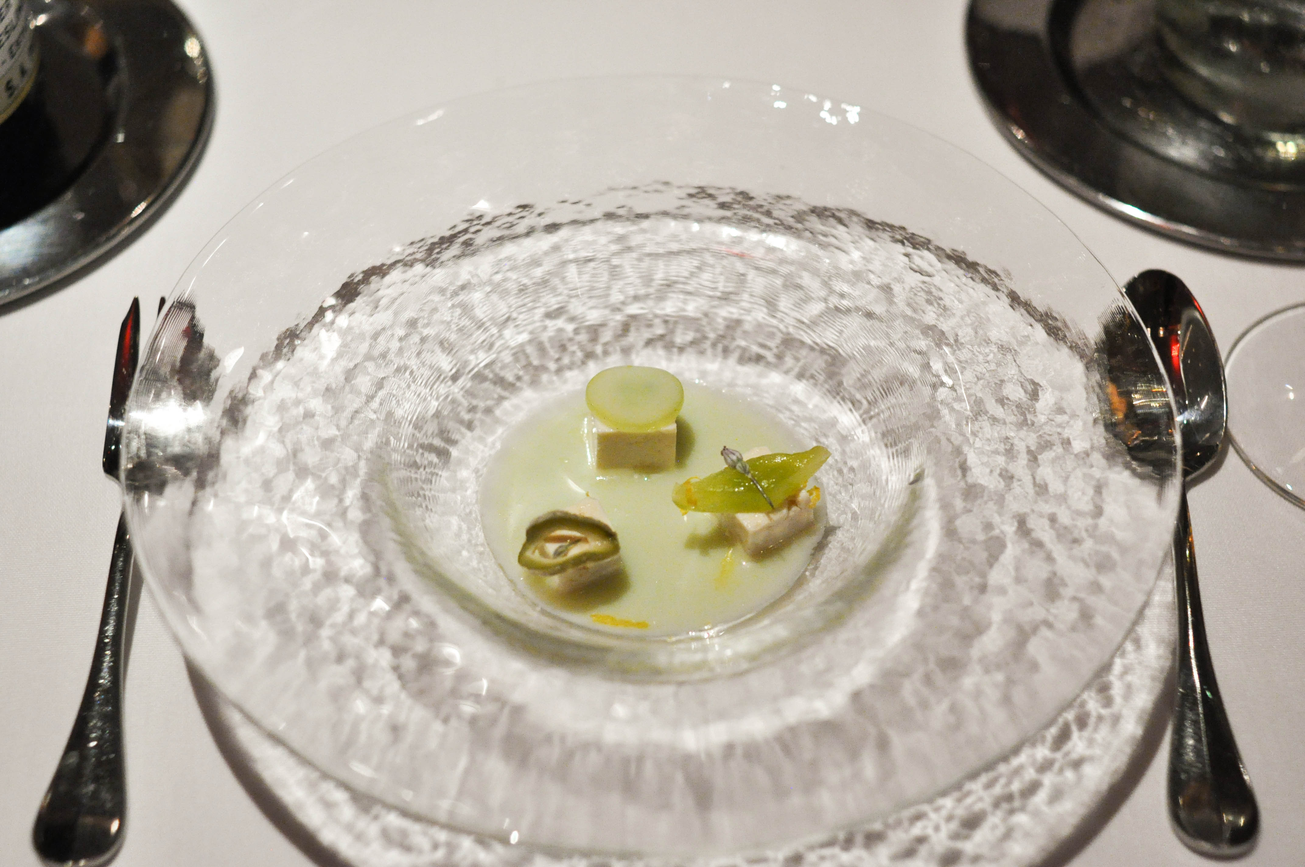Amuse 2: Tofu, Green Grape, Cured Green Almond, Green Tomato Gazpacho. This was perfect. Light, fresh acid. Delicate, subtle, pure. I would love to have a full-size dish of this.