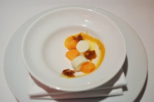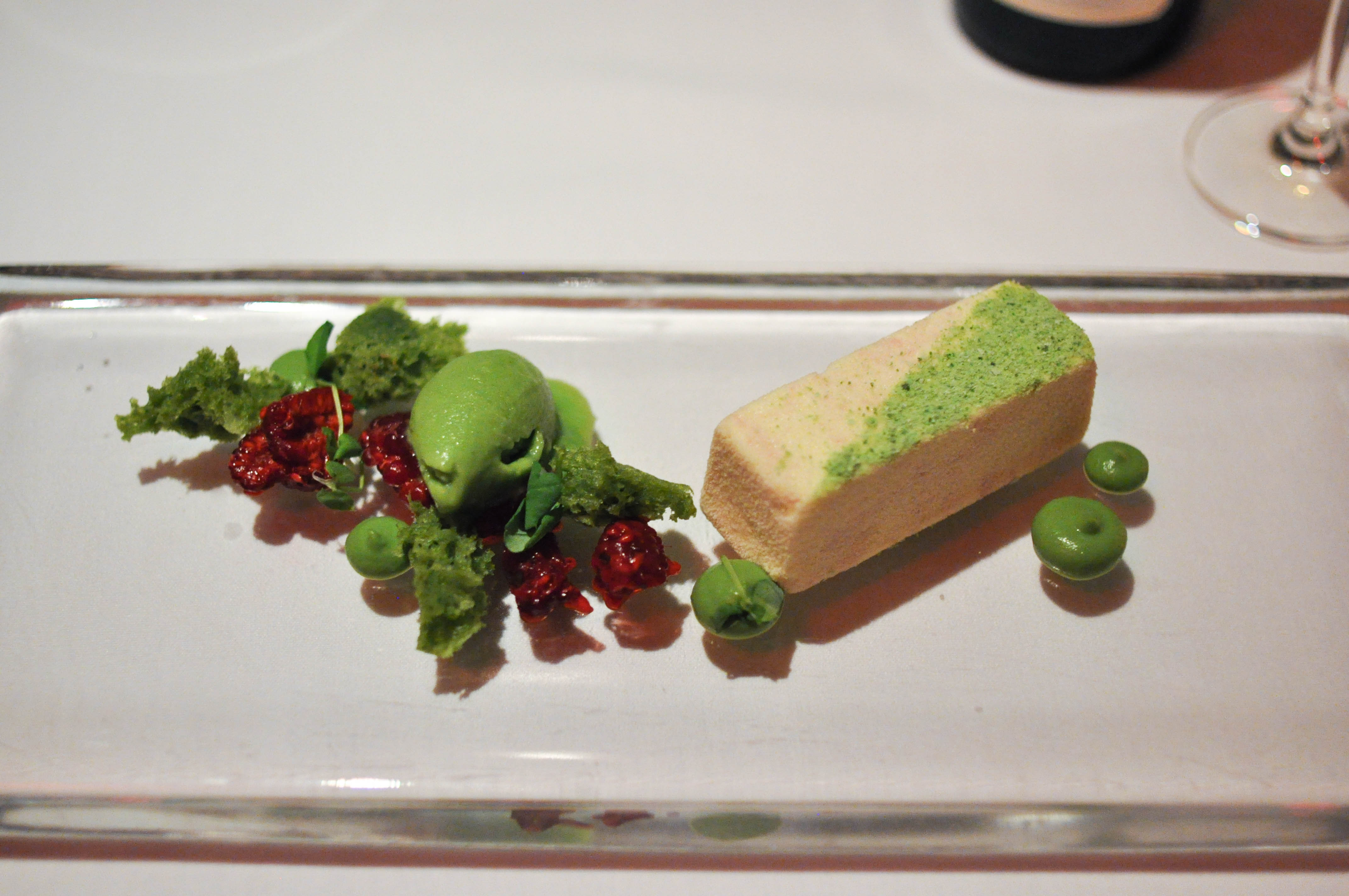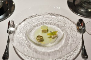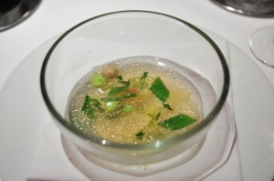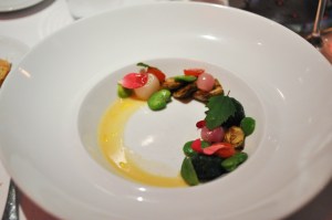 3rd Course: Chilled Vegetable Consommé, summer bouquet, vanilla, mint. This consommé had a flavor that felt like it wanted to punch me in the mouth, but showed just enough restraint to stop short of it; very well done. I feel like if I could have a bowl of this every day as a ‘pre-workout power juice’, I would be much more productive in the gym. Of course, the peas had me at hello. One element(I think celery root) was beautifully cooked to meaty texture that almost could have passed for a dense fish or crab leg. Big winner.
