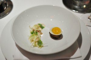 Amuse 3: Rye Bread Pudding, Sunny Side Up Quail Egg, Gruyère Bechamel. The bitter chicories and the acid of their dressing made a distracting imbalance, but broke up the richness of the other elements.