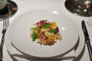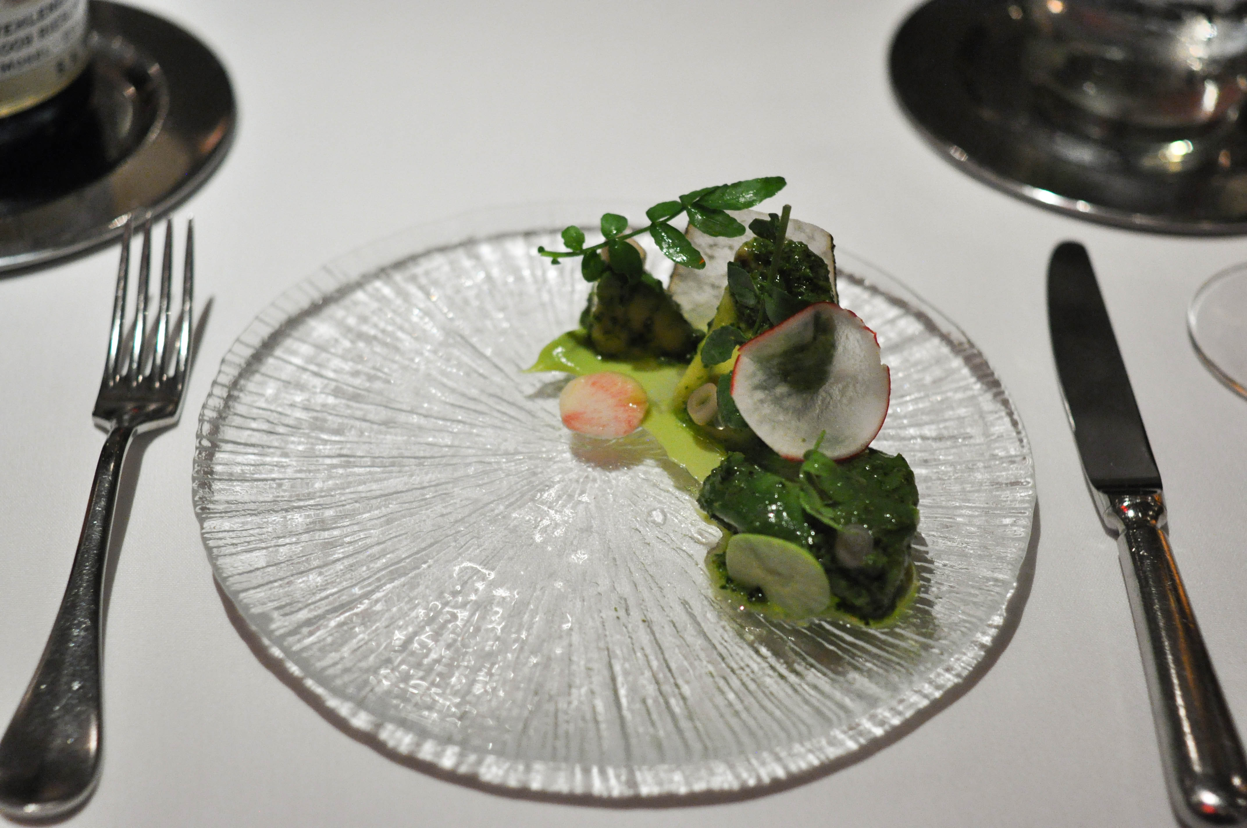 1st Course(supplement): Avocado Salad, Wild Watercress, Fava Beans, Ramps. Ideally ripe avocado, rich and smooth. Crisp crunch of fresh radish. Small bites of ramps. This dish was perfectly calibrated and a great opener.