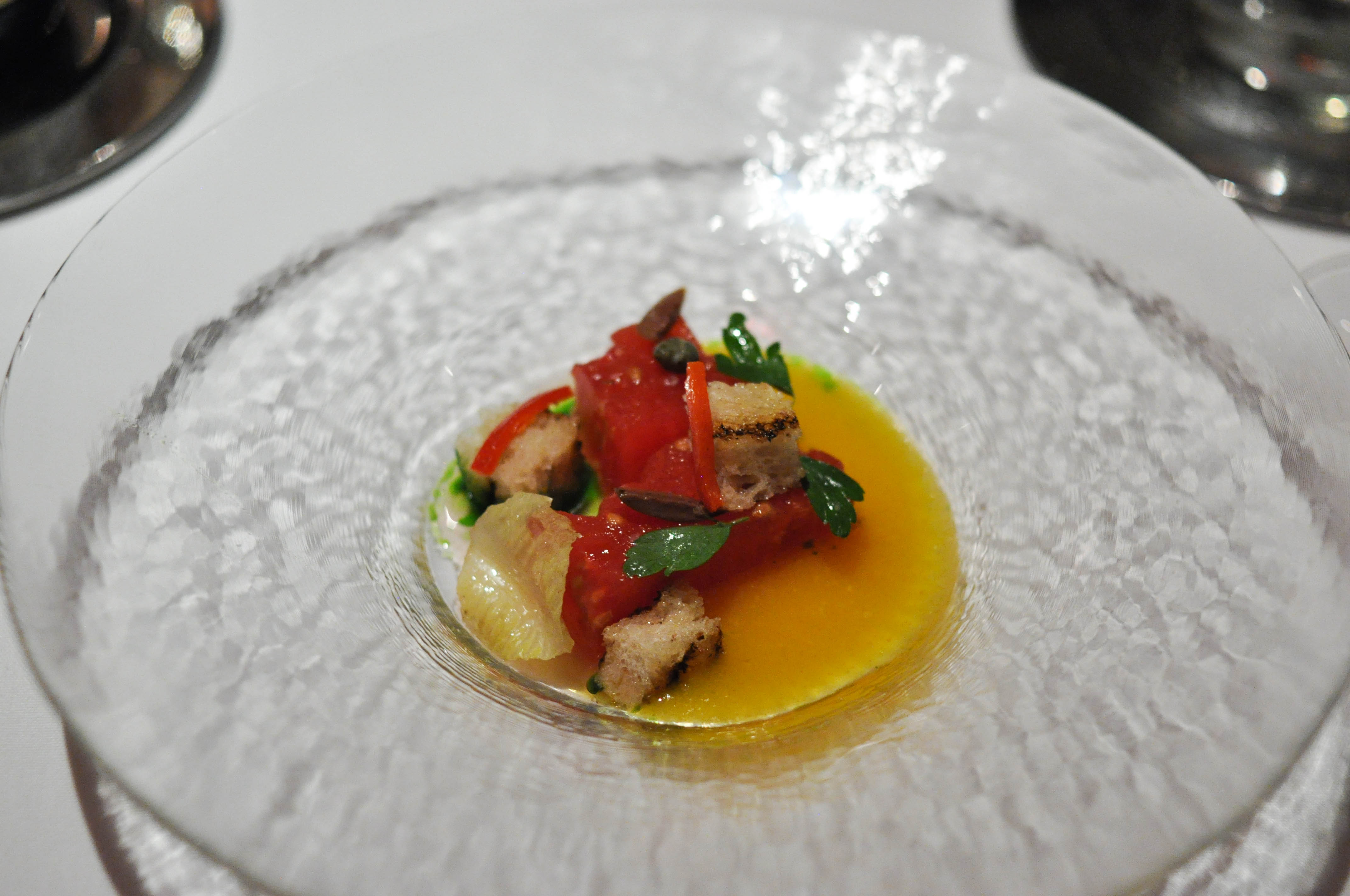4th Course(an extra from the kitchen): Compressed Tomato, Yellow Tomato Coulis, Romaine Punch, Crouton, Olive, Caper. My first great tomato experience of the season. The small pieces of olives and capers gave just a little character and influence for minor variations on tomato-focused bites.