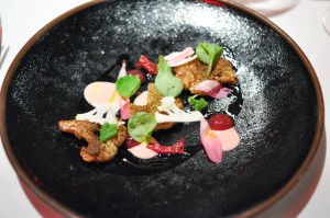 8th Course: Charred Cauliflower, Peonies, Chai Curry Spice. The cauliflower itself was executed superbly. Tender, and amazingly seasoned. The leaves and slices of raw cauliflower were great companions. The two sauces: a sort of rhubarb aioli, and a peonies gel, were far too sweet. So I enjoyed the vegetables and left the sauce on the plate.
