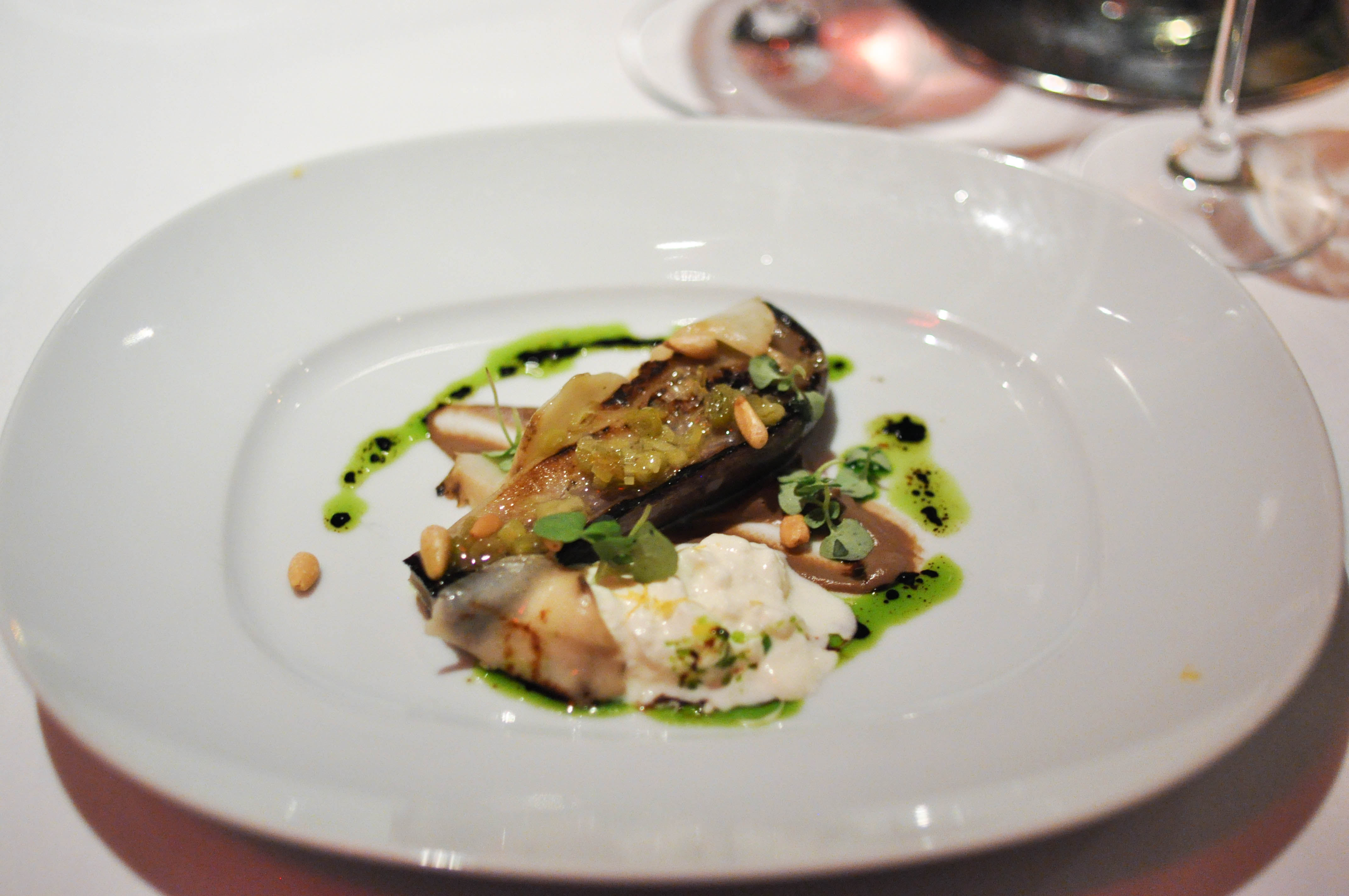 9th Course: Roasted Eggplant, Porcini Mushrooms, Balsamic. There was a lot going on here. Eggplant, pine nuts, onion, eggplant puree, porcini, stracciatella cheese, creme fraiche, balsamic, and some type of (herb?) oil. The cheese was good. The puree was great. The porcini was fairly bland. The eggplant, the feature, was watery. I tried different approaches to building bites, but every try came down to the (lack of) flavor of the eggplant. This was sad, because the other components on the plate scraped together were delicious, but overall the dish fell short.