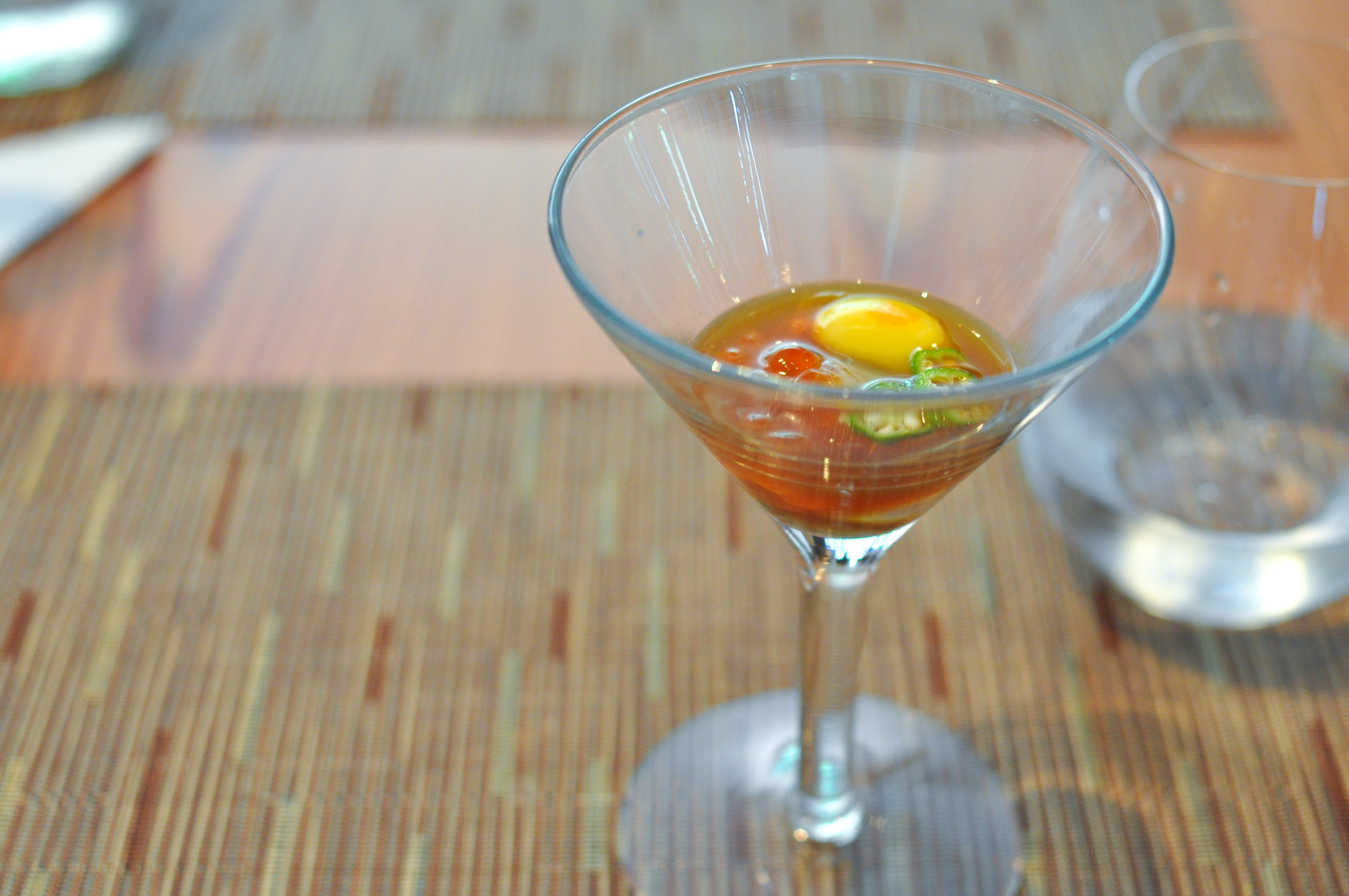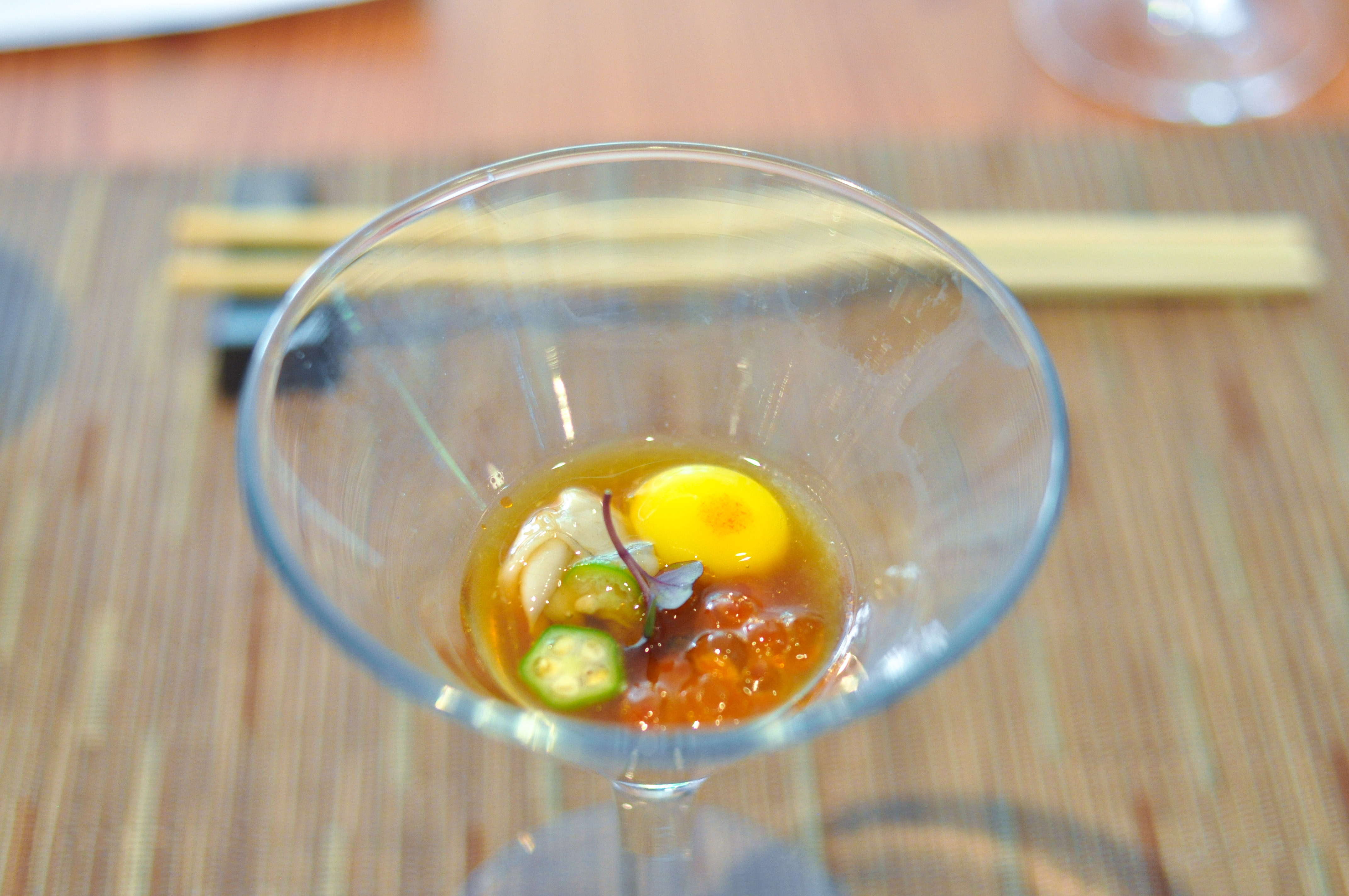 An oyster with quail egg yolk, salmon roe, okra, ponzu, and tabasco. The oyster ‘shot’ had a nicely rounded hit of savory layers with just a little spice.