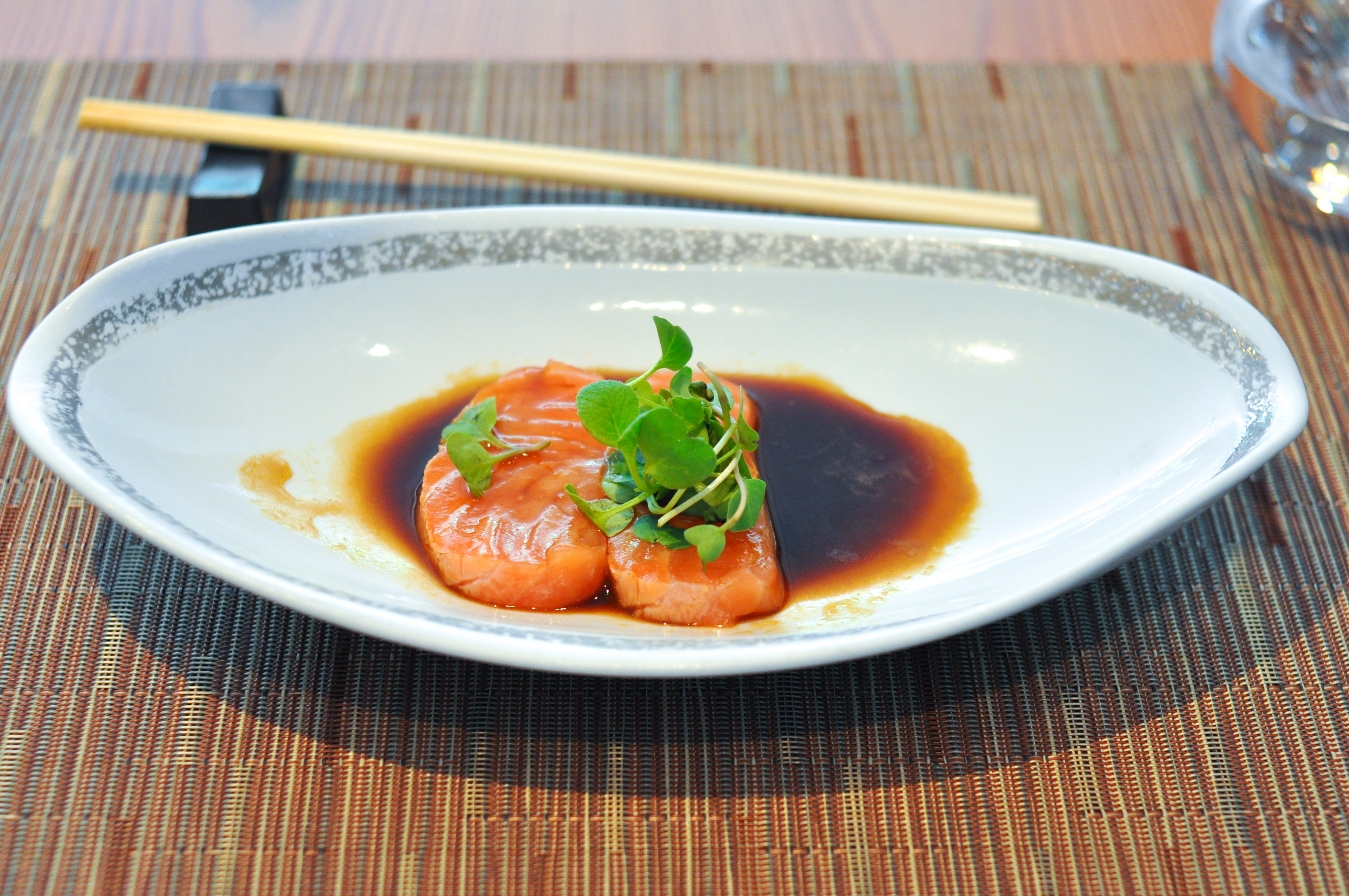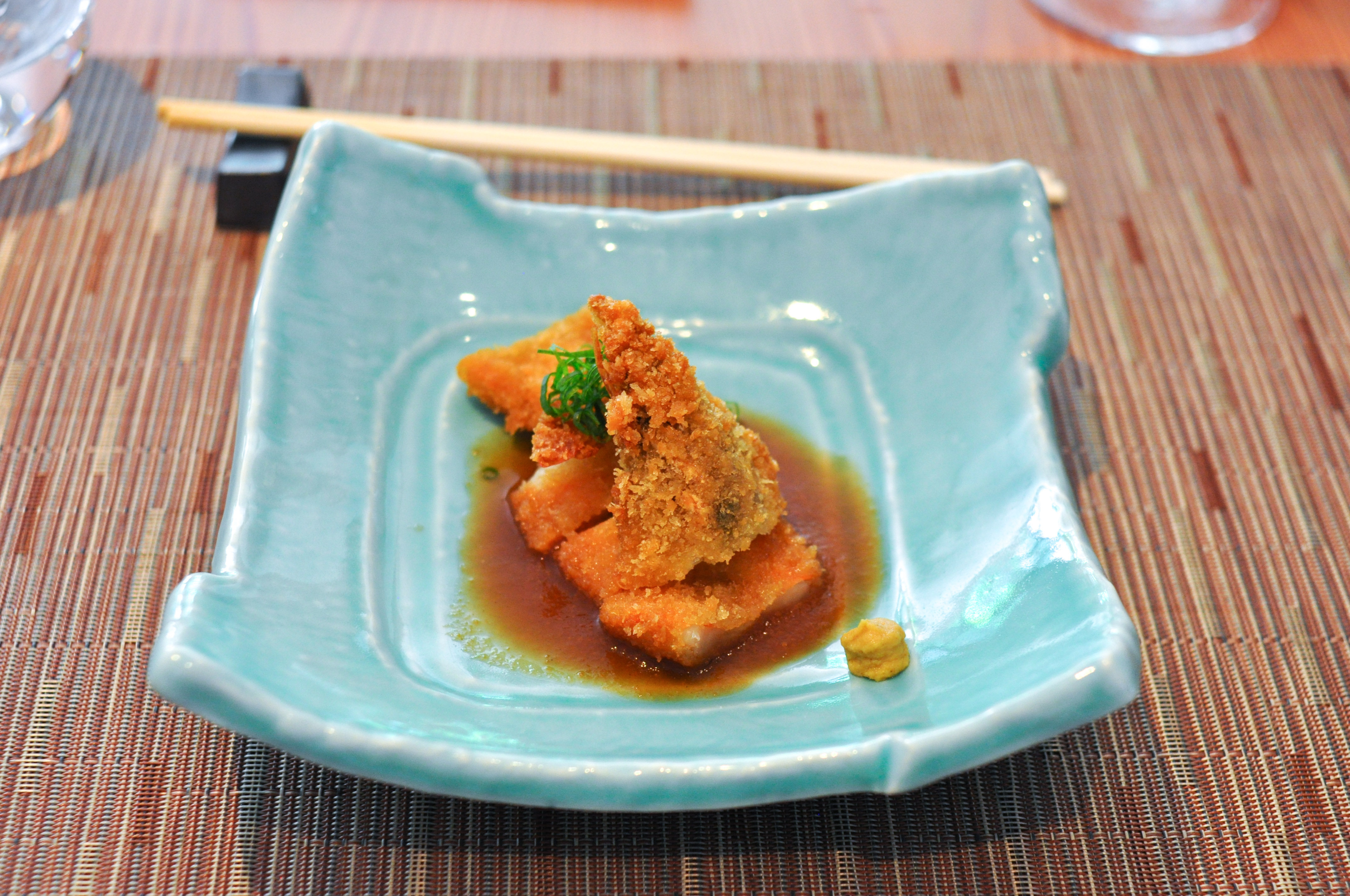Salmon with vegetable tempura, flying fish roe, and olive oil soy vinegar sauce. The savory aroma was very nice and the dish was tasty, though the featured salmon was covered up by the other components.