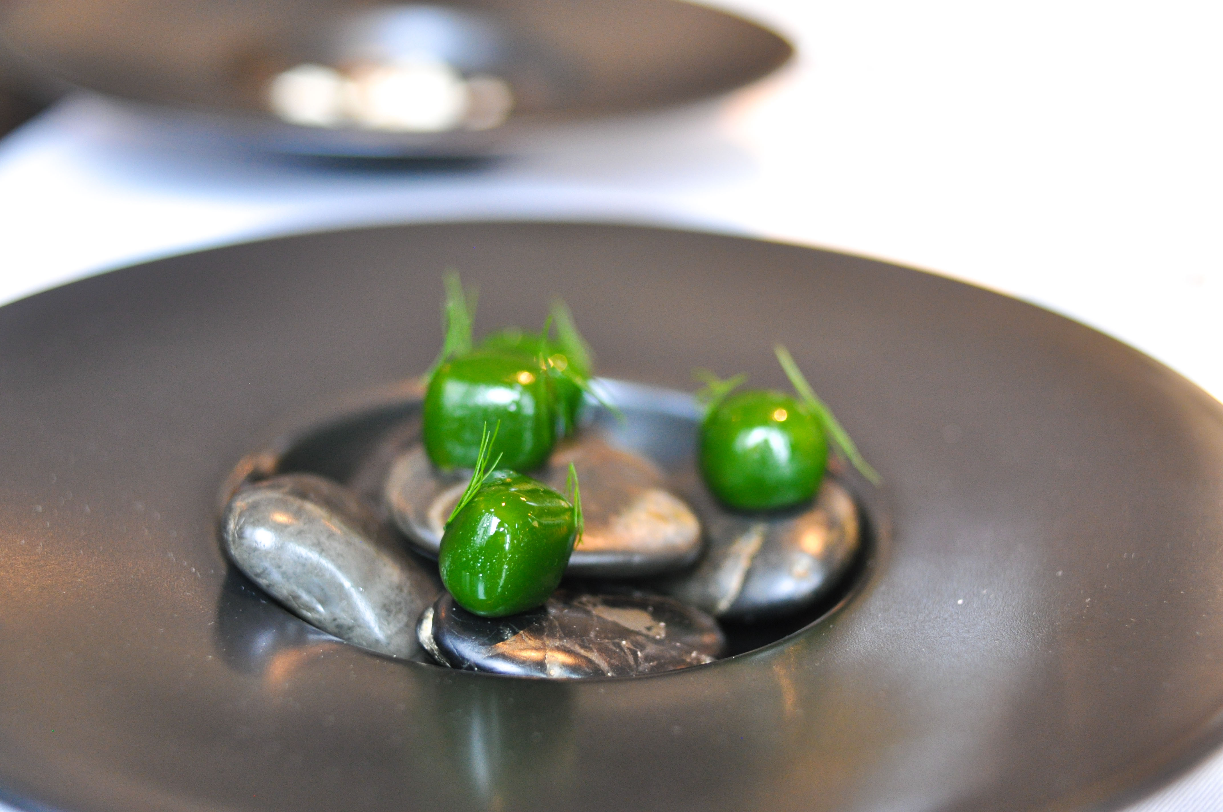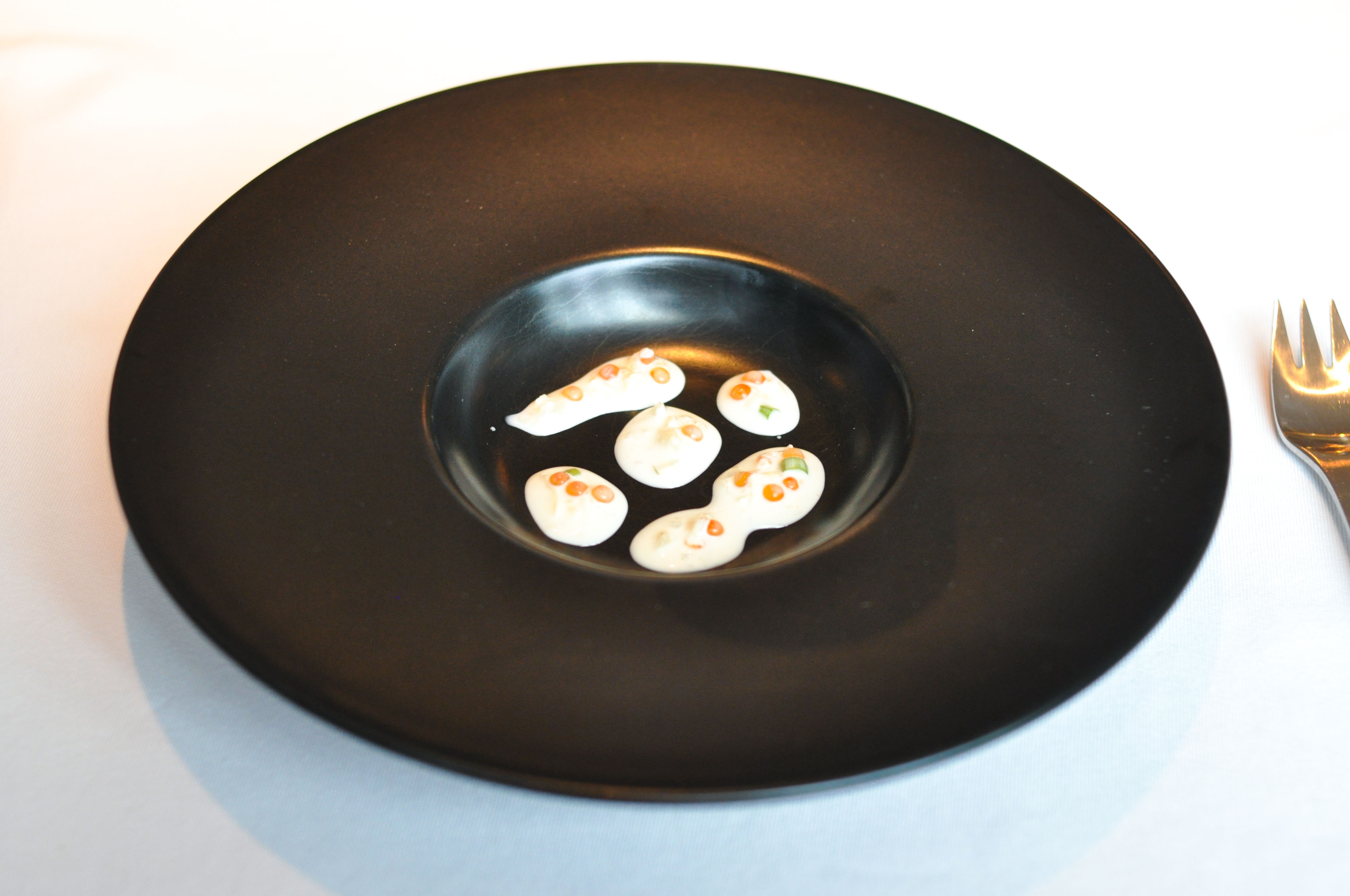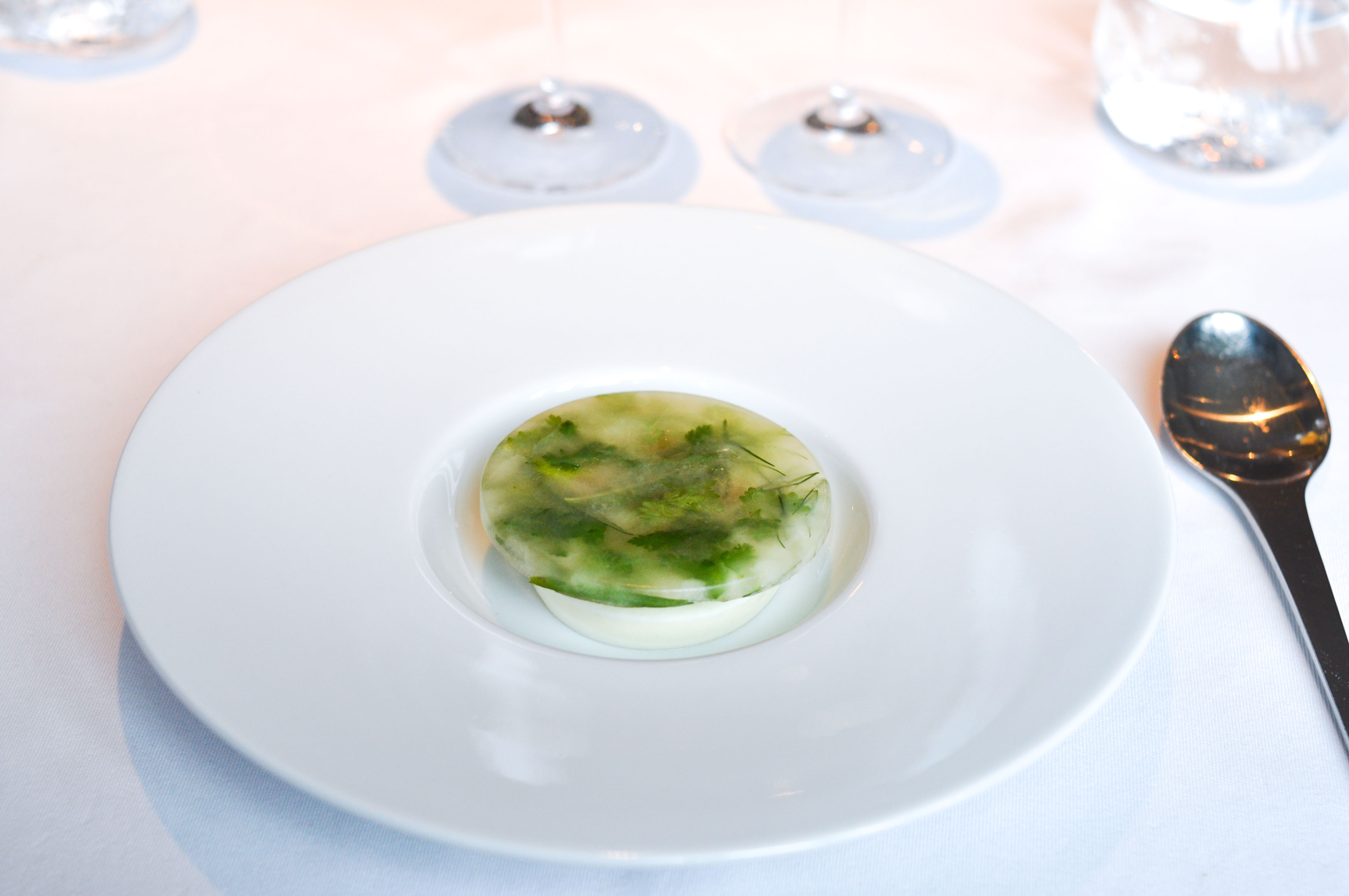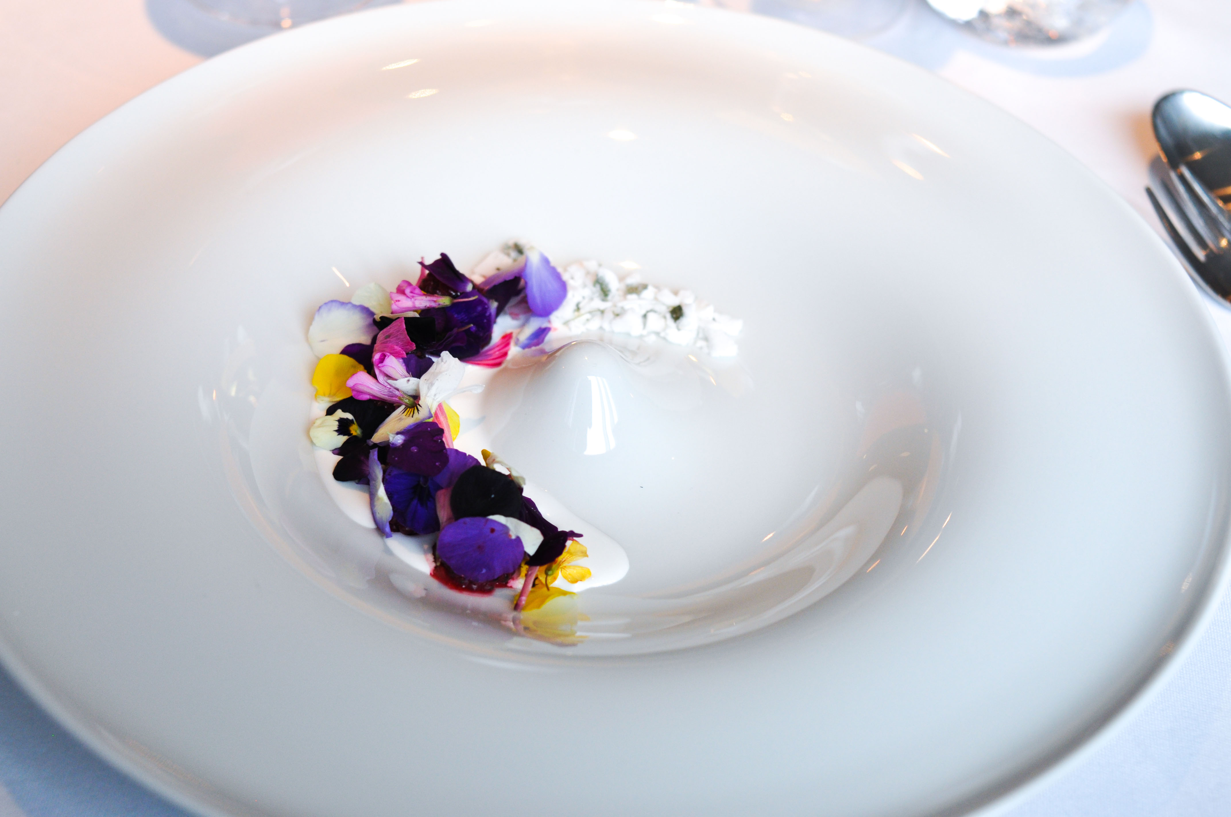 Fresh goat cheese and parsley. A composed course of light, subtly tangy Swedish goat cheese and parsley puree presented in a Jackson Pollack fashion and served with more house sourdough in lieu of additional silverware.