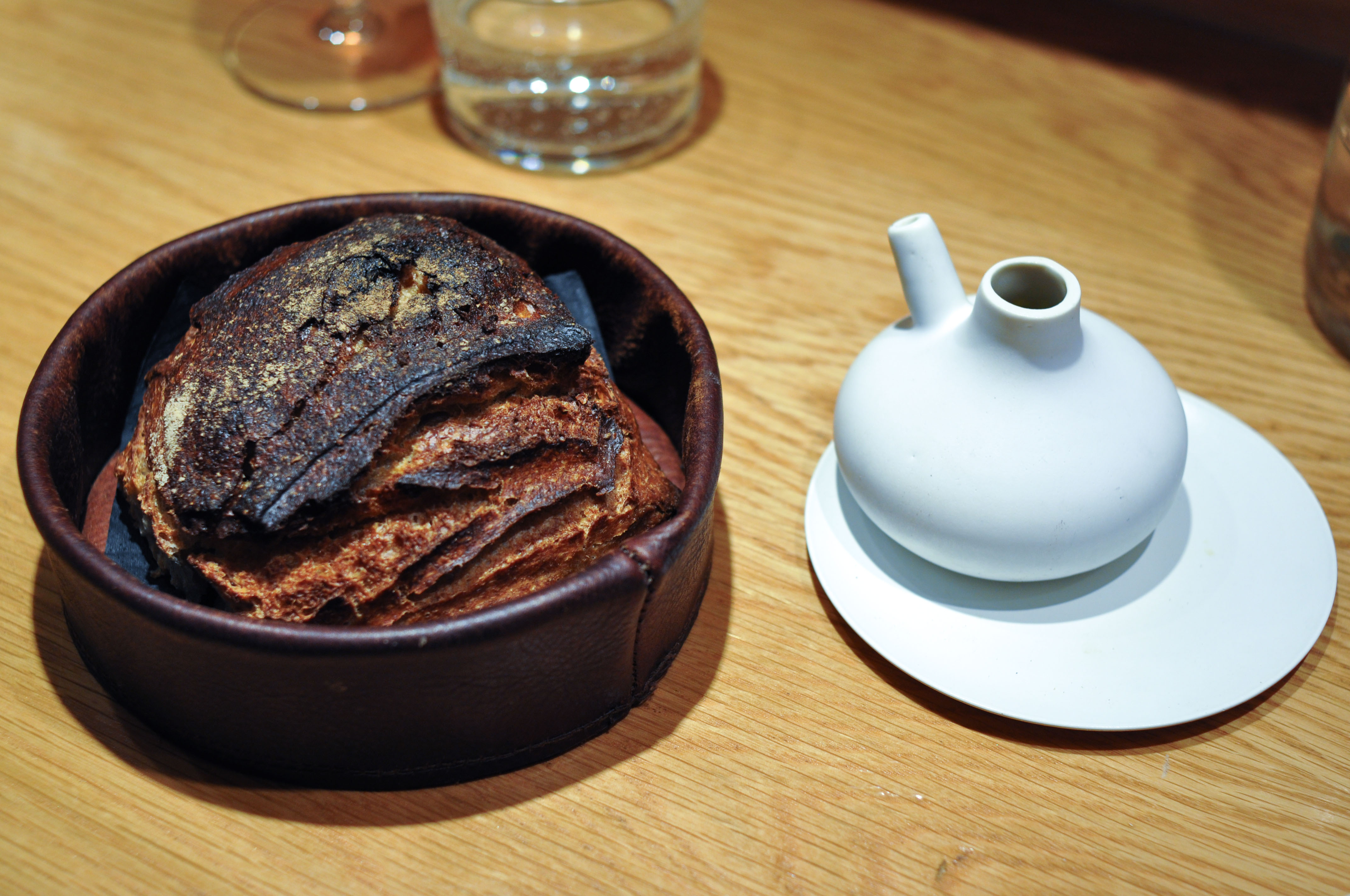 Bread service. Thick-crusted sourdough accompanied by cold-pressed Sicilian olive oil.