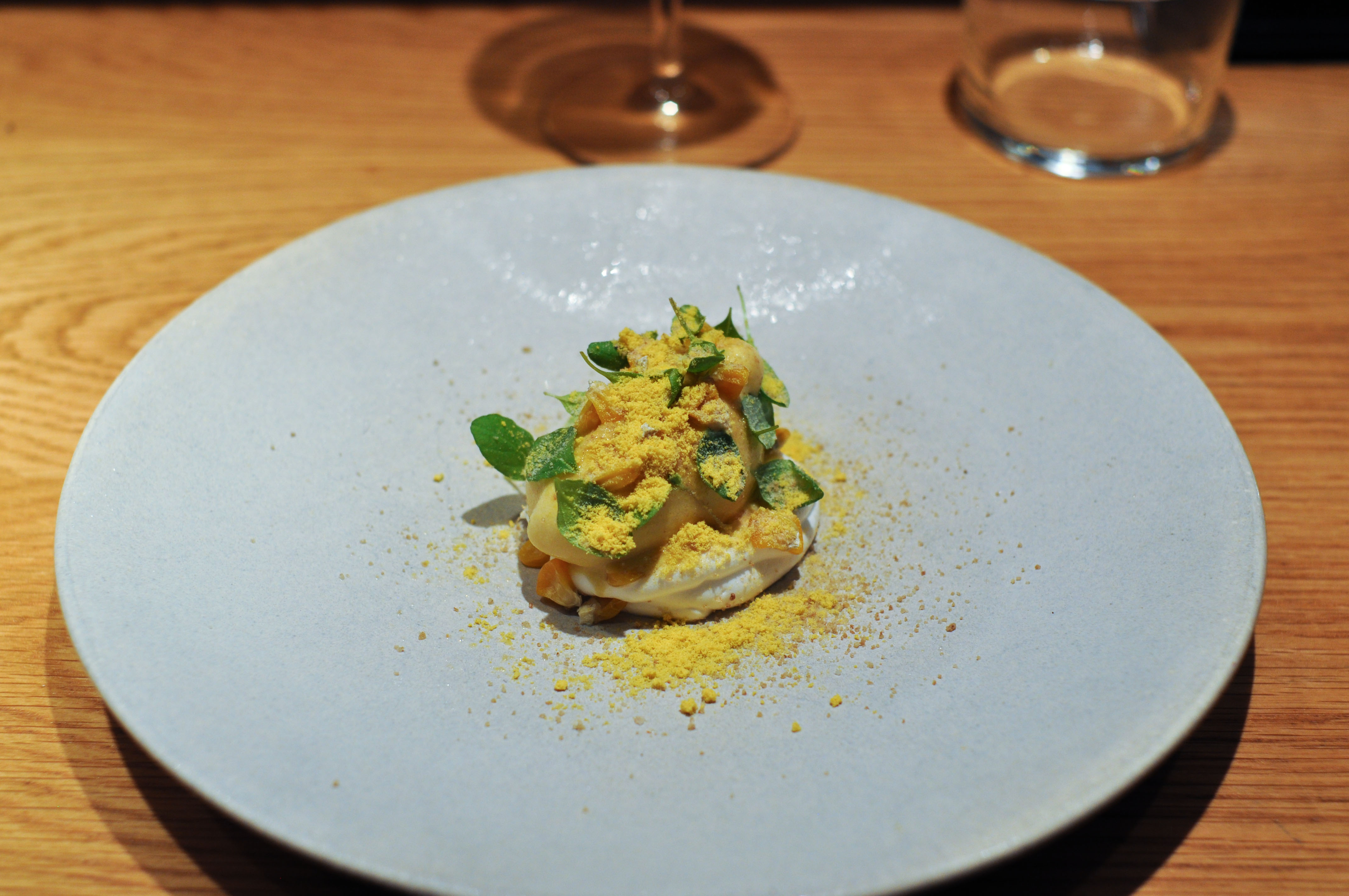 Corn, breadcrumbs and marjoram. Another winner. The creaminess of sweet corn ice cream over an Italian meringue. The herbal tang of the marjoram was a fresh counterbalance. Breadcrumbs and whole corn kernels changed up the texture.