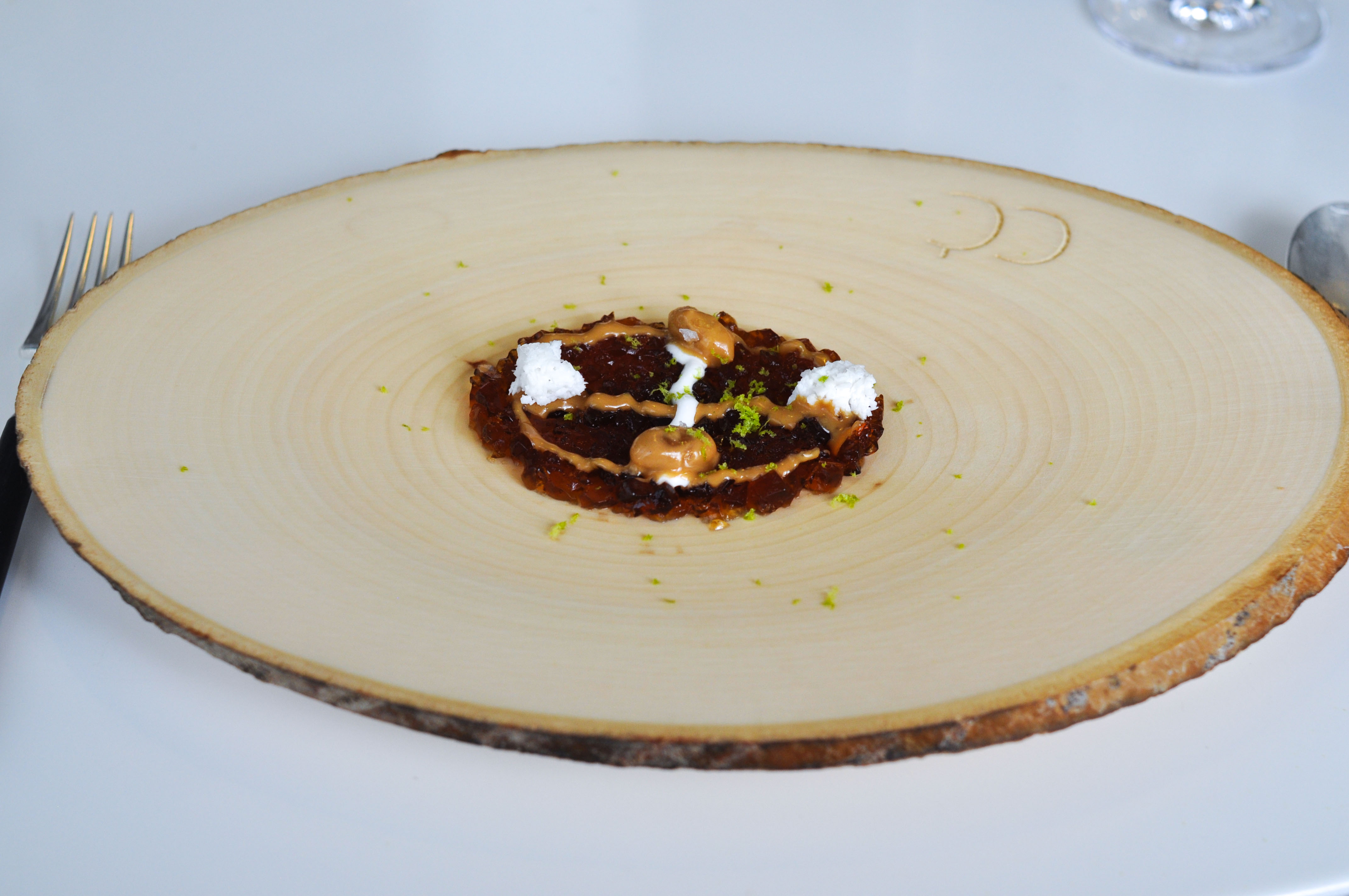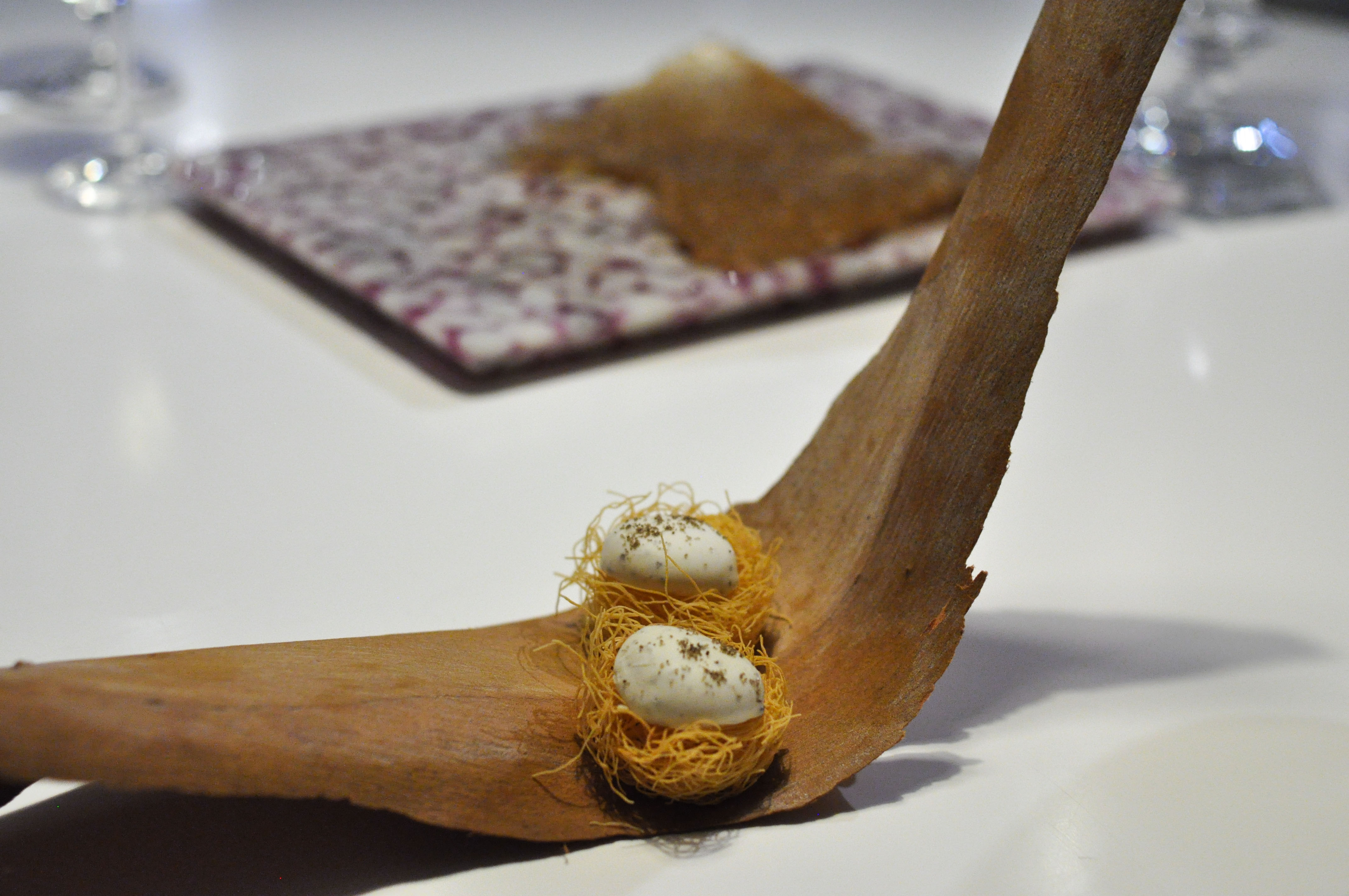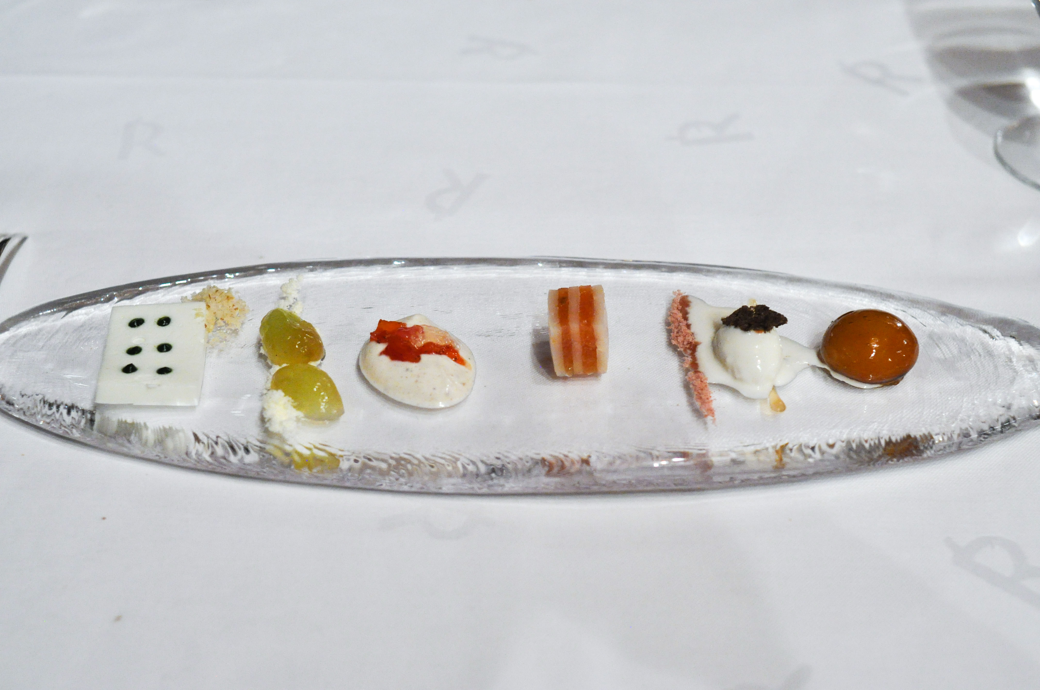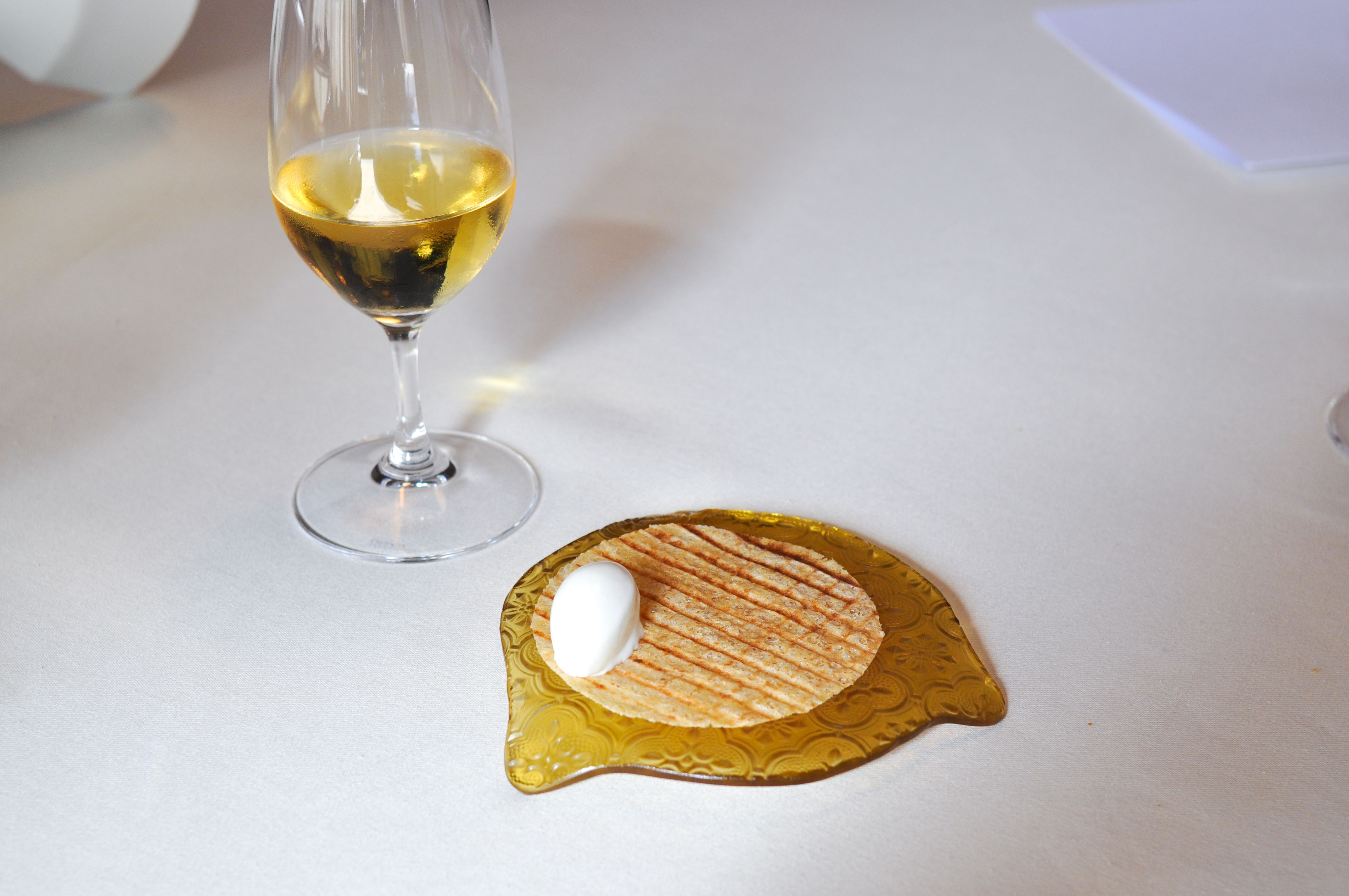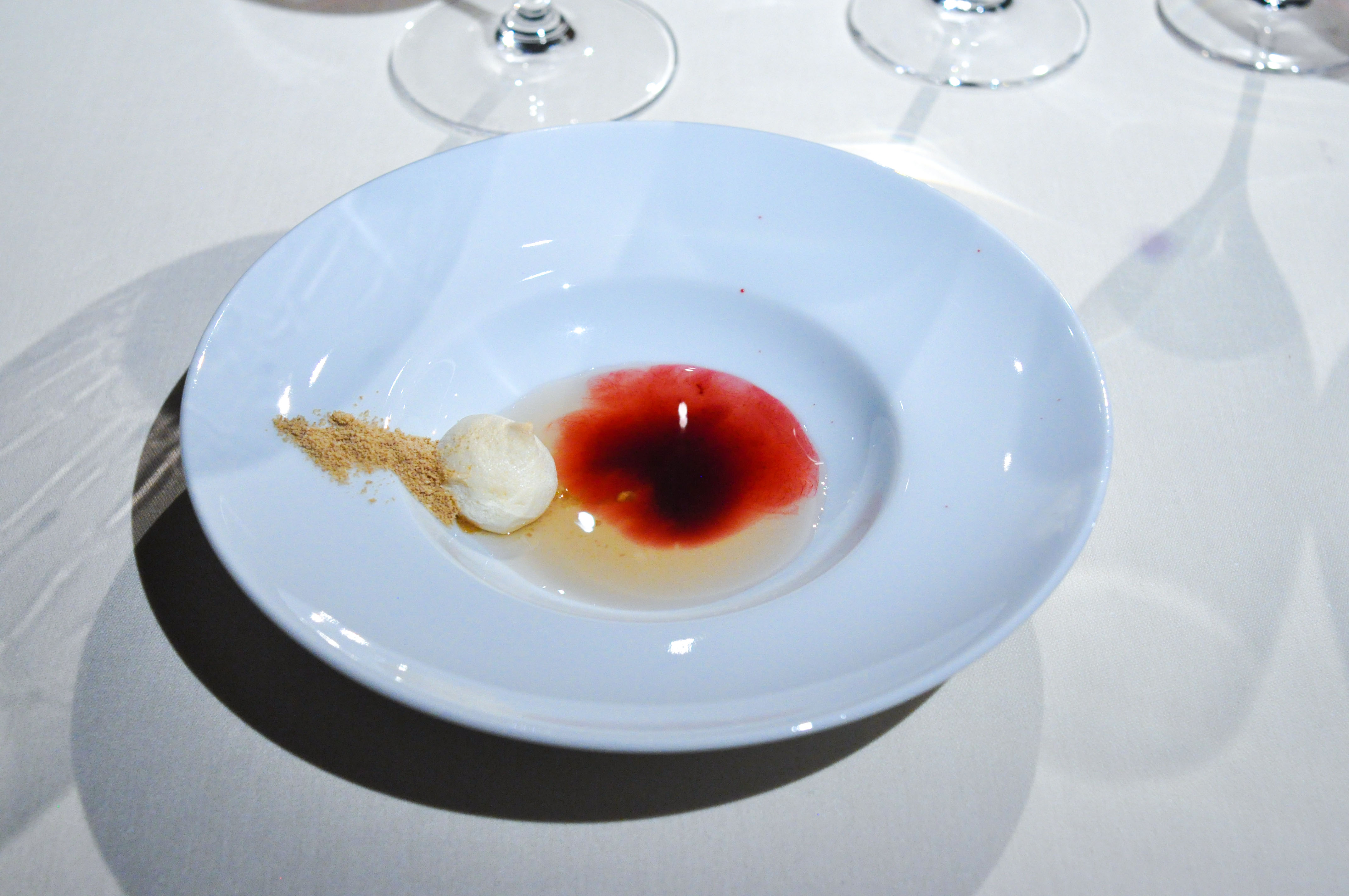 Milk and Grape, Cheese and Wine in Parallel Evolution. ‘Grapevine, curded sheep milk and walnut’ tasted like a bad egg dish. ‘Powdered fresh cream with chive and grapes’ was nice and clean. ‘Quark cheese with nutmeg and pink pepper aroma, must of tapioca and tomato’ was full flavored with good spice and season. ‘Idiazabal semi-matured with quince jelly and wine dust’ was my favorite part, with great fruit balance. ‘Brandy sirop with Gorgonzola cheese ice cream’ I loved the blue cheese ice cream. ‘Torta of Casar’s grape with soaked raisins in Pedro Ximenez’ had a good sugar to acid ratio.