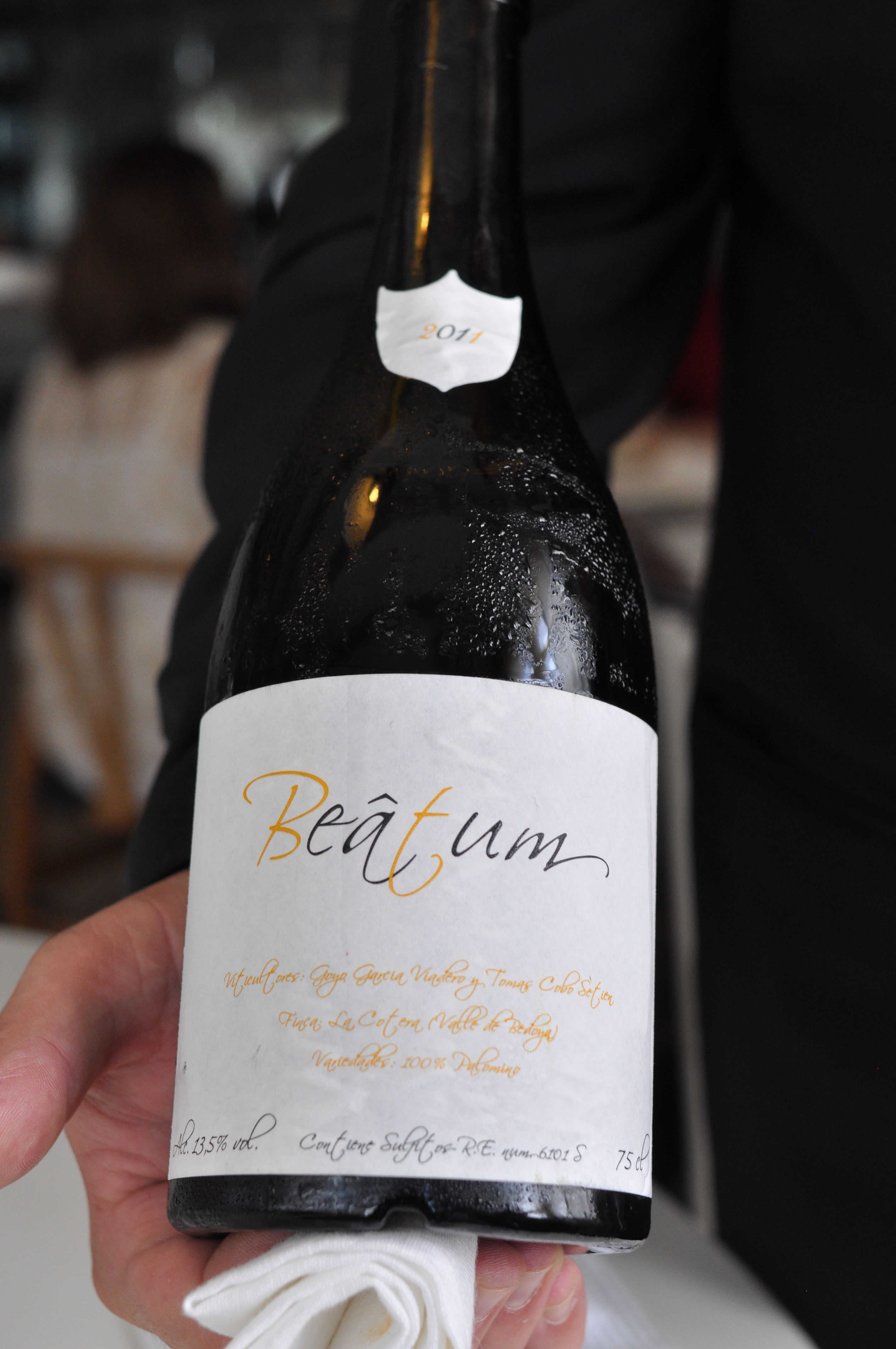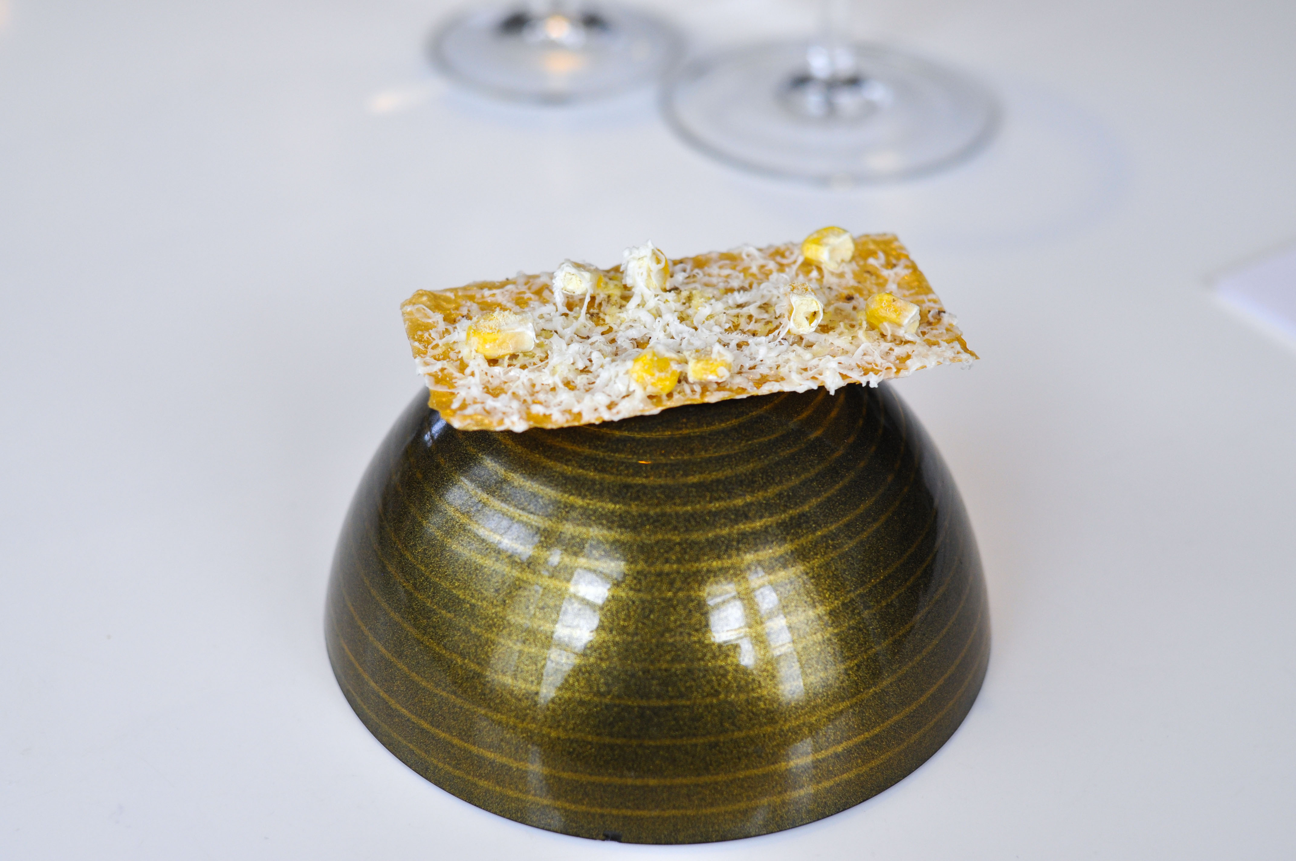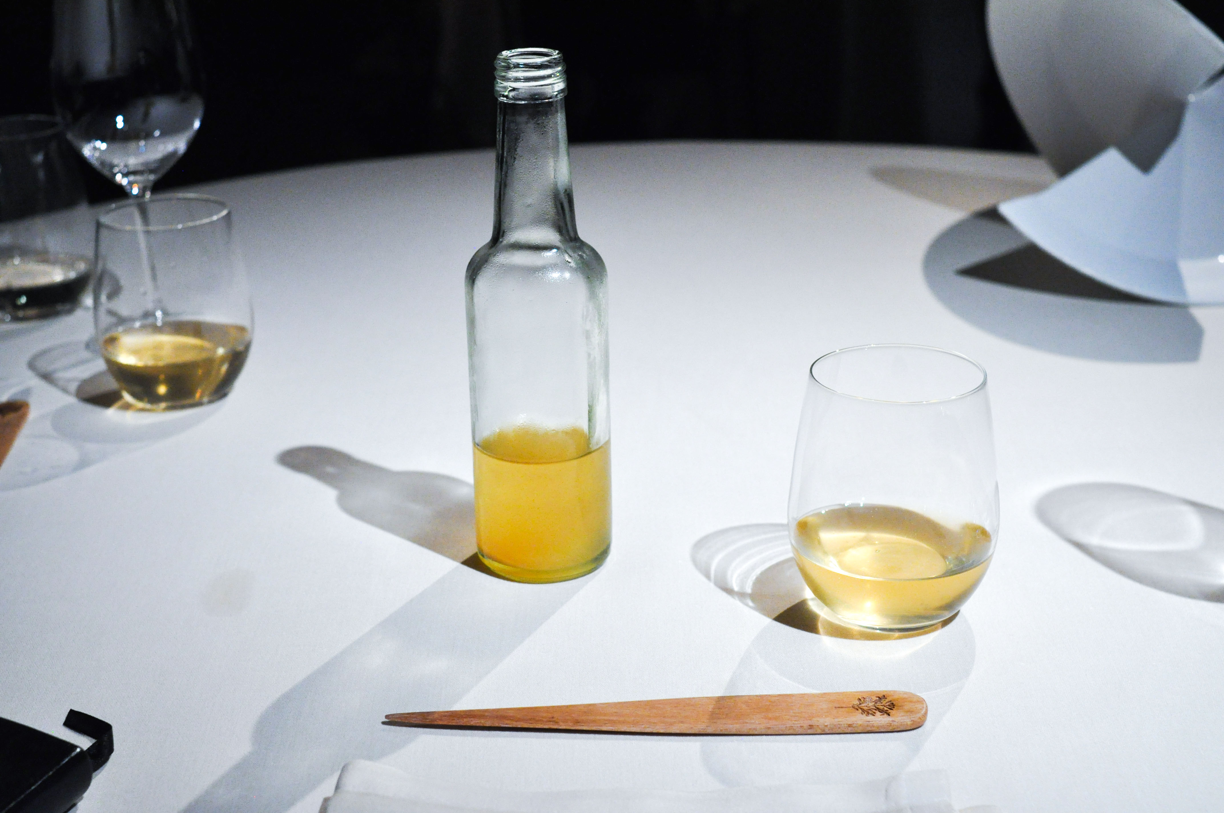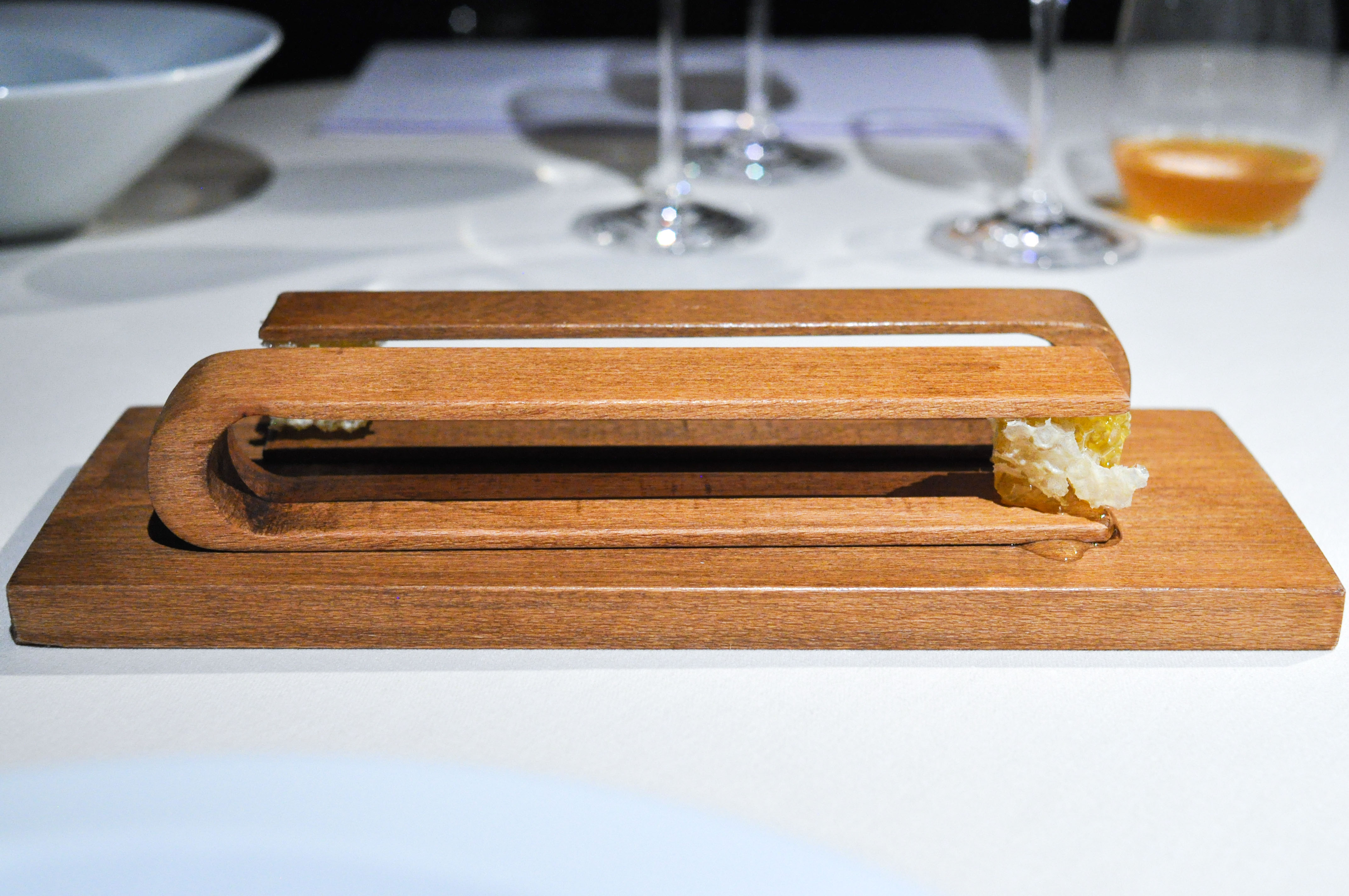 Milk and Grape, Cheese and Wine in Parallel Evolution. ‘Grapevine, curded sheep milk and walnut’ tasted like a bad egg dish. ‘Powdered fresh cream with chive and grapes’ was nice and clean. ‘Quark cheese with nutmeg and pink pepper aroma, must of tapioca and tomato’ was full flavored with good spice and season. ‘Idiazabal semi-matured with quince jelly and wine dust’ was my favorite part, with great fruit balance. ‘Brandy sirop with Gorgonzola cheese ice cream’ I loved the blue cheese ice cream. ‘Torta of Casar’s grape with soaked raisins in Pedro Ximenez’ had a good sugar to acid ratio.