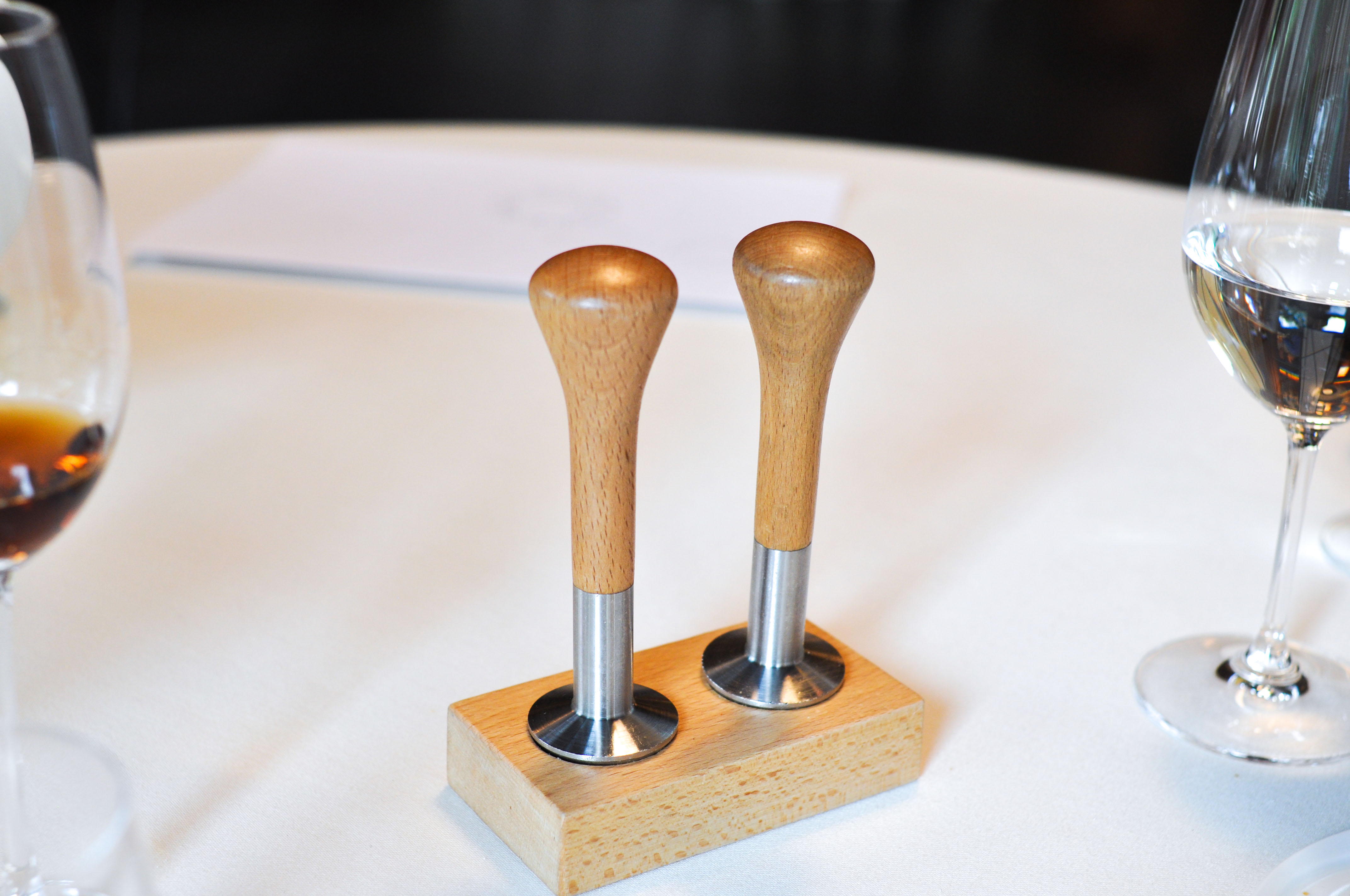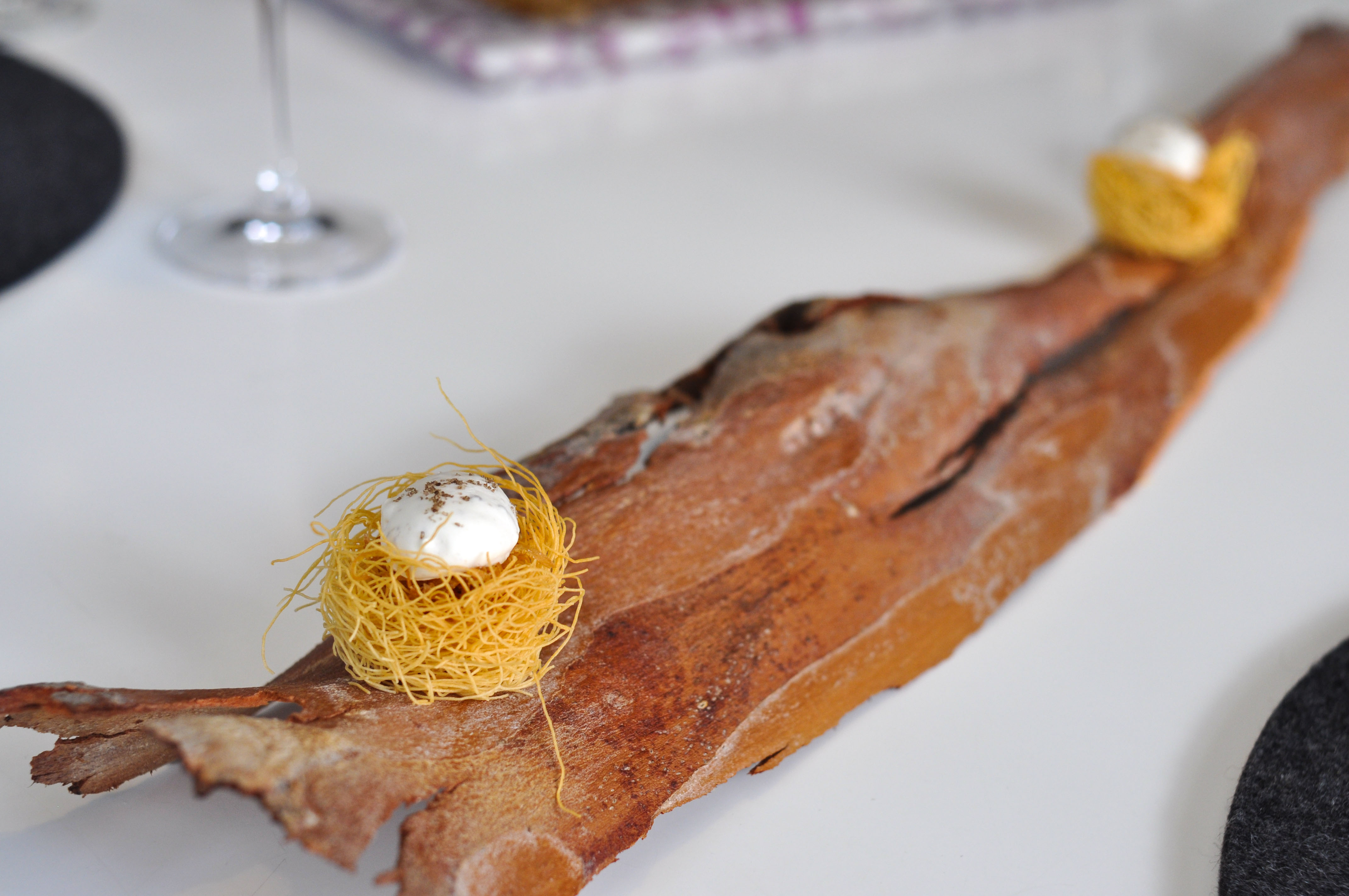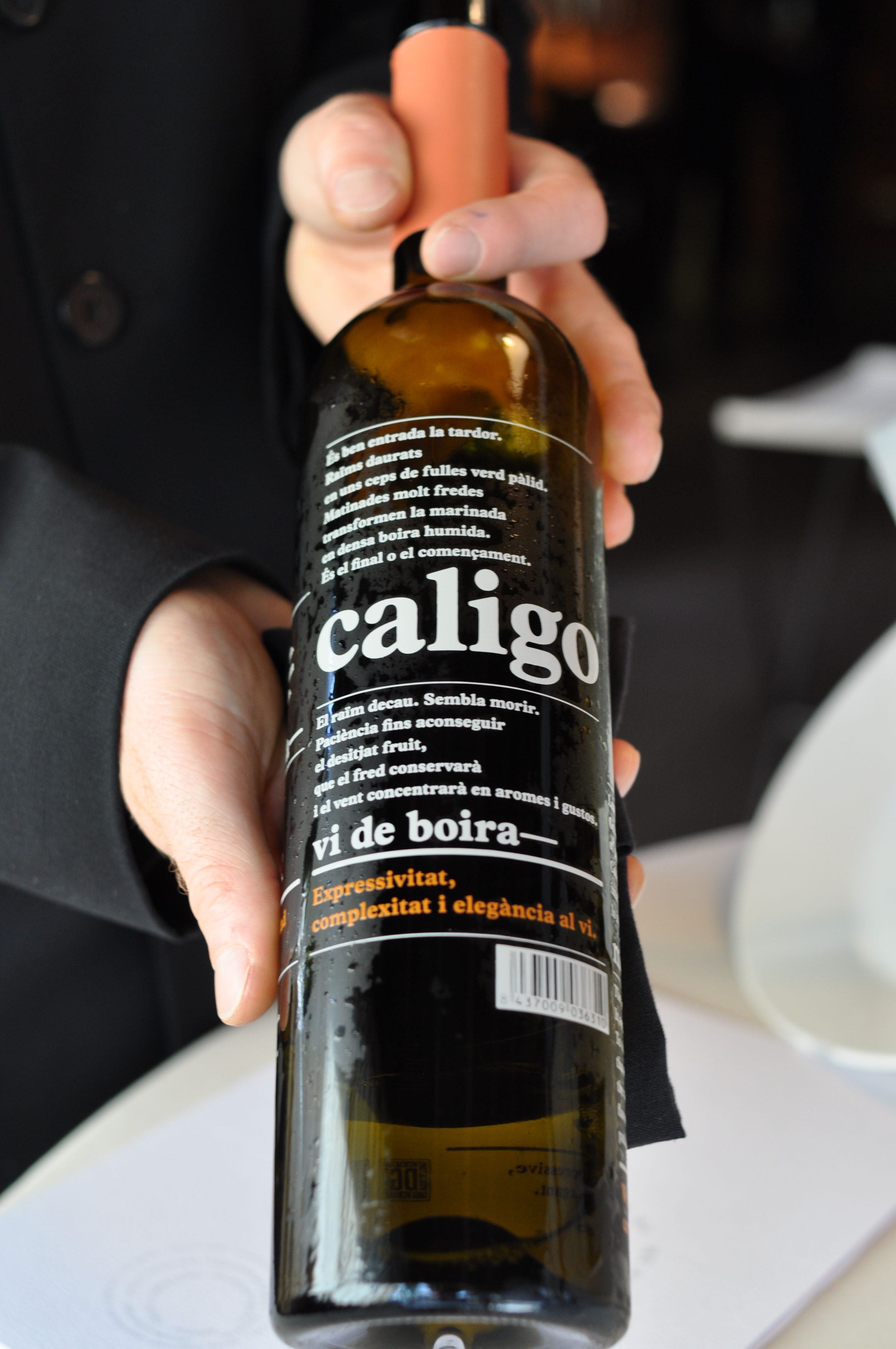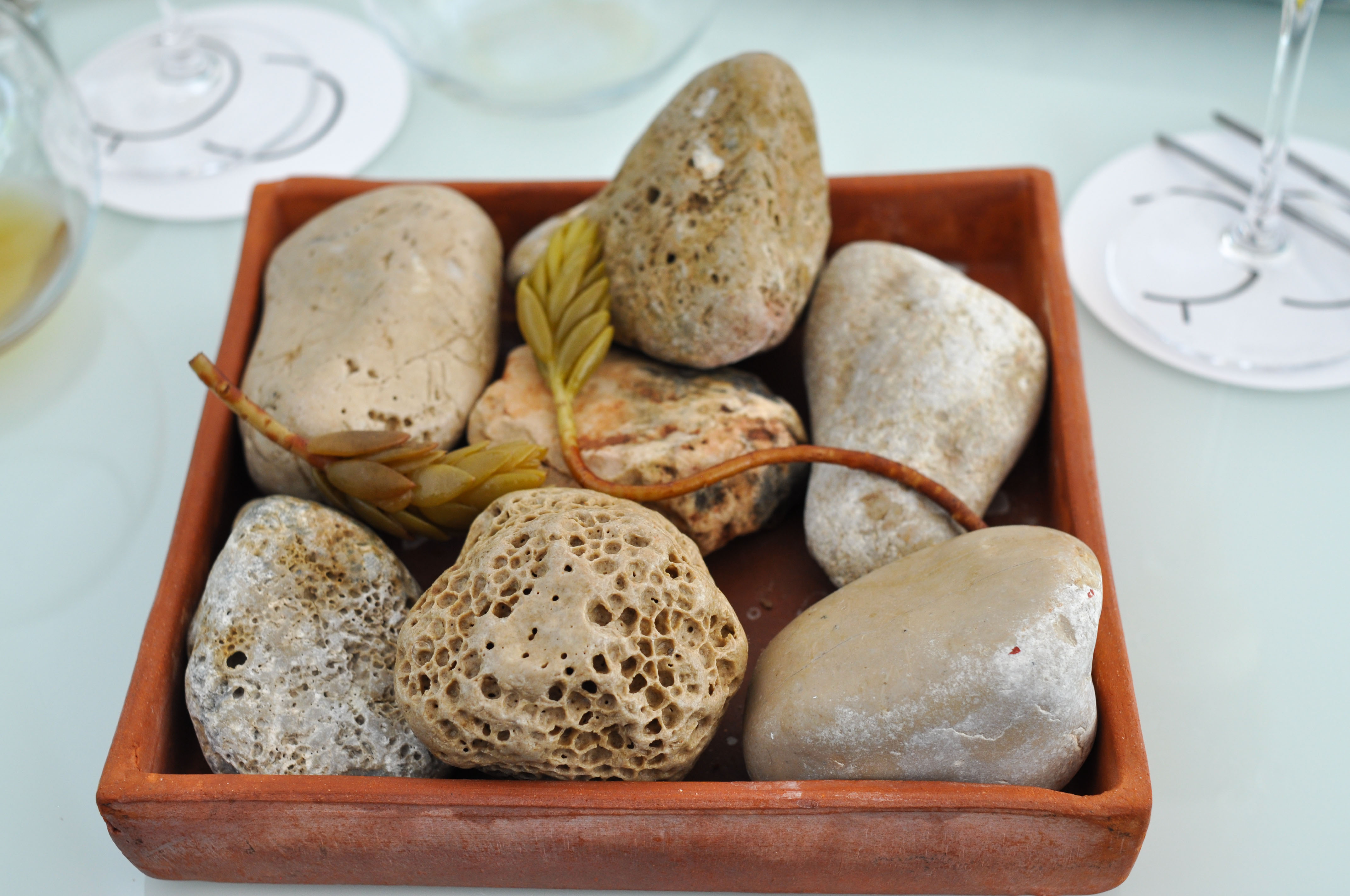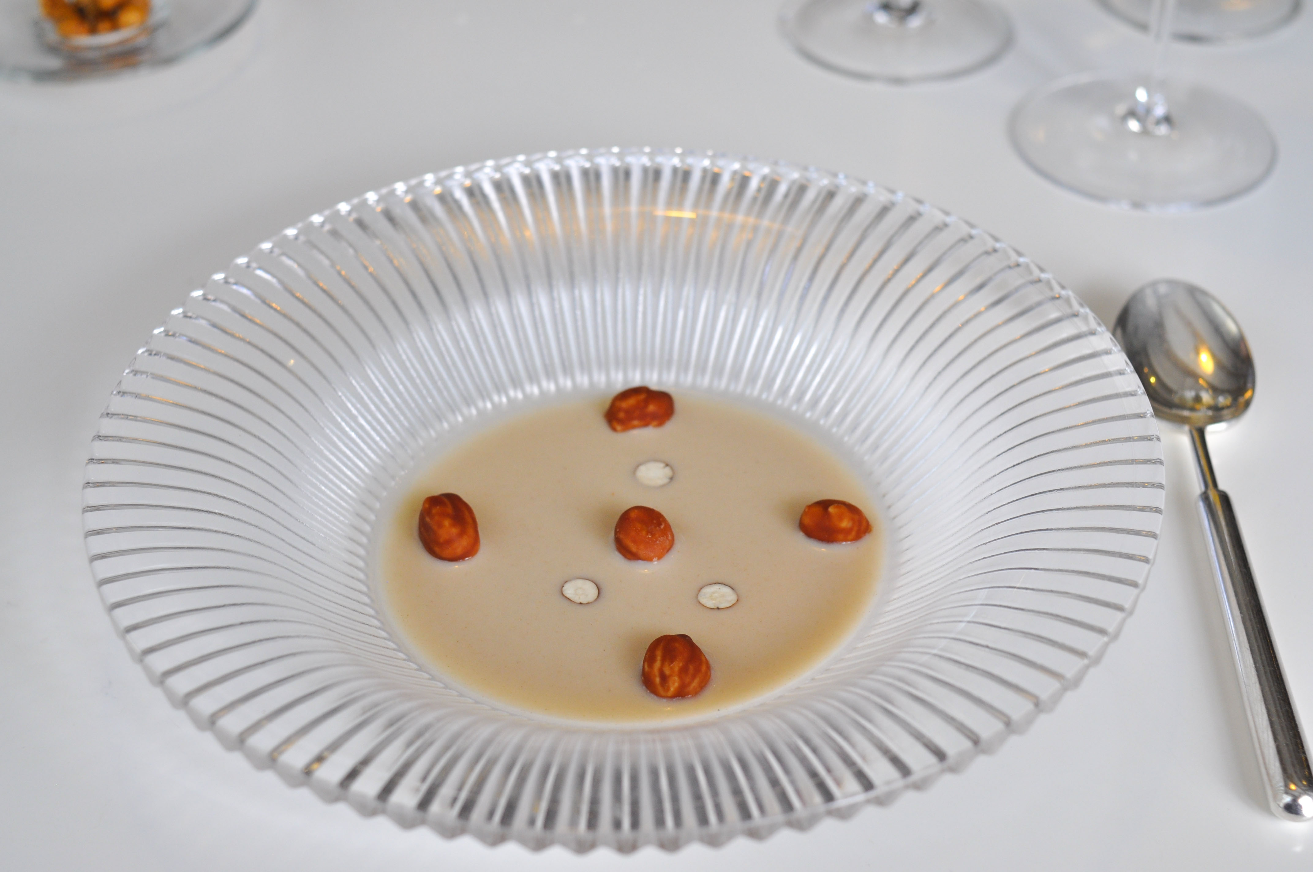 Milk and Grape, Cheese and Wine in Parallel Evolution. ‘Grapevine, curded sheep milk and walnut’ tasted like a bad egg dish. ‘Powdered fresh cream with chive and grapes’ was nice and clean. ‘Quark cheese with nutmeg and pink pepper aroma, must of tapioca and tomato’ was full flavored with good spice and season. ‘Idiazabal semi-matured with quince jelly and wine dust’ was my favorite part, with great fruit balance. ‘Brandy sirop with Gorgonzola cheese ice cream’ I loved the blue cheese ice cream. ‘Torta of Casar’s grape with soaked raisins in Pedro Ximenez’ had a good sugar to acid ratio.