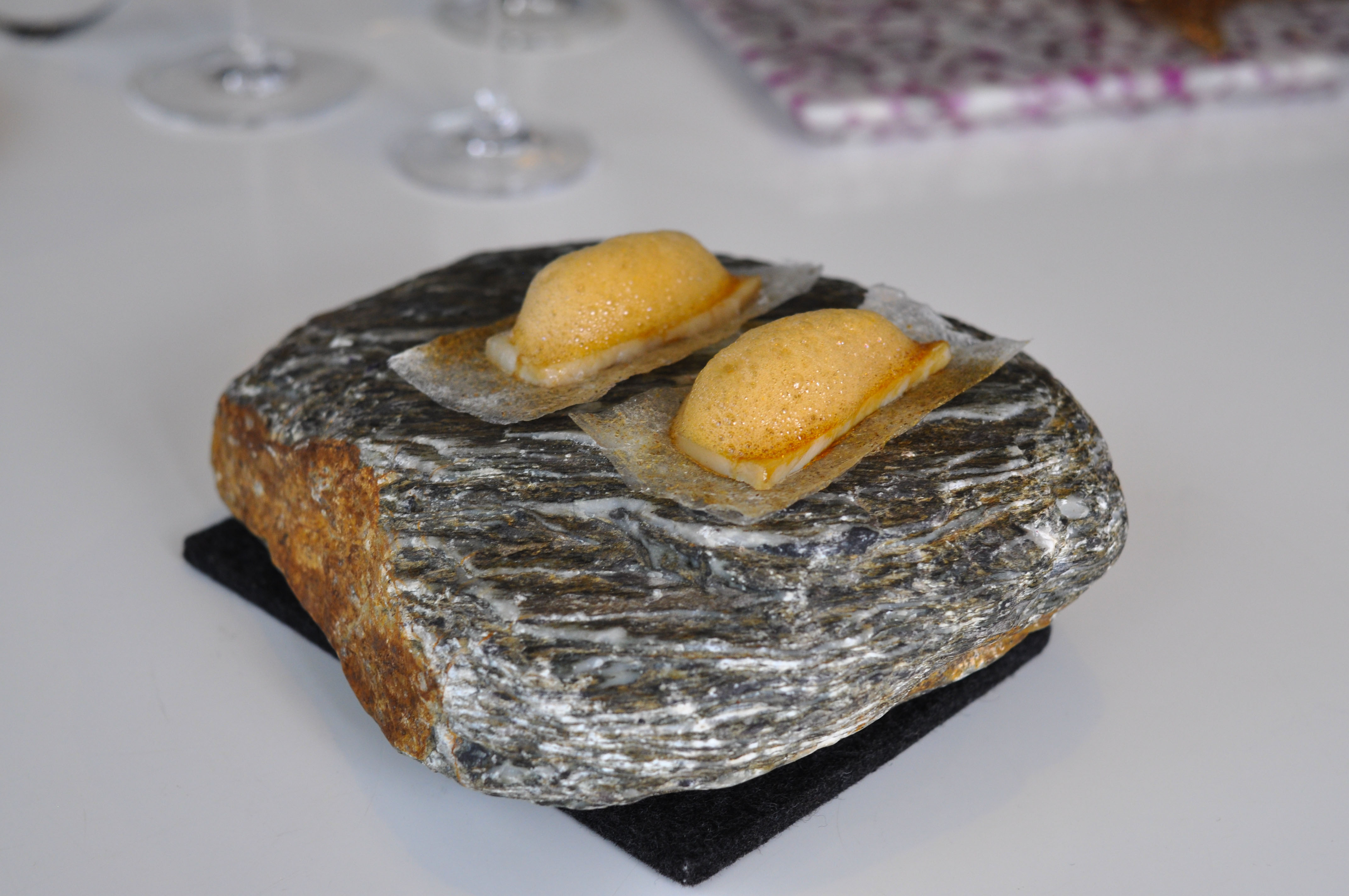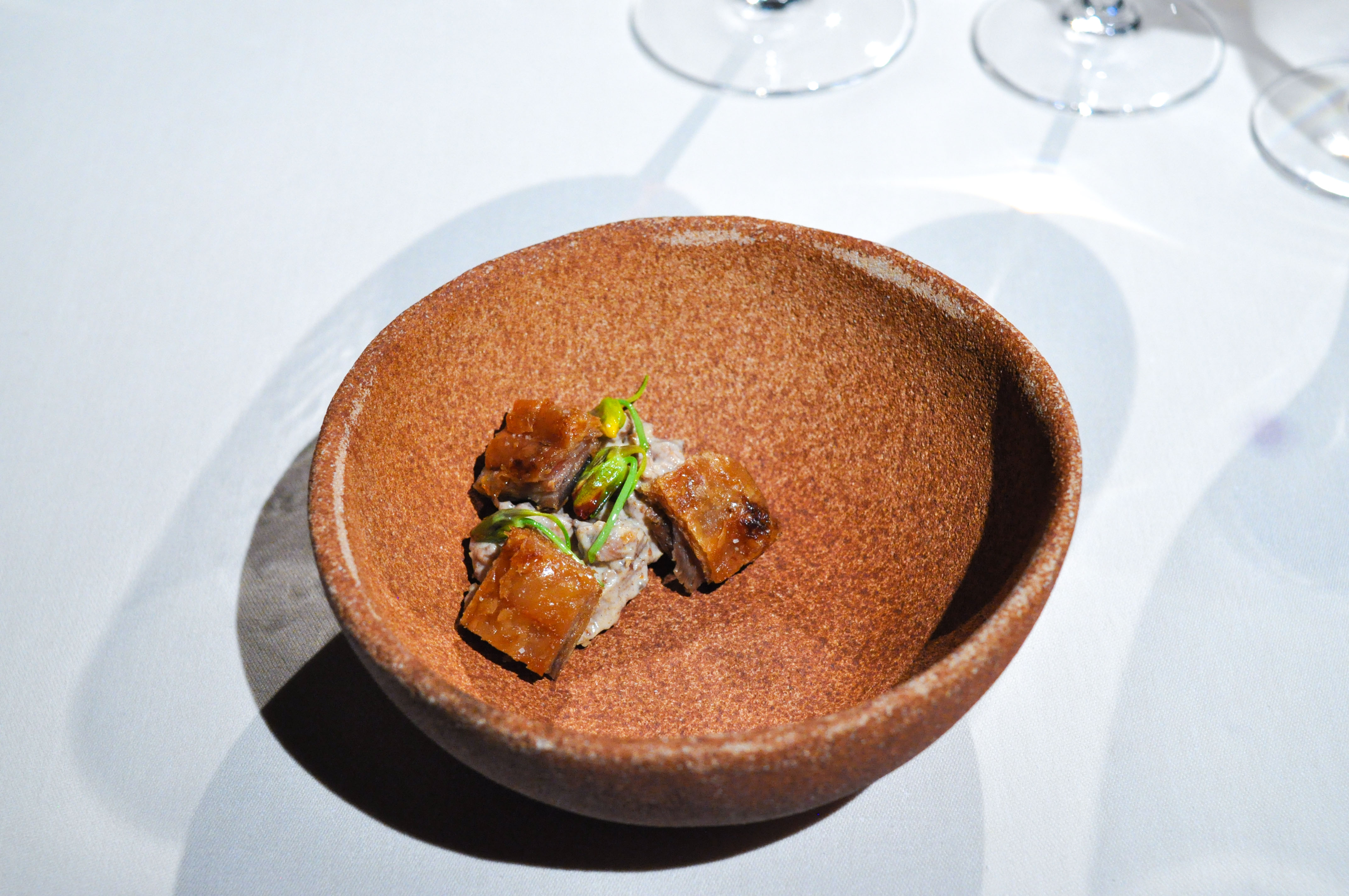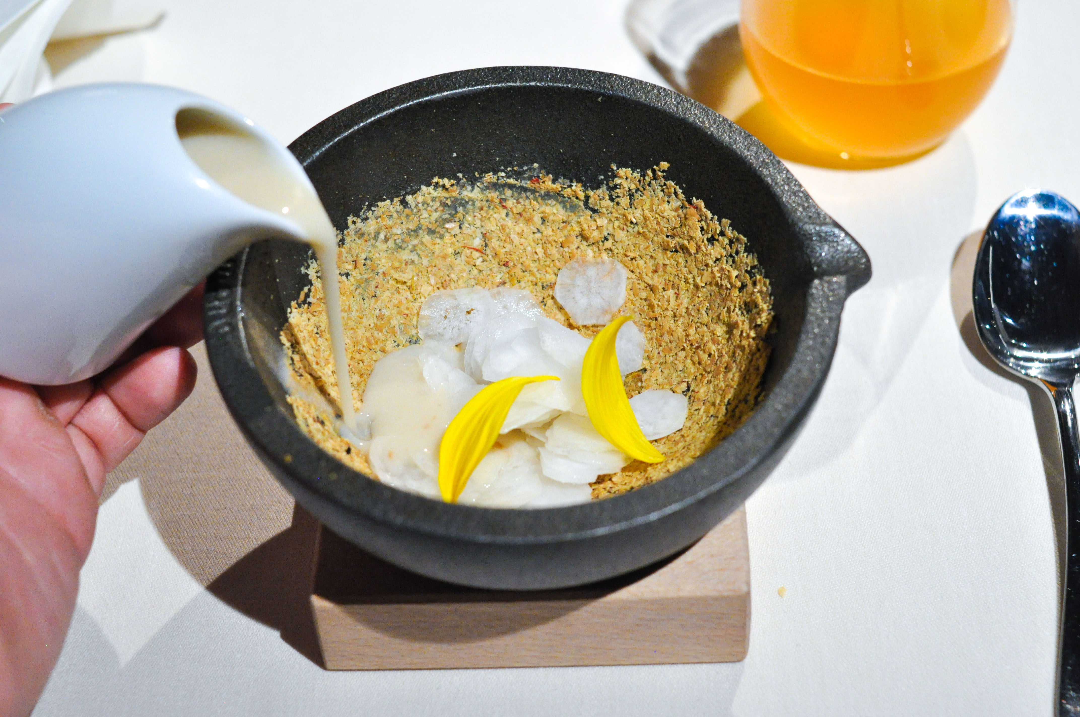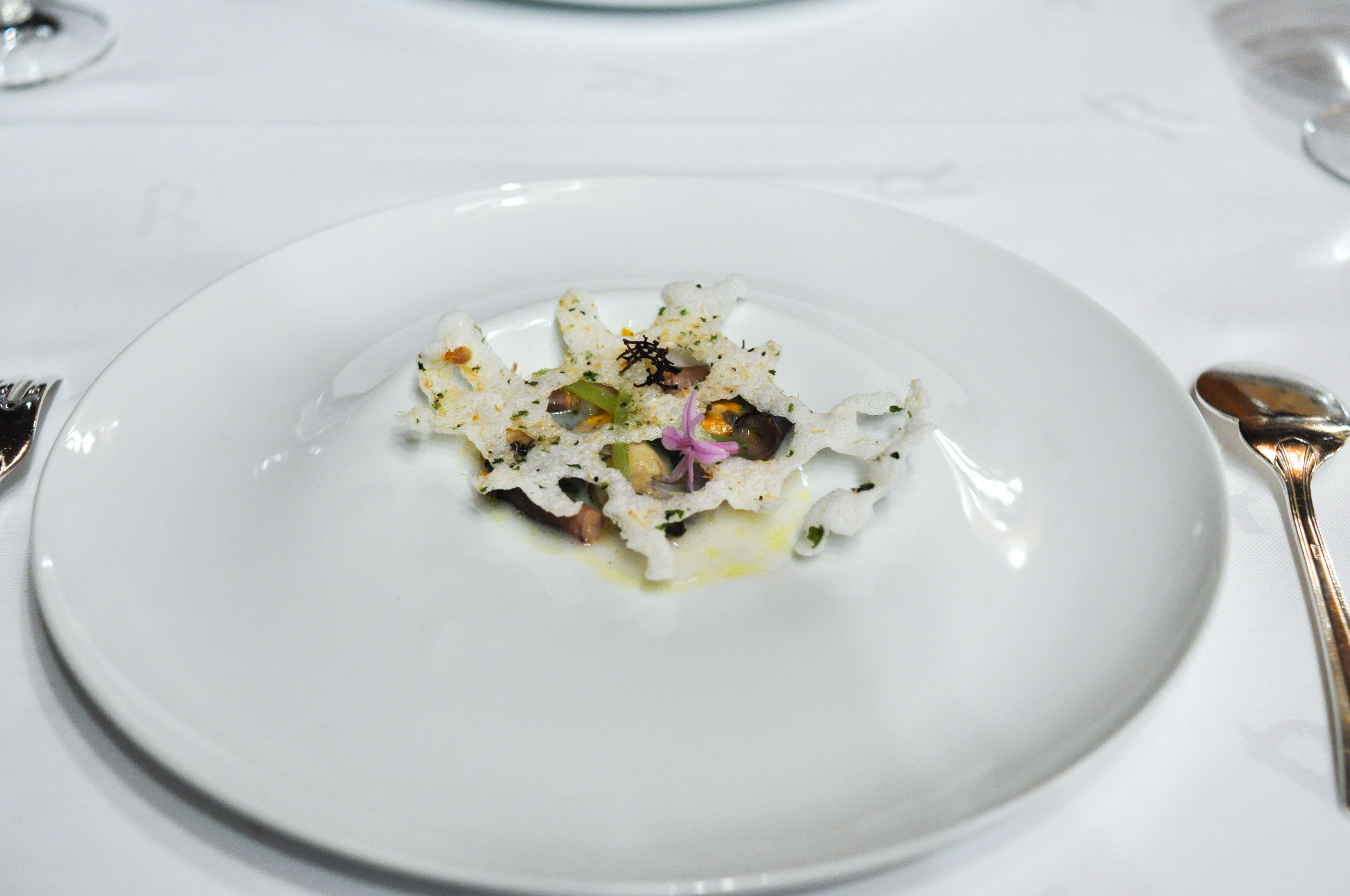 Mollusks in Fisherman’s net. A small selection of supple mollusks cooked over charcoal fire. With rice and borage cream and a rice cracker ‘net’ that tasted like the sea as well. The garlic flower had a nice spice.