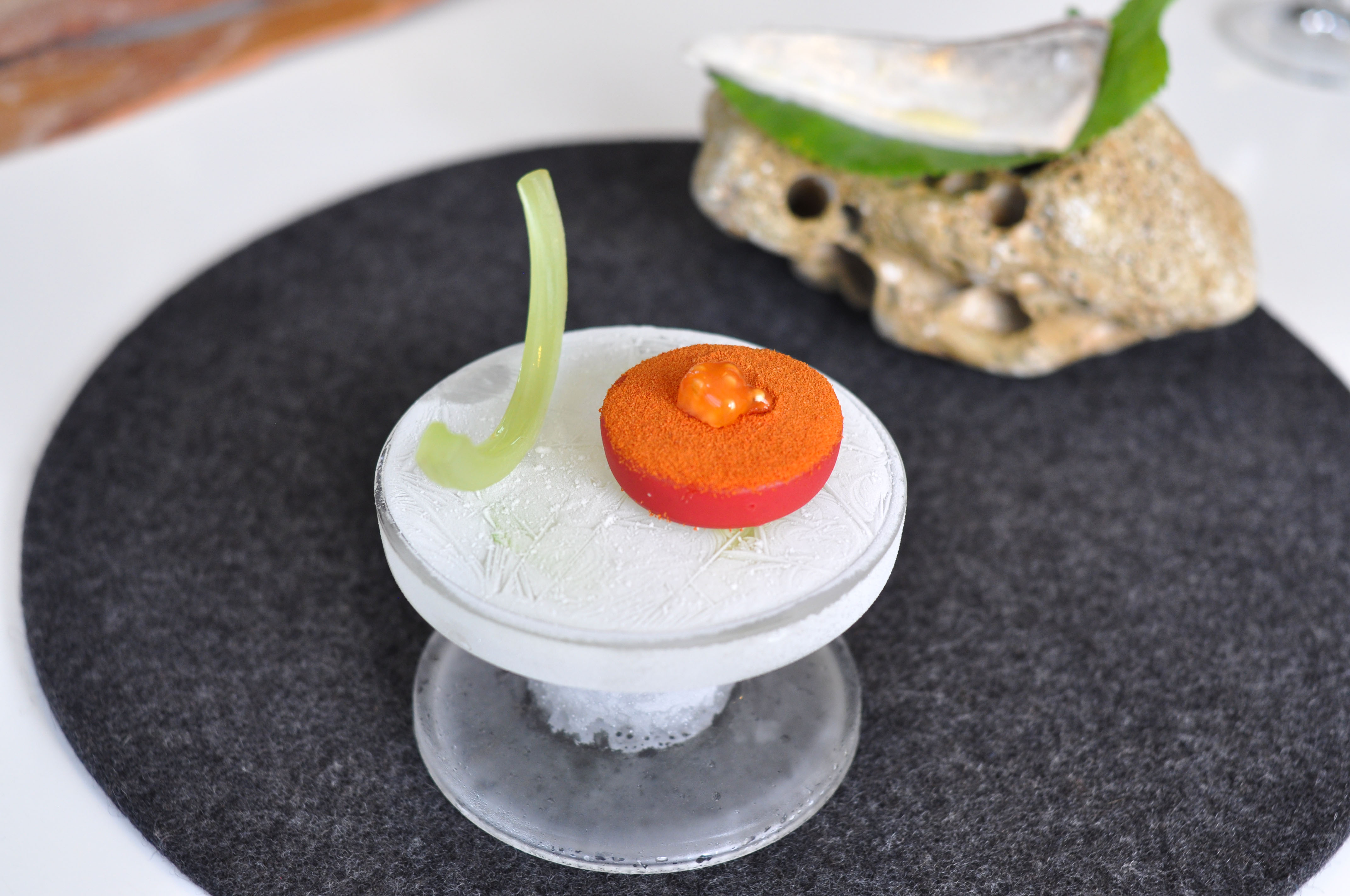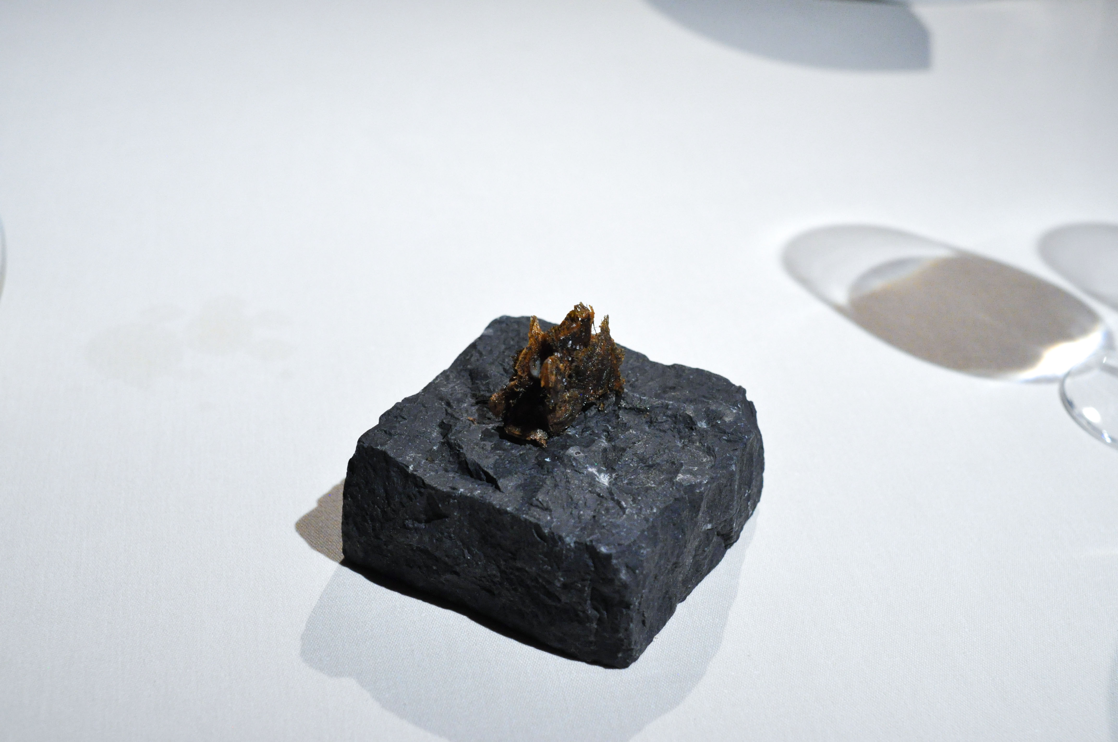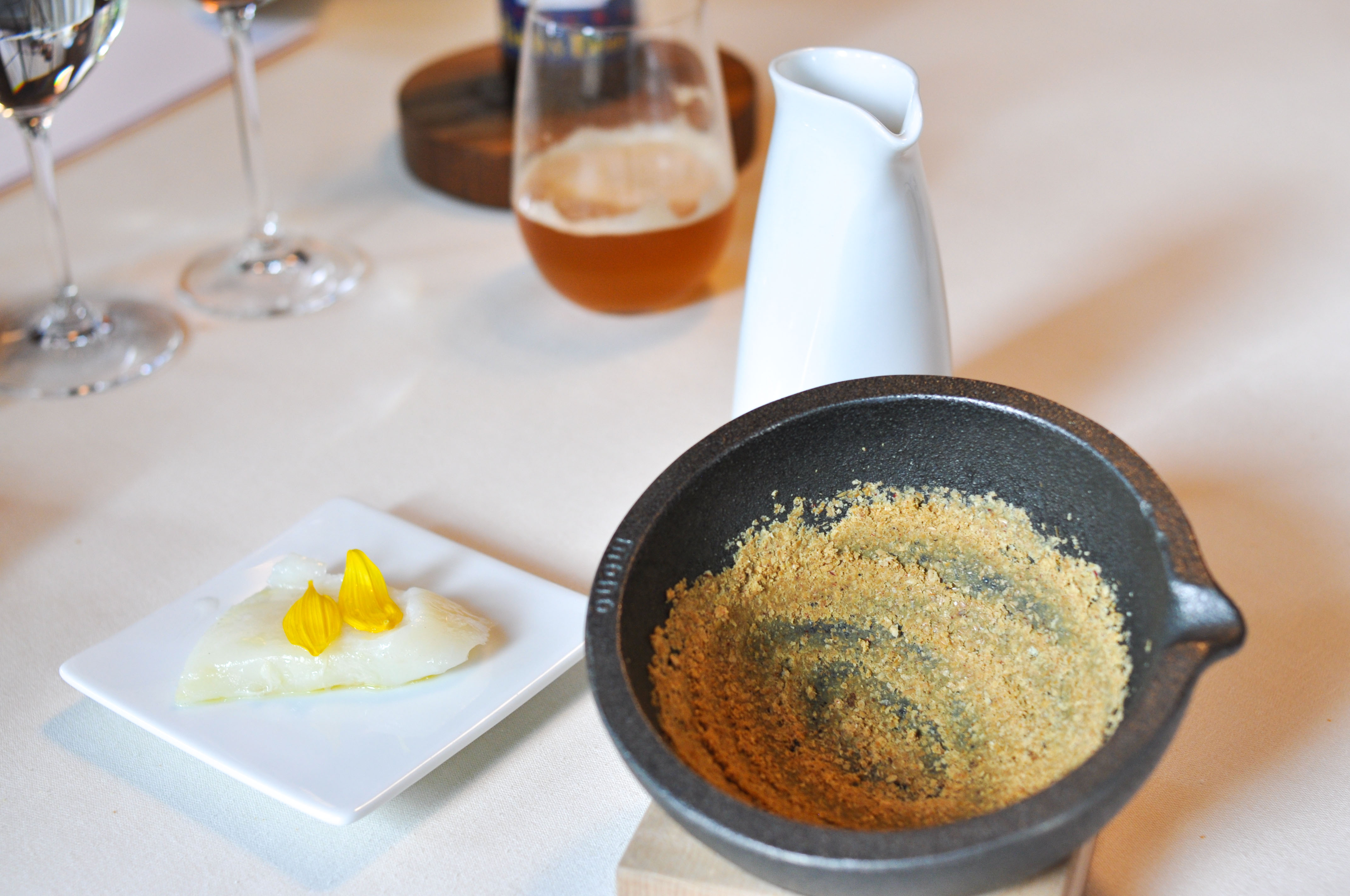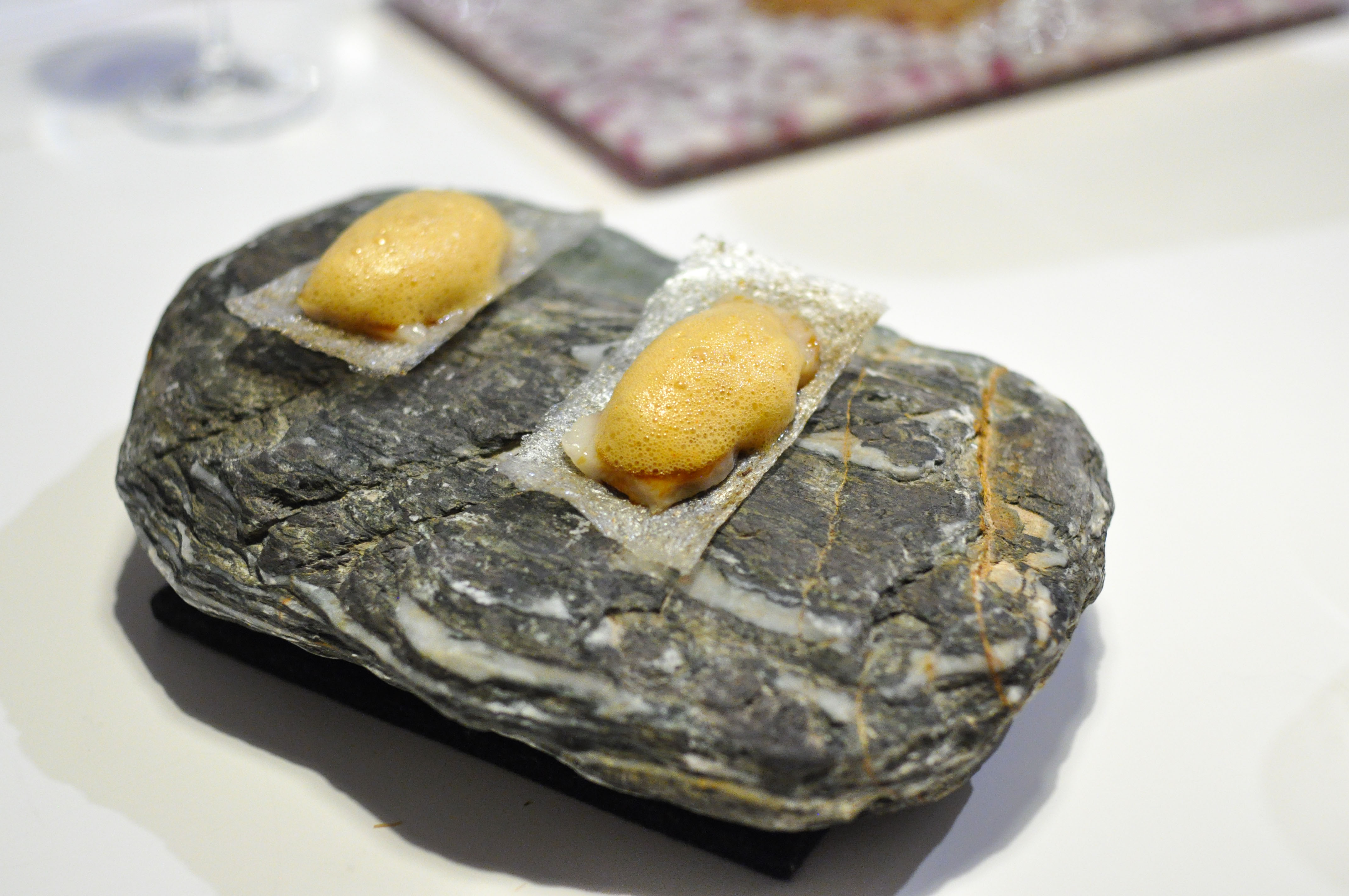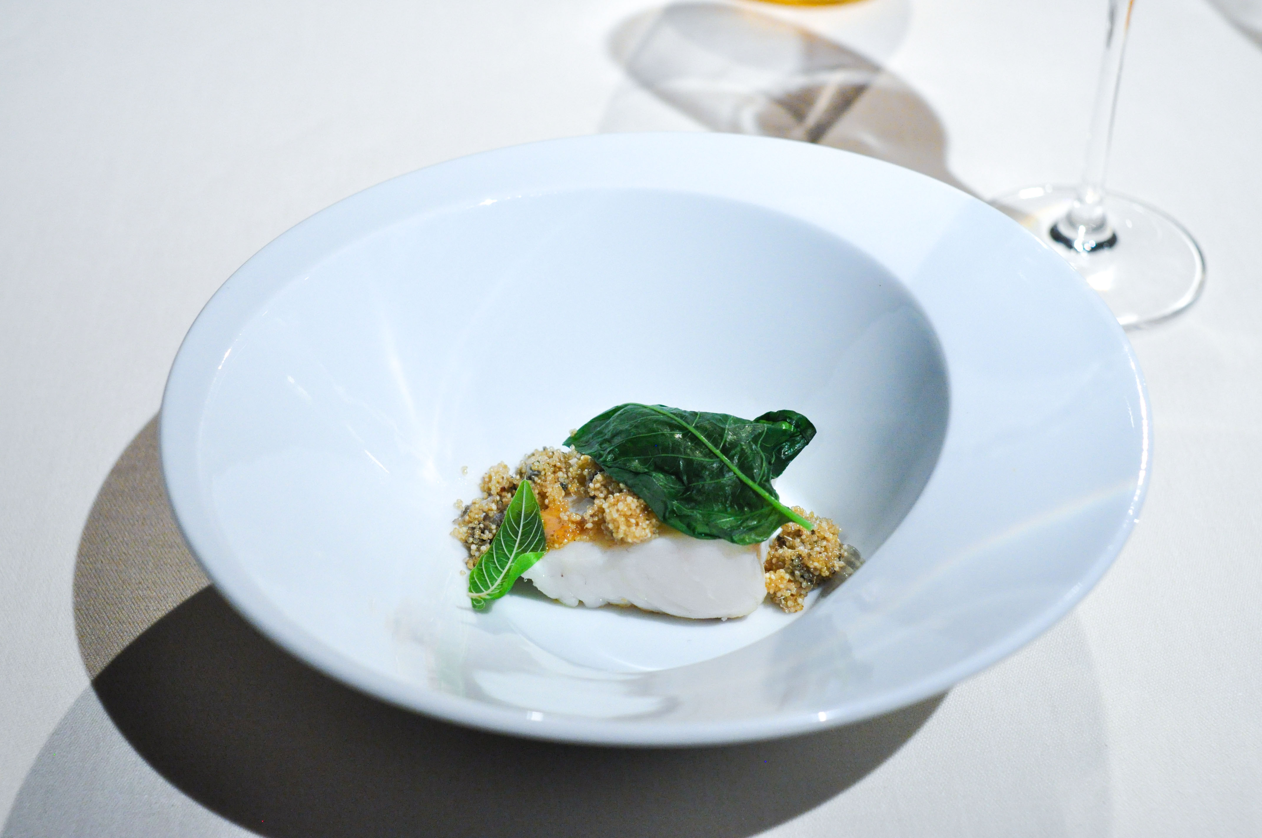 Mollusks in Fisherman’s net. A small selection of supple mollusks cooked over charcoal fire. With rice and borage cream and a rice cracker ‘net’ that tasted like the sea as well. The garlic flower had a nice spice.