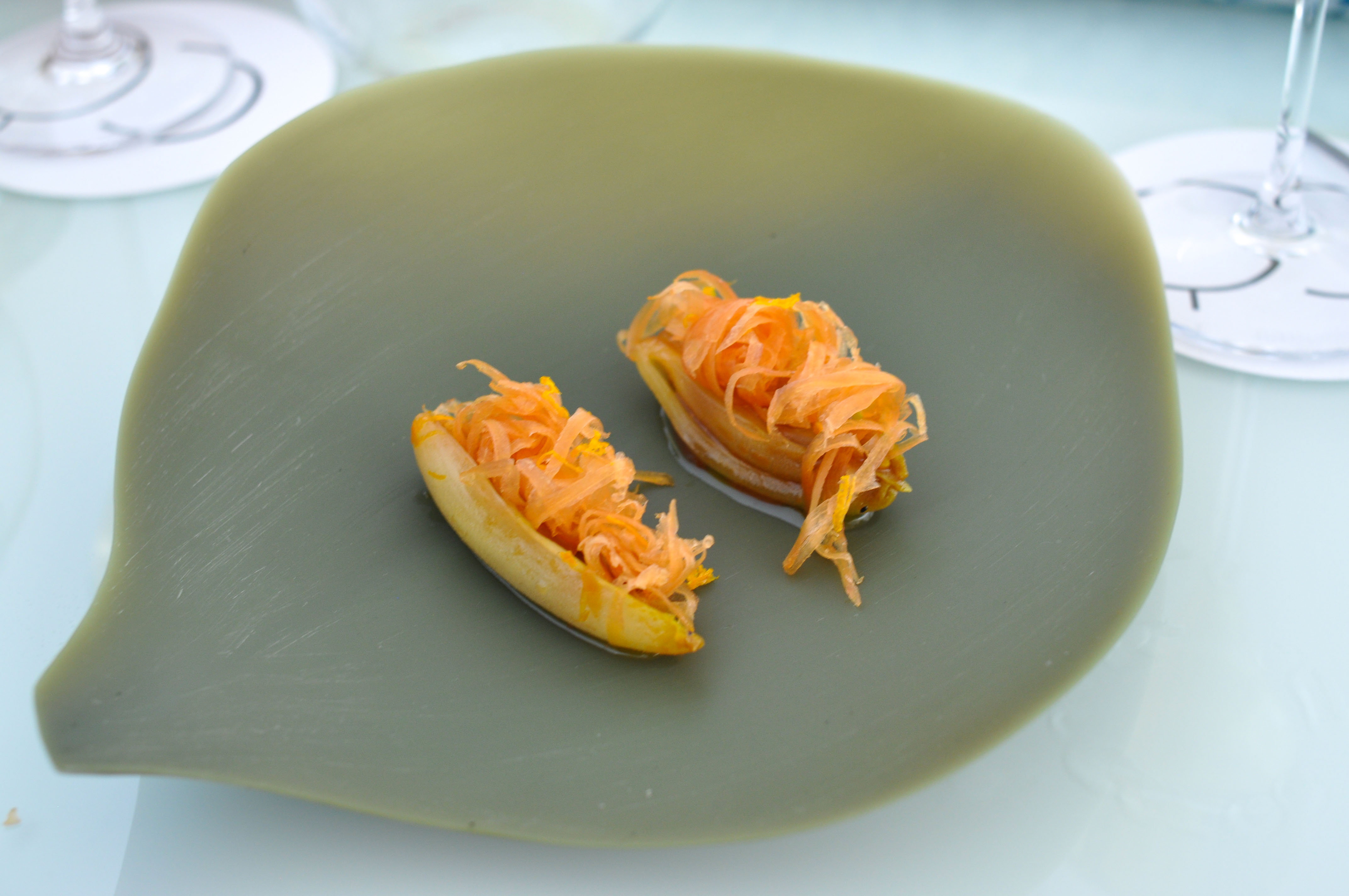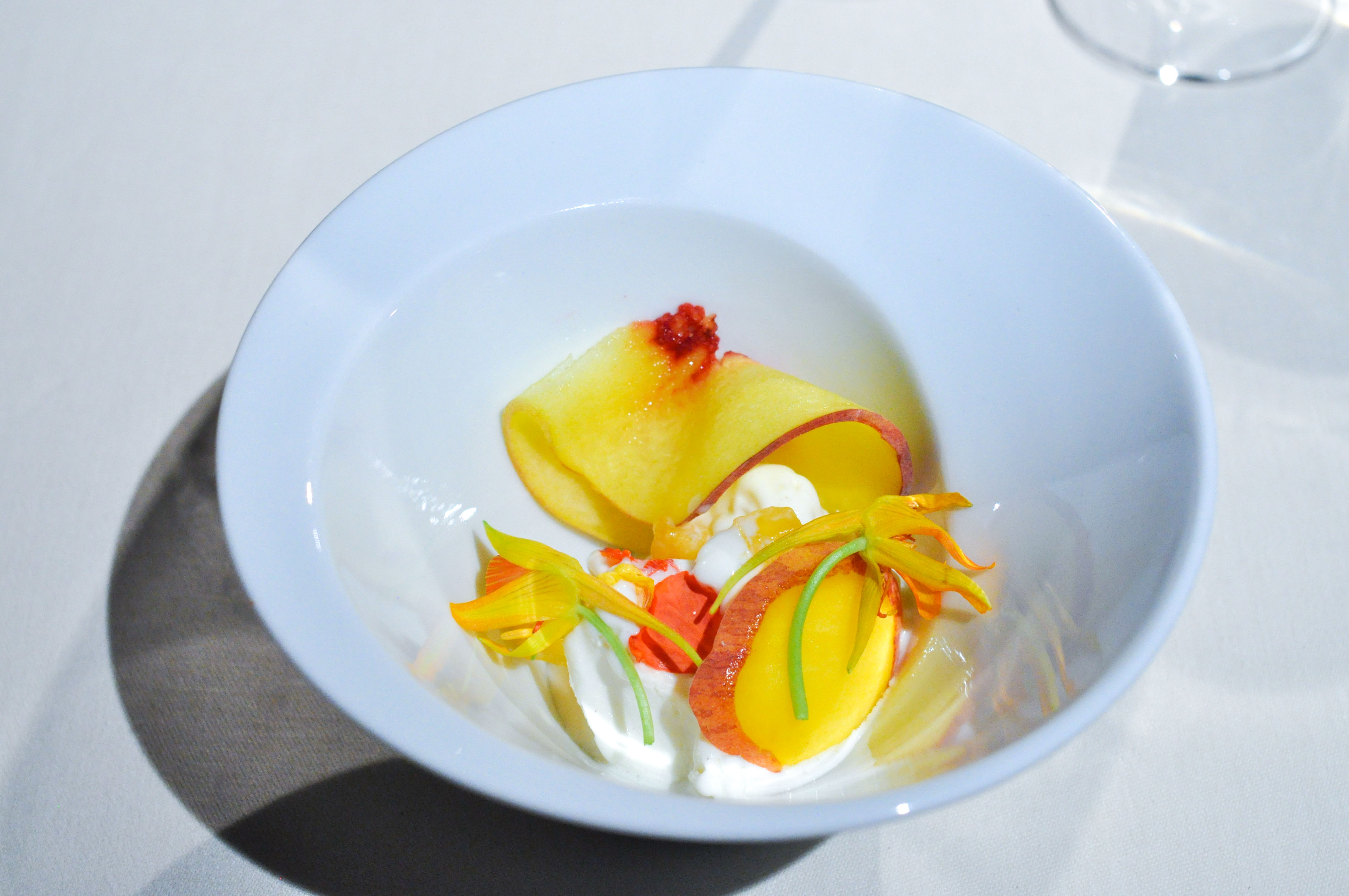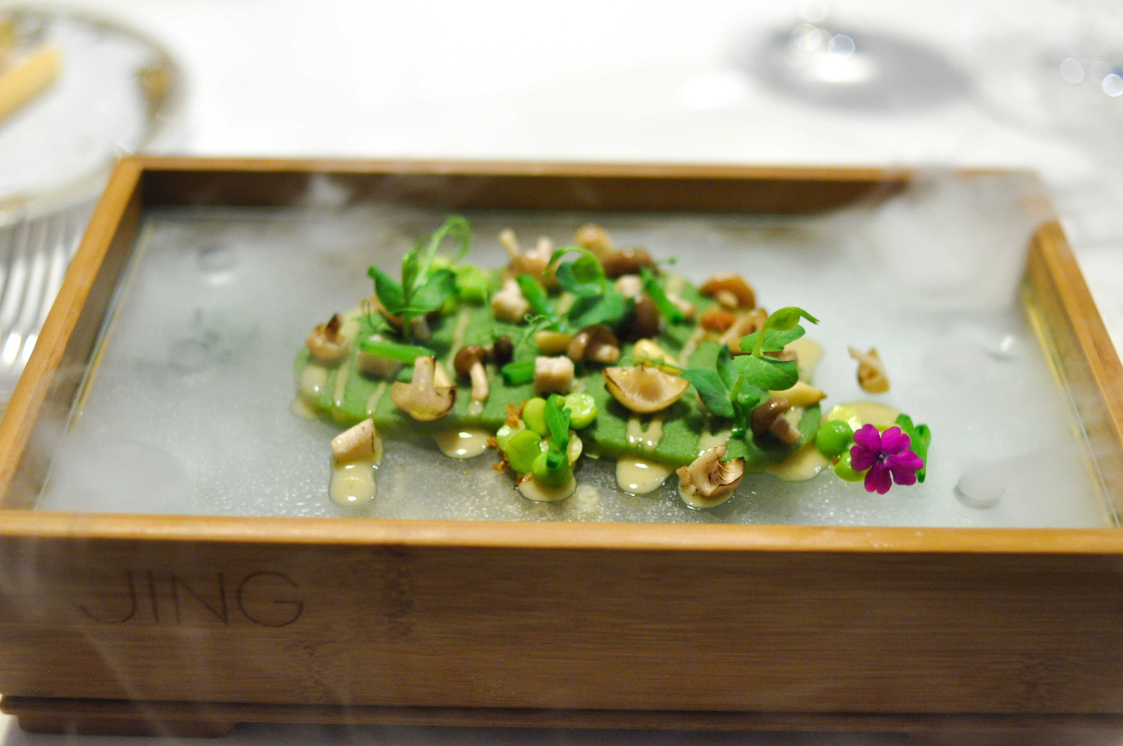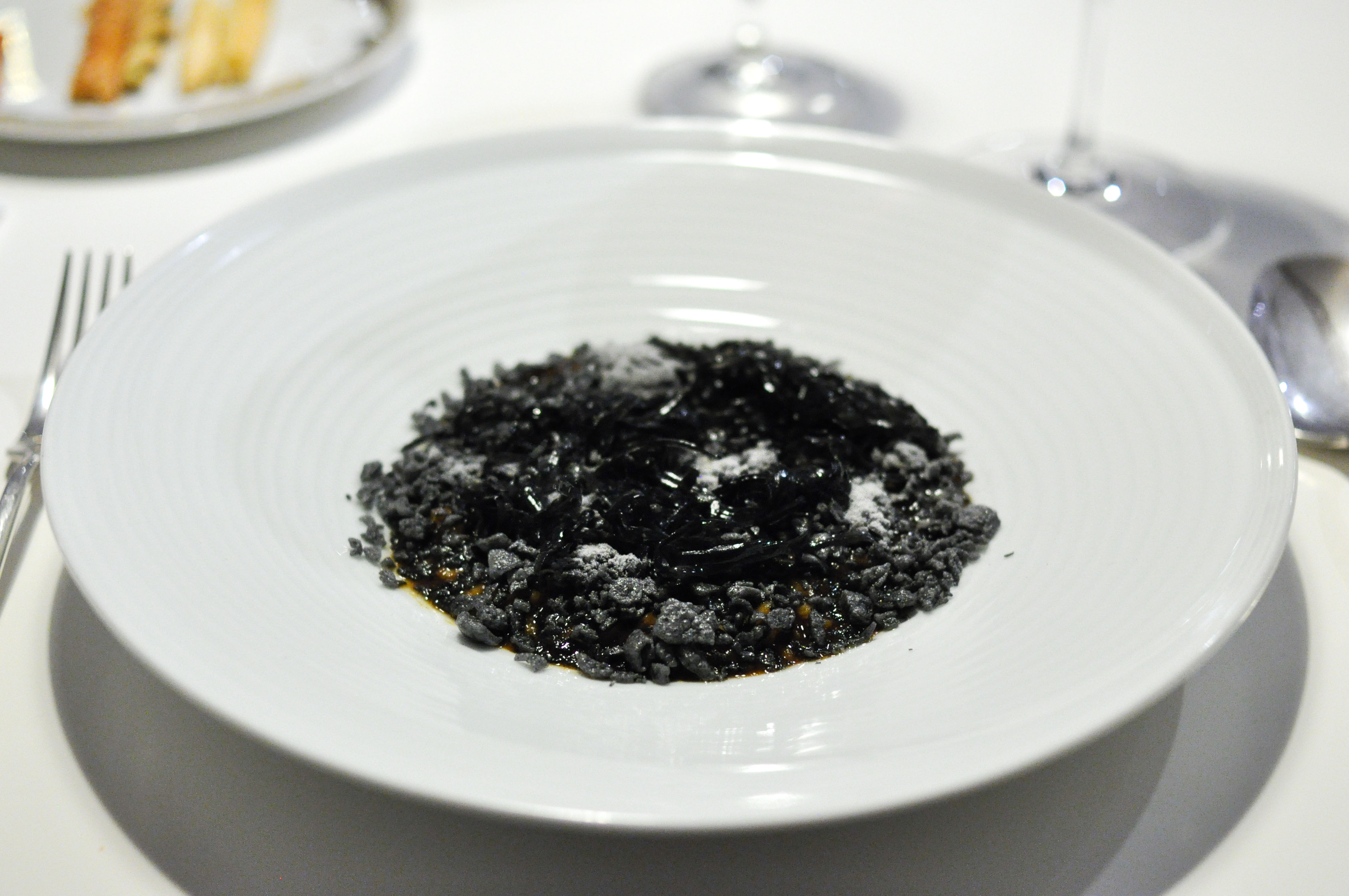 Mollusks in Fisherman’s net. A small selection of supple mollusks cooked over charcoal fire. With rice and borage cream and a rice cracker ‘net’ that tasted like the sea as well. The garlic flower had a nice spice.