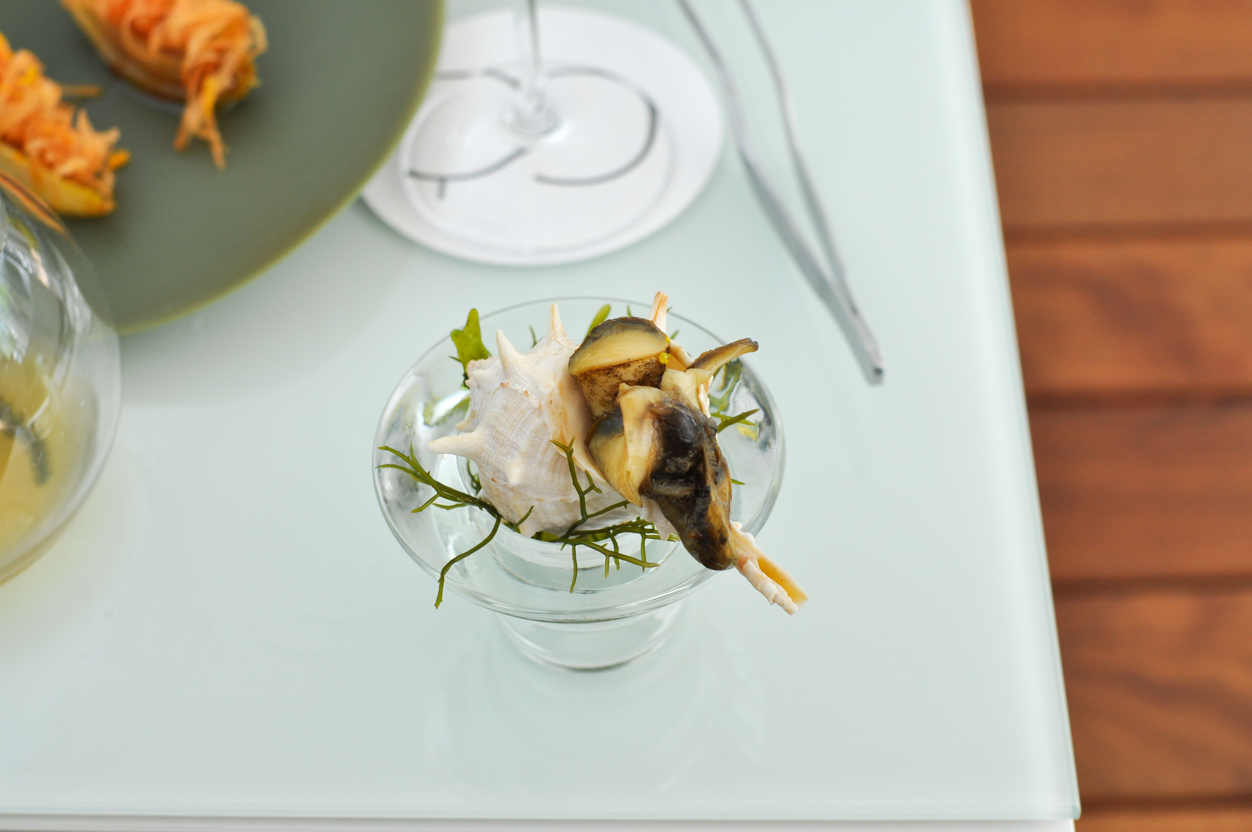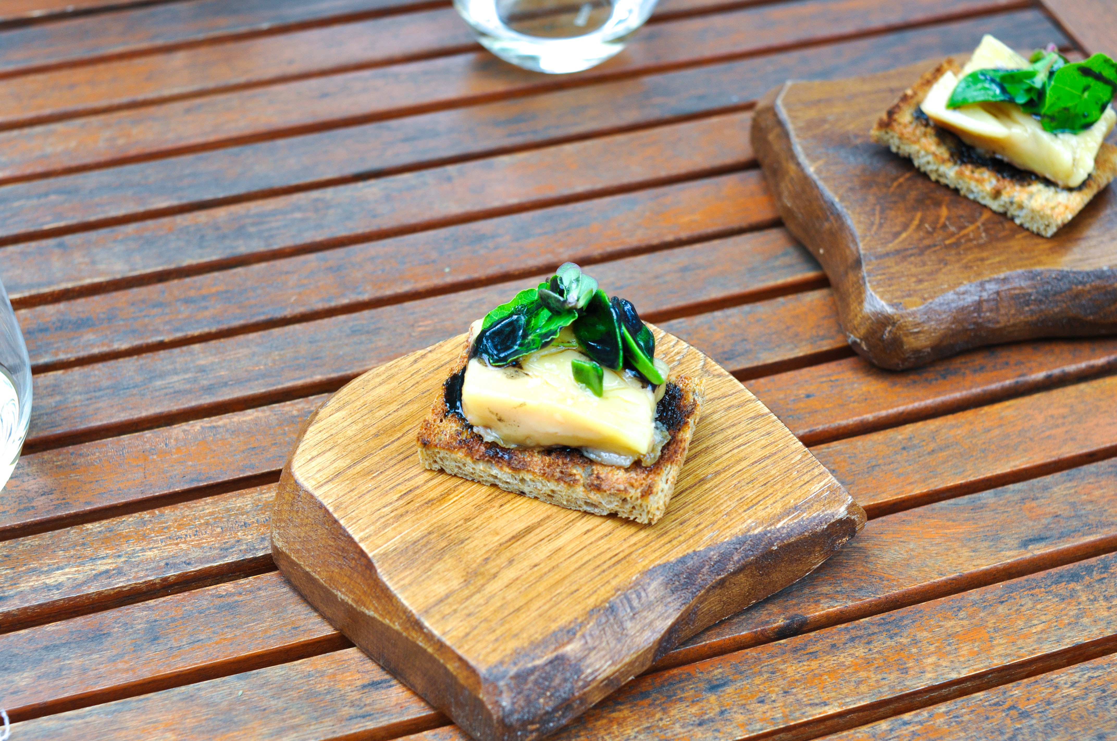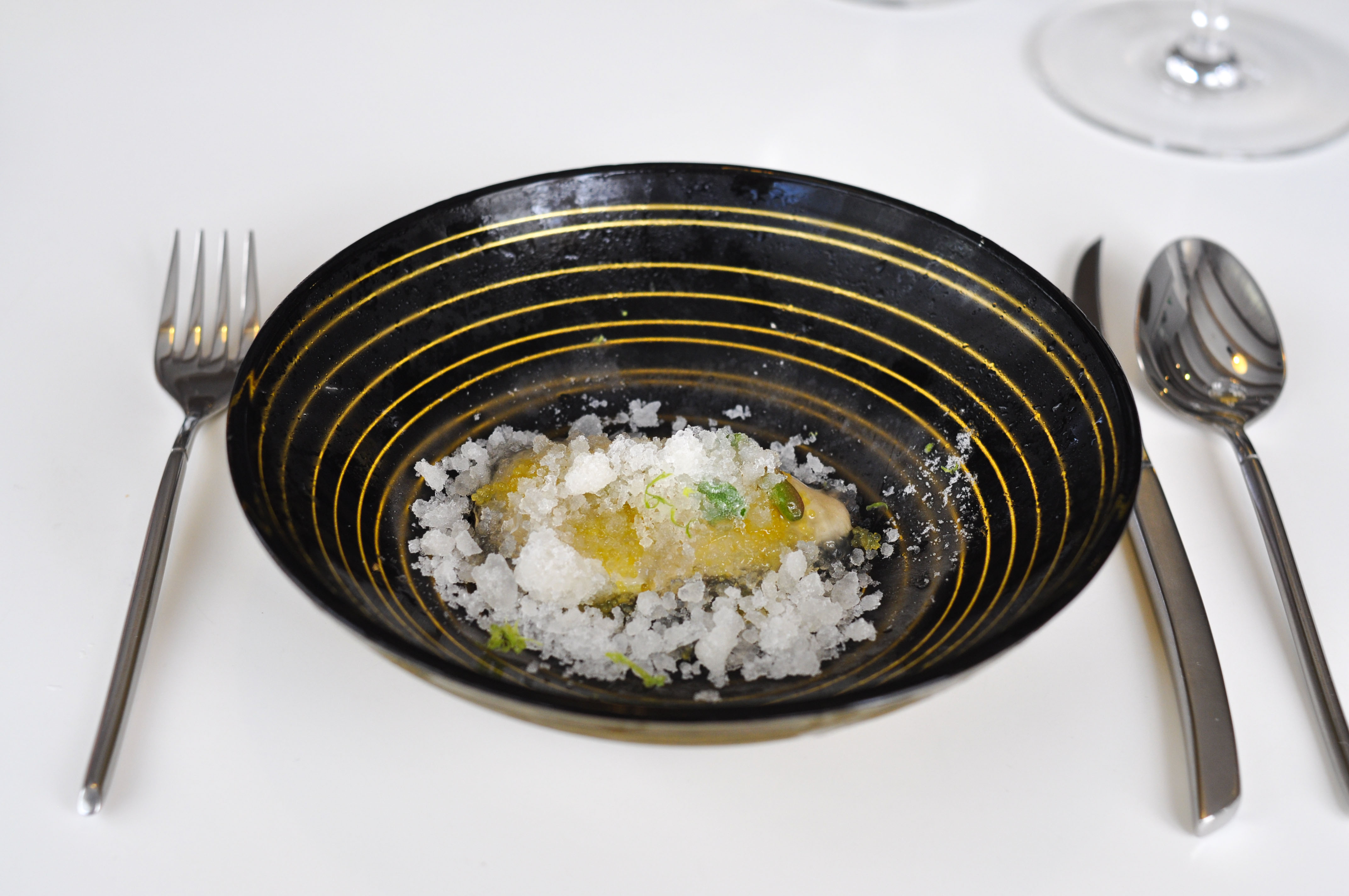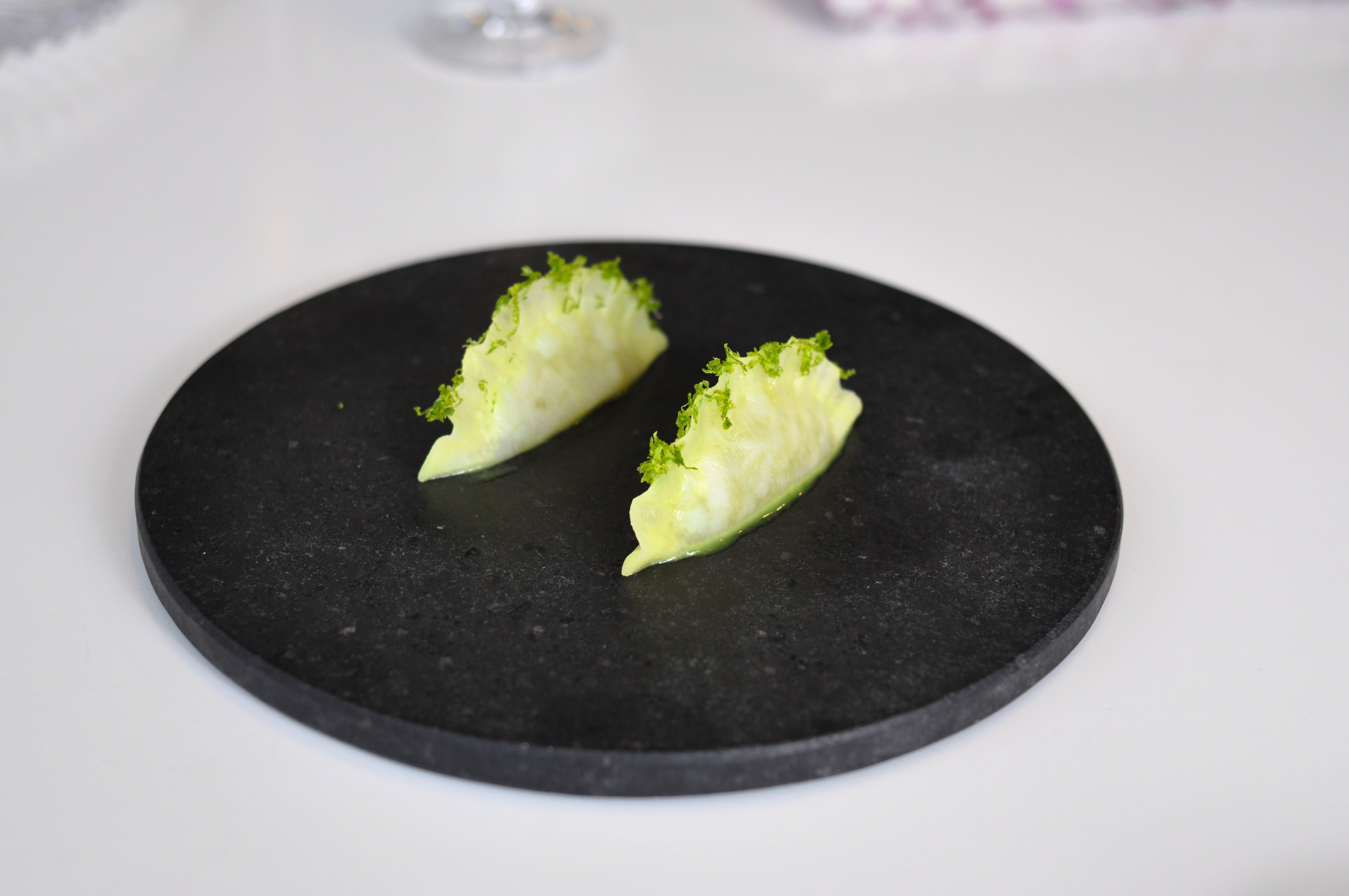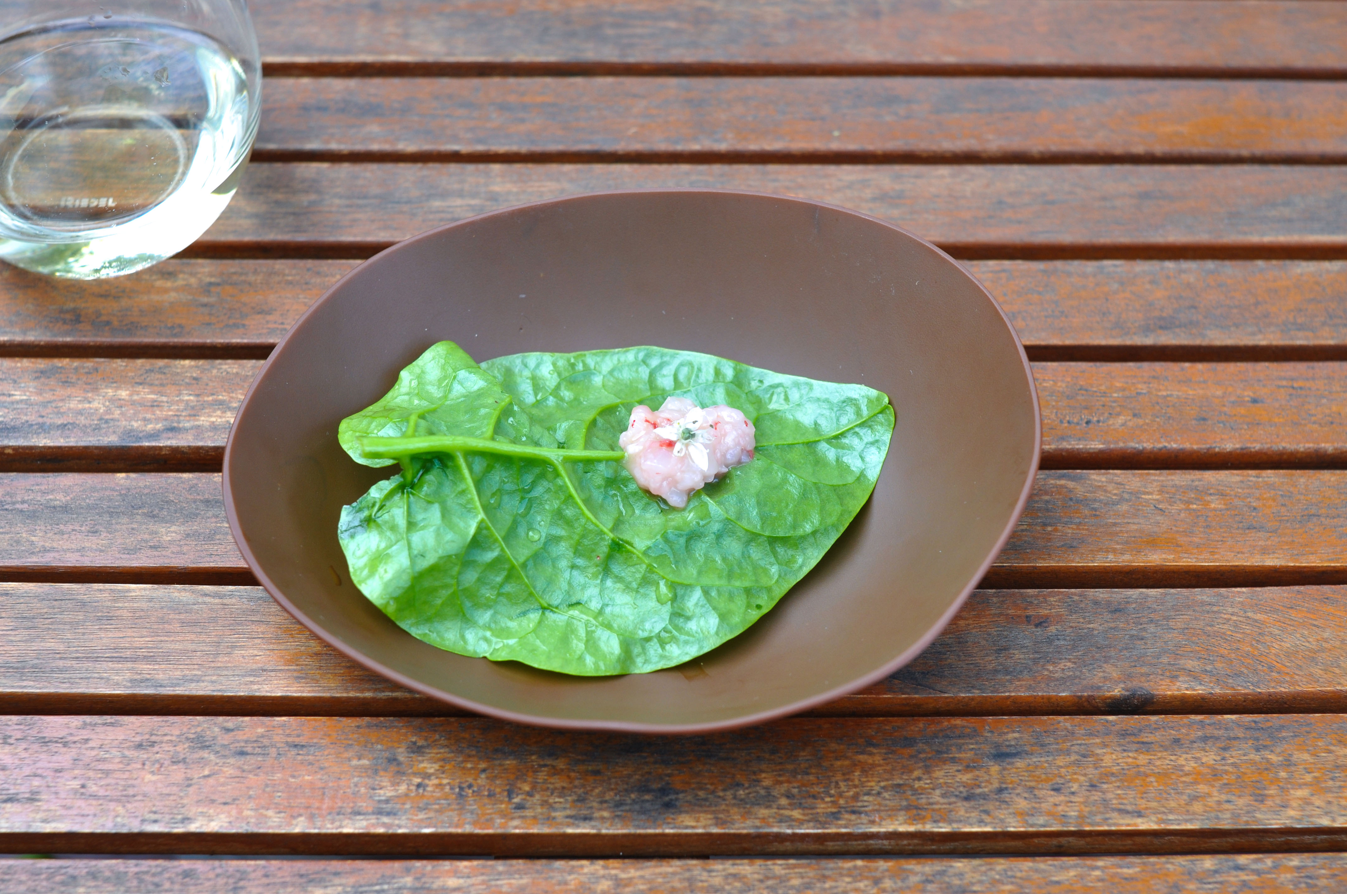 Mollusks in Fisherman’s net. A small selection of supple mollusks cooked over charcoal fire. With rice and borage cream and a rice cracker ‘net’ that tasted like the sea as well. The garlic flower had a nice spice.