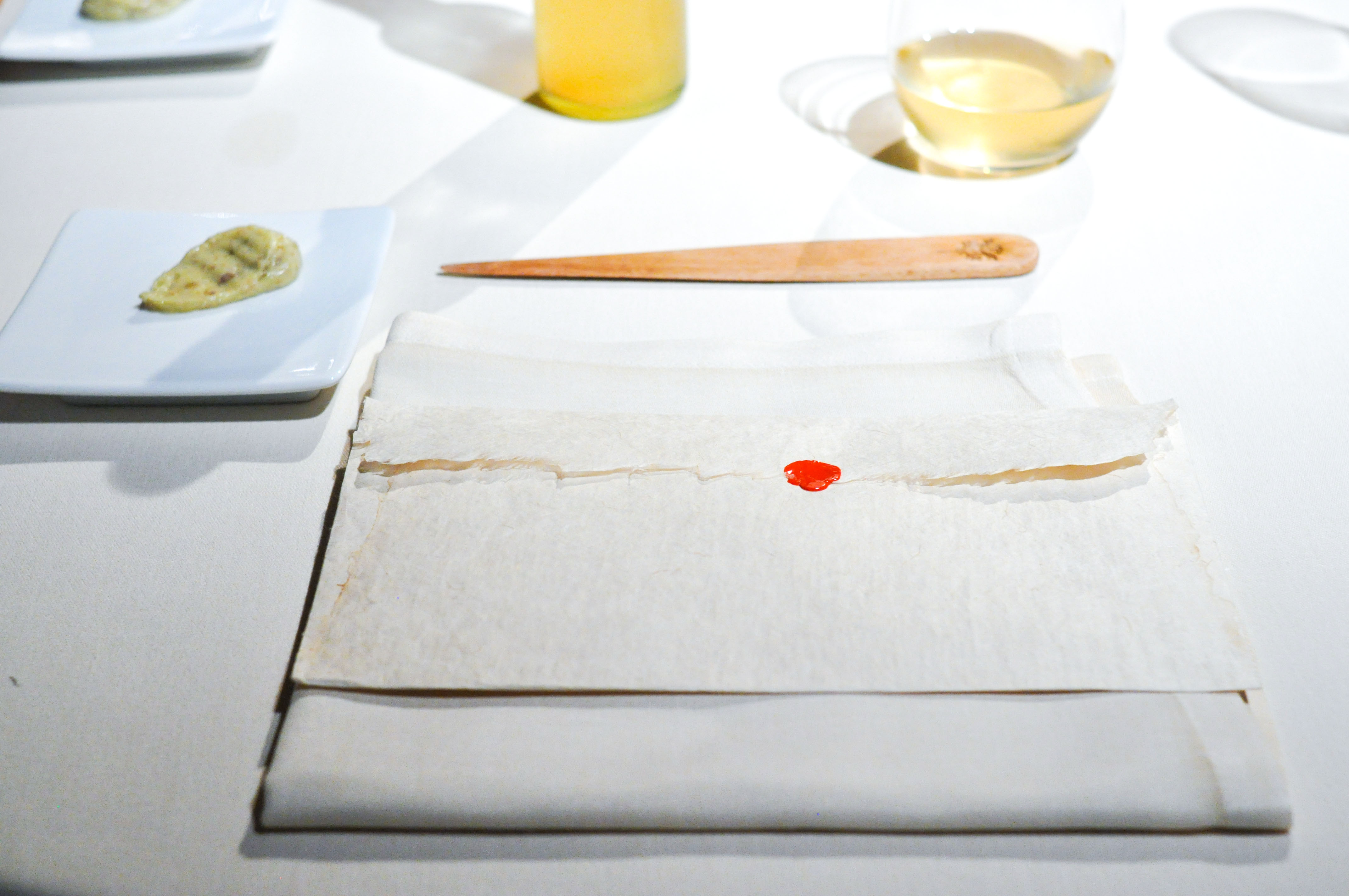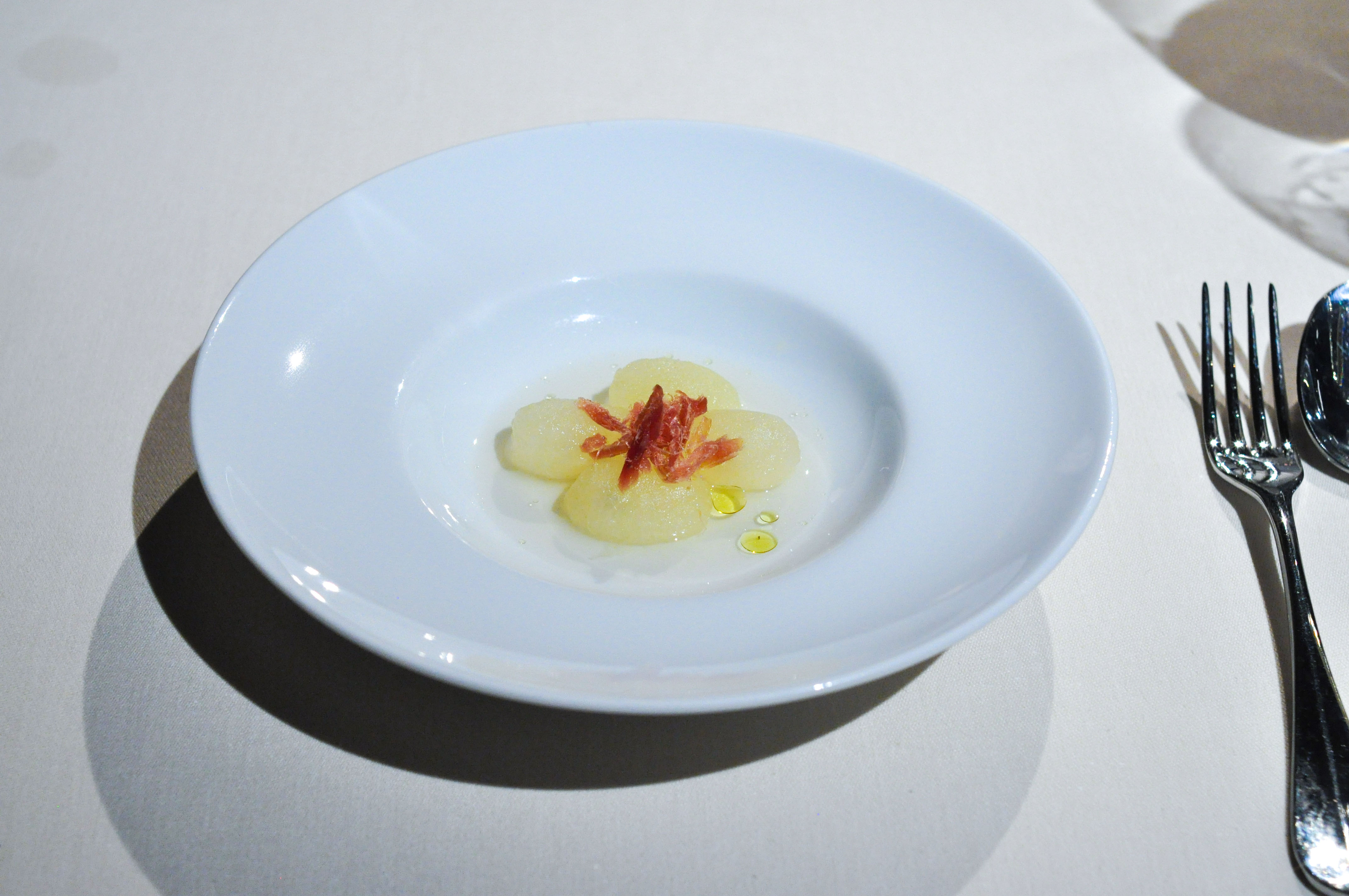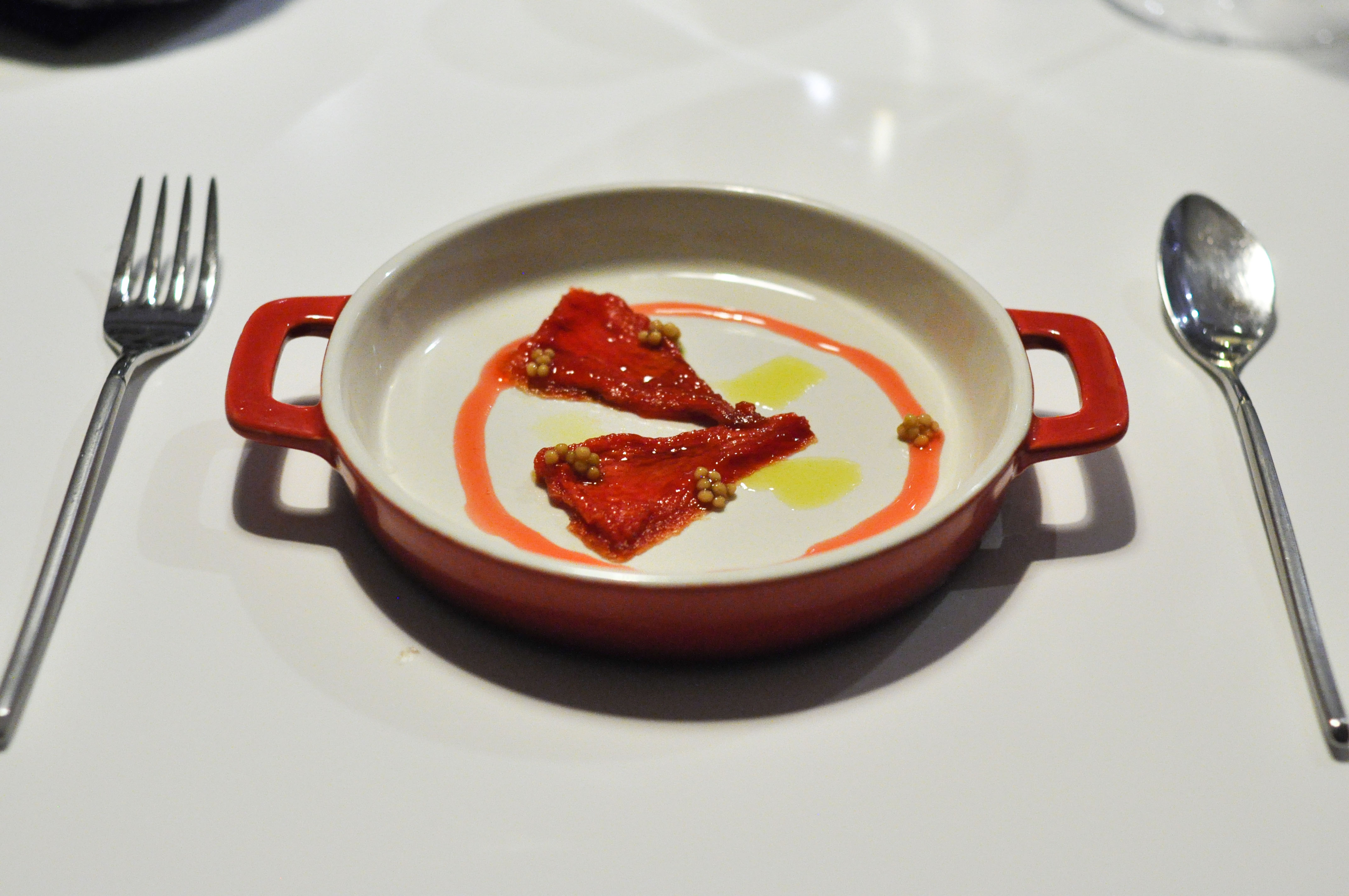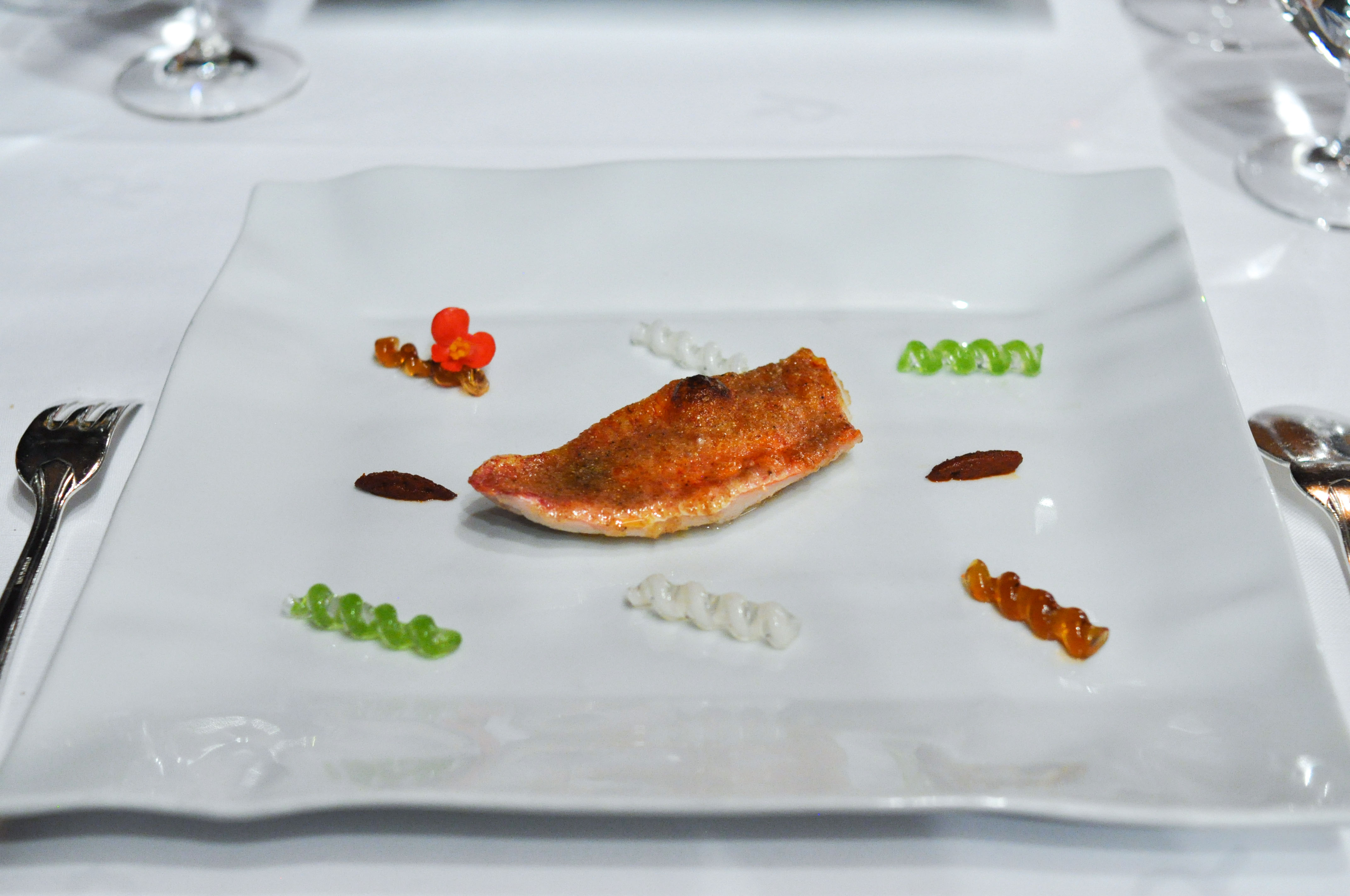 Whole-Grain Red Mullet with Sauce “Fusili”. A flakey fillet of Red Mullet with a praline skin of head and bone served with a paste of liver and onion. Good stuff. The three sauces, parsley, soy, and ajo blanco, were fantastic, but I wish I didn’t have to eat the bland rubbery gelatin-like ‘fusili’ noodles to get to them.