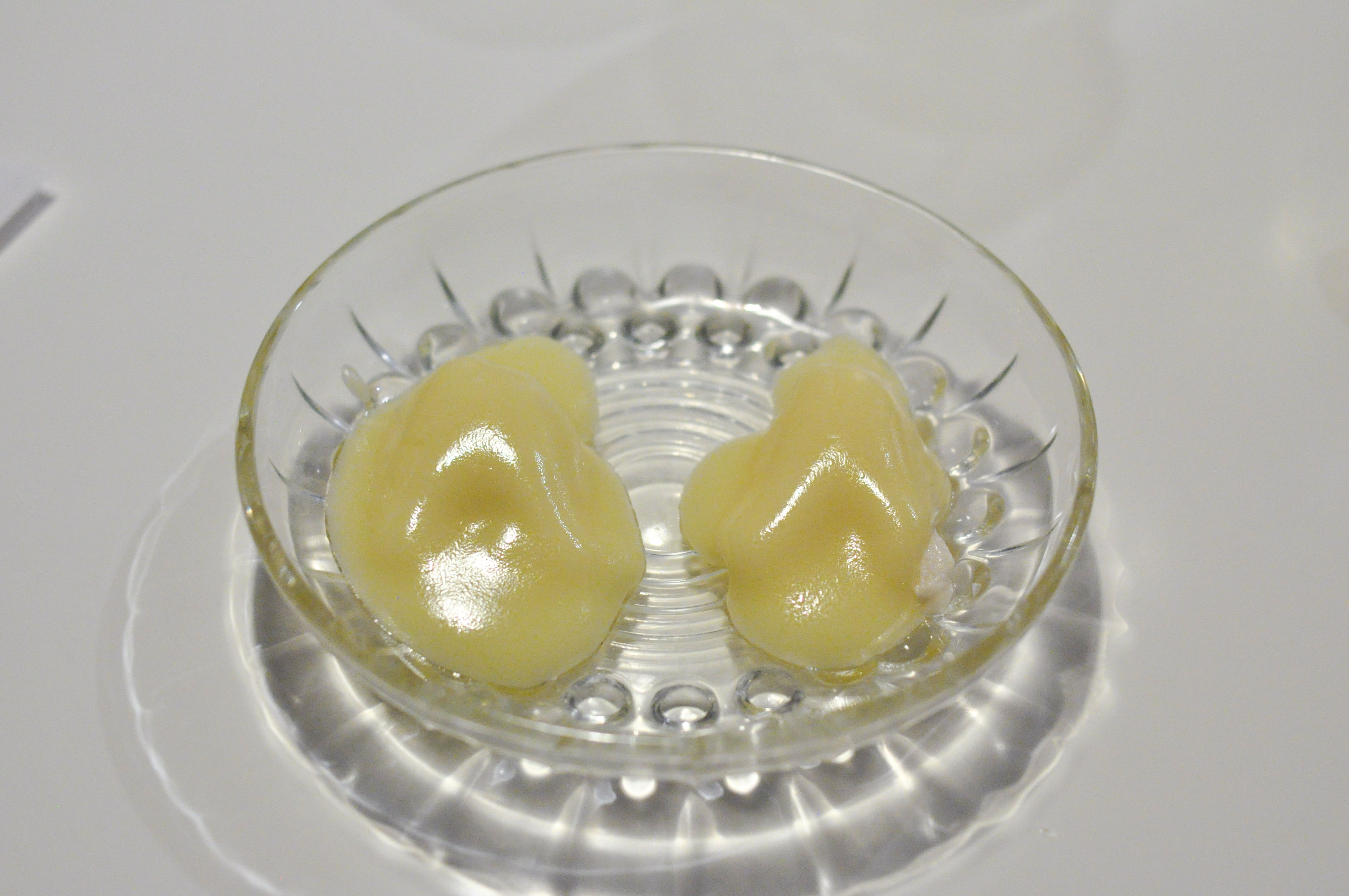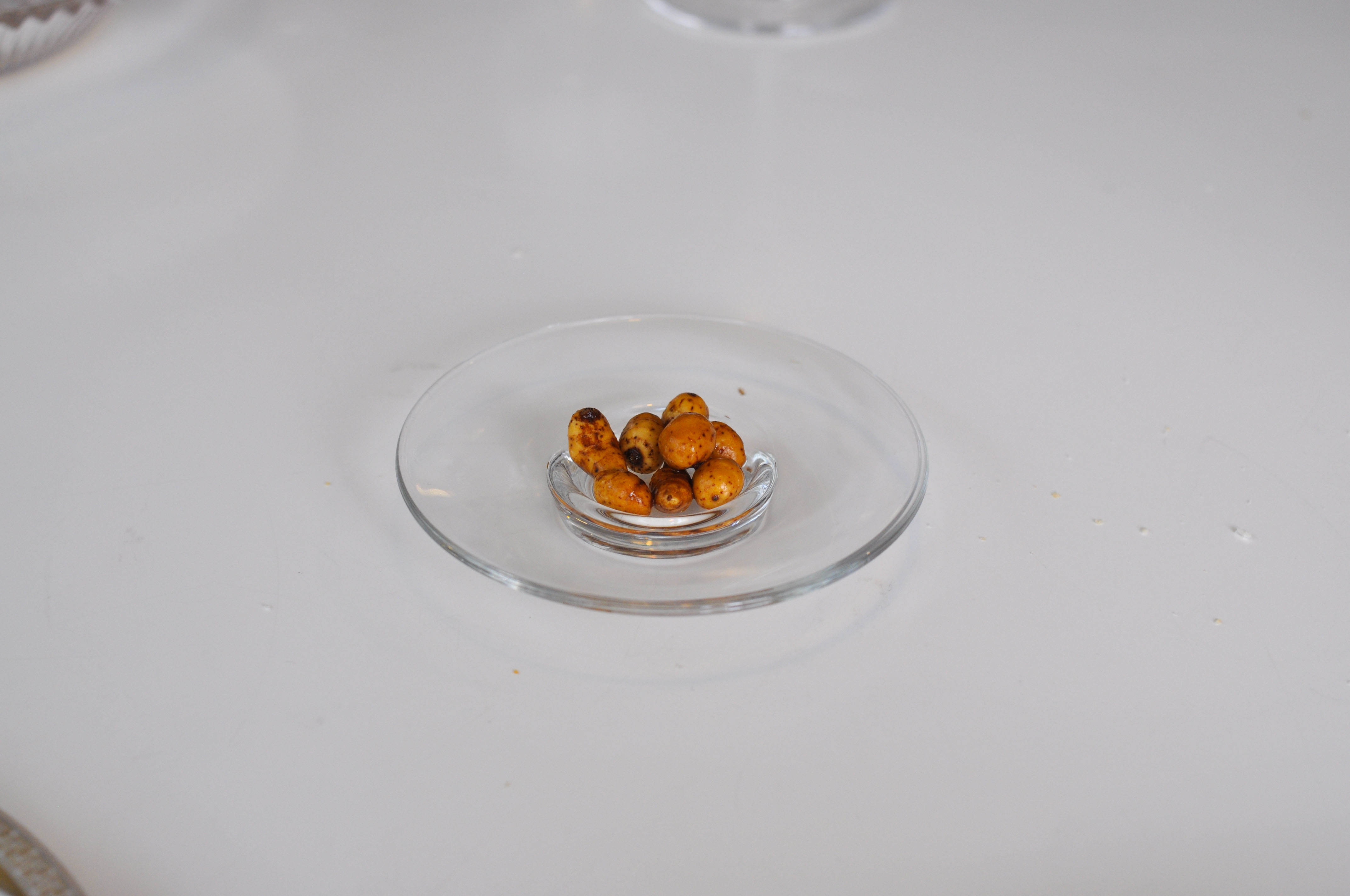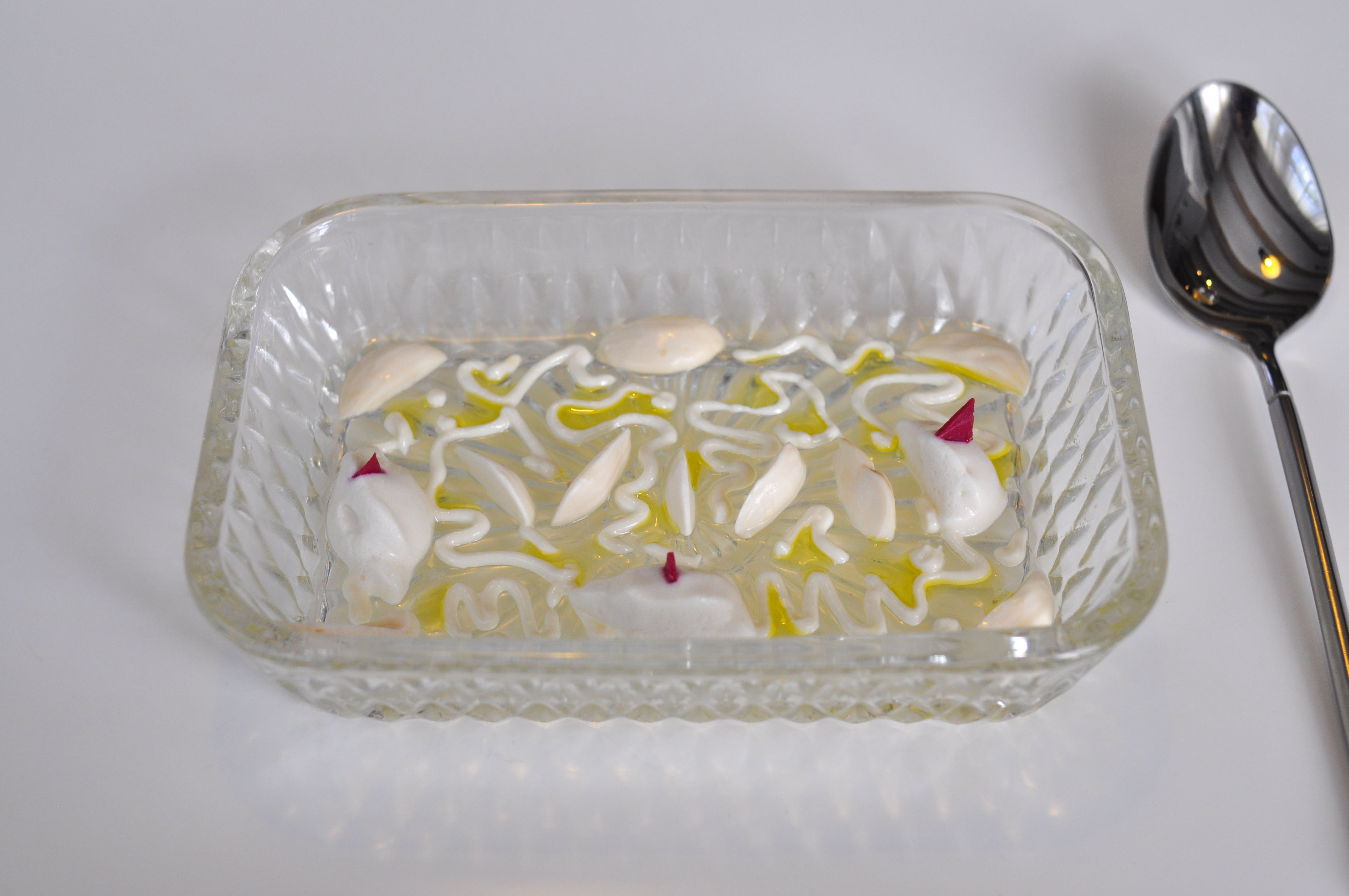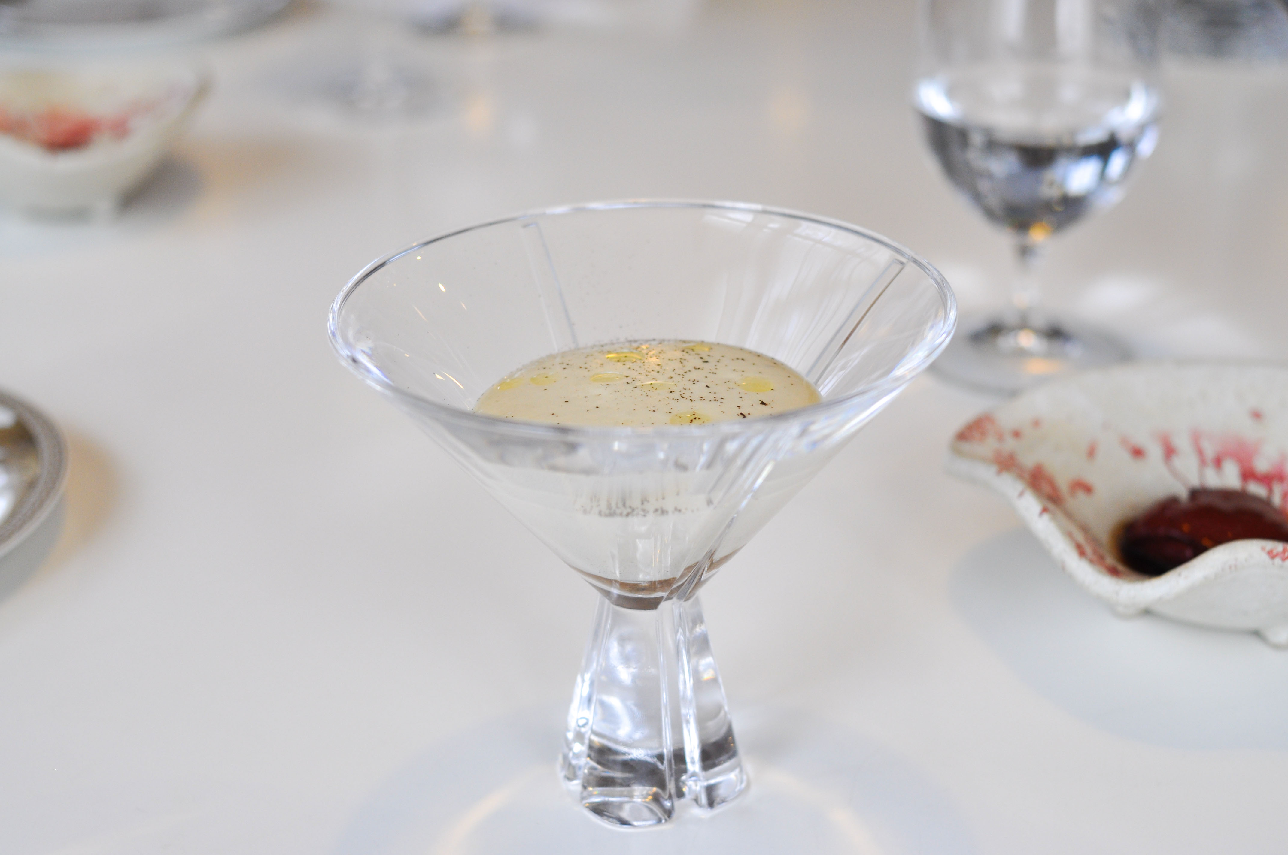 Whole-Grain Red Mullet with Sauce “Fusili”. A flakey fillet of Red Mullet with a praline skin of head and bone served with a paste of liver and onion. Good stuff. The three sauces, parsley, soy, and ajo blanco, were fantastic, but I wish I didn’t have to eat the bland rubbery gelatin-like ‘fusili’ noodles to get to them.