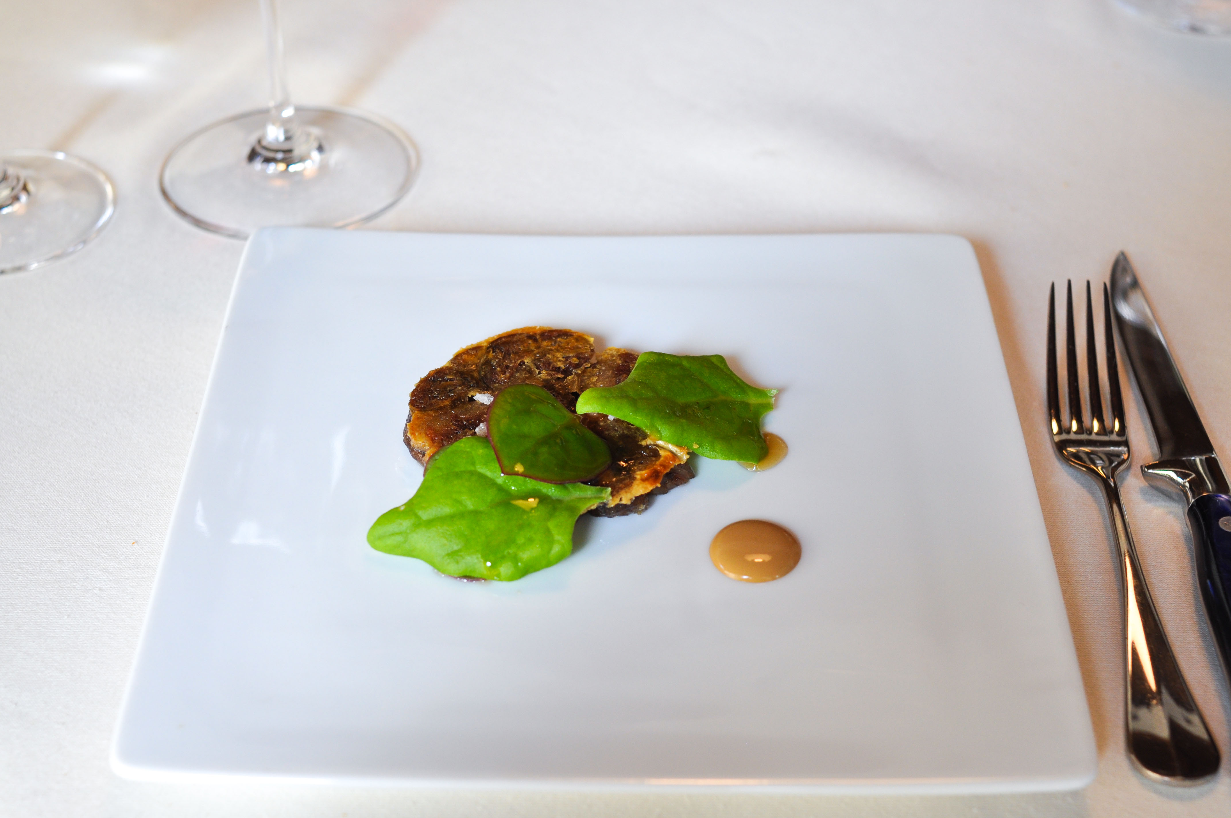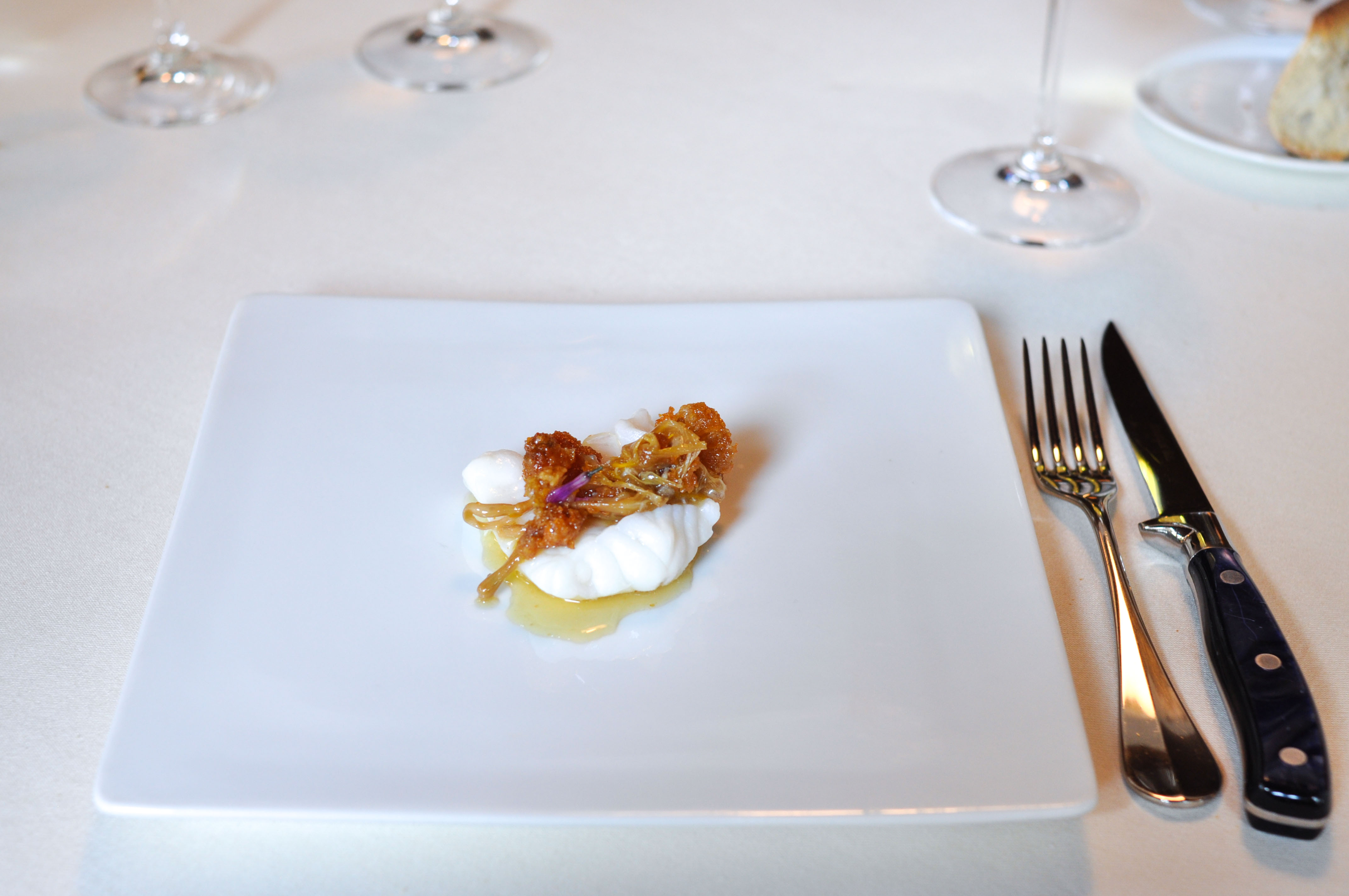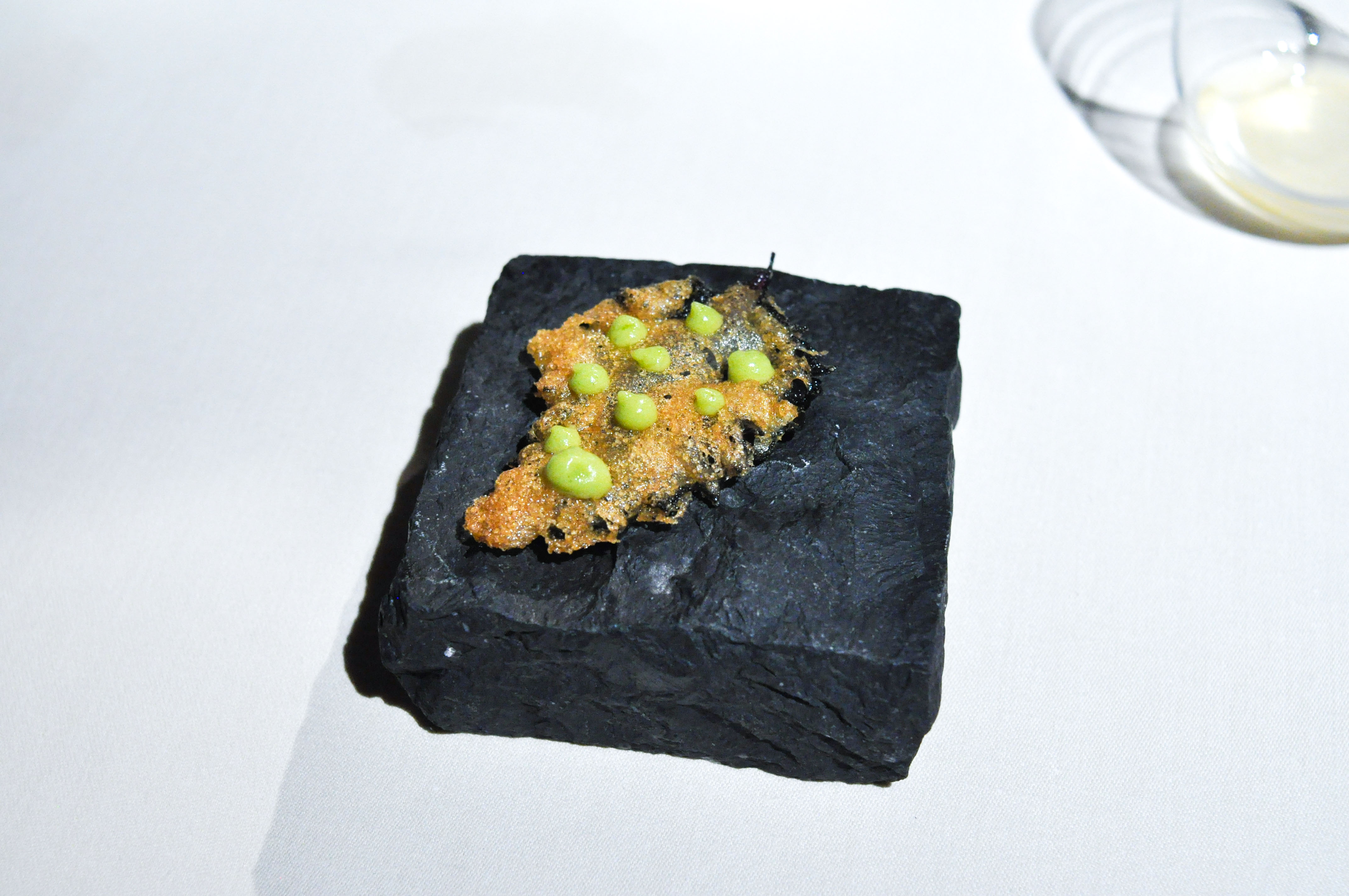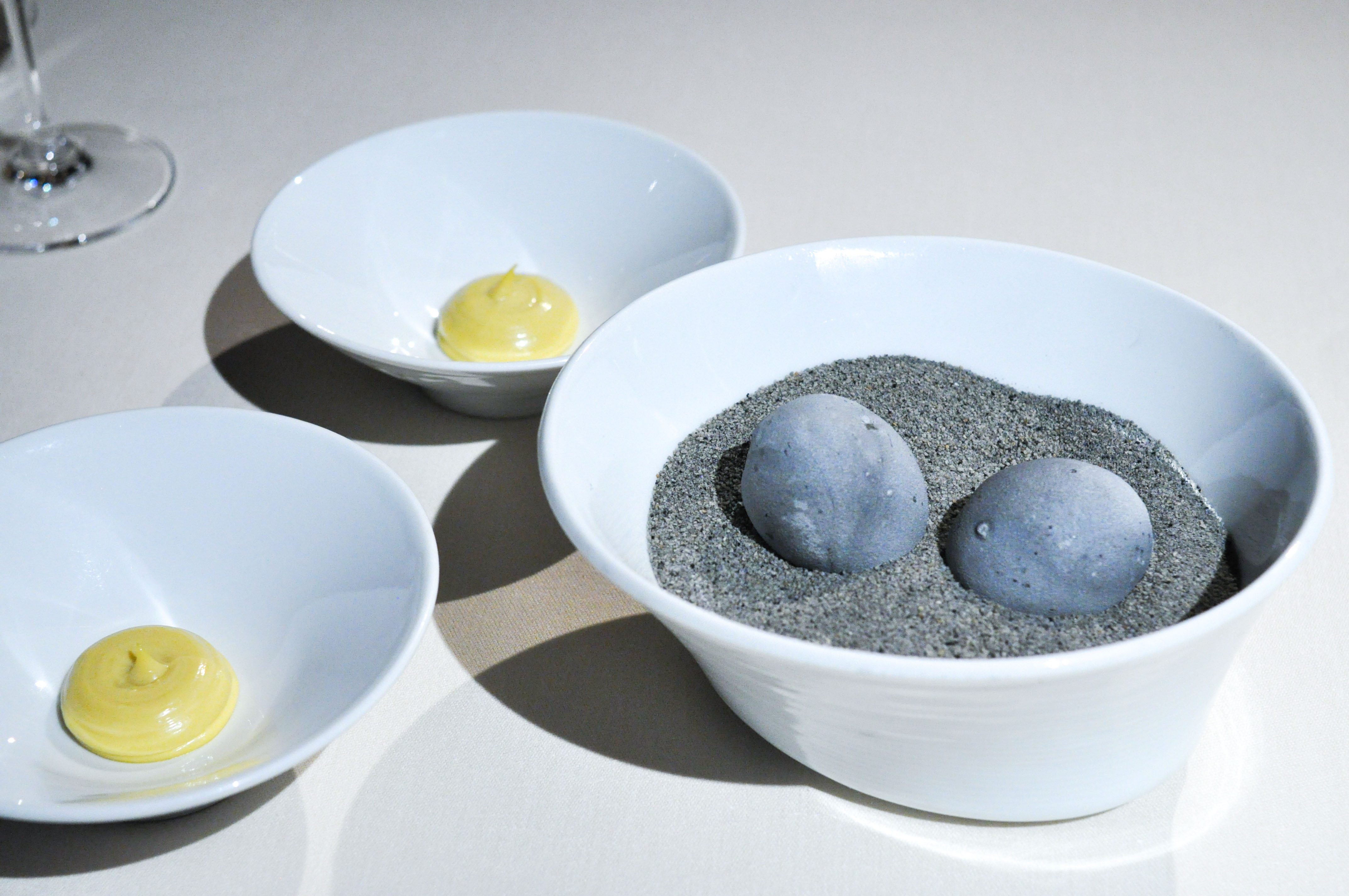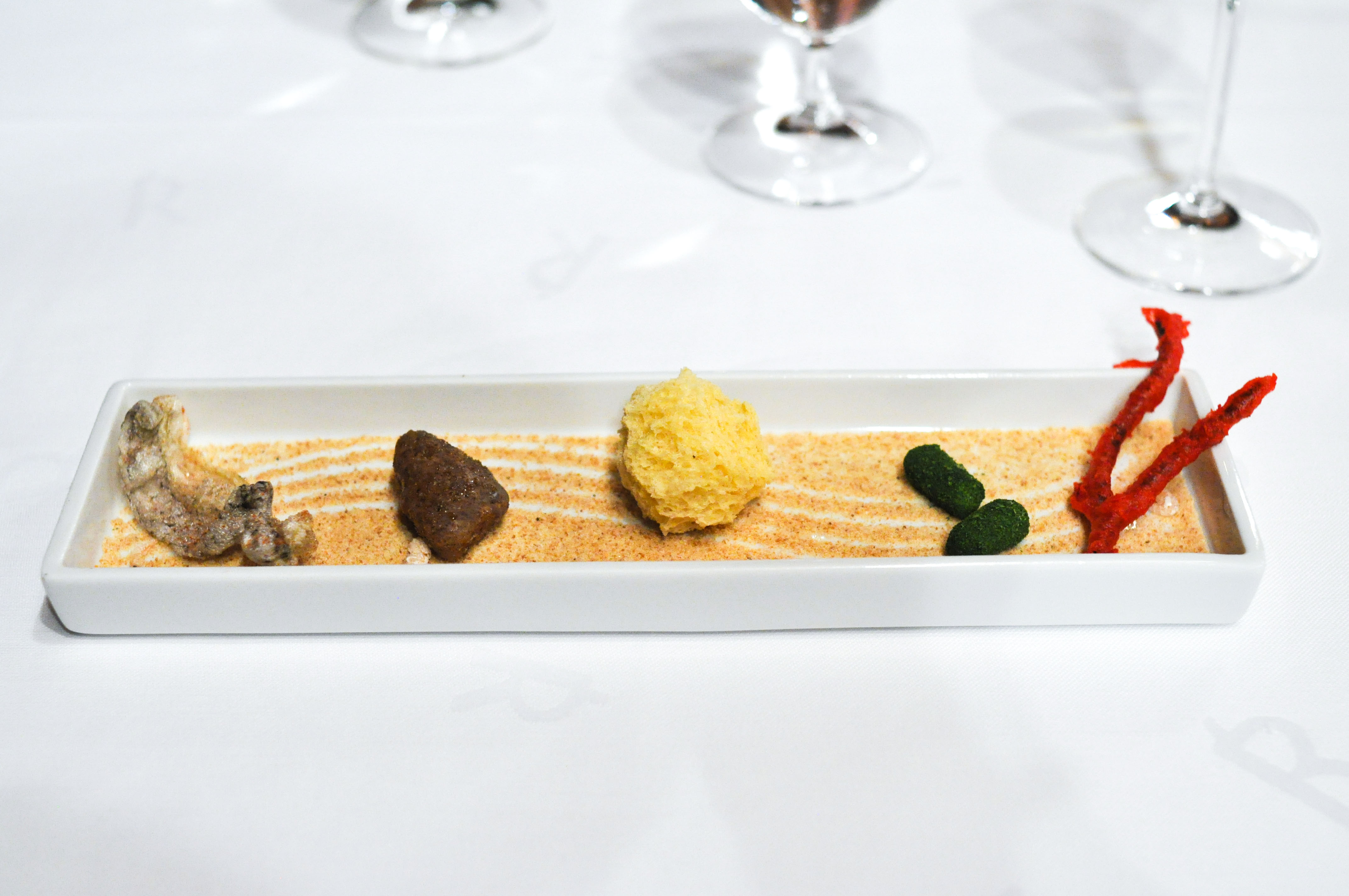 Sea Garden. A little sand box to begin. Crispy cod skin flavored with tomato. A cold mussel covered in chocolate that melted away nicely. A savory sea urchin sponge cracker. ‘Beach Pebbles’ of shallot, corn, dill, and parsley. Tasty seaweed tempura ‘Coral’. A bed of edible prawn sand. Good ocean flavors and a fun start to the meal.