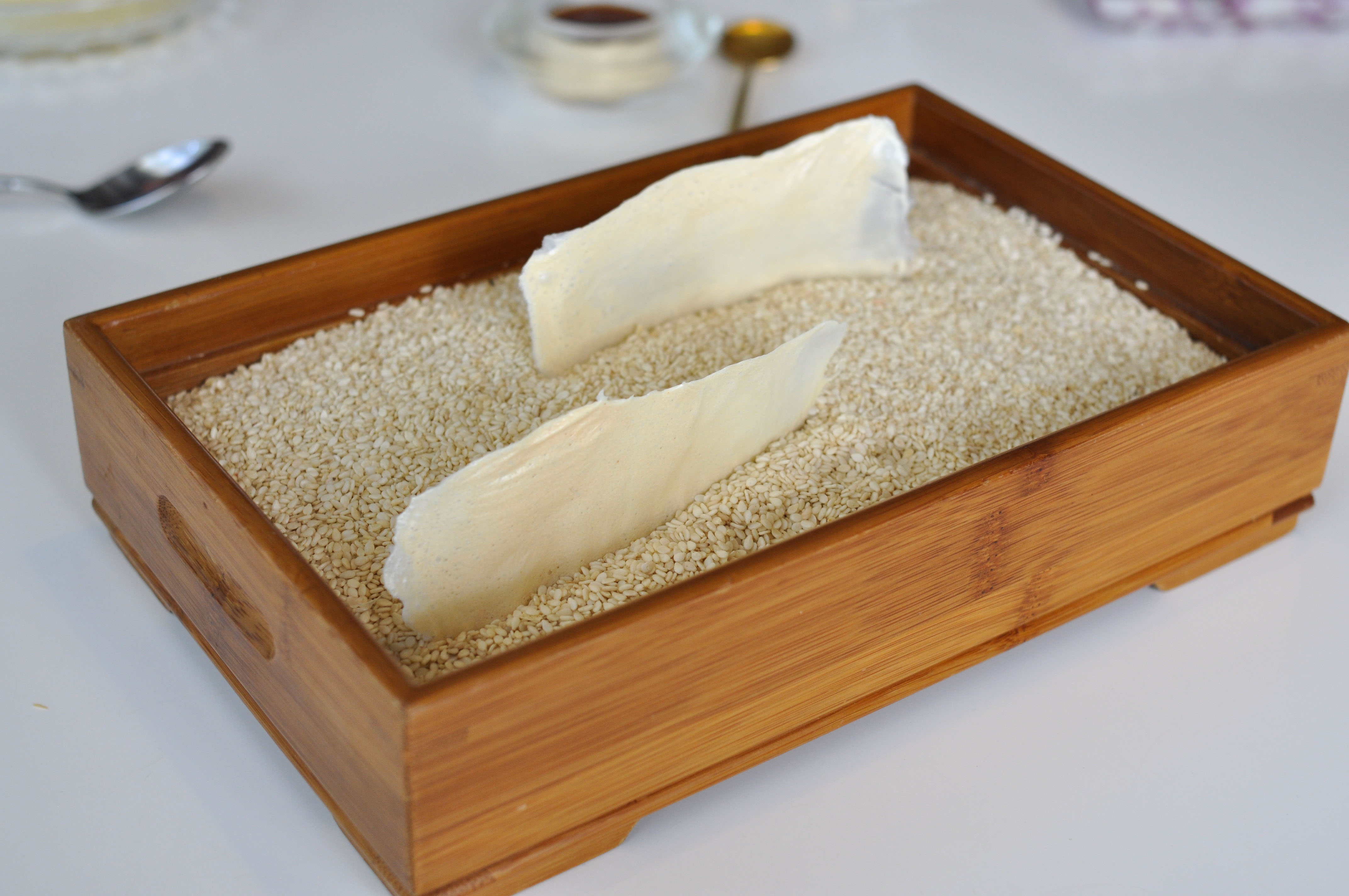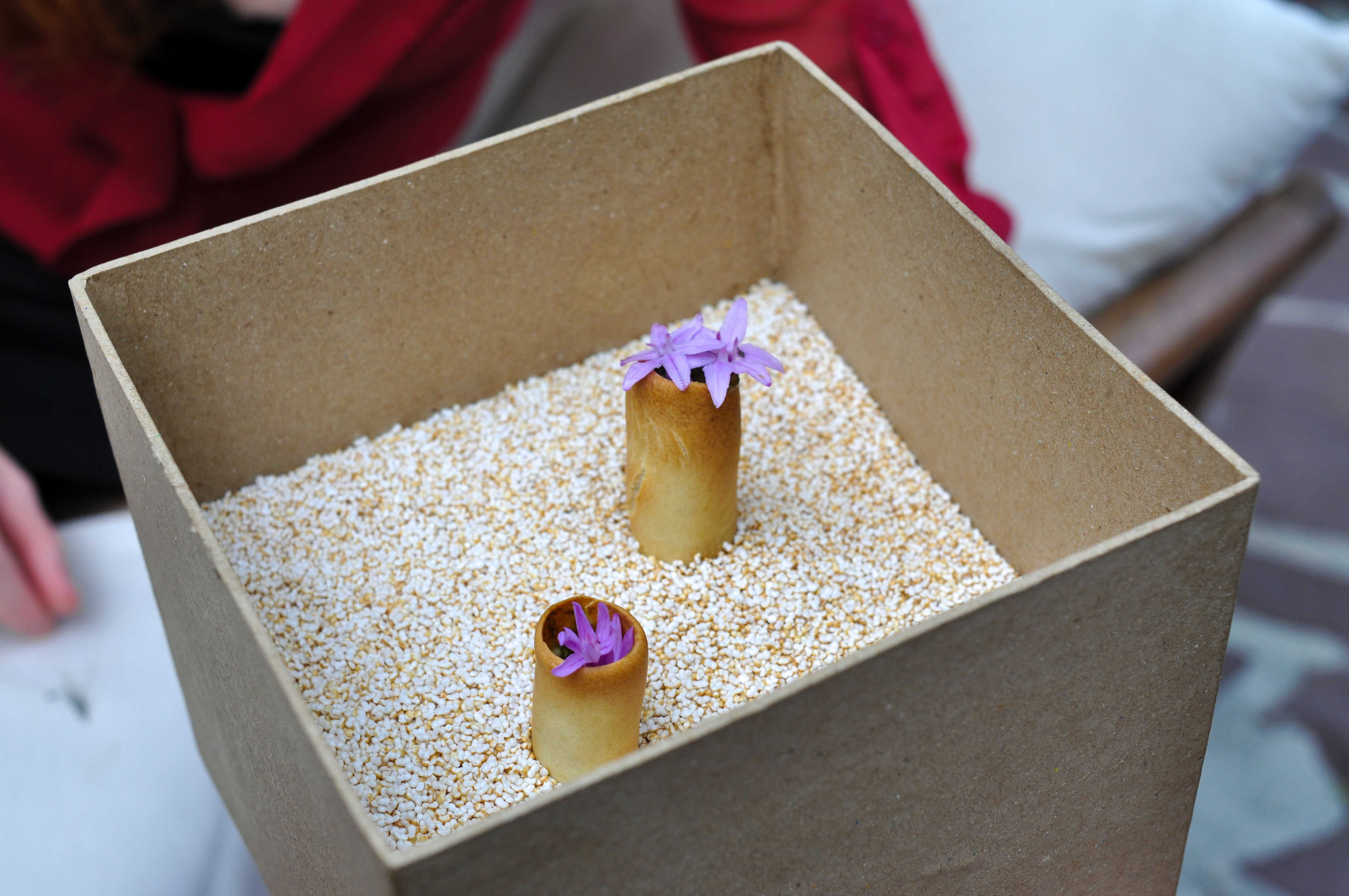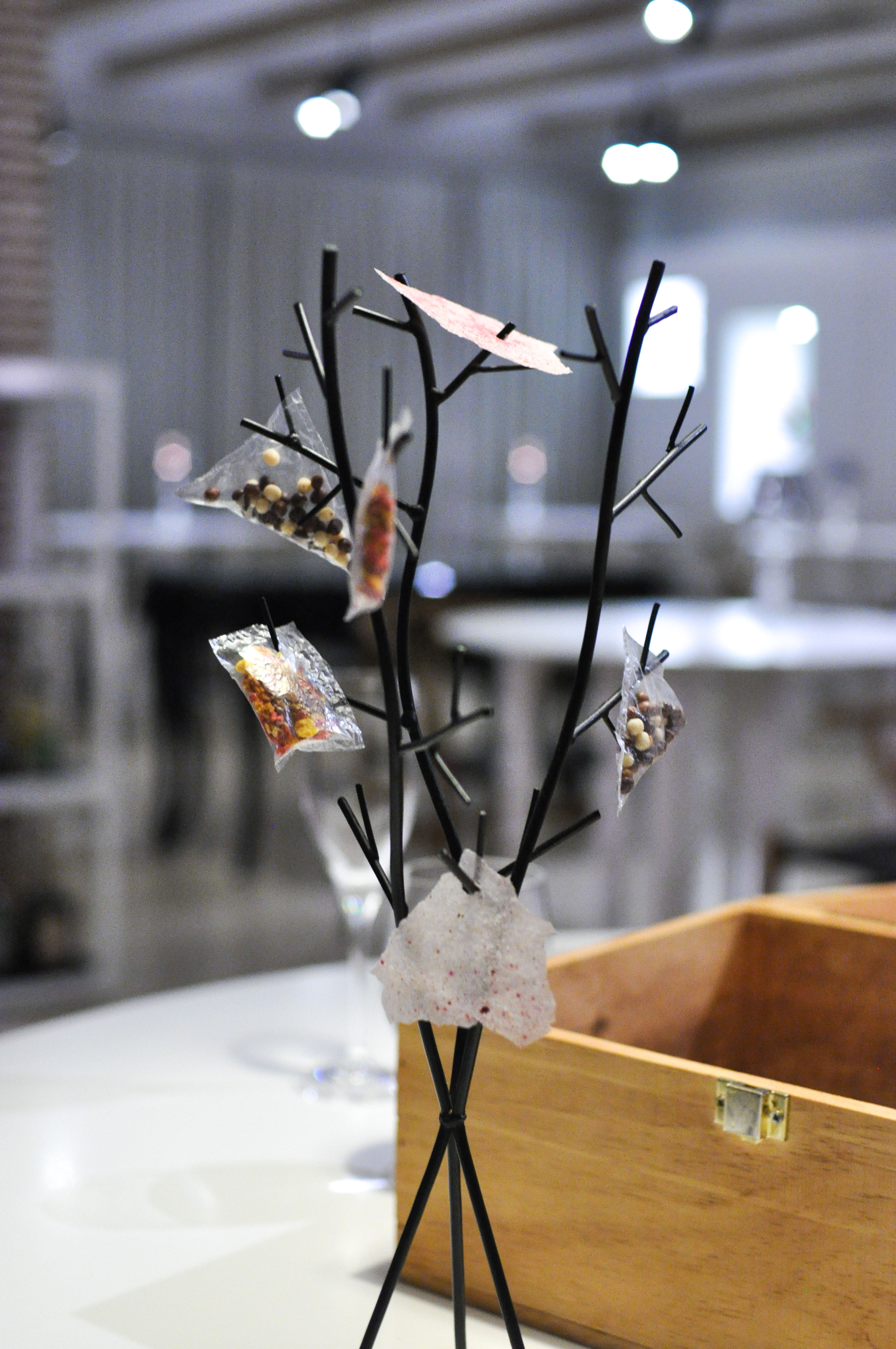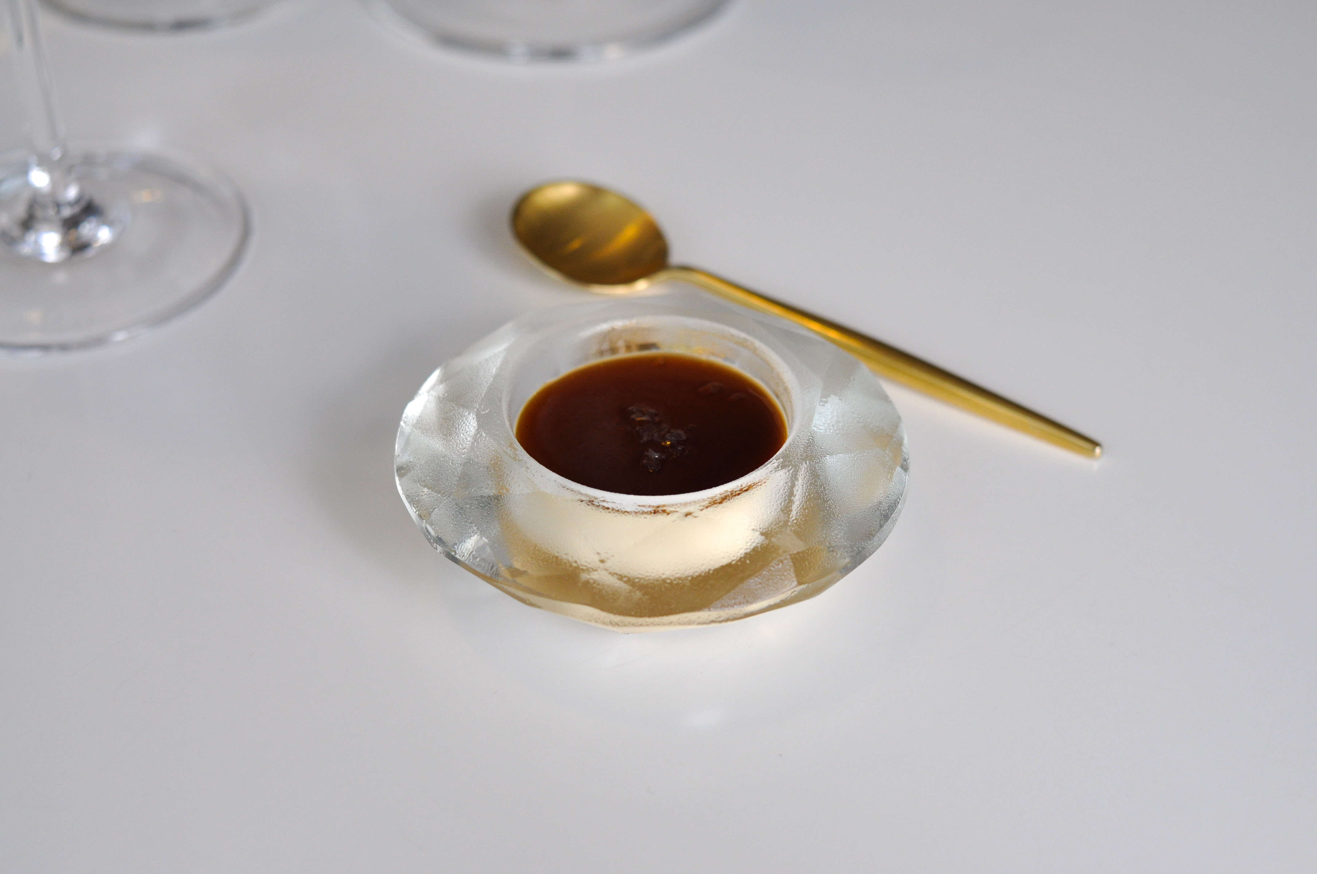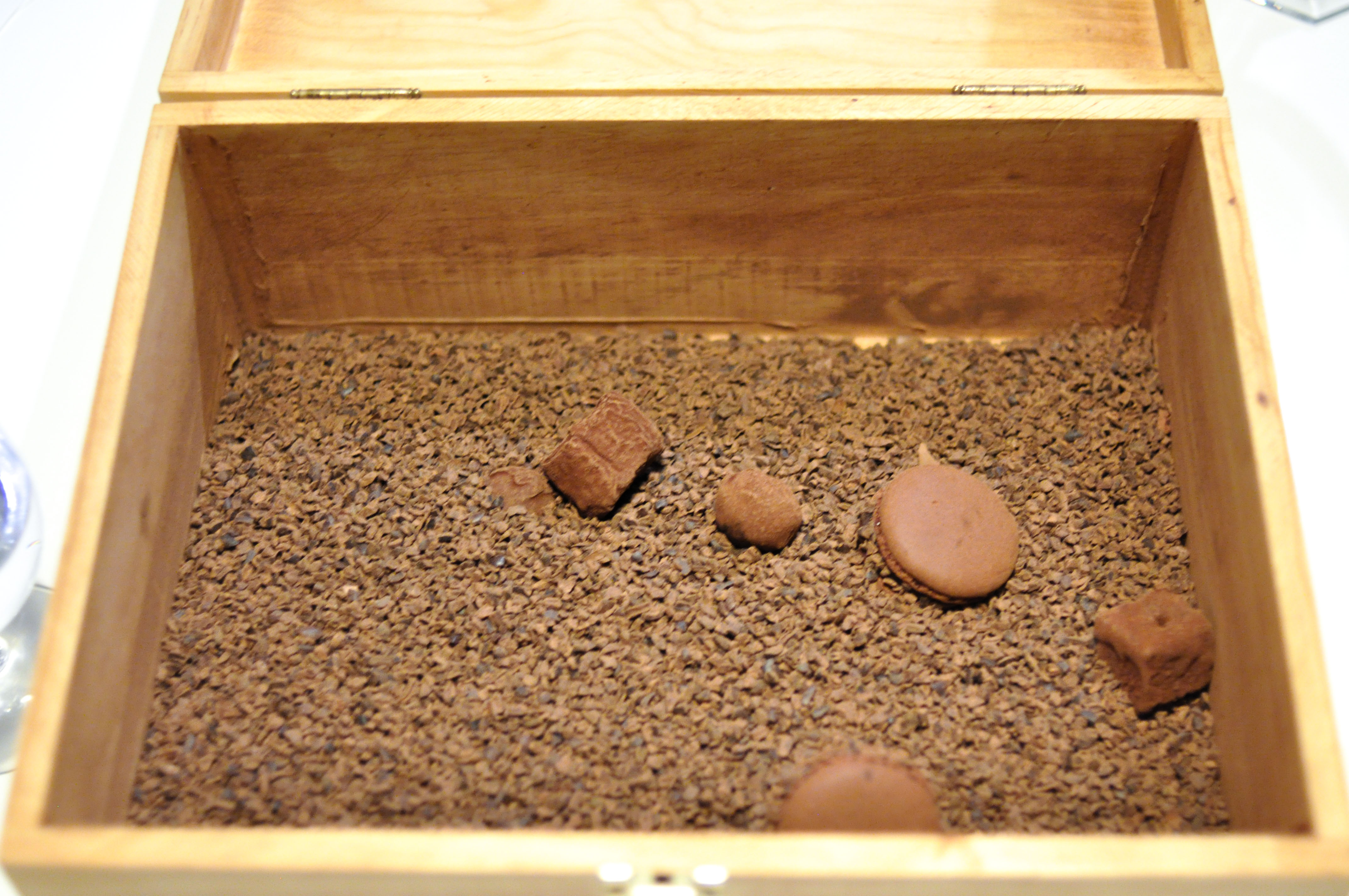 Sea Garden. A little sand box to begin. Crispy cod skin flavored with tomato. A cold mussel covered in chocolate that melted away nicely. A savory sea urchin sponge cracker. ‘Beach Pebbles’ of shallot, corn, dill, and parsley. Tasty seaweed tempura ‘Coral’. A bed of edible prawn sand. Good ocean flavors and a fun start to the meal.
