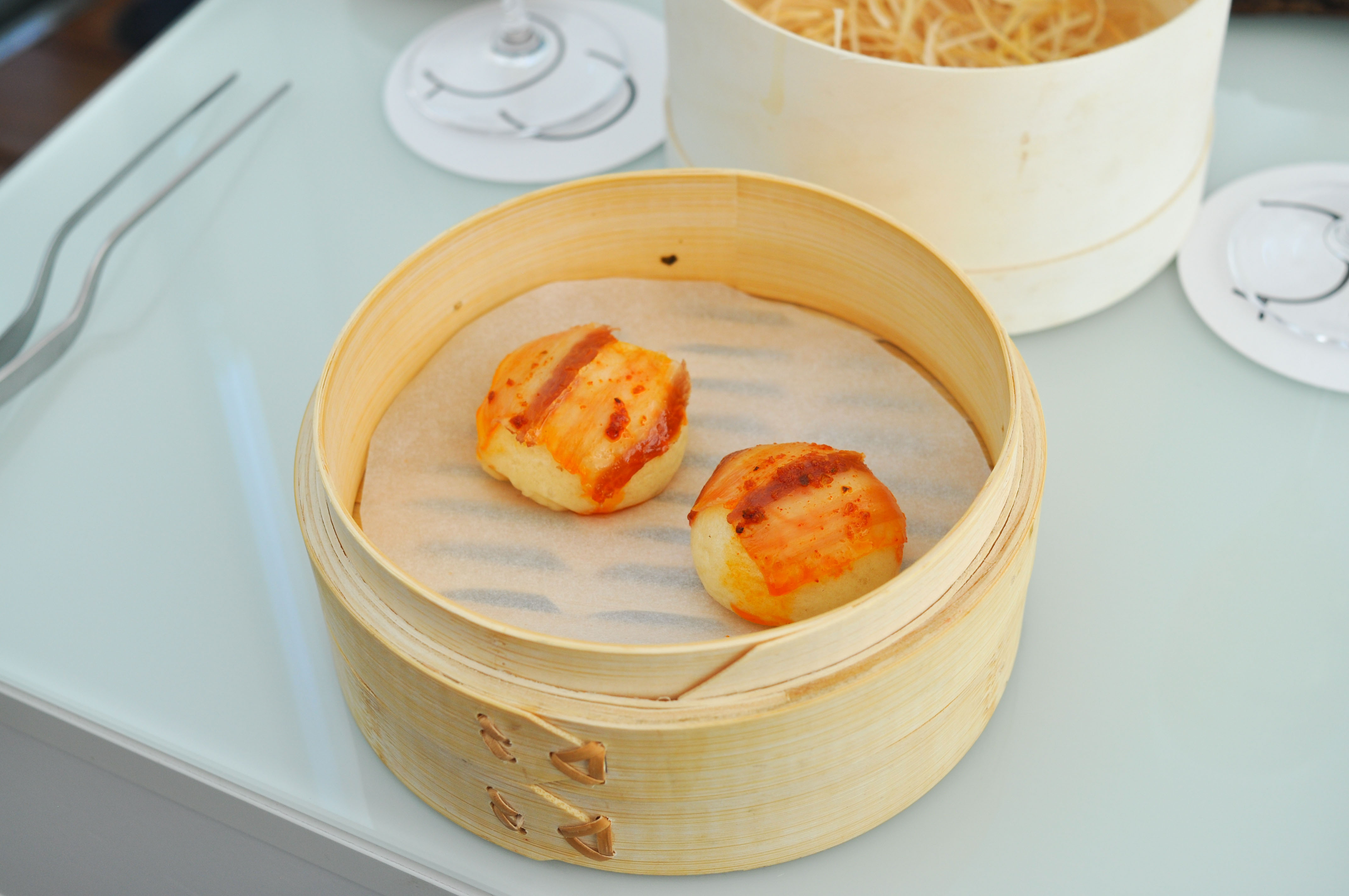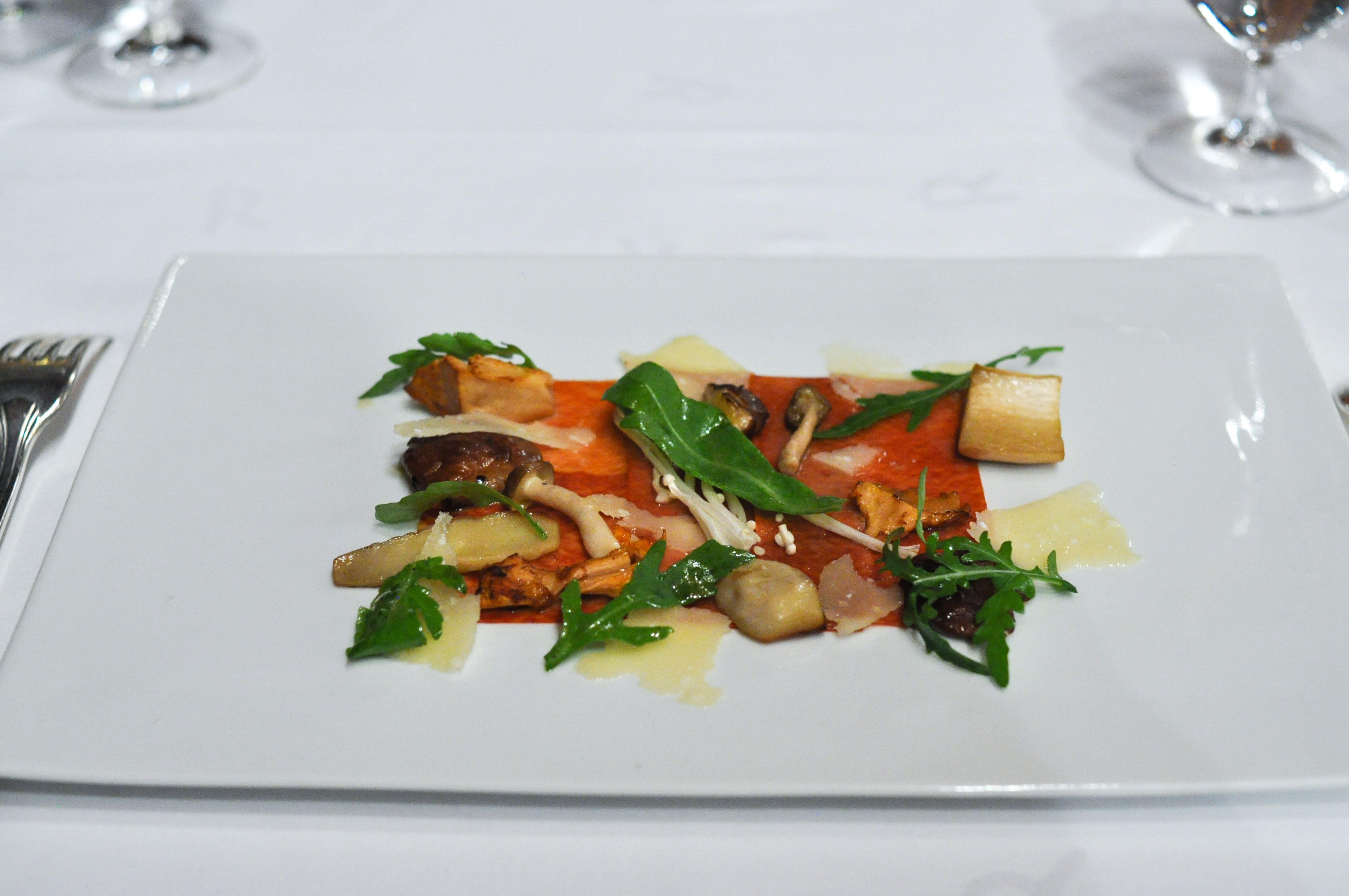 Pasta Carpaccio, Piquillo and Iberic with Parmesan shrooms. Sheeted pasta with intense ham and pepper flavor presented as a meat carpaccio. Amazing when paired with the parmesan and mushrooms.