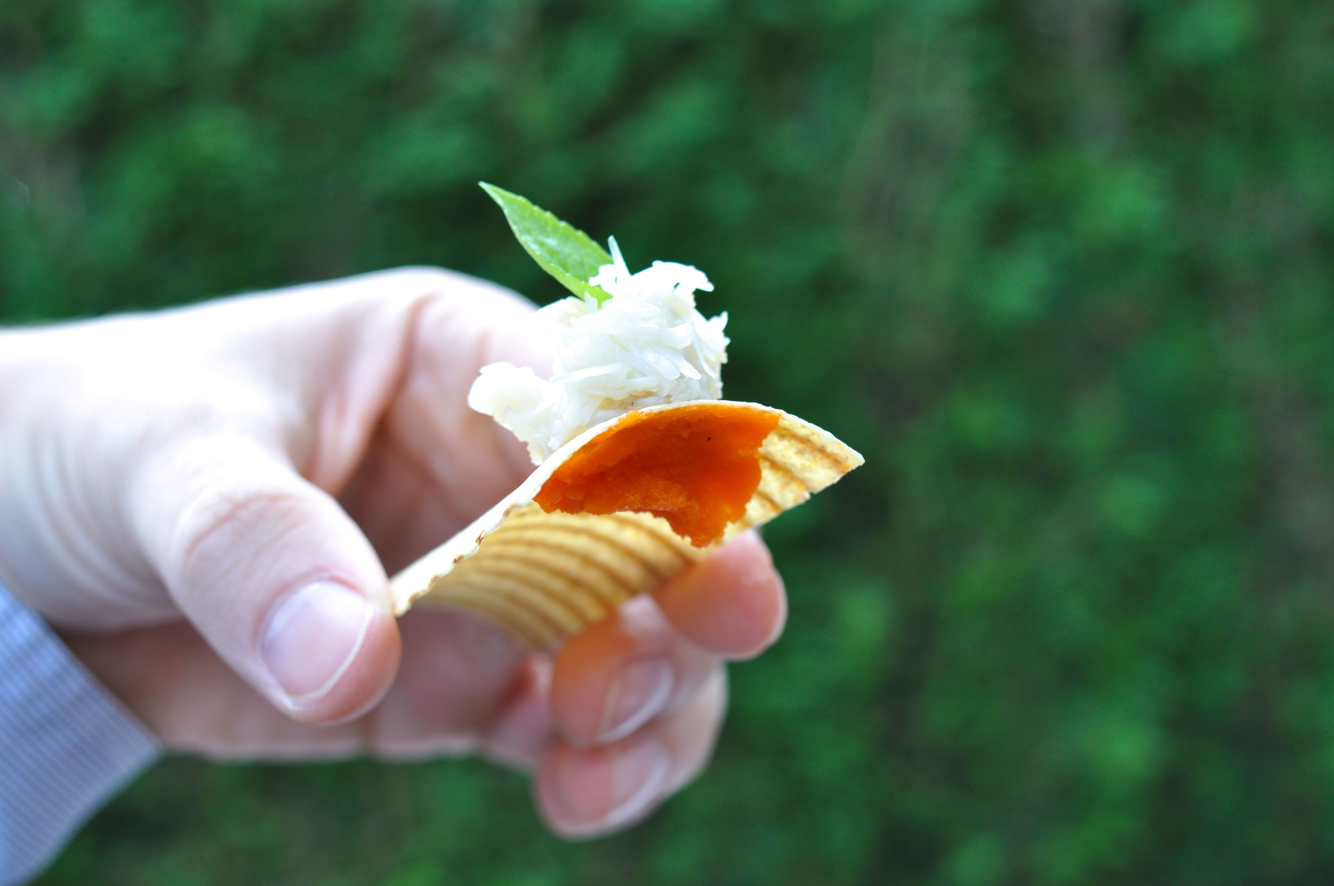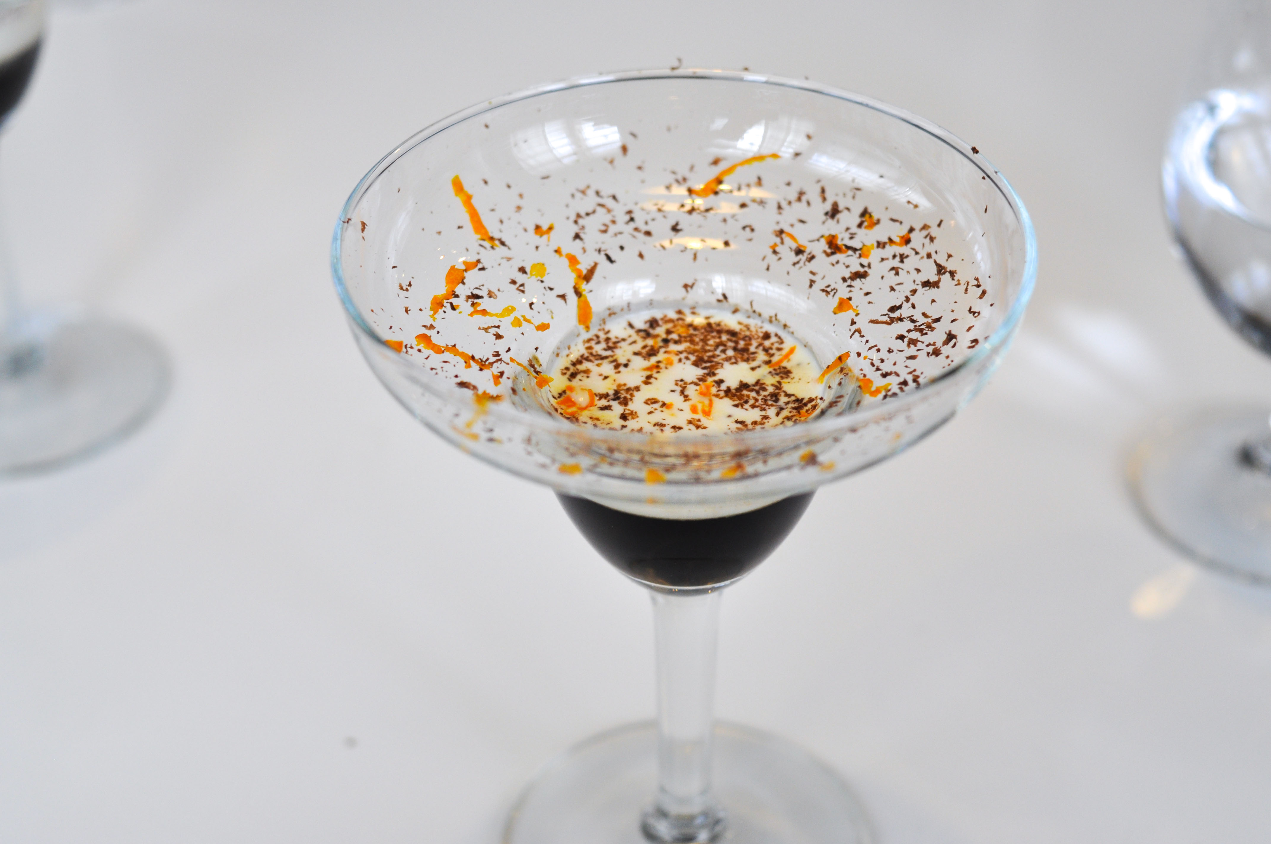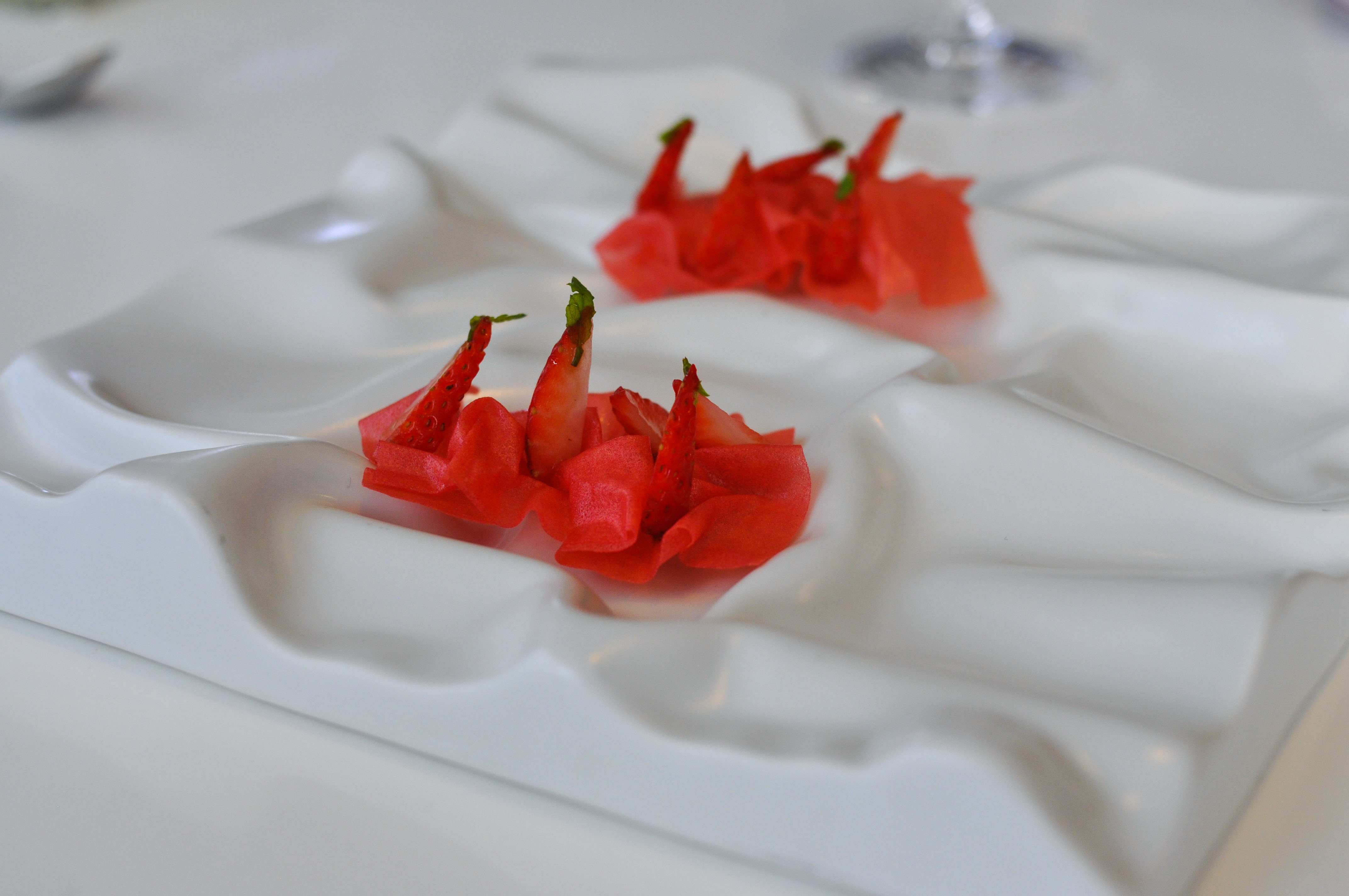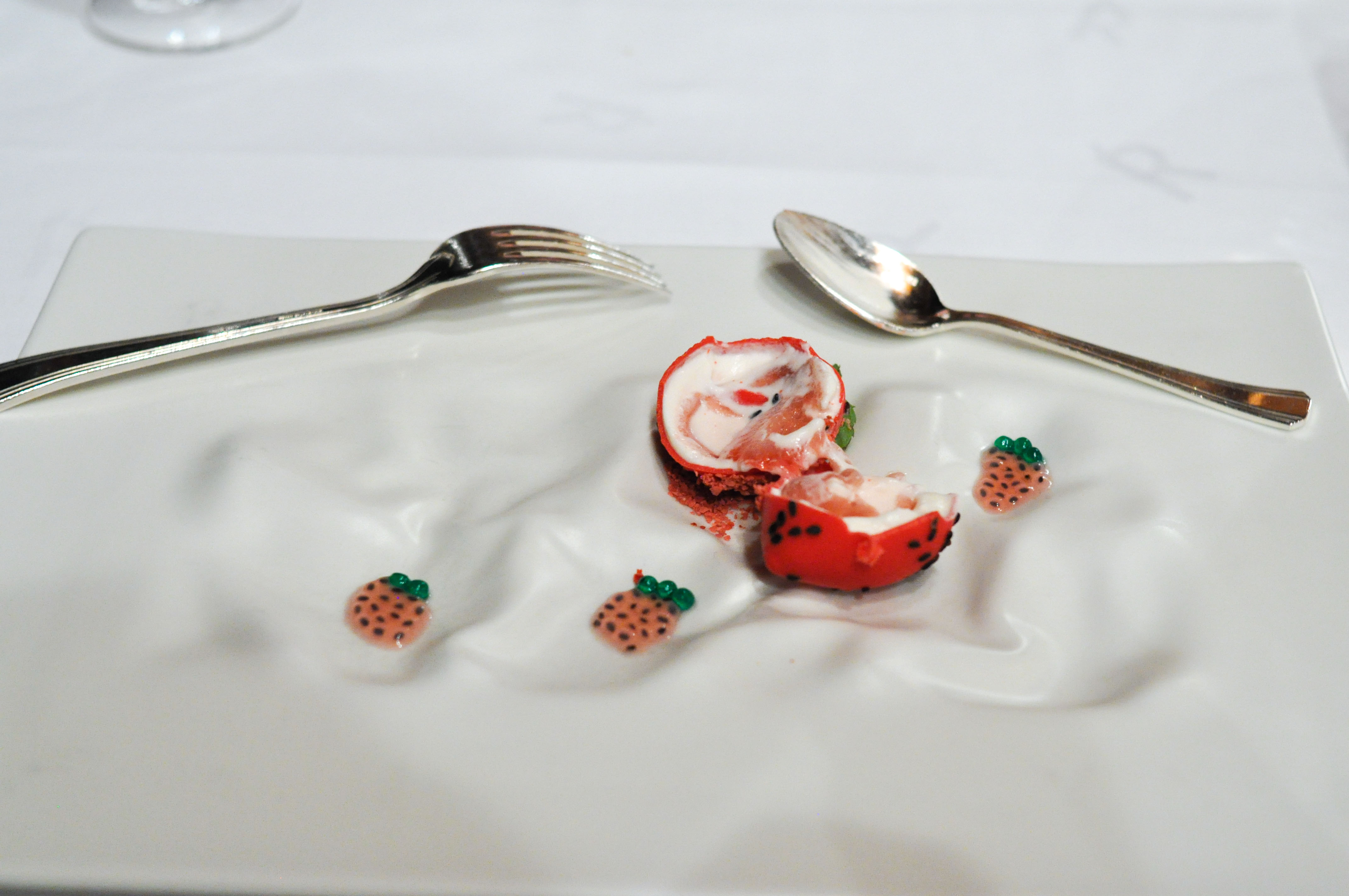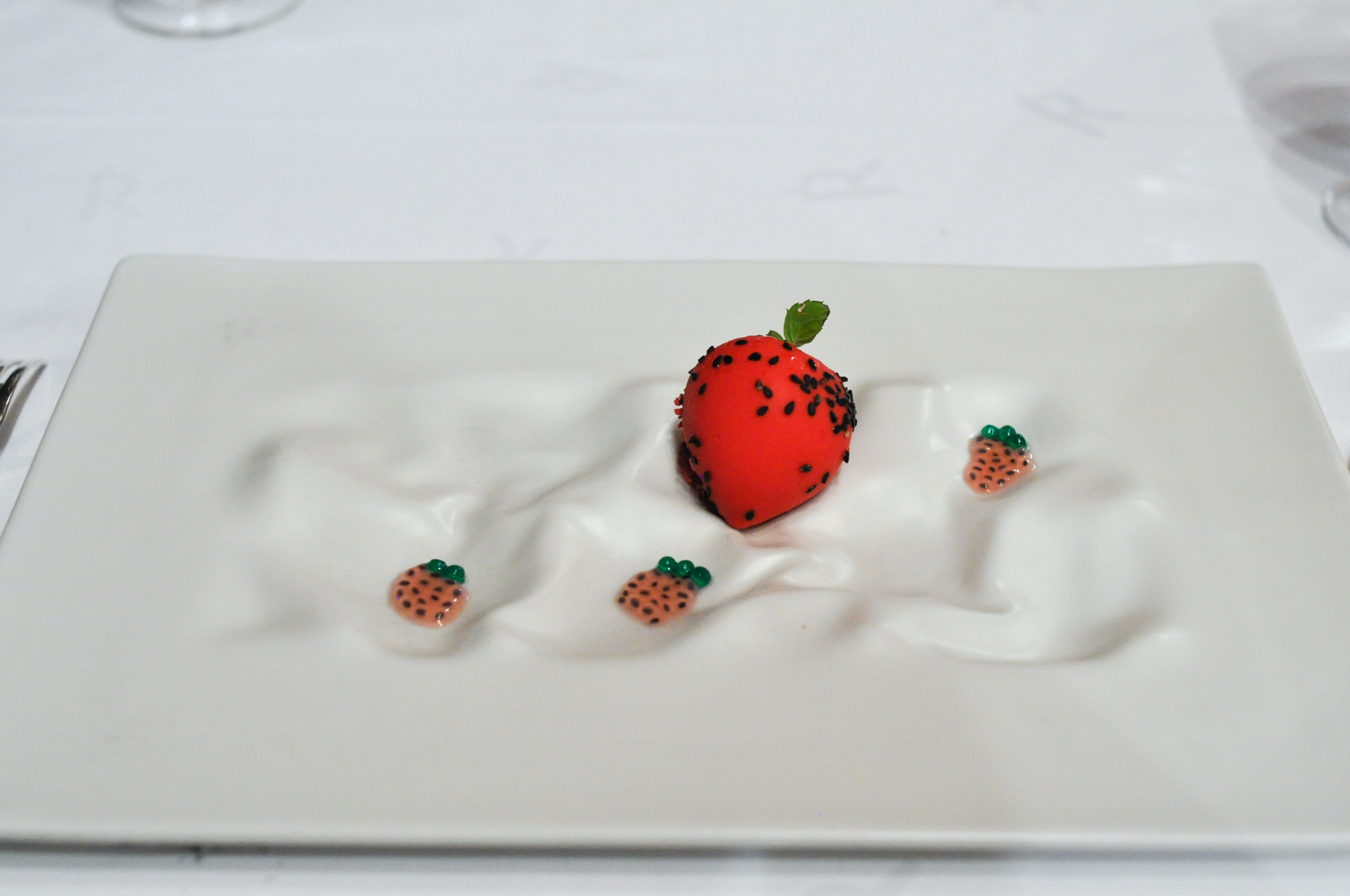 Layered Strawberry and Cream. A reconstructed strawberry. The chocolate shell was good. Basil seeds in a strawberry liquor were fun. The basil leaf gave a great herbaceous pop; I wish they had given me more leaves.