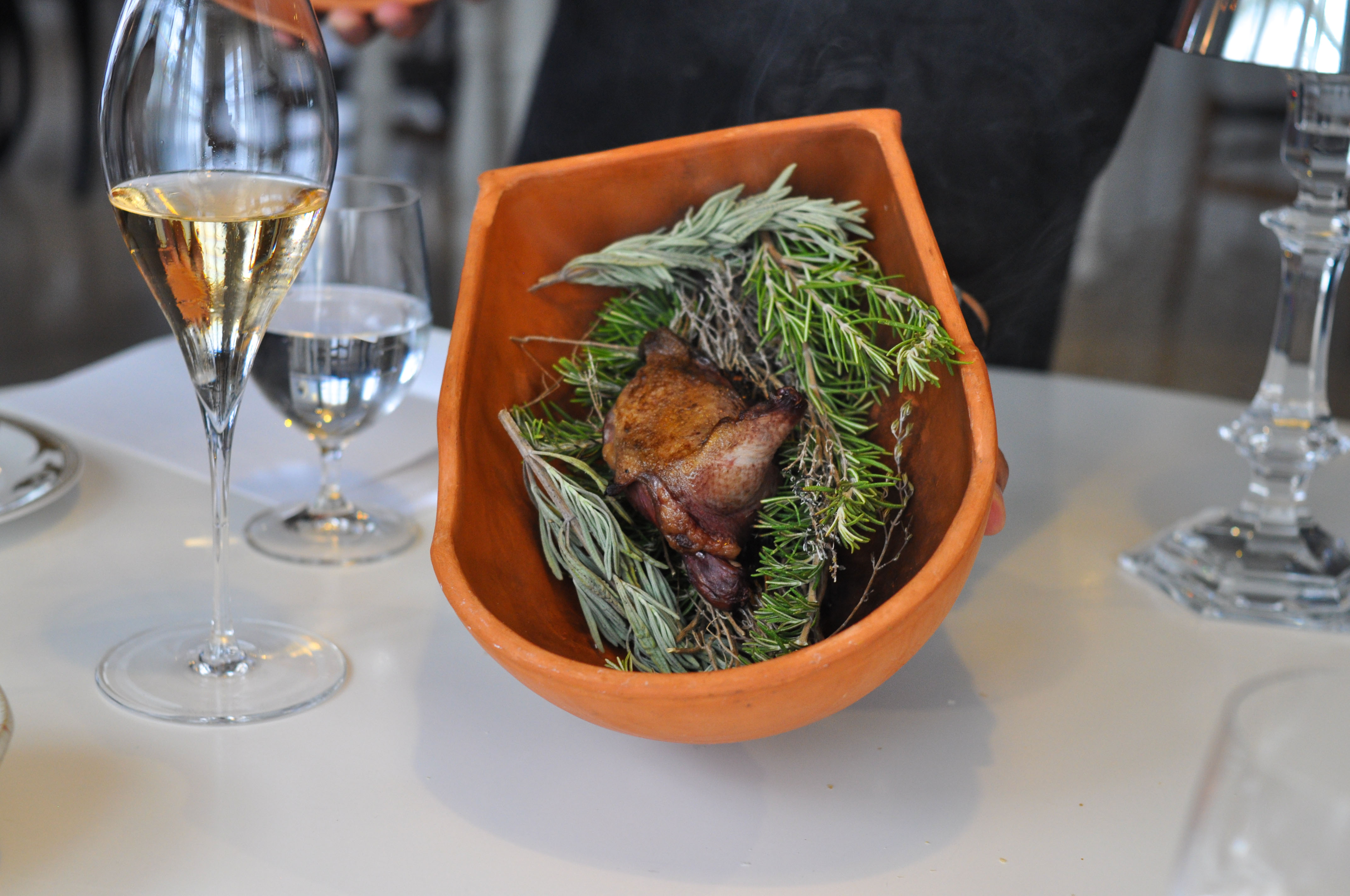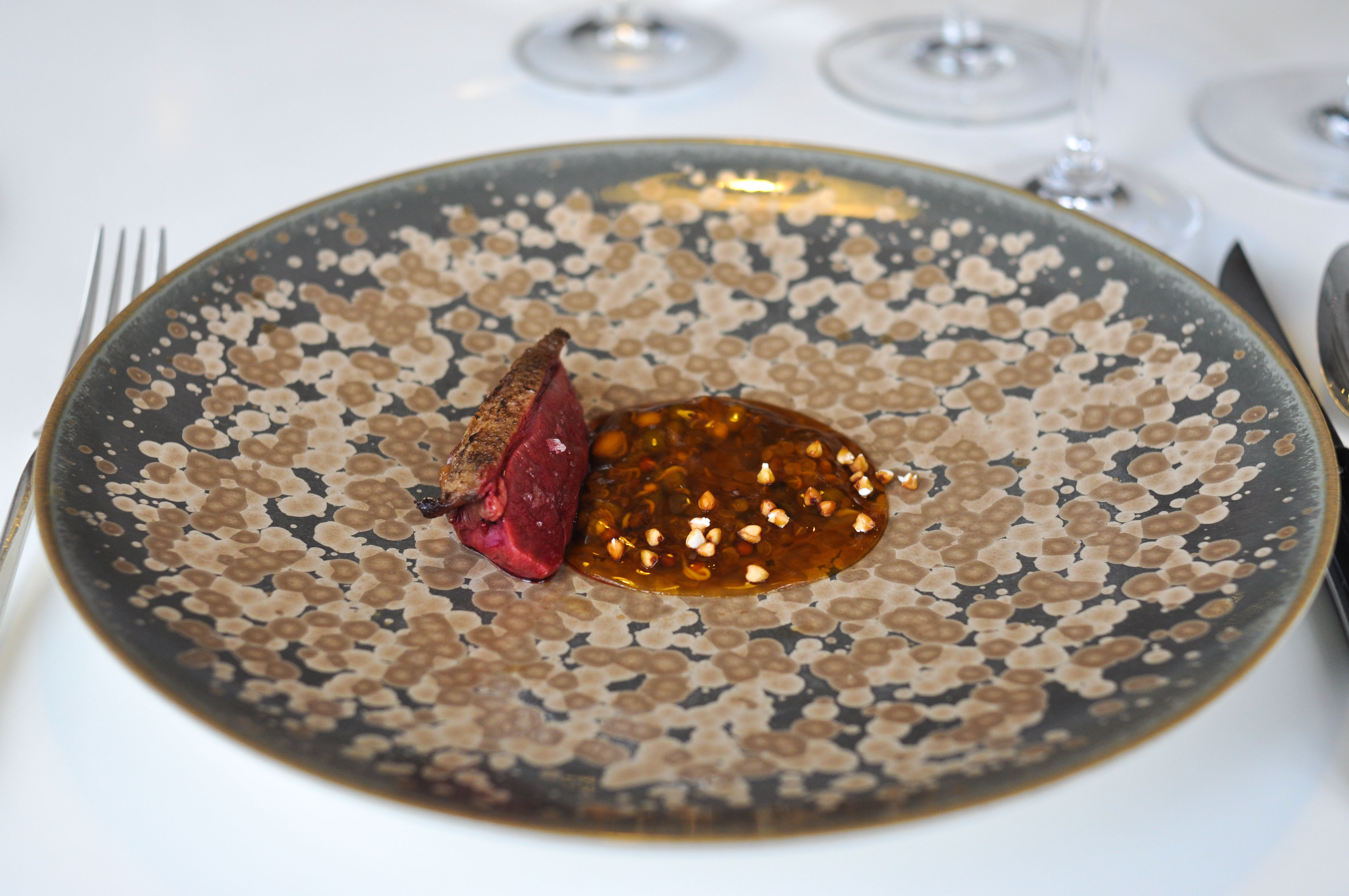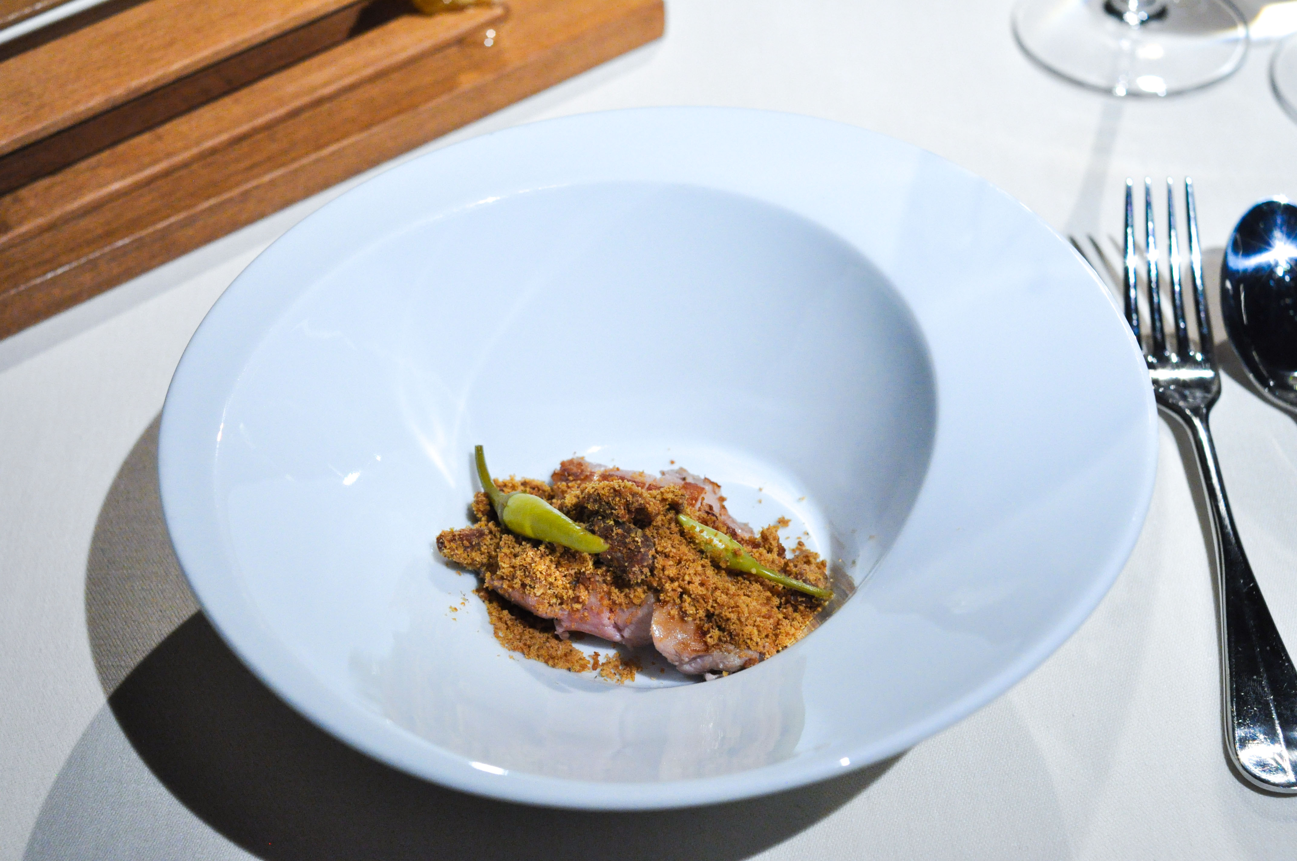 Roasted Pigeon with a Touch of Mole and Cocoa. Slightly crisped, tender pigeon breast matched up with cocoa and mole and a ‘ravioli’ of pigeon leg in filo. A wonderful plate of bird.