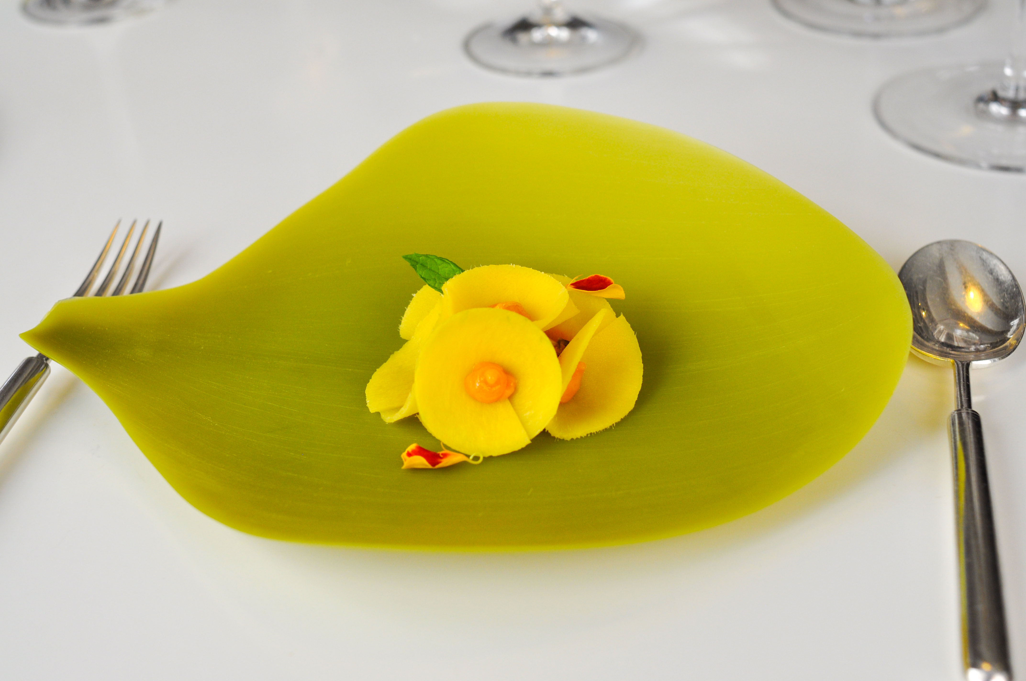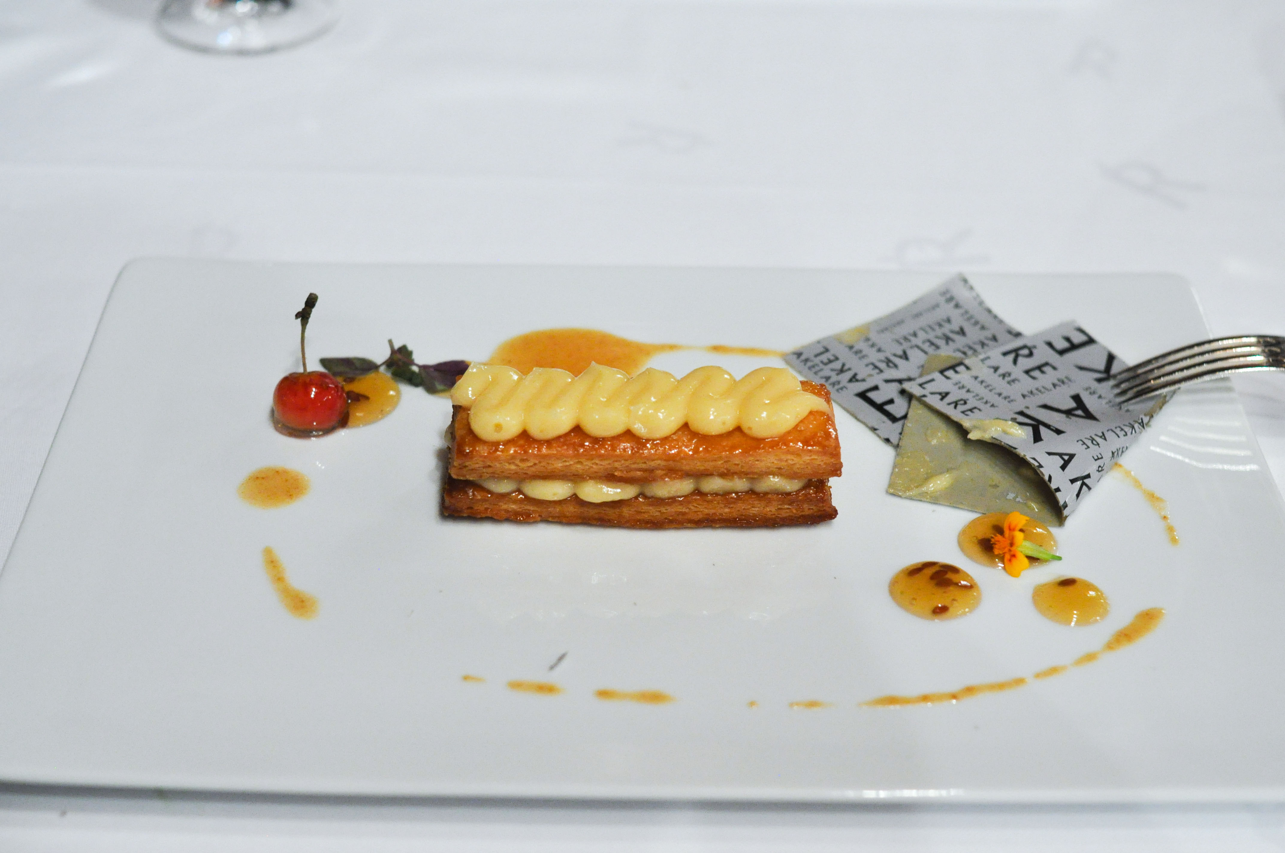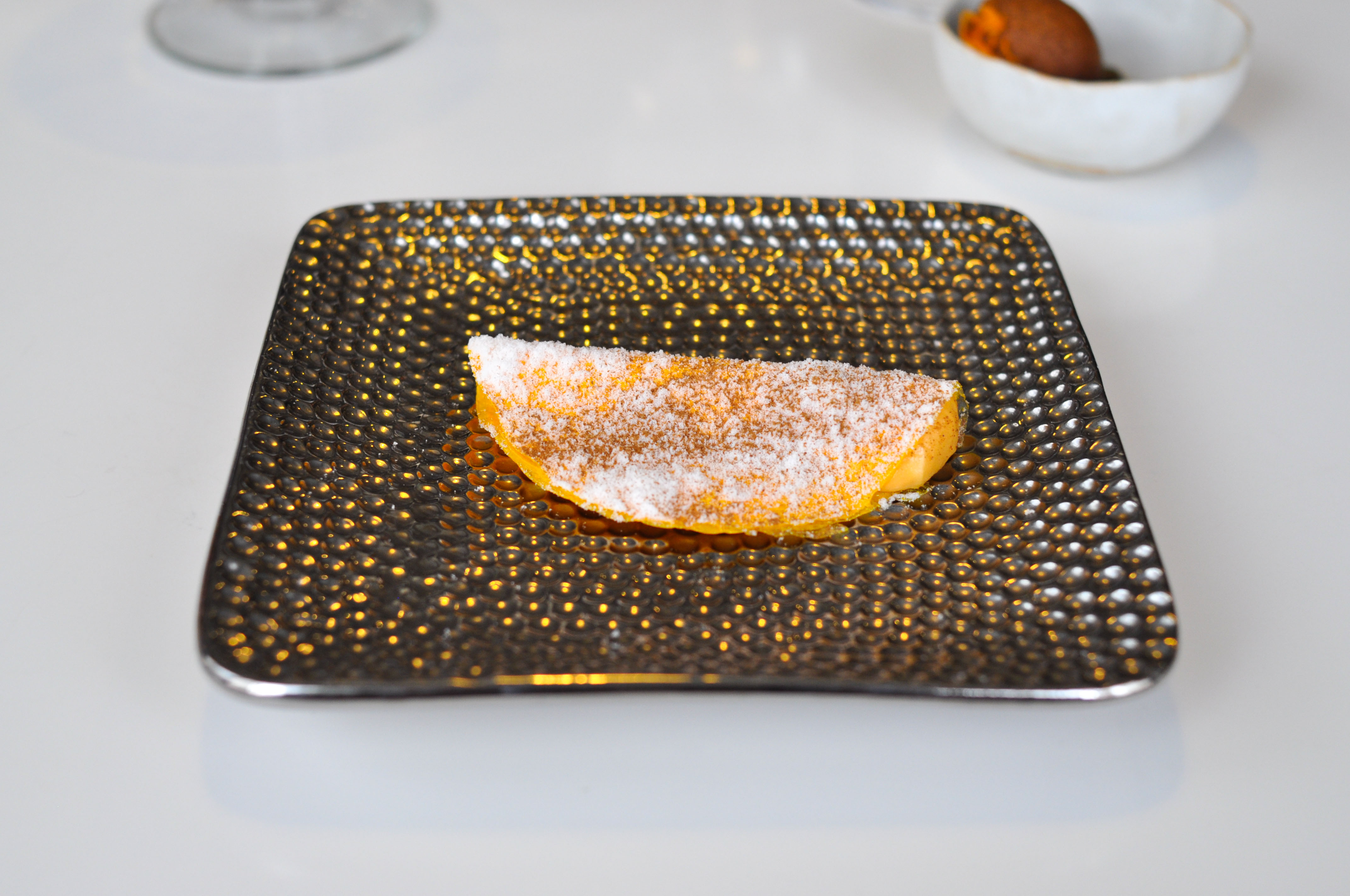 A Different Apple Tart. Hiding under a tasty fruit-rollup-esque ‘apple paper’ was a gorgeous apple tart. Toasted puff pastry layered with apple cream with a nice praline, apple cider sauce, and a ‘mini apple’. Quite a skillfully made pastry. Bravo.