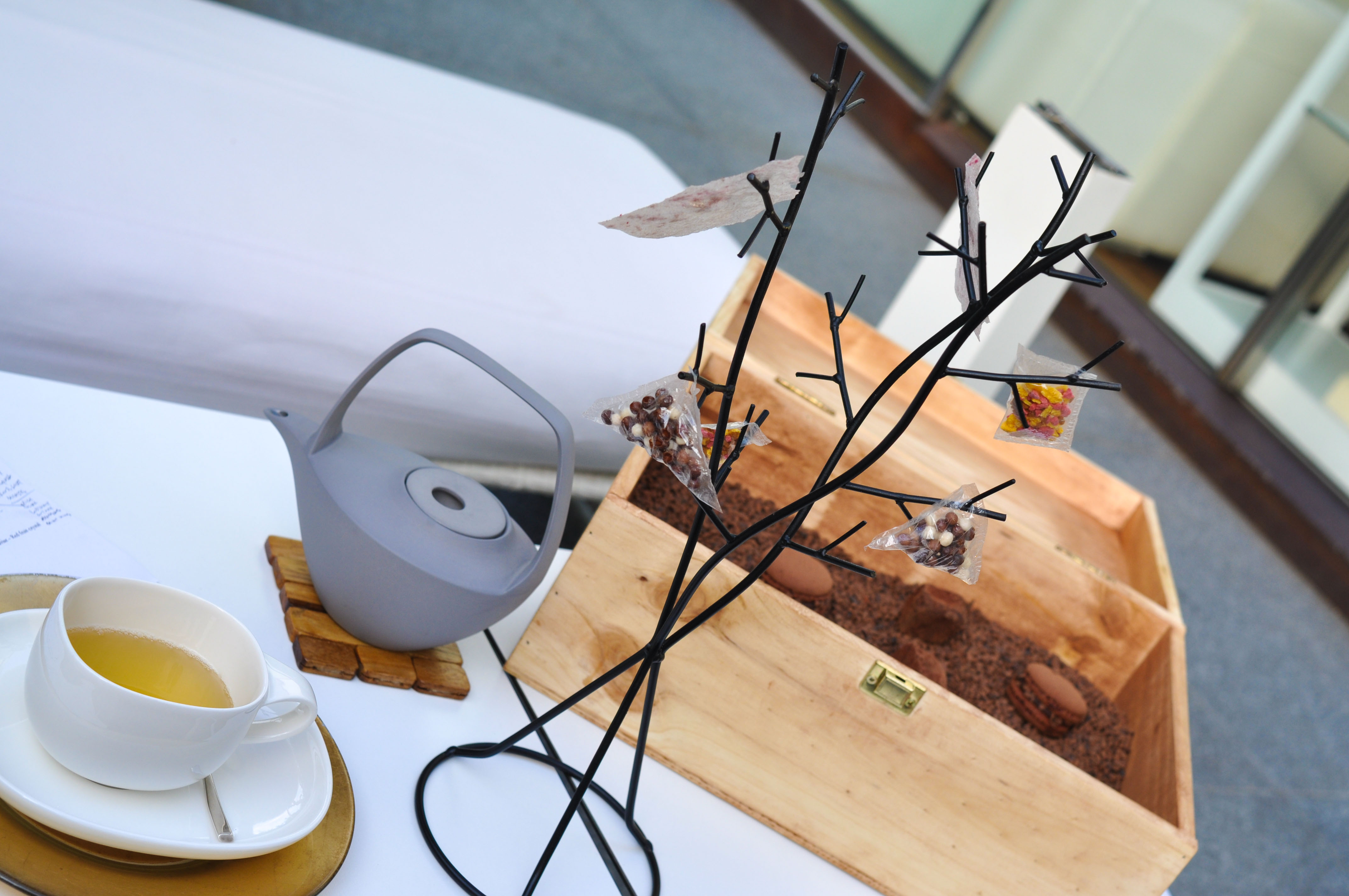 Petit fours. Almond madelines. Pineapple pate-de-fruit. Green tea-red fruit-lime marshmallows. Vanilla candy. Chocolates.