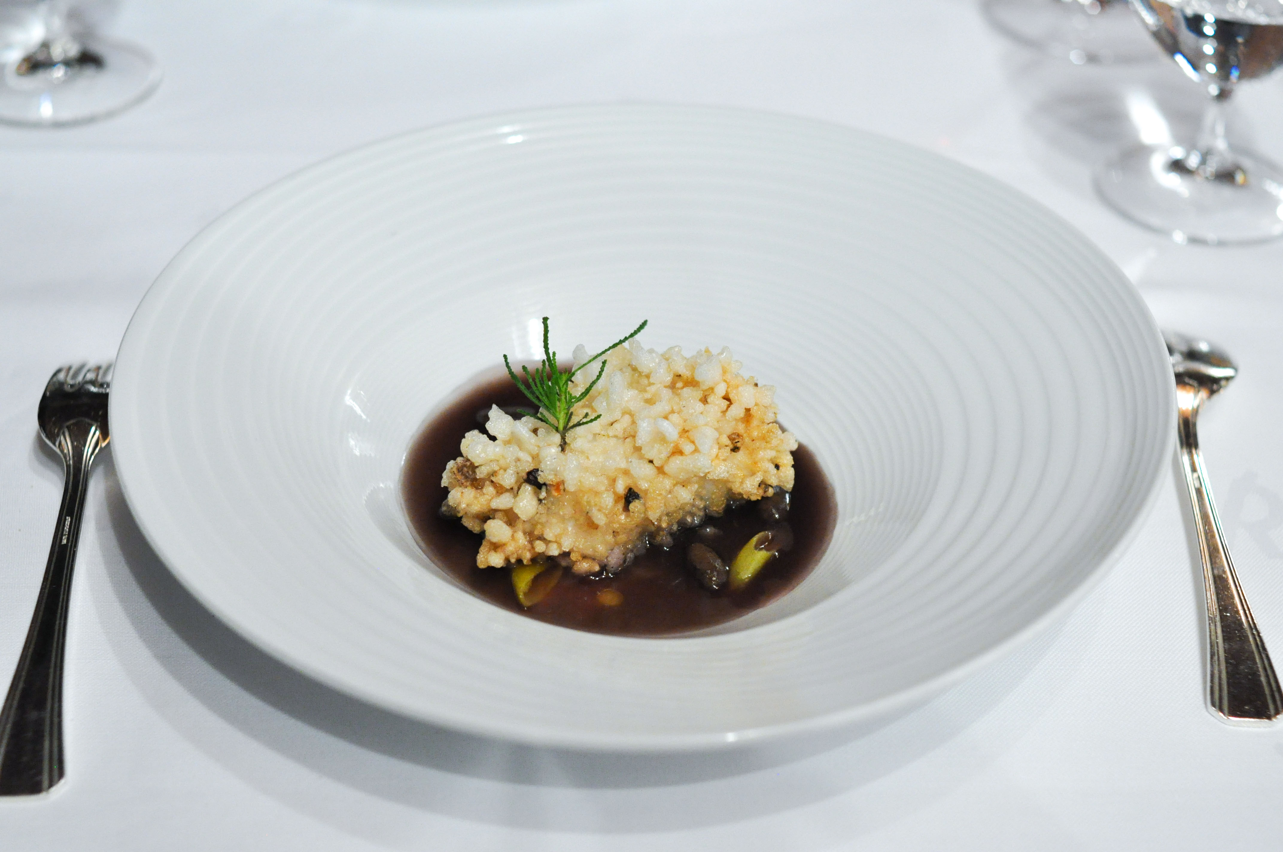 Hake, in Monkfish “Habit” and Mussel’s Beans. Hake breaded with monkfish dried skin that had a texture like rice krispies. Served over ‘beans’ made from mussels and rice. The Piparras, traditional Basque pickled green peppers, really enhanced the dish.