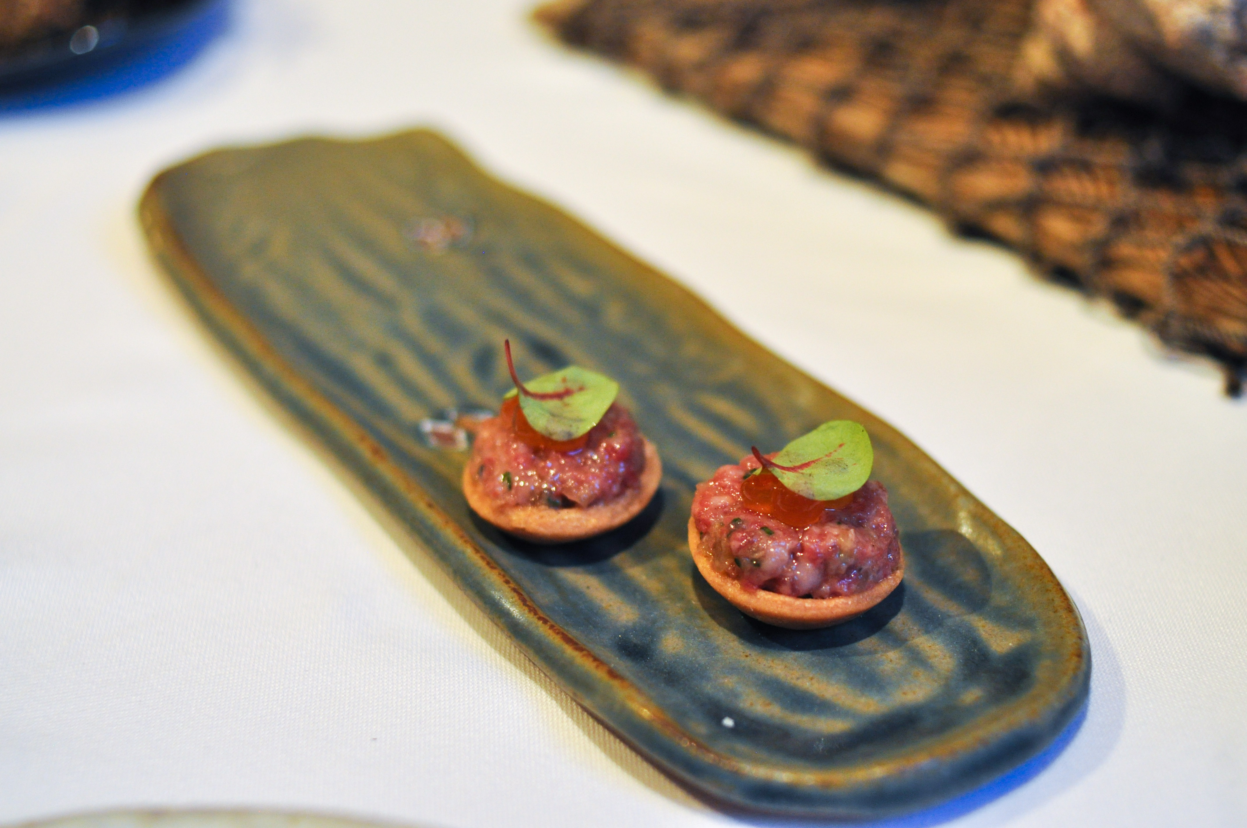 Wagyu Tartlet. A beautiful tartare of A5 Kagoshima beef with roe and amaranth leaf. A fantastic bite.