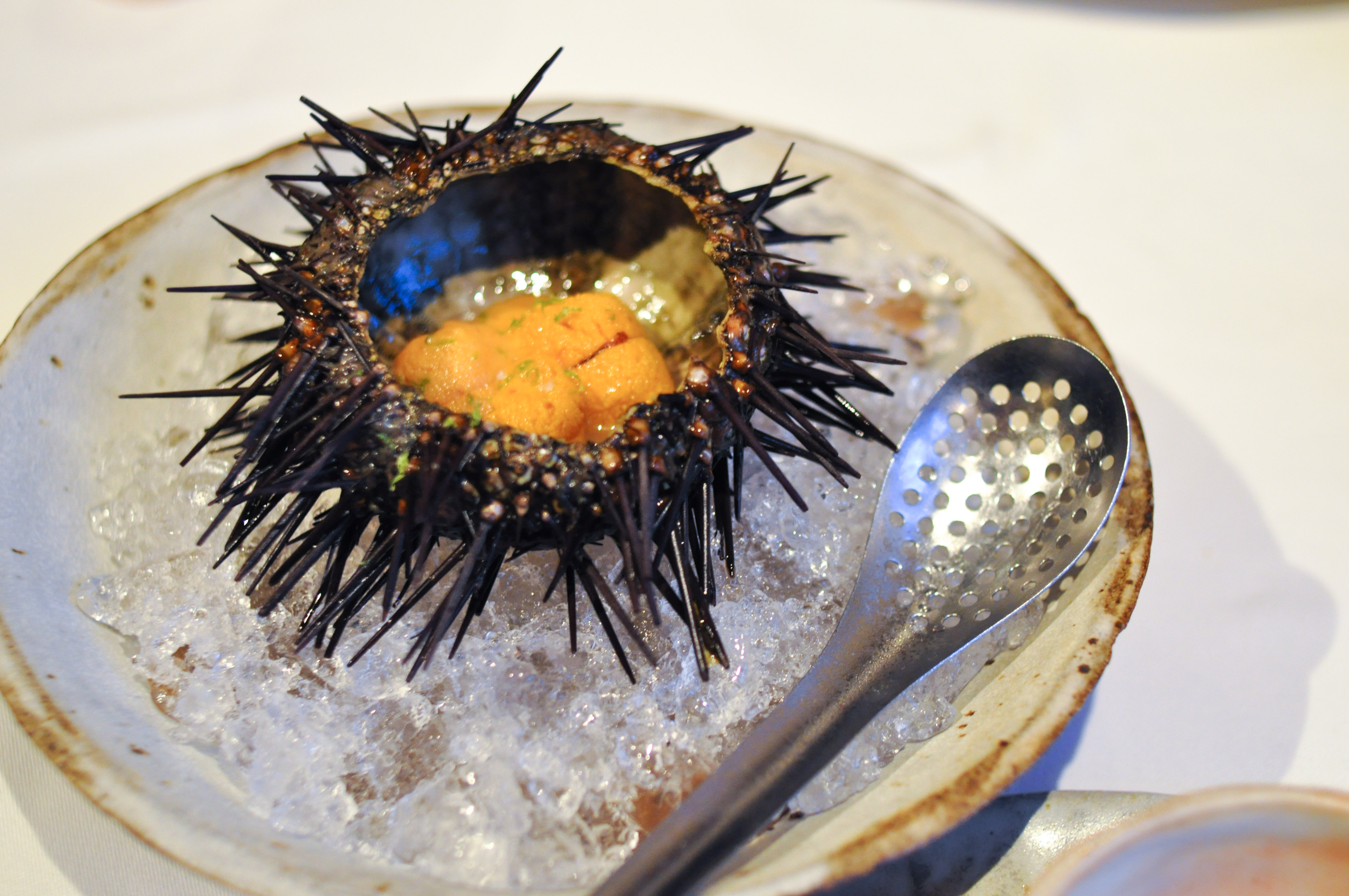 Uni, caviar. Canadian sturgeon caviar laying with sea grapes on a bed of raw milk and kombu gelees with some sea urchin alongside to mix in. The pop of the sea grapes and the salinity of the caviar and kombu were great with the creamy, sweet uni.