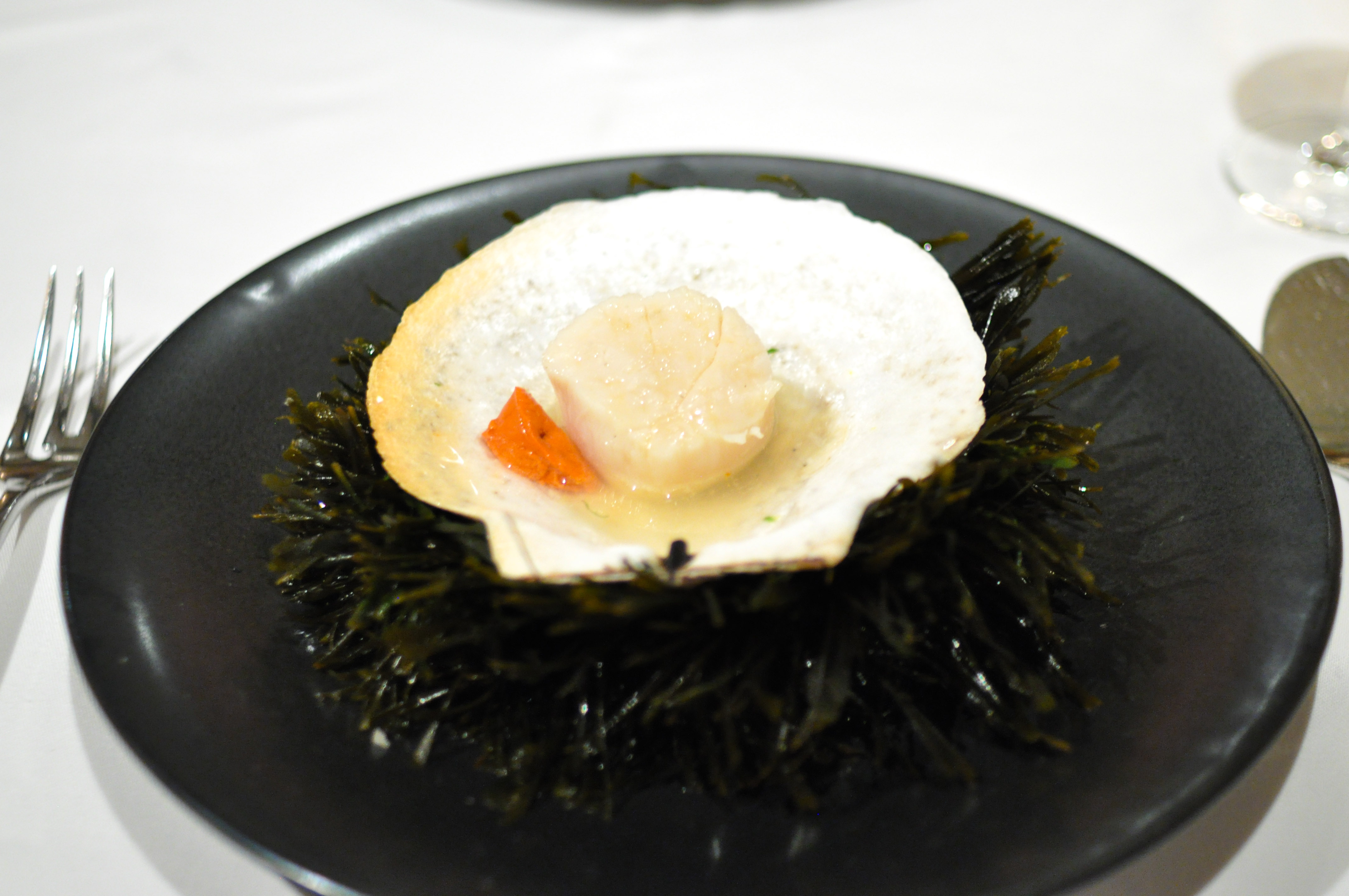 Scallop. A Massachusetts diver scallop cooked in its shell served with its steamed roe, lemon water, lemon balm, and meyer lemon.