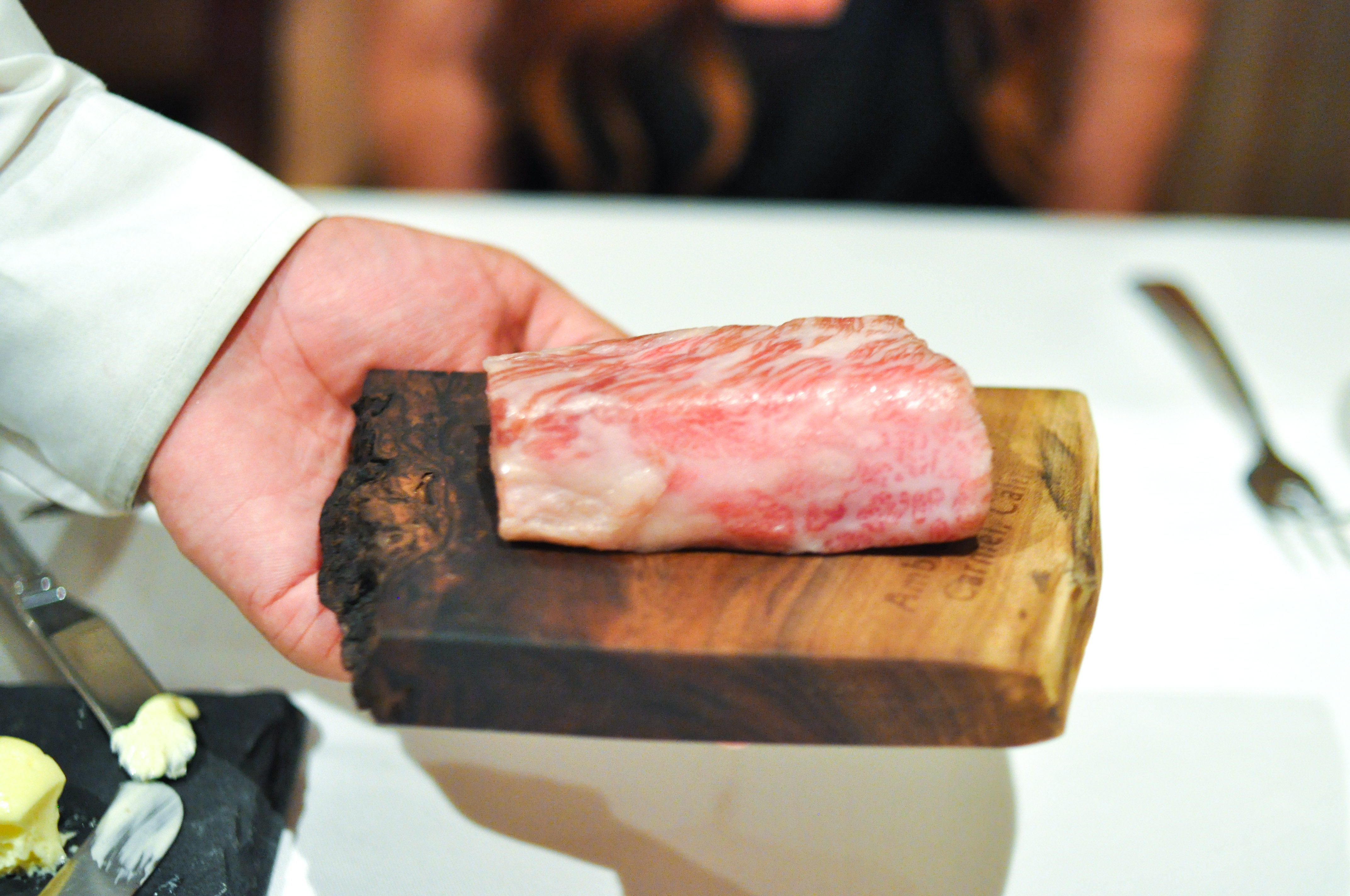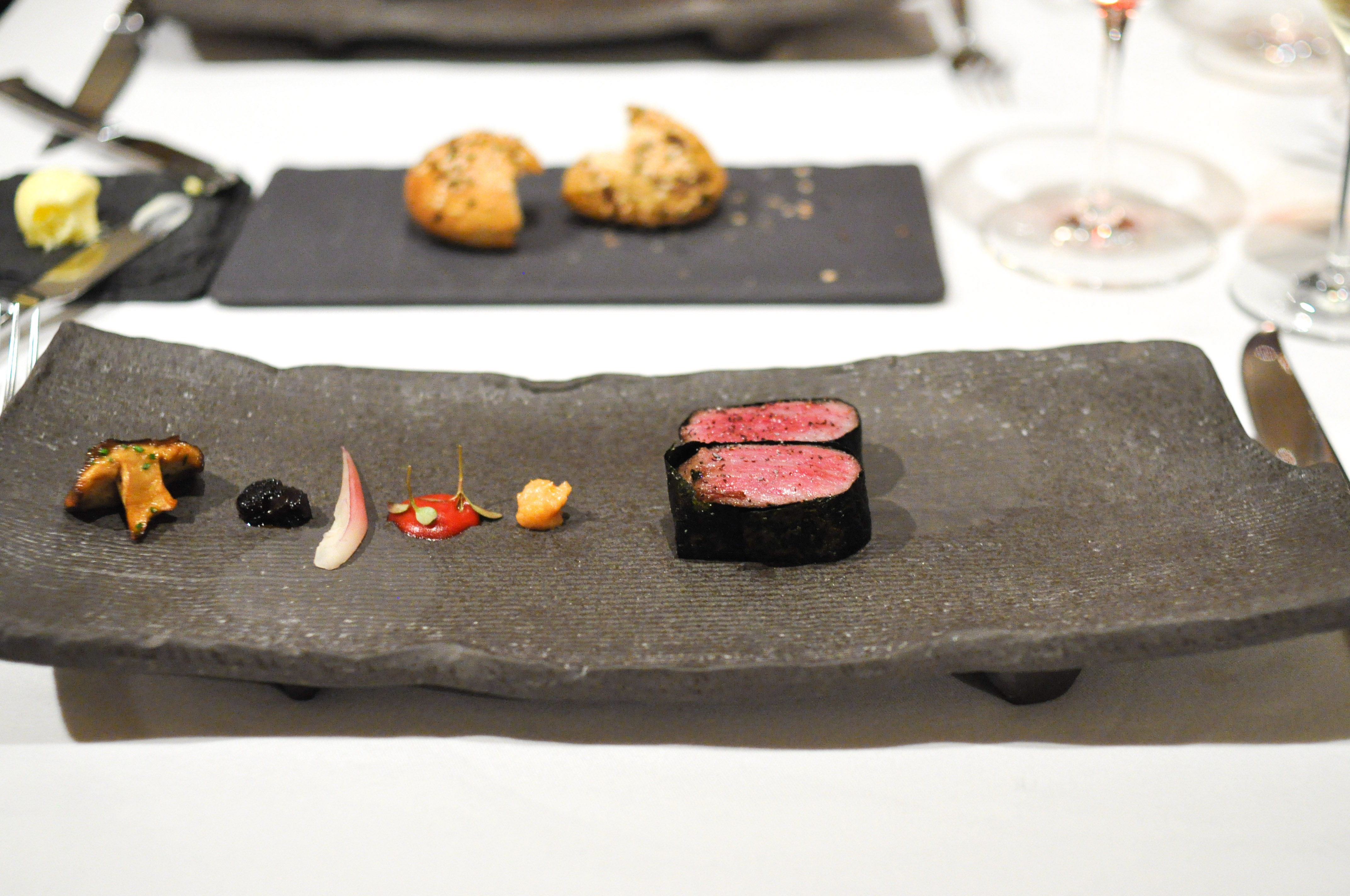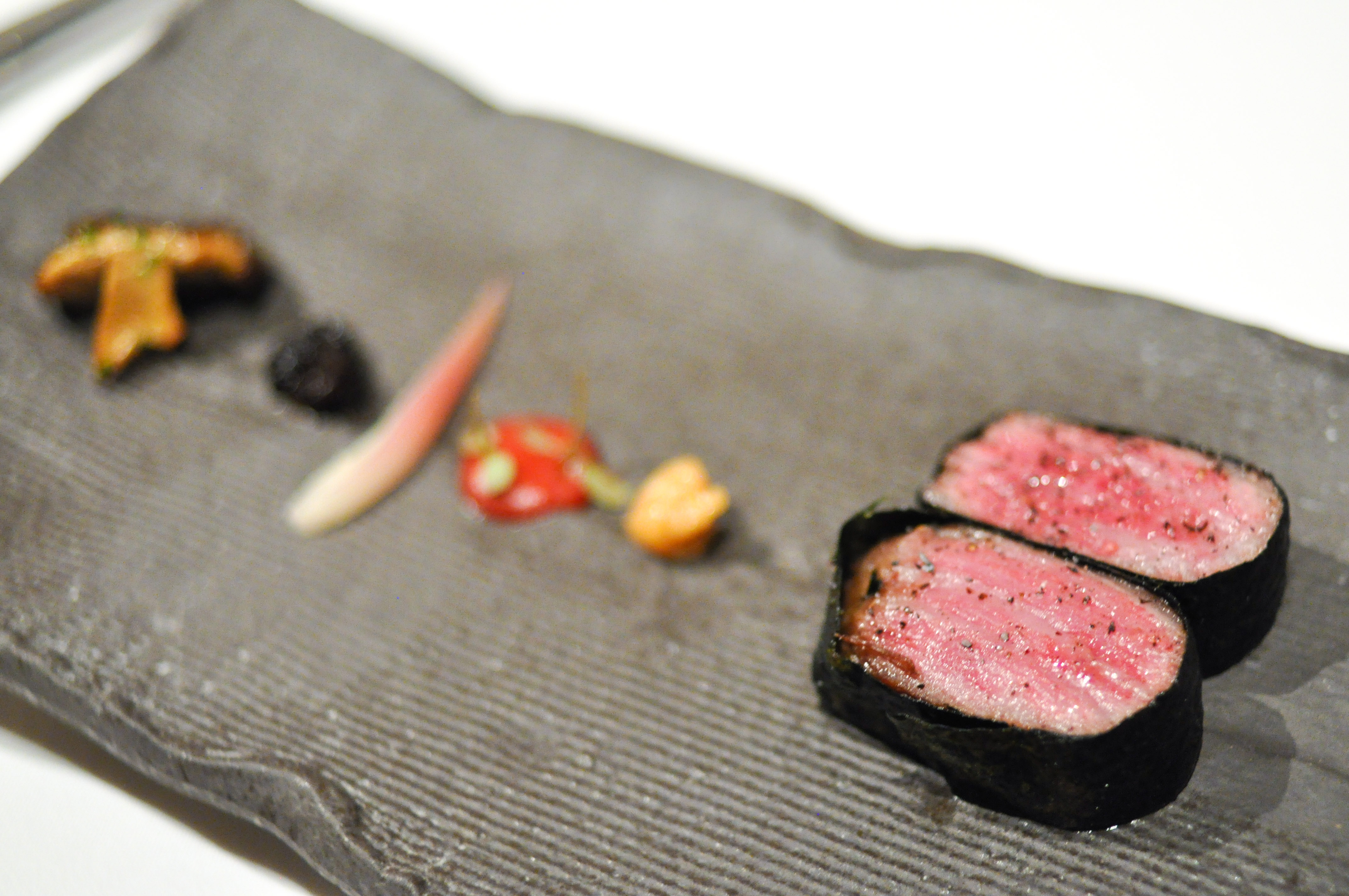Beef. An amazing offering of A5 Wagyu from Kagoshima grilled and rested in sake and rock salt and wrapped in nori. Accompanied with sake lees and meyer lemon, plum puree, pickled baby ginger, soy salt, and an incredible porcini. Truly decadent.