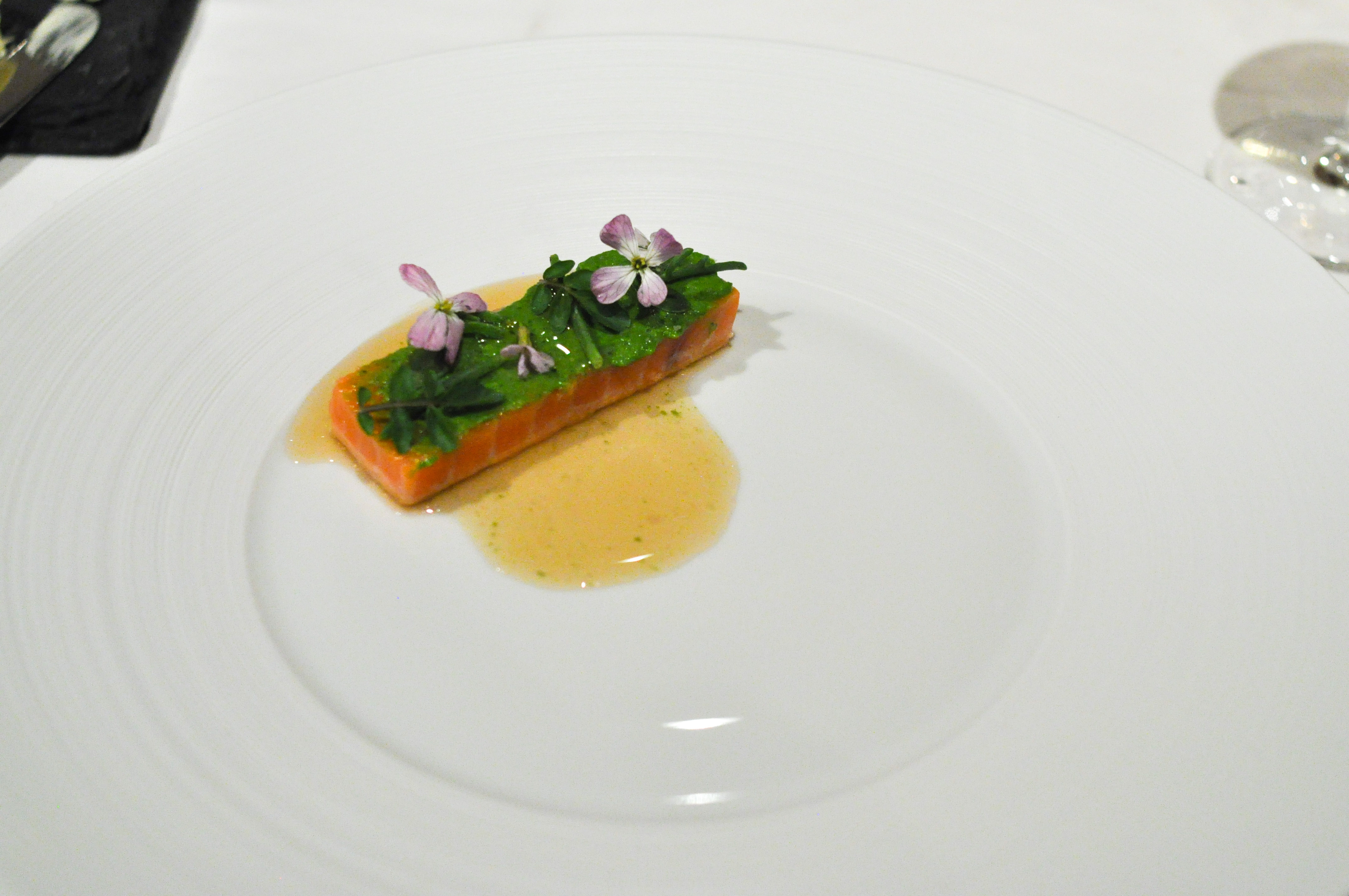 King Salmon. Local king salmon topped with spinach puree, coastal herbs, and pineapple weed. Finished with chamomile broth.