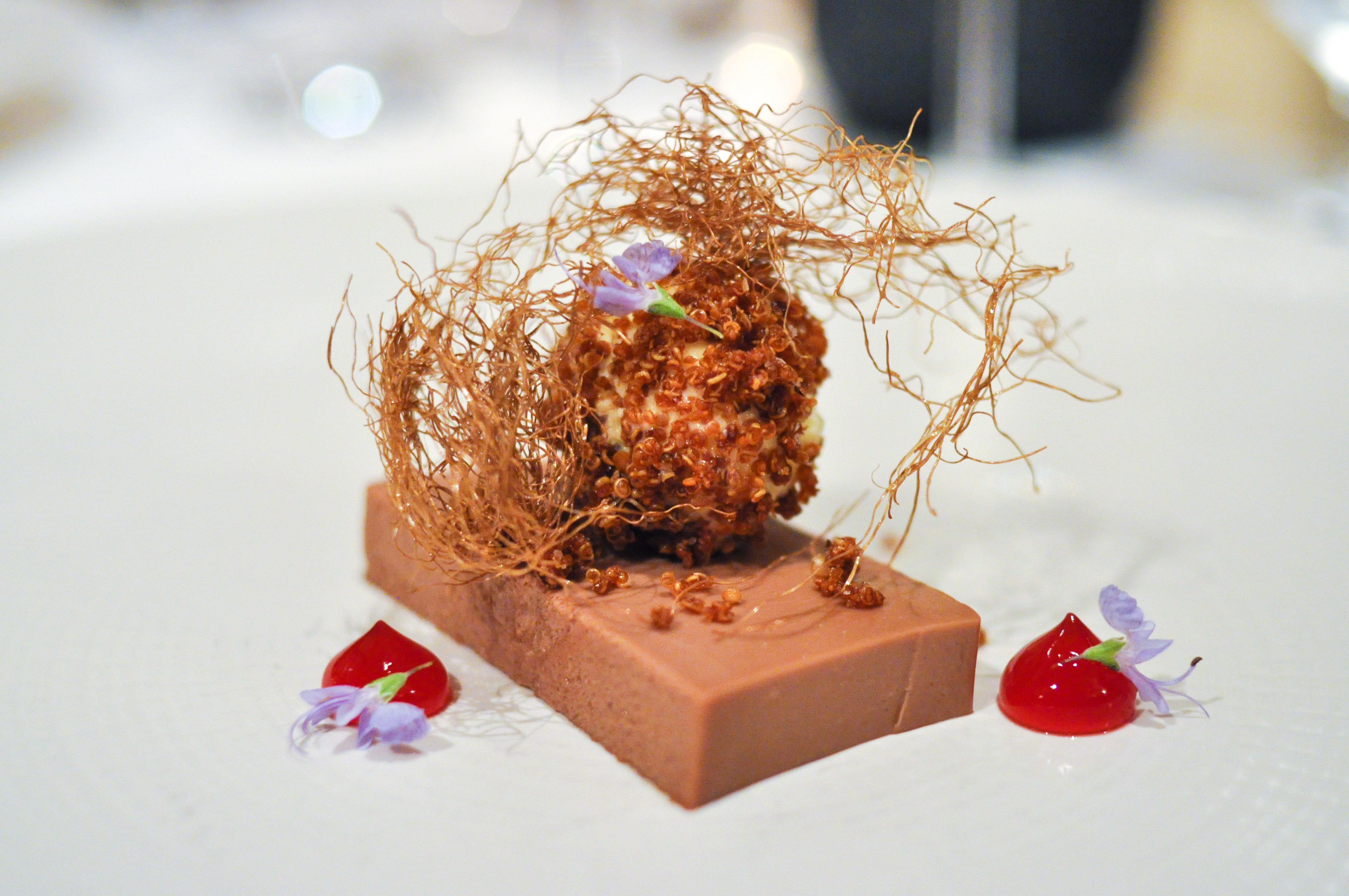Chocolate. Smoked milk chocolate mousse with corn ice cream, corn silk, crispy quinoa, and raspberry sauce. A beautiful balance of tastes and textures.